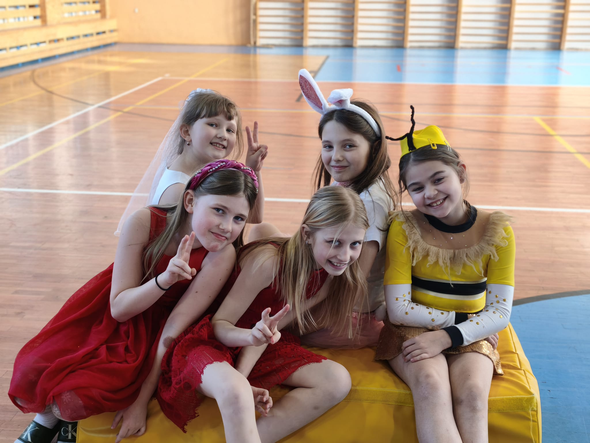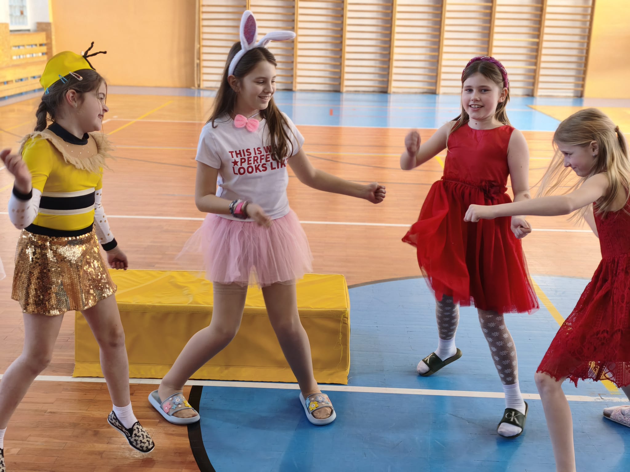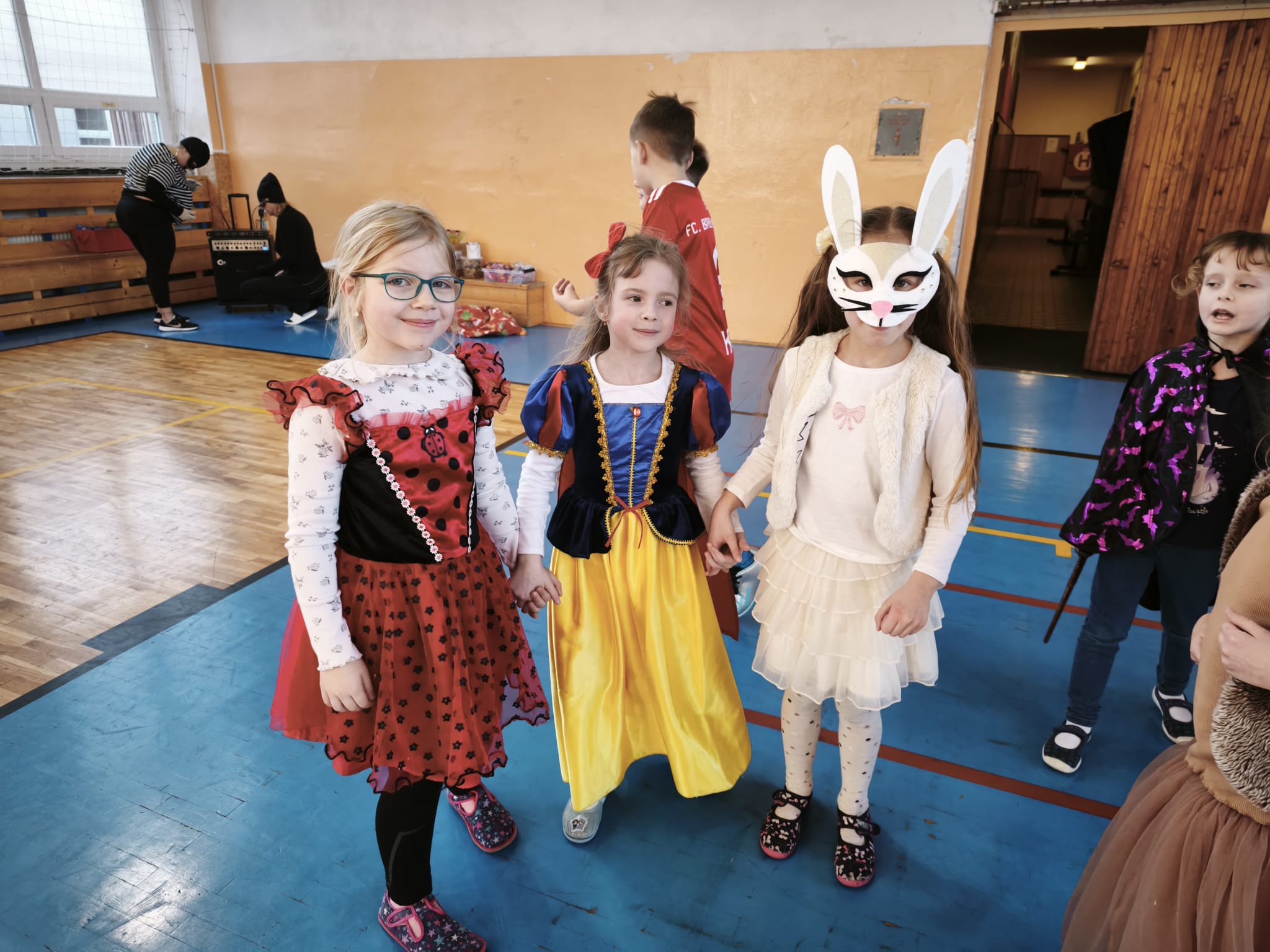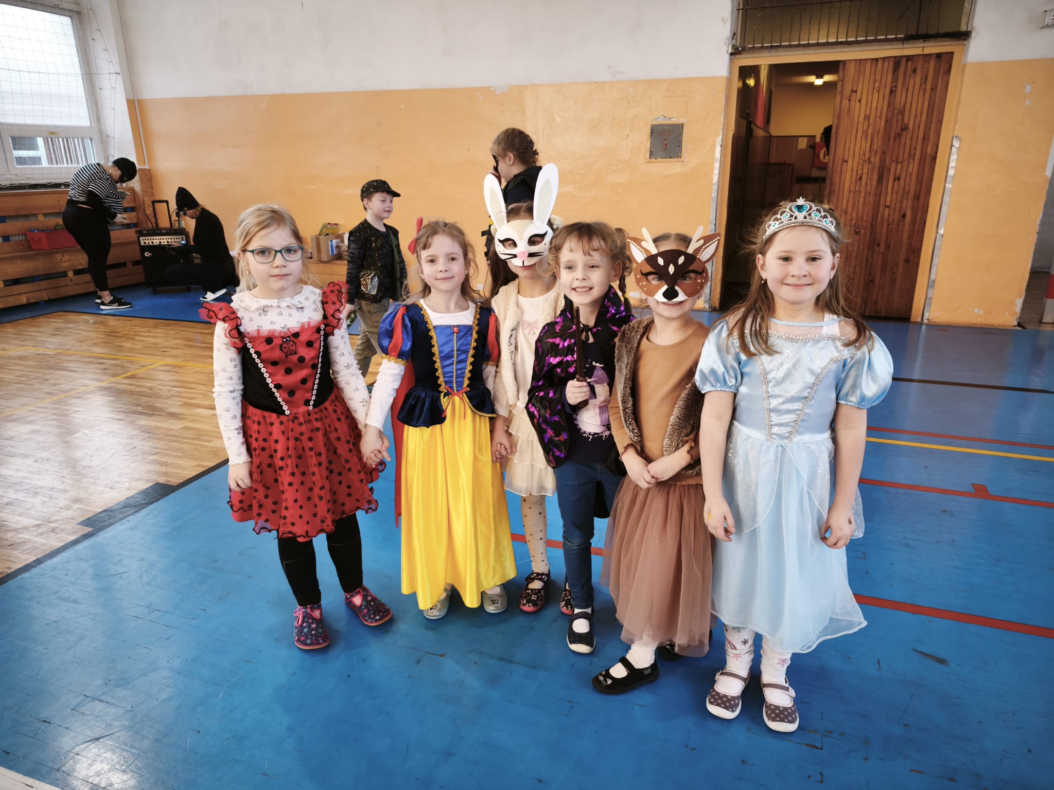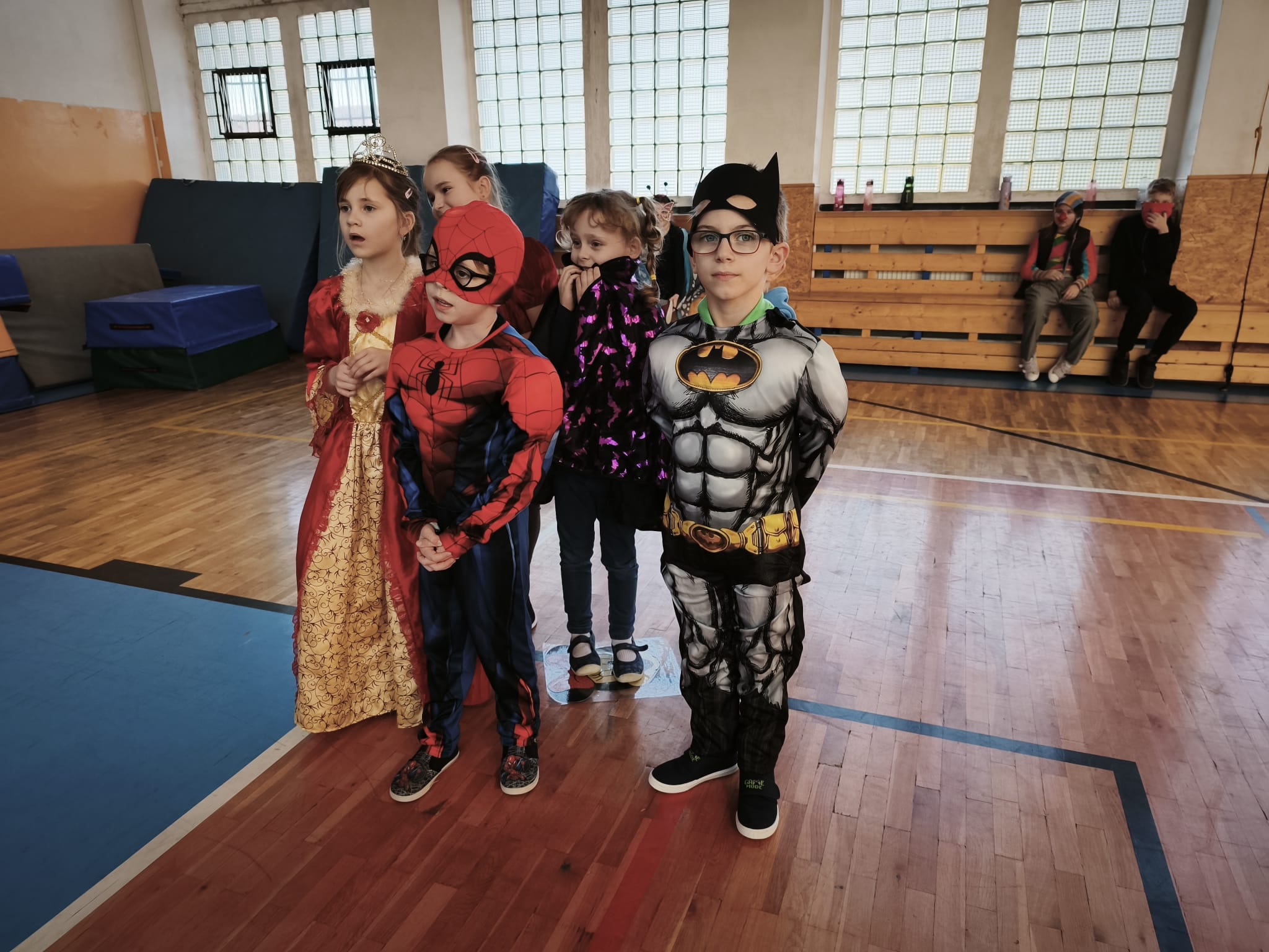 Školní tělocvična se proměnila v taneční sál plný pohádkových bytostí, zvířat, sportovců, princezen, víl, superhrdinů.