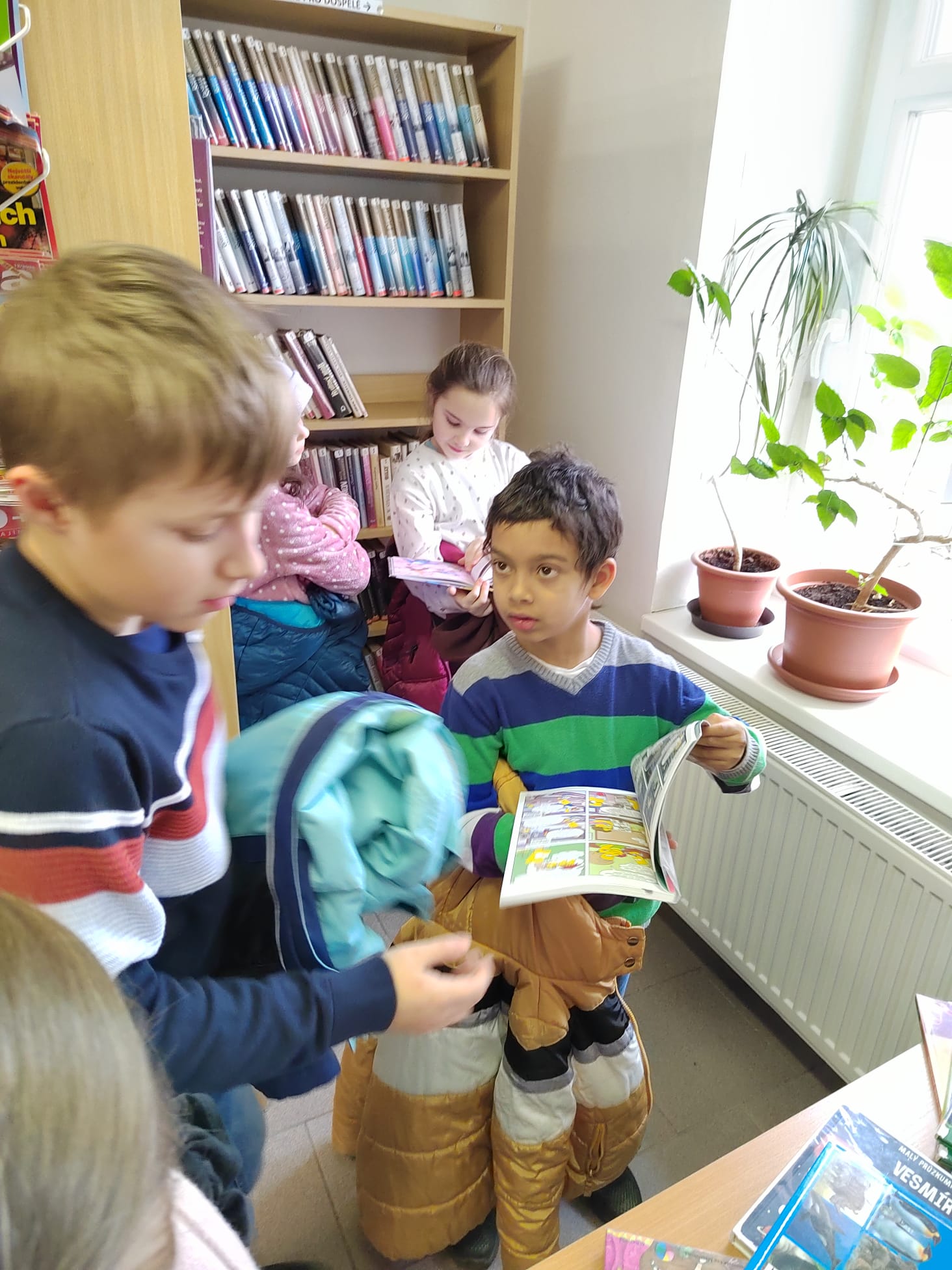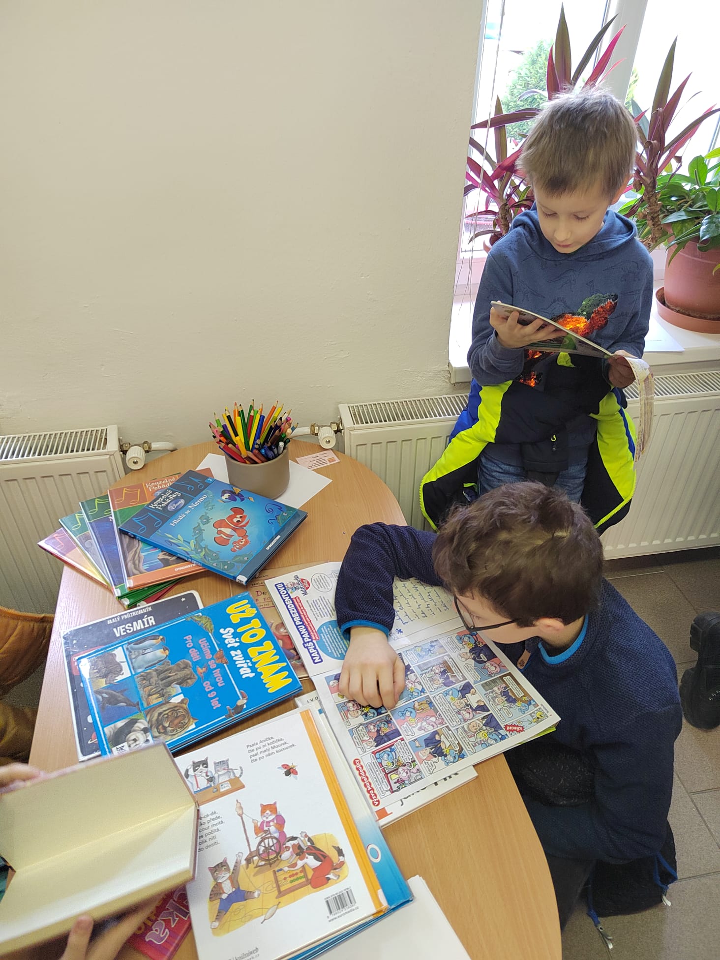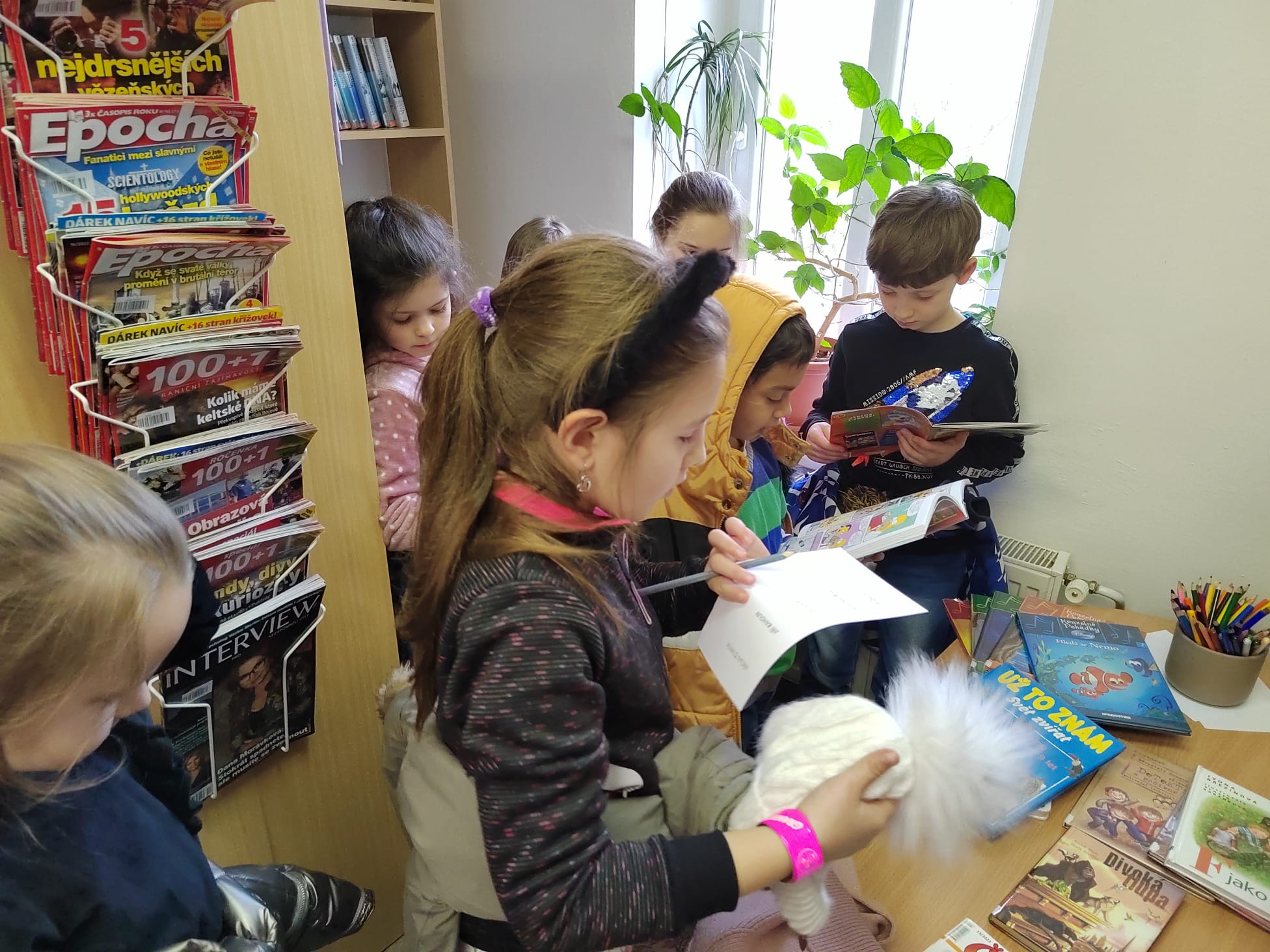Ve středu 29. března jsme všechny ilustrace a zapůjčené knihy odnesli do již zmiňované knihovny. Paní knihovnice dětem vysvětlila chod knihovny a ochotně odpovídala na jejich otázky. Děti si se zájmem prohlížely knihy, časopisy a mohly vyplnit čtenářský kvíz.