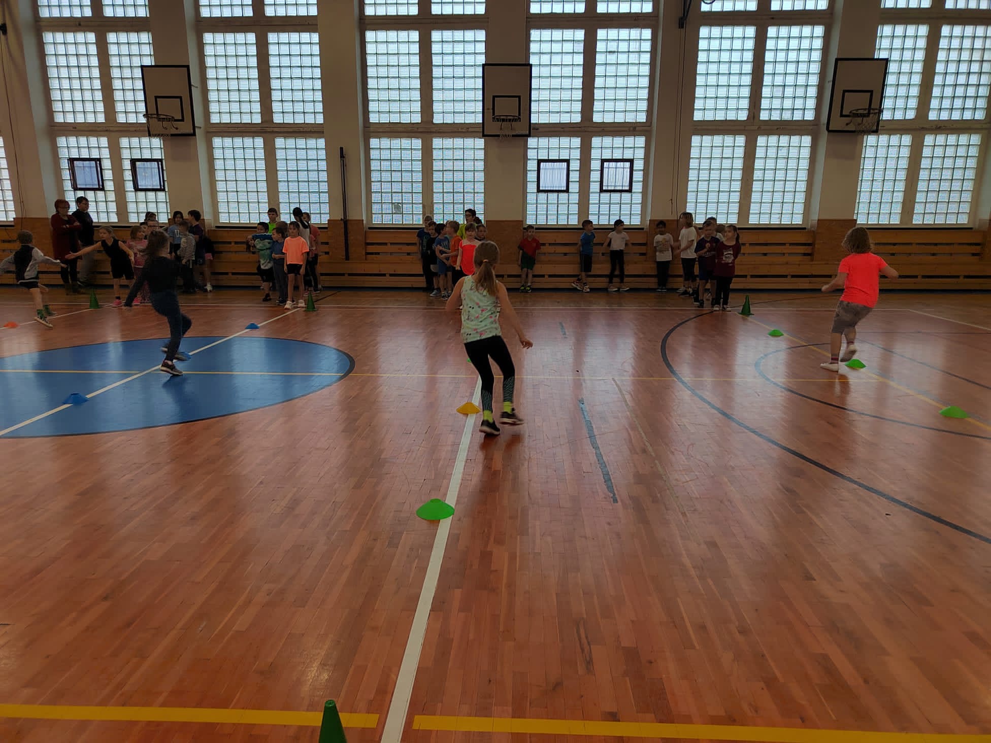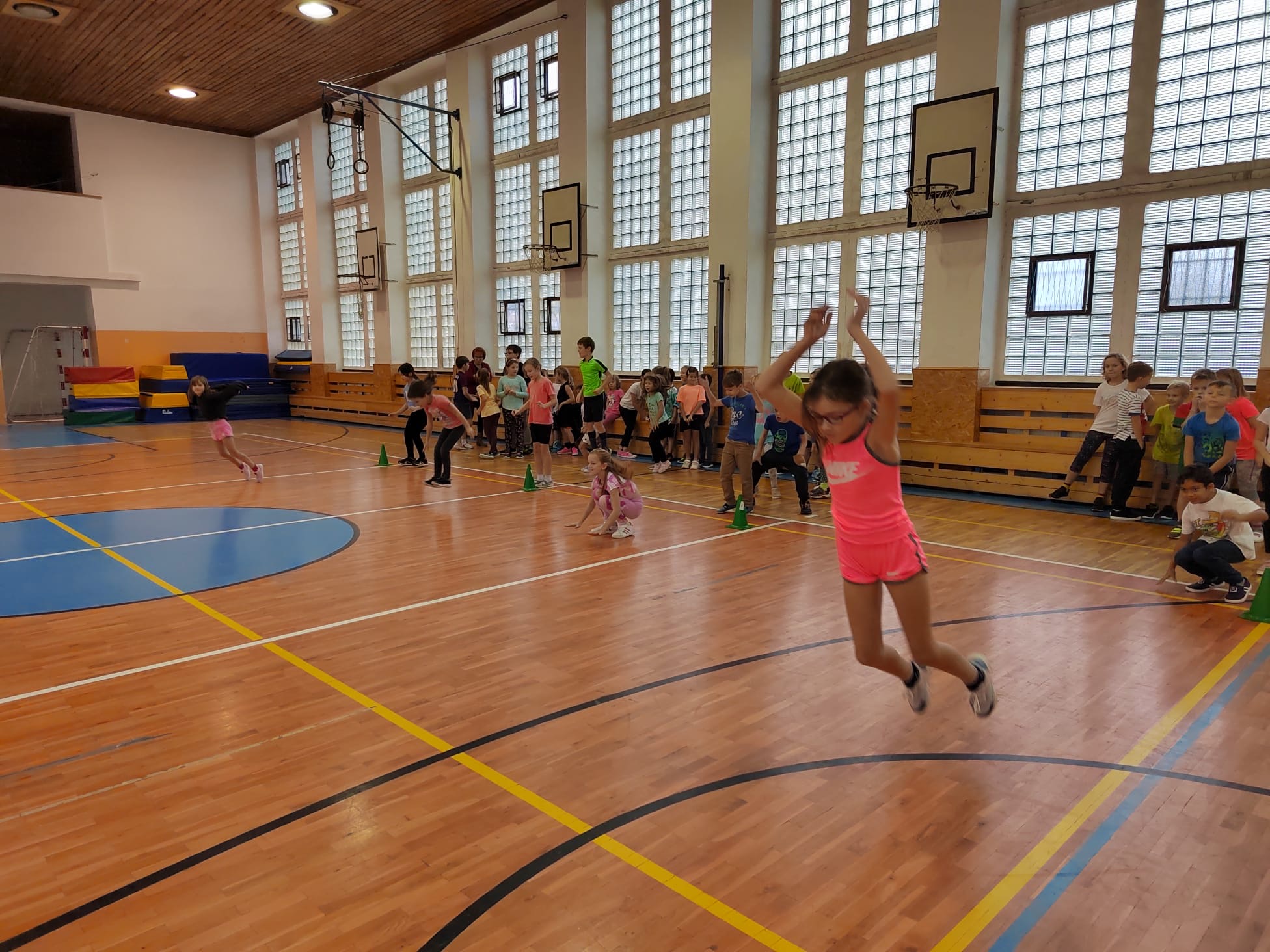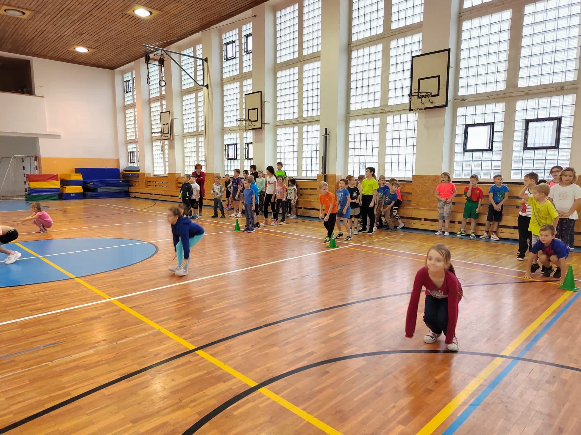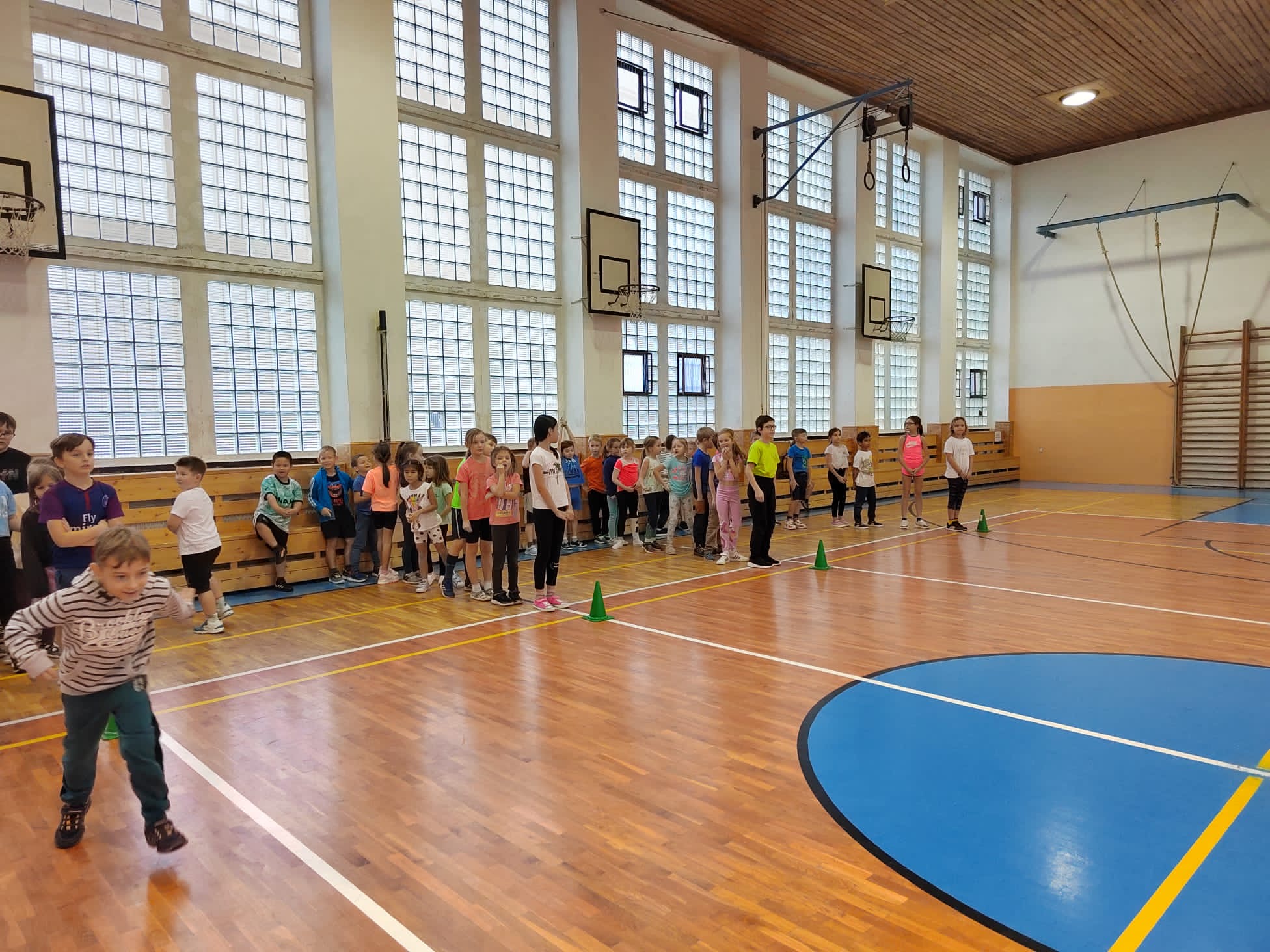 Po příchodu do tělocvičny, vychovatelky rozdělily děti do čtyř smíšených družstev. Sportovci soutěžili v sedmi disciplínách s míči, kužely, obručemi, využili jsme žebříky a další sportovní pomůcky.