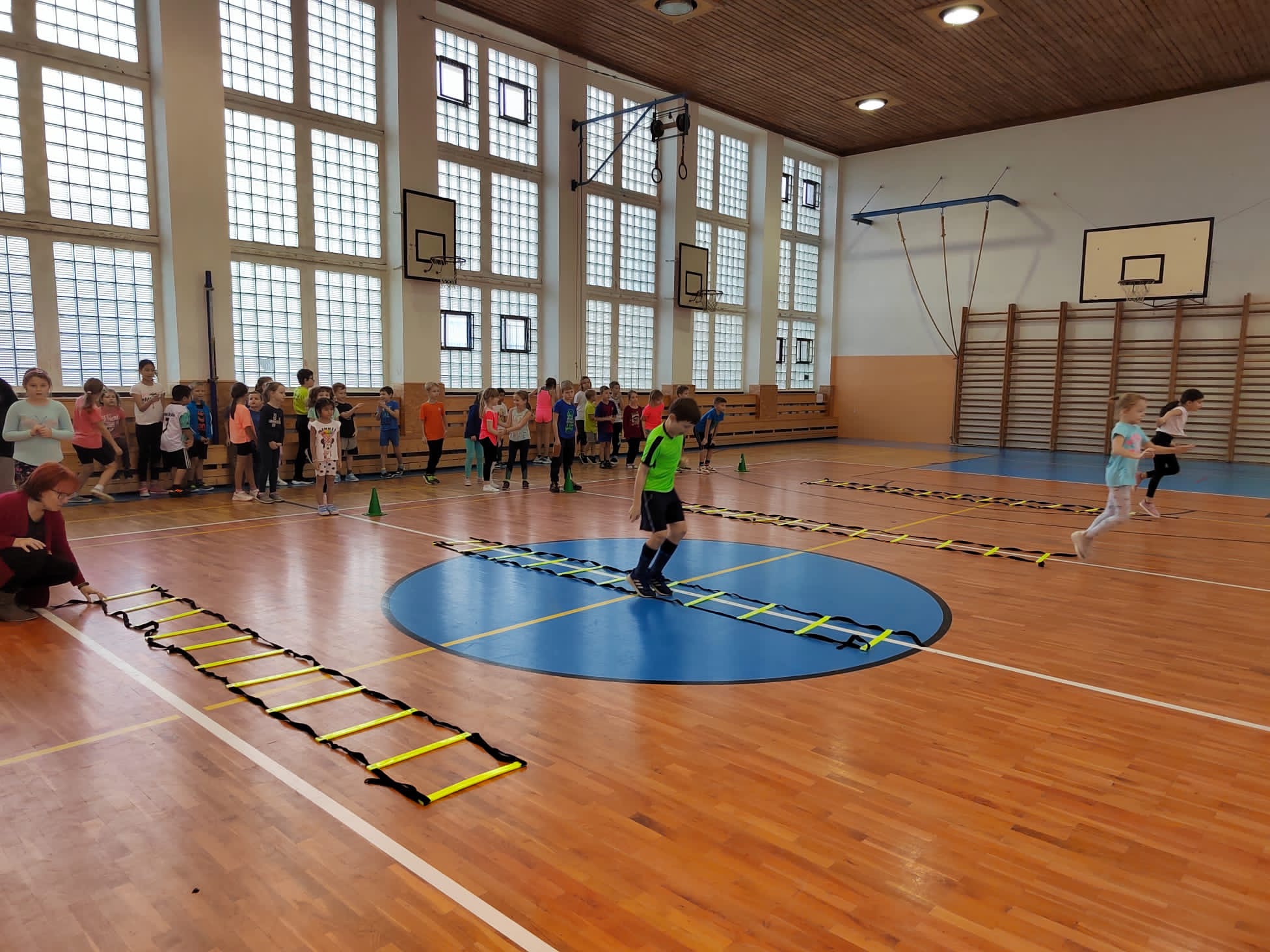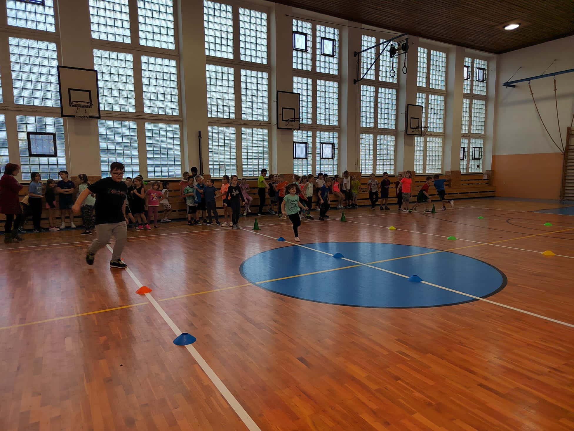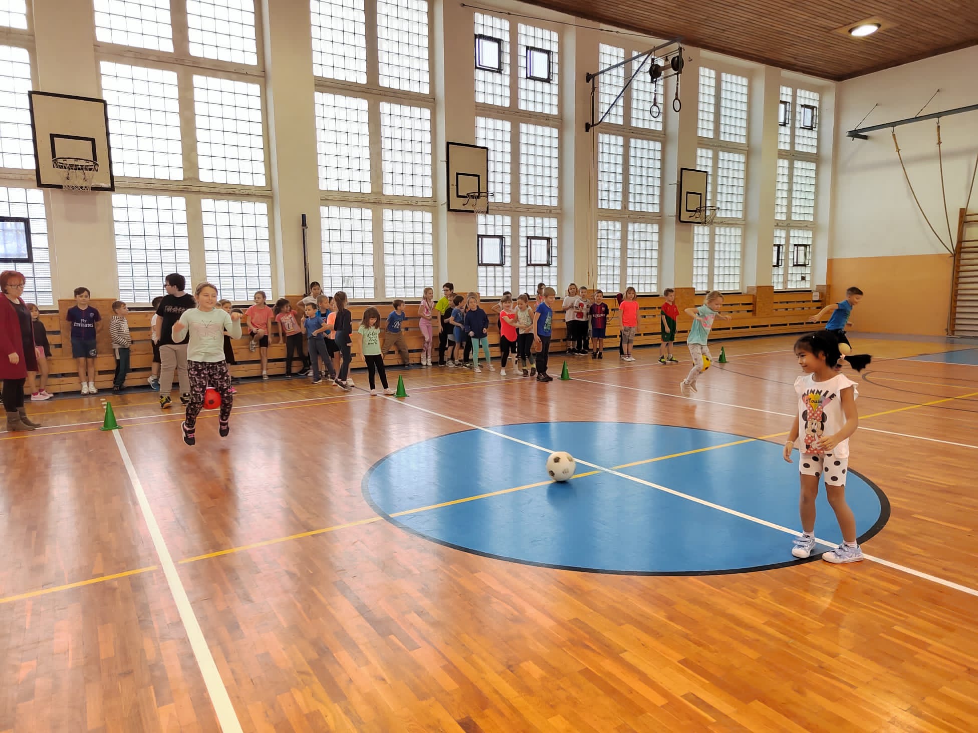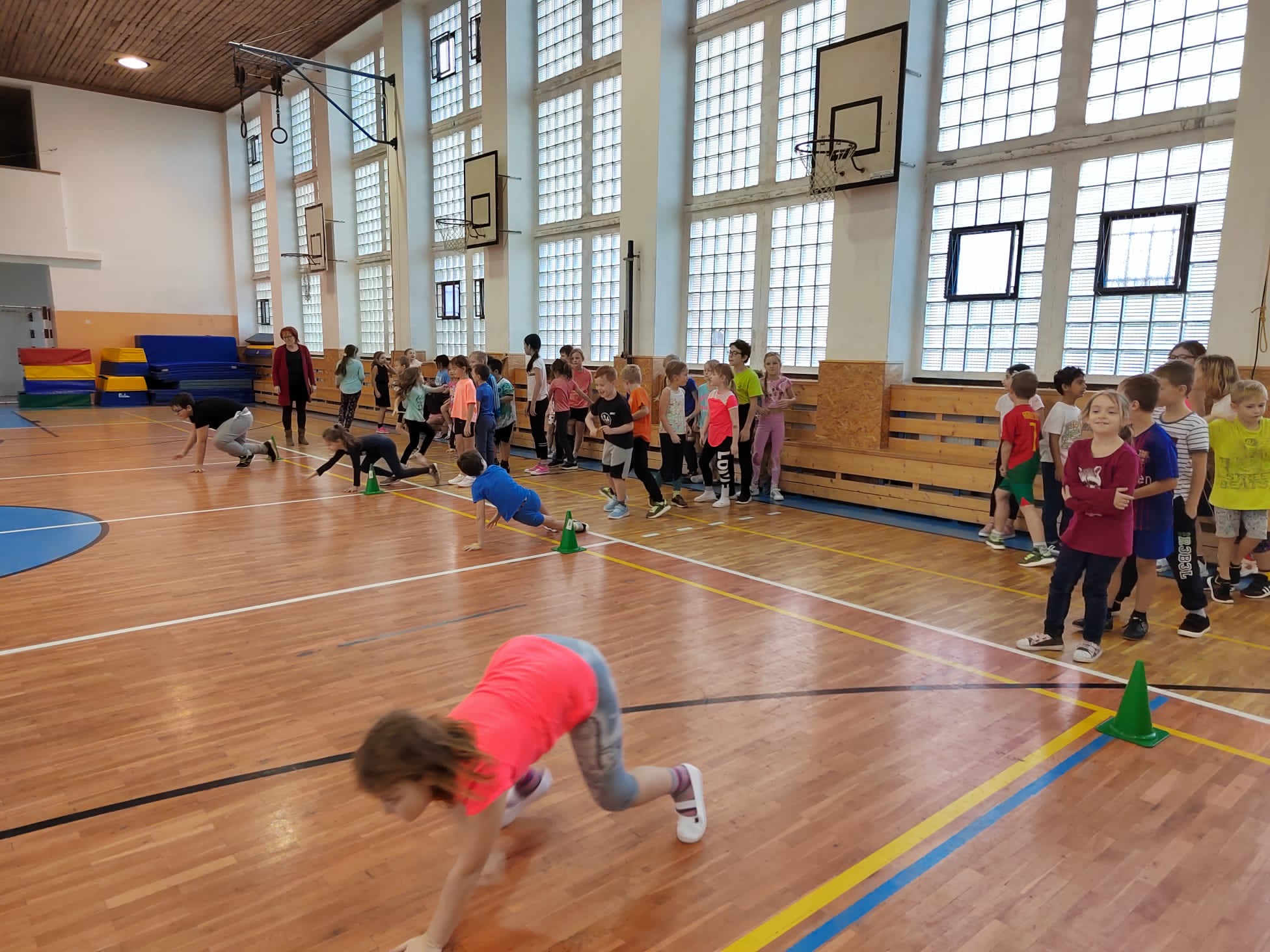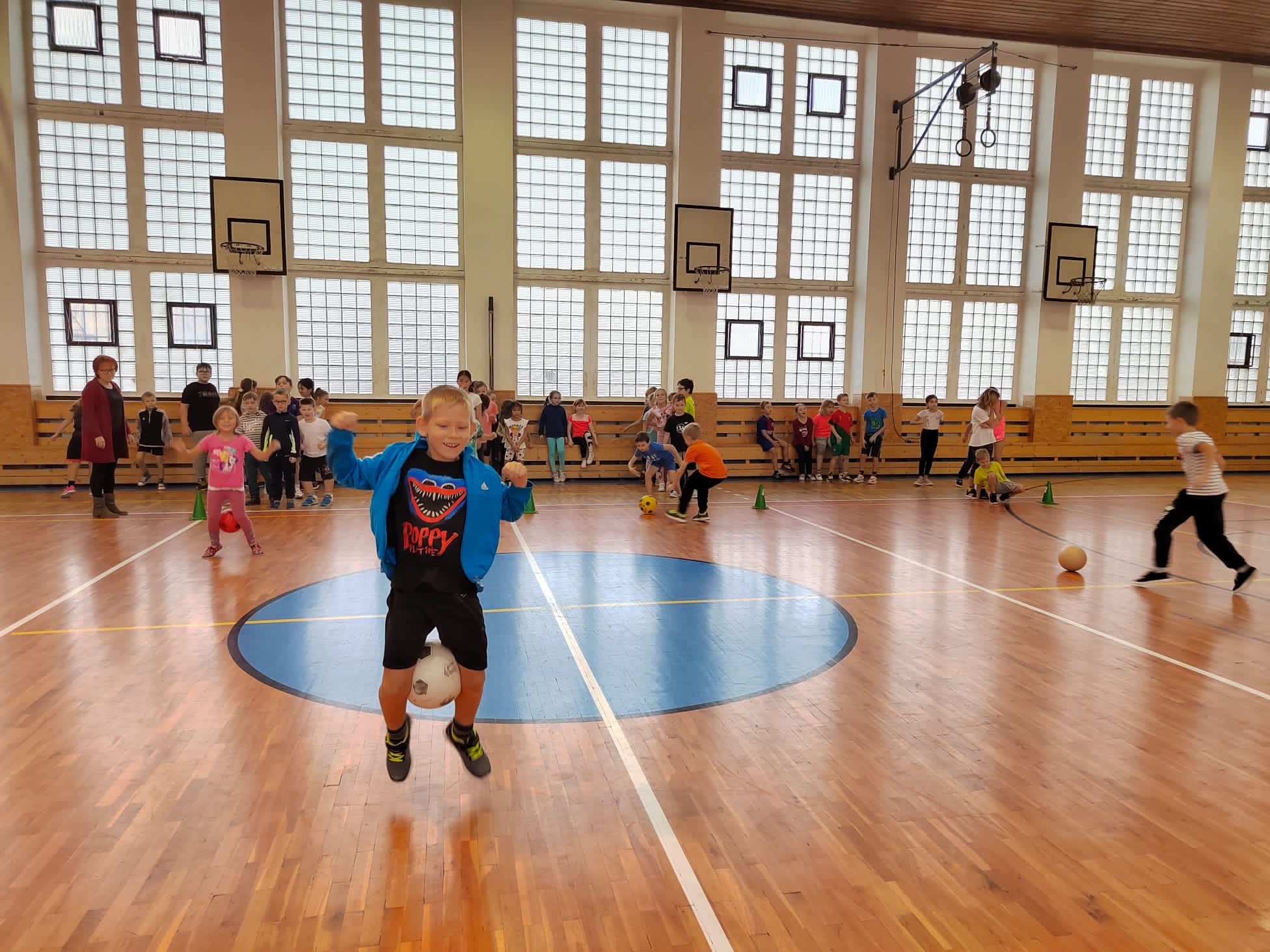 Po příchodu do tělocvičny, vychovatelky rozdělily děti do čtyř smíšených družstev. Sportovci soutěžili v sedmi disciplínách s míči, kužely, obručemi, využili jsme žebříky a další sportovní pomůcky.