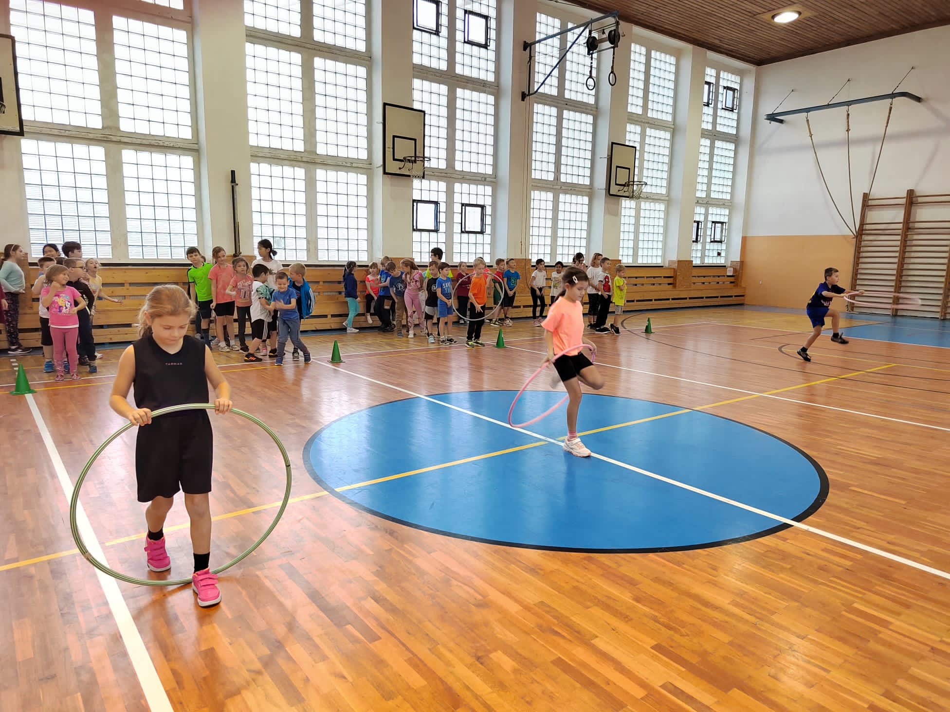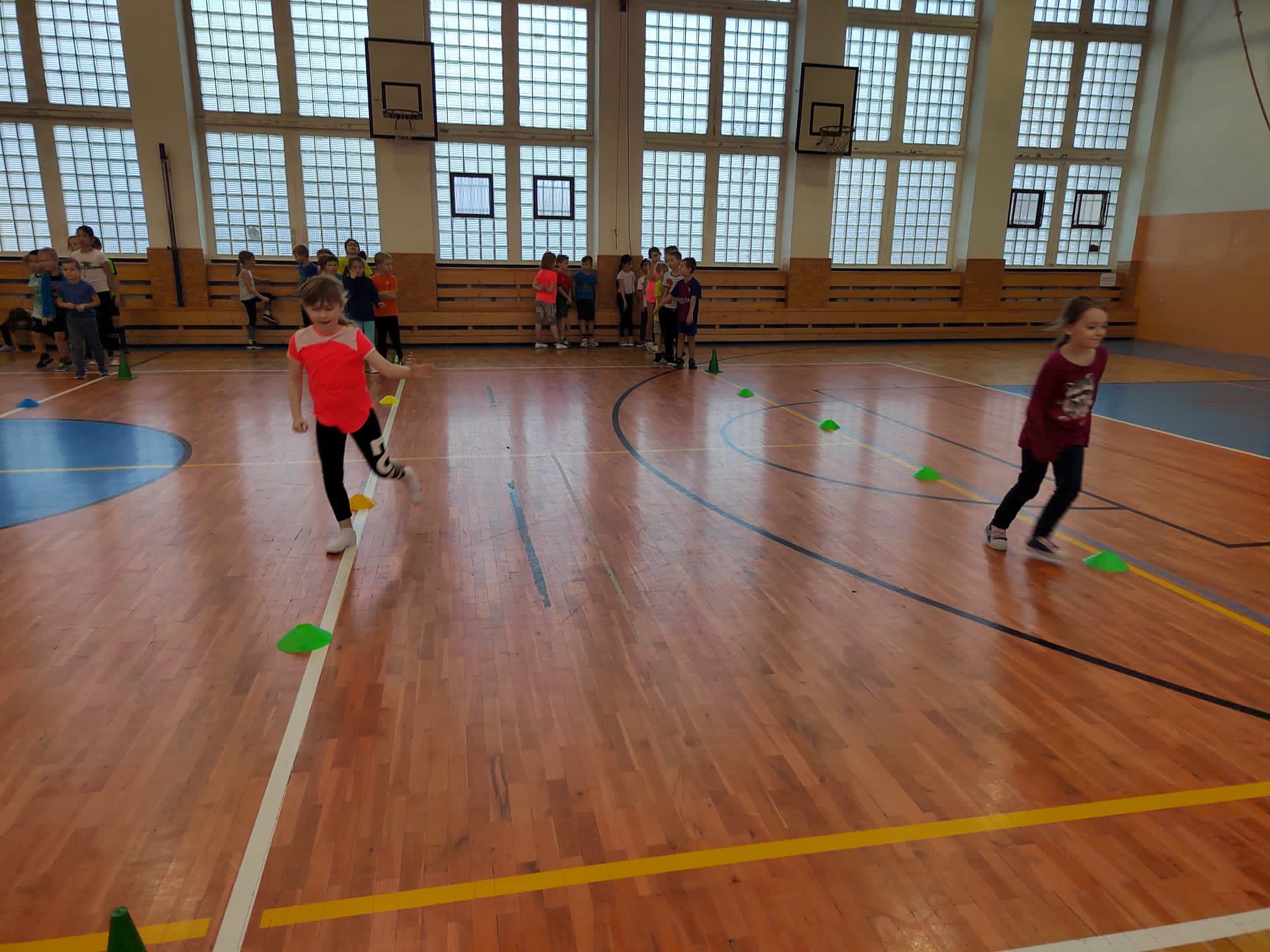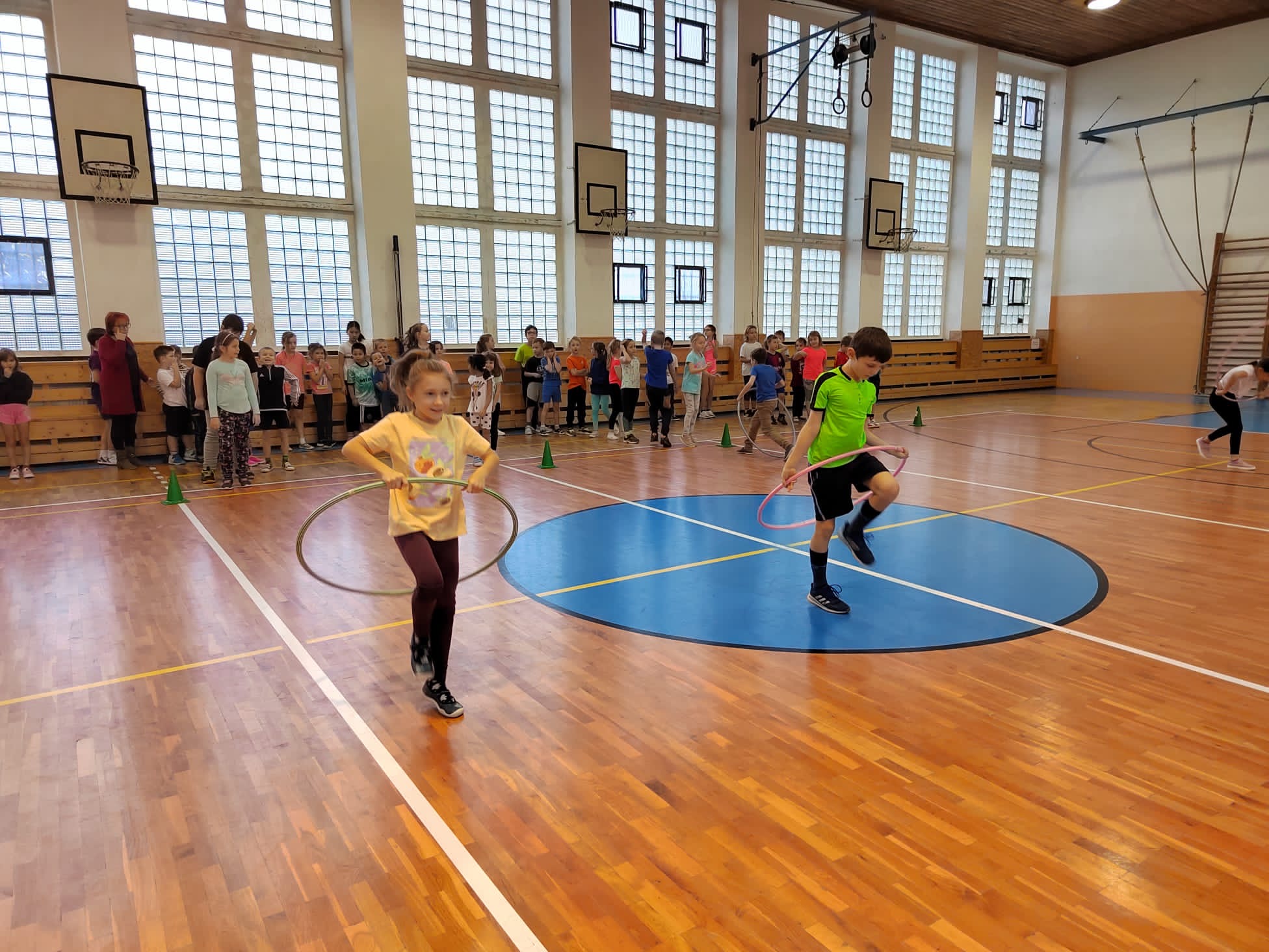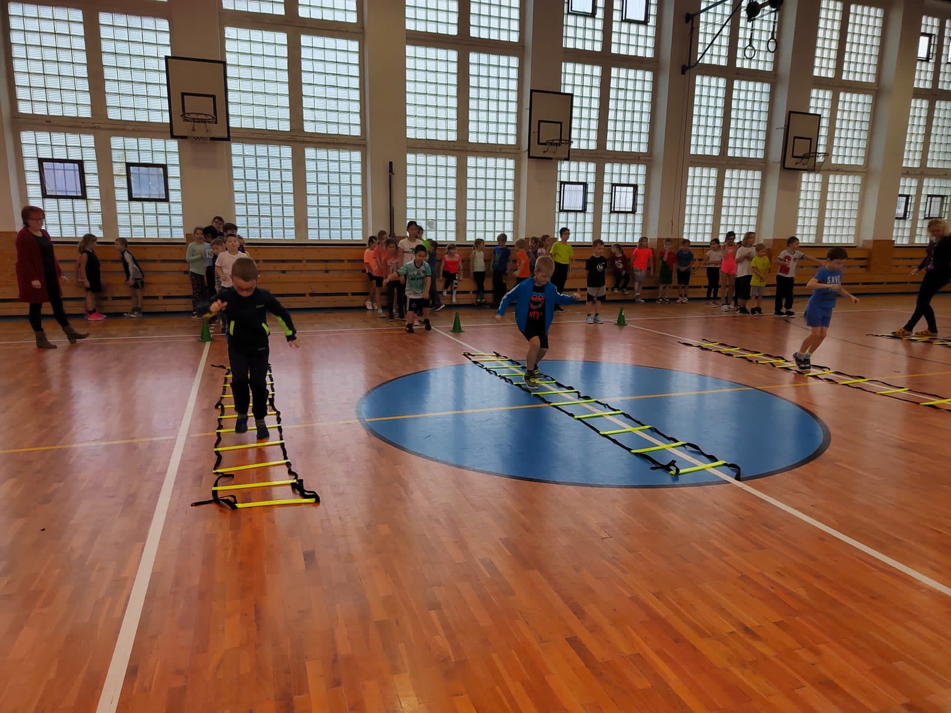 Po příchodu do tělocvičny, vychovatelky rozdělily děti do čtyř smíšených družstev. Sportovci soutěžili v sedmi disciplínách s míči, kužely, obručemi, využili jsme žebříky a další sportovní pomůcky.