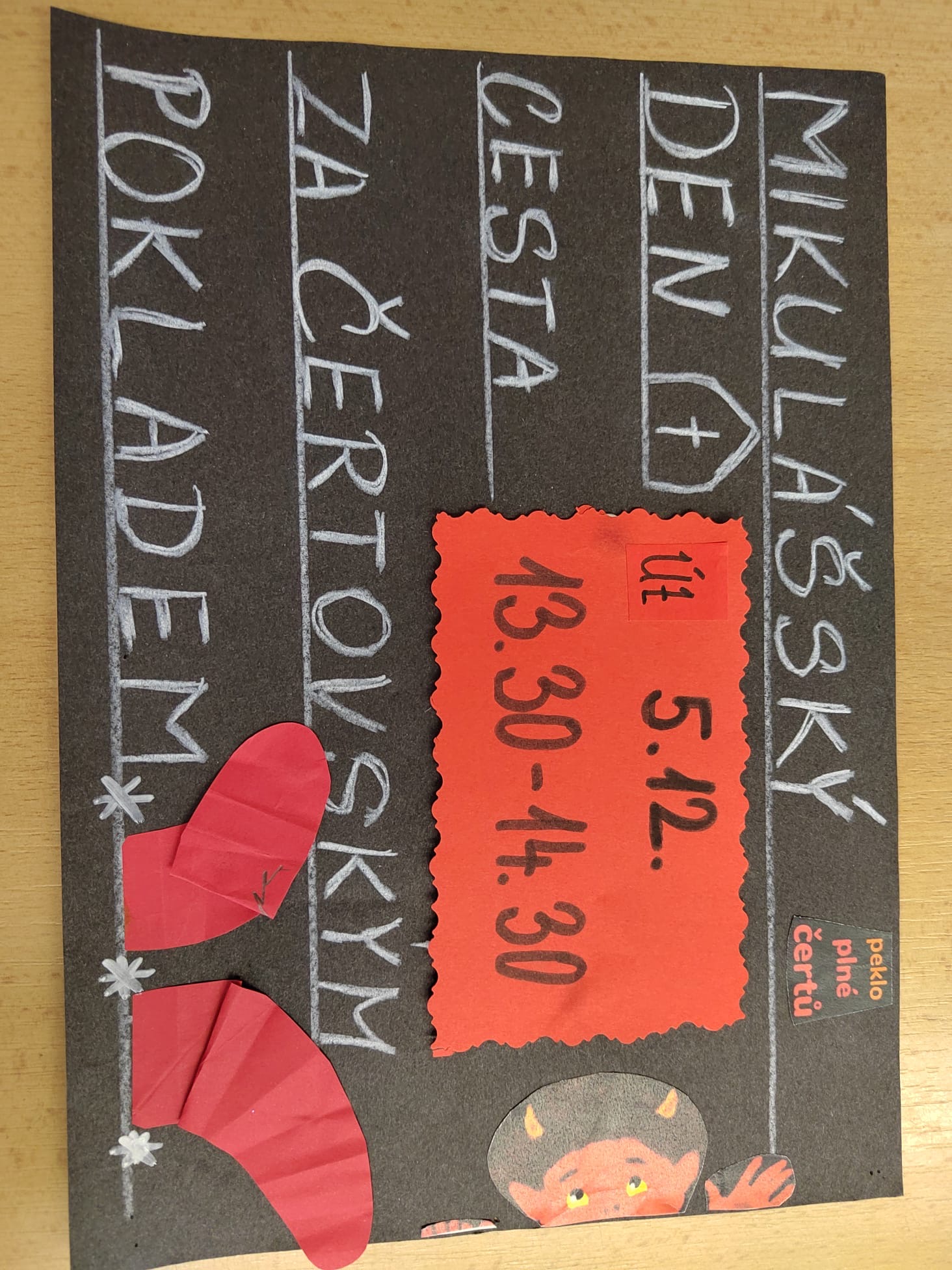 Zopakovali jsme si básničky o Mikuláši, čertech a andělech pro dnešní večer. Odpoledne 5.12. se to u nás čerty a čertíky jen hemžilo. Děti si užily cestu za čertovským pokladem plněním různých pekelných úkolů, malováním a soutěžemi v ďábelské škole nebo při čertovské bojovce a řádily na Luciferově dýze. Všichni si vytoužený poklad našli a zasloužili.
