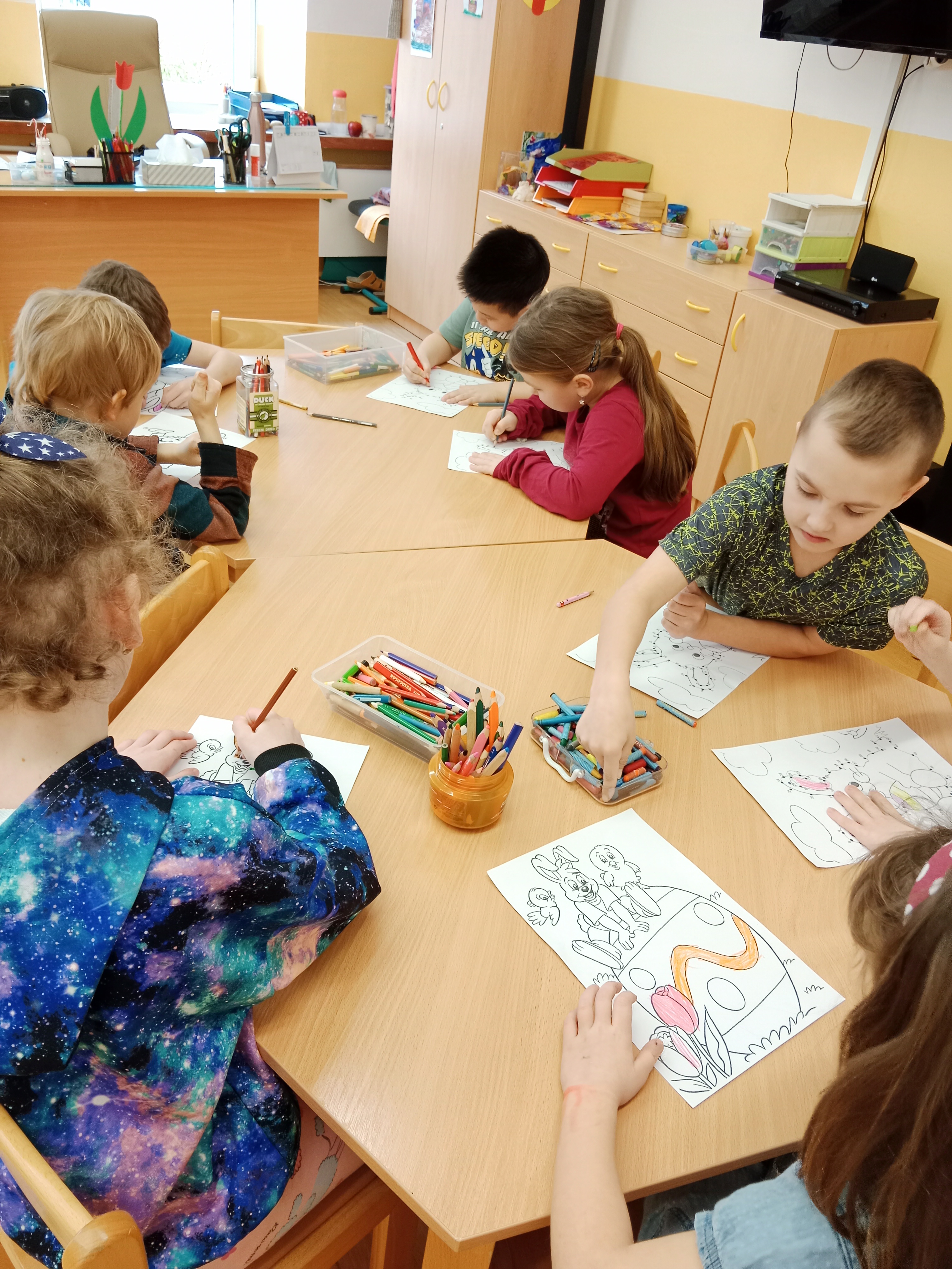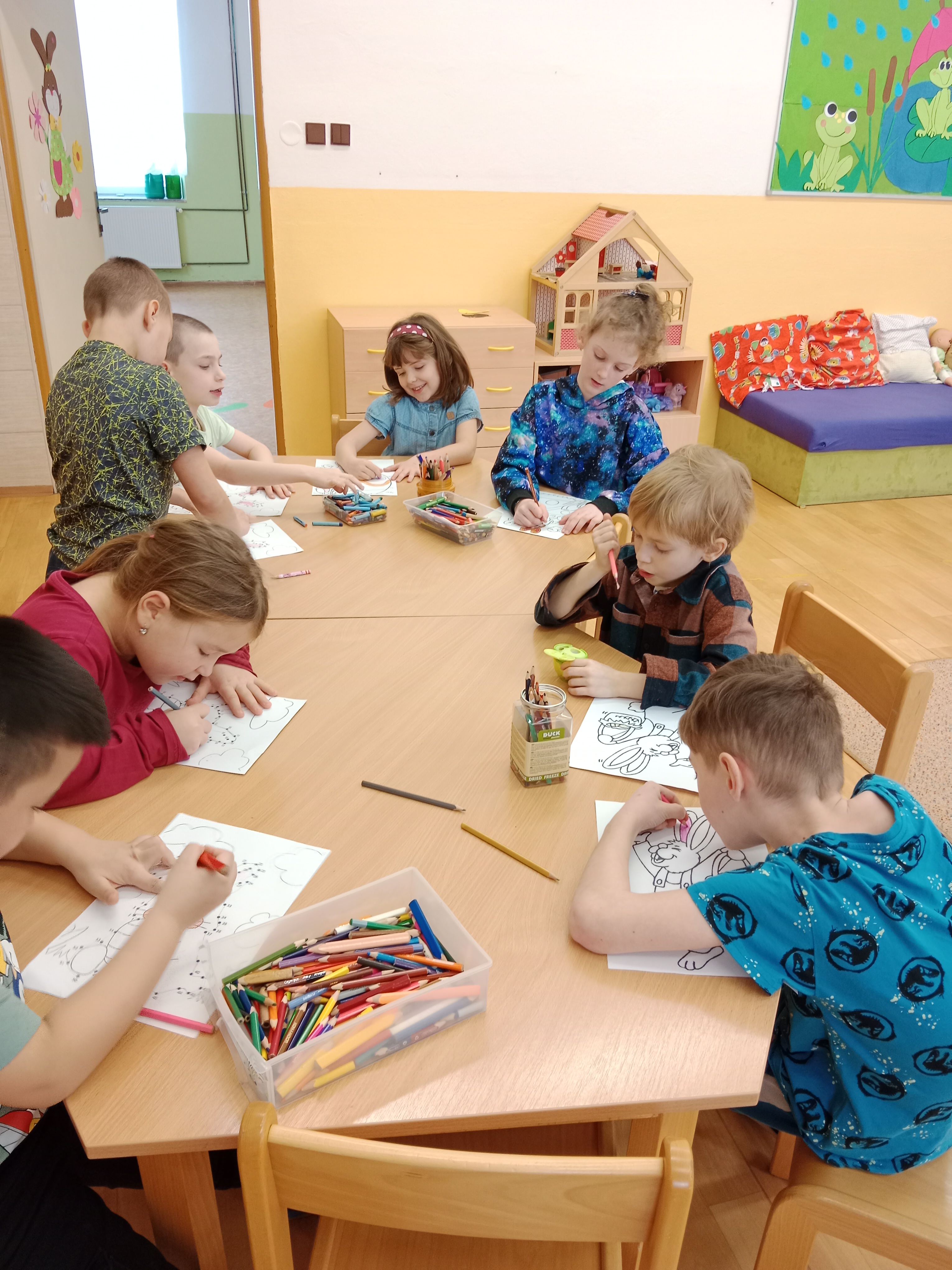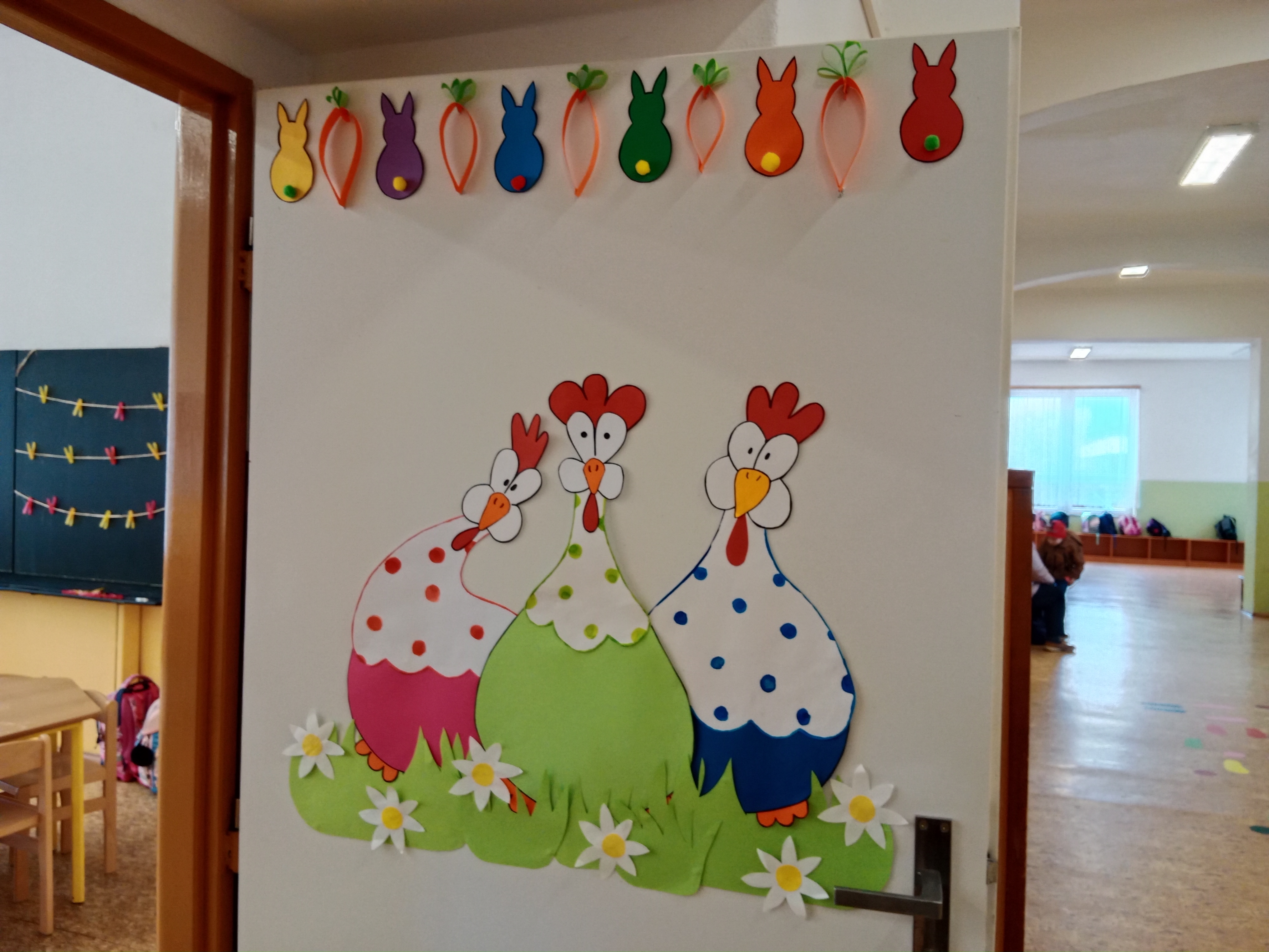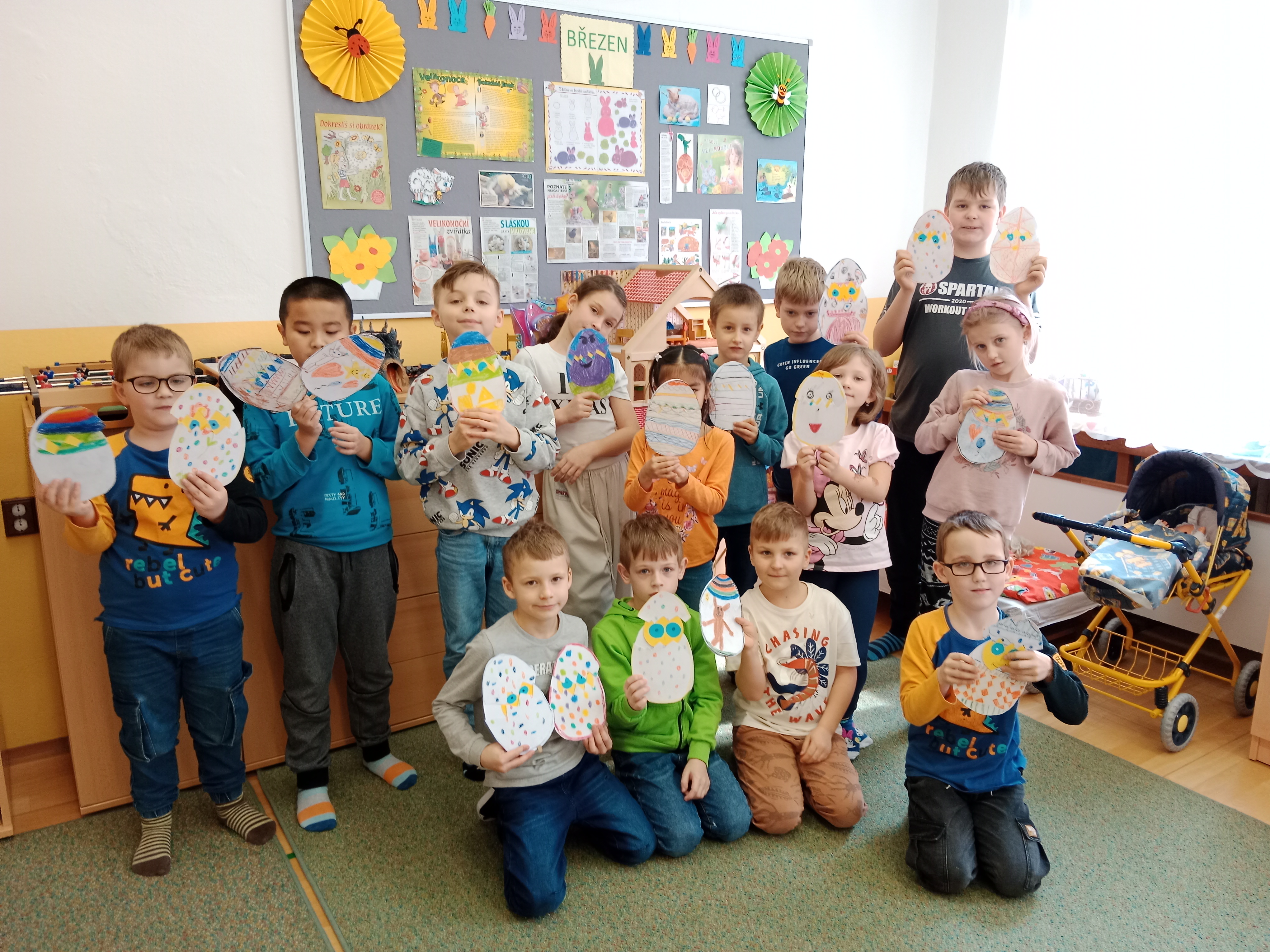 Probíhaly přípravy na Velikonoce ve všech činnostech - vytváření, tradice, symboly, setí řeřichy a jiné. Zahráli jsme si i tematické kolektivní hry například Na slepičky, Slepice hledá kuřátka, Evoluce.