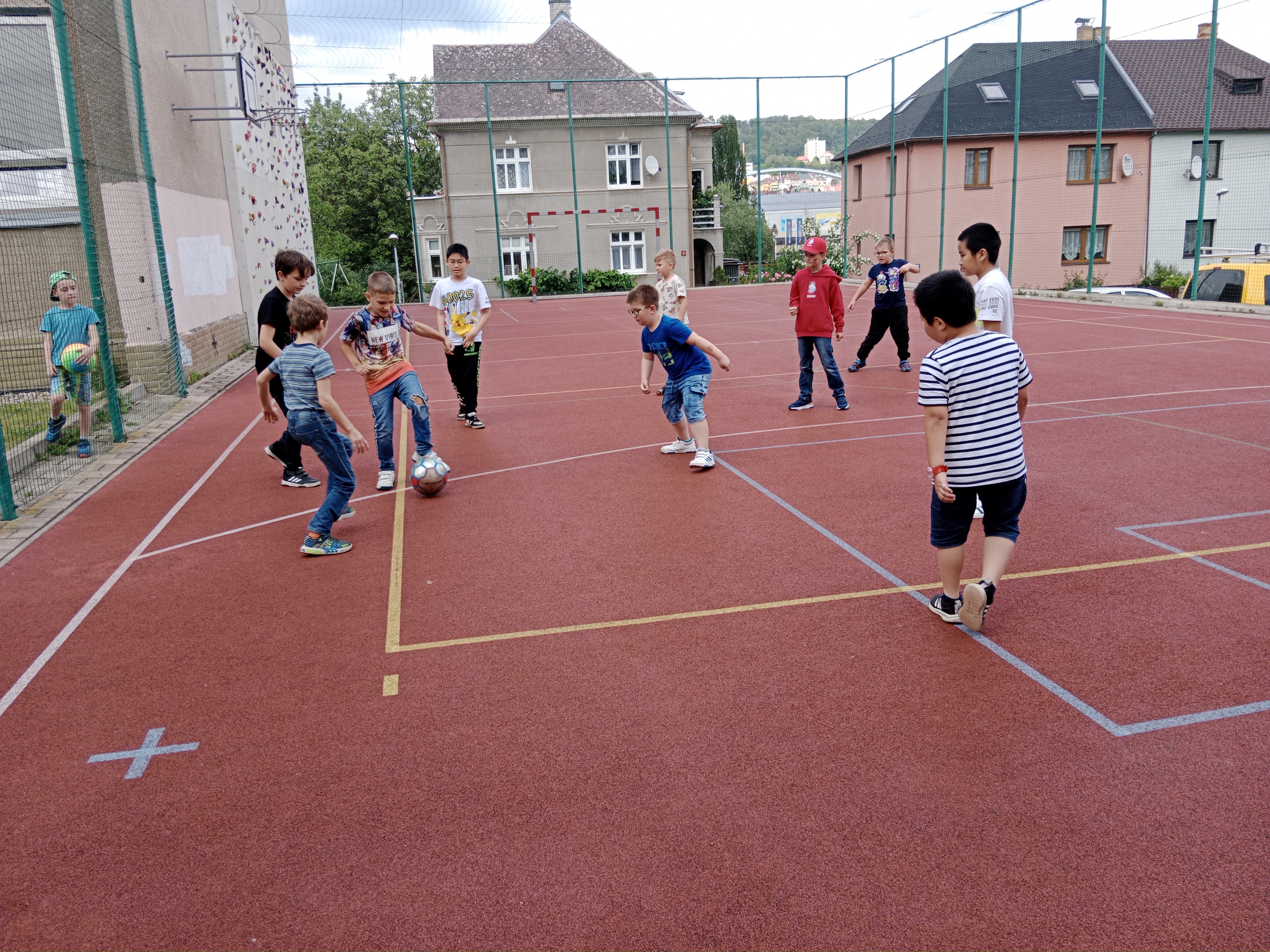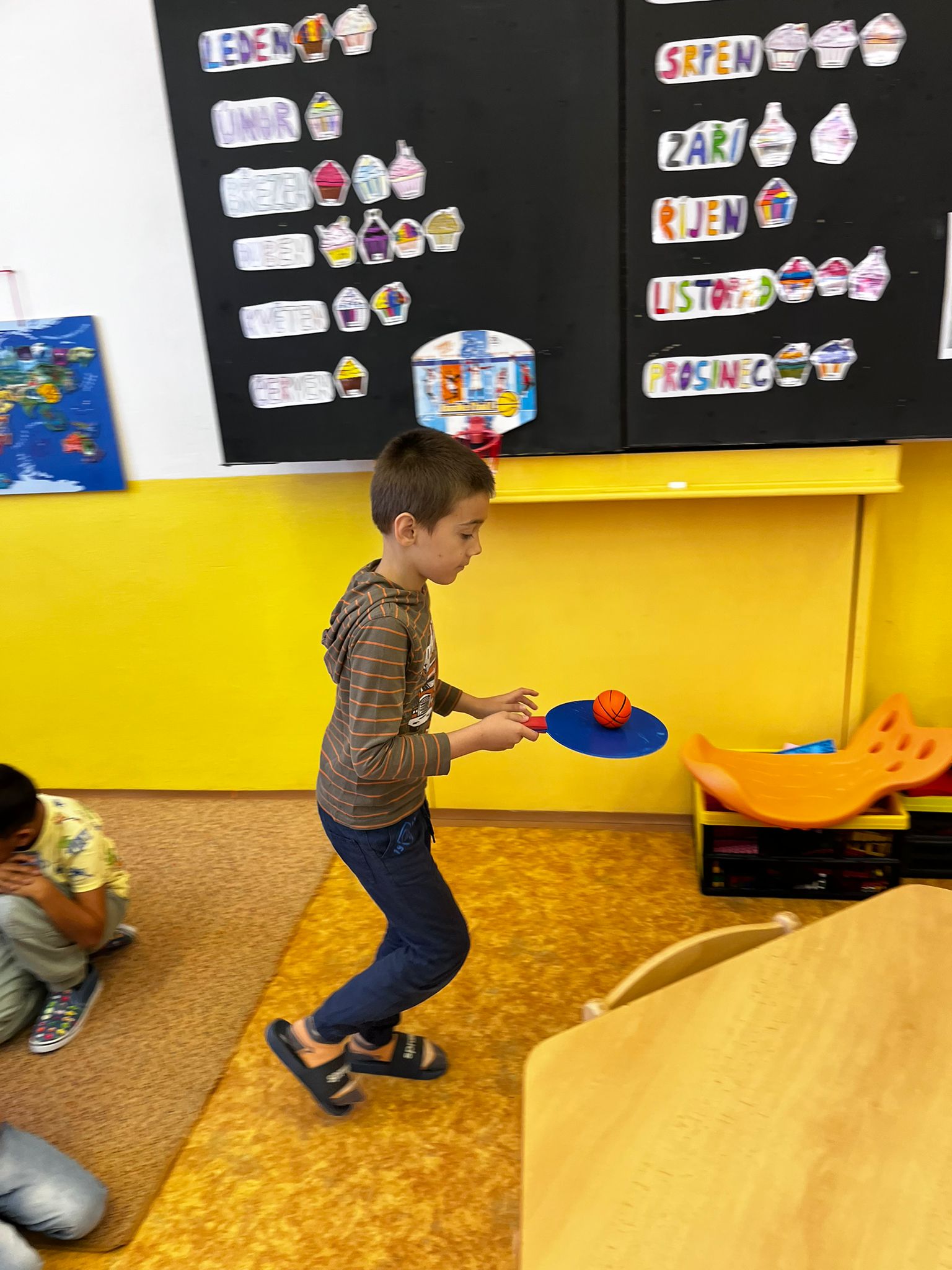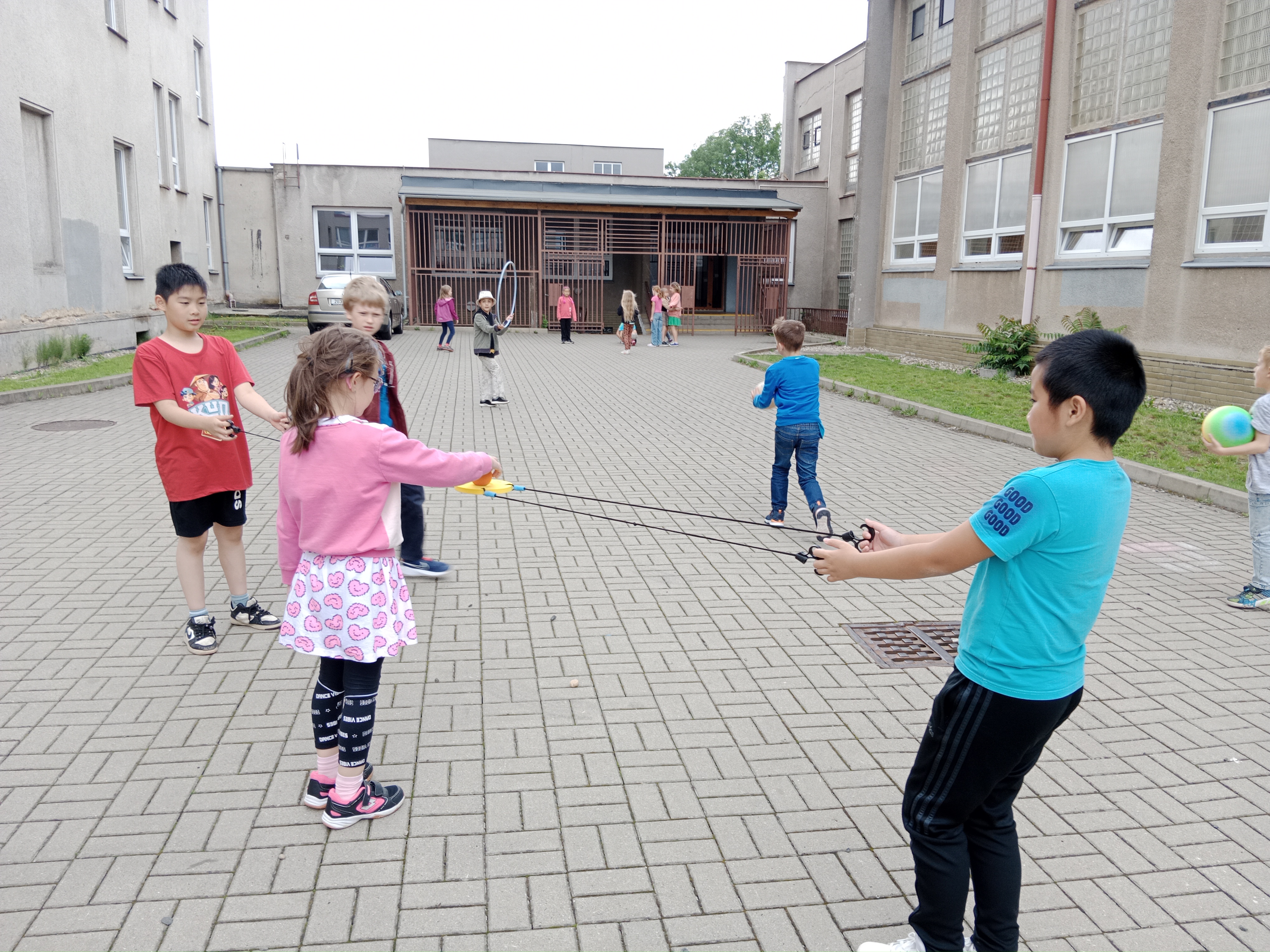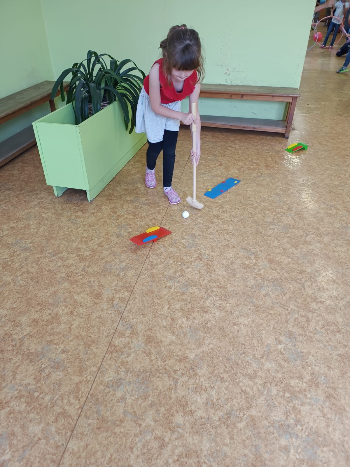 Děti si užívaly oslavy také venku, kde měly na výběr plno možností vyžití, například kopaná, chůze po kladině, na chůdách, hra Golf, kuželky, naše další sportovní vybavení, také tanec a zpěv při hudbě.