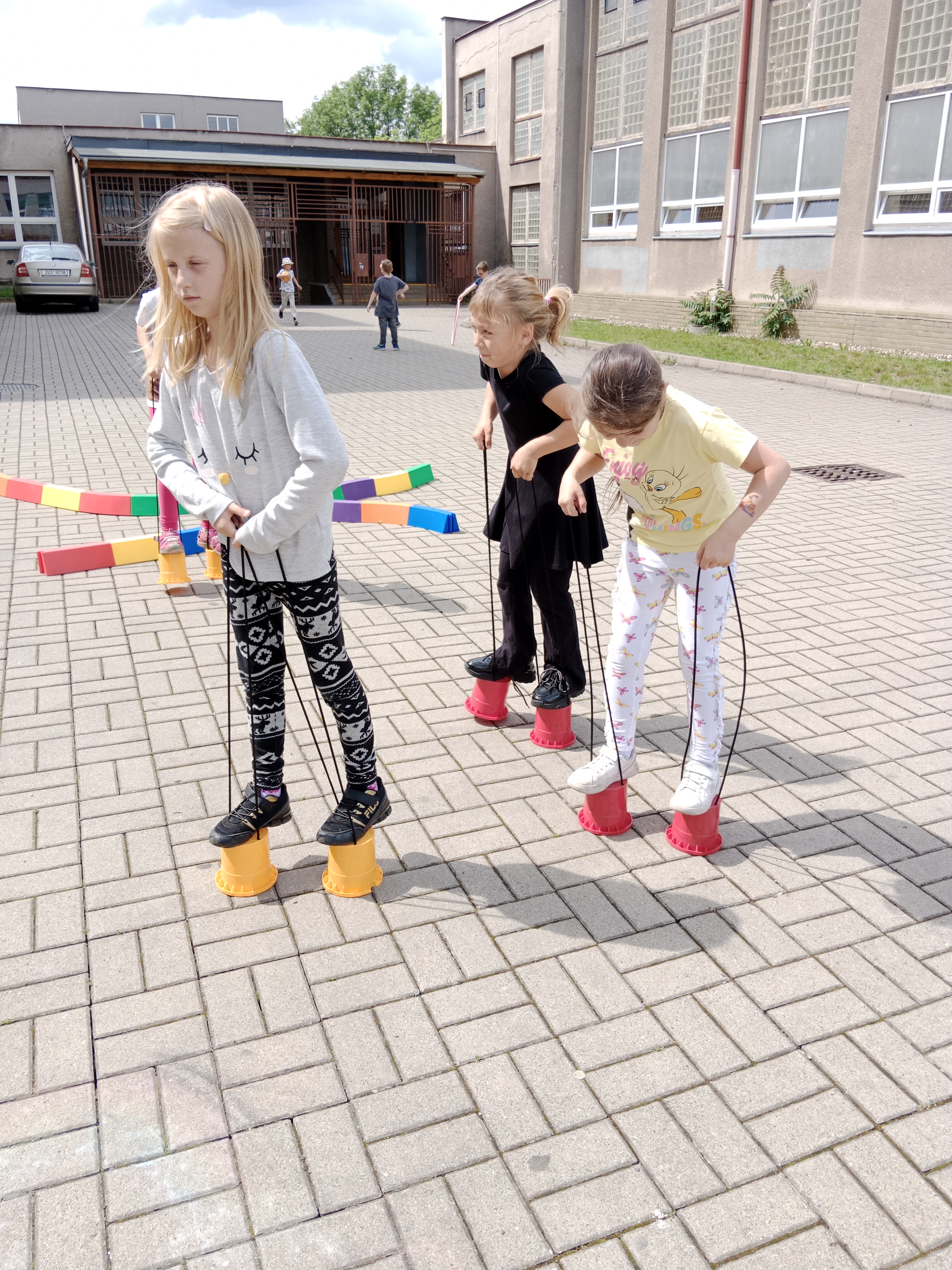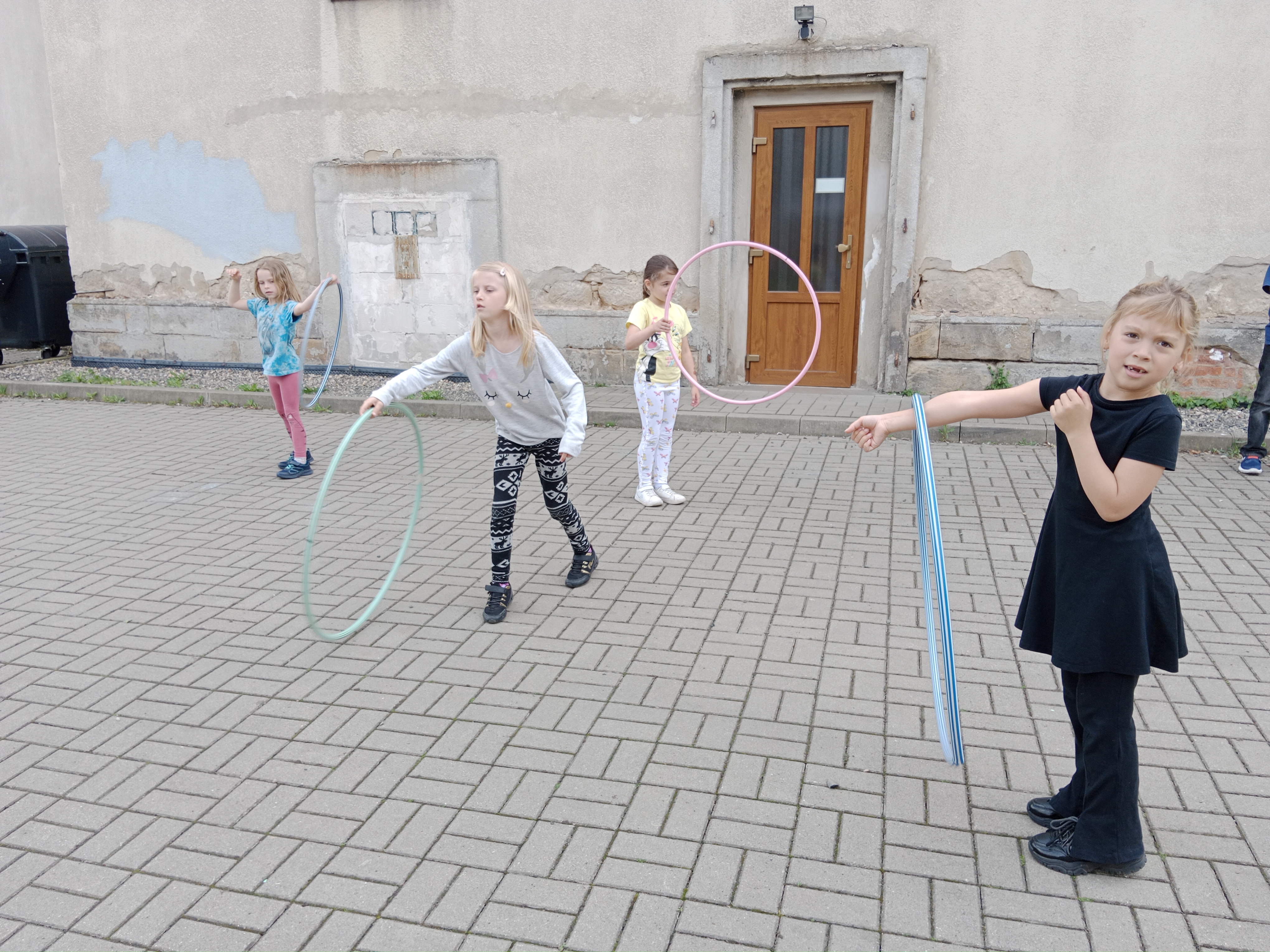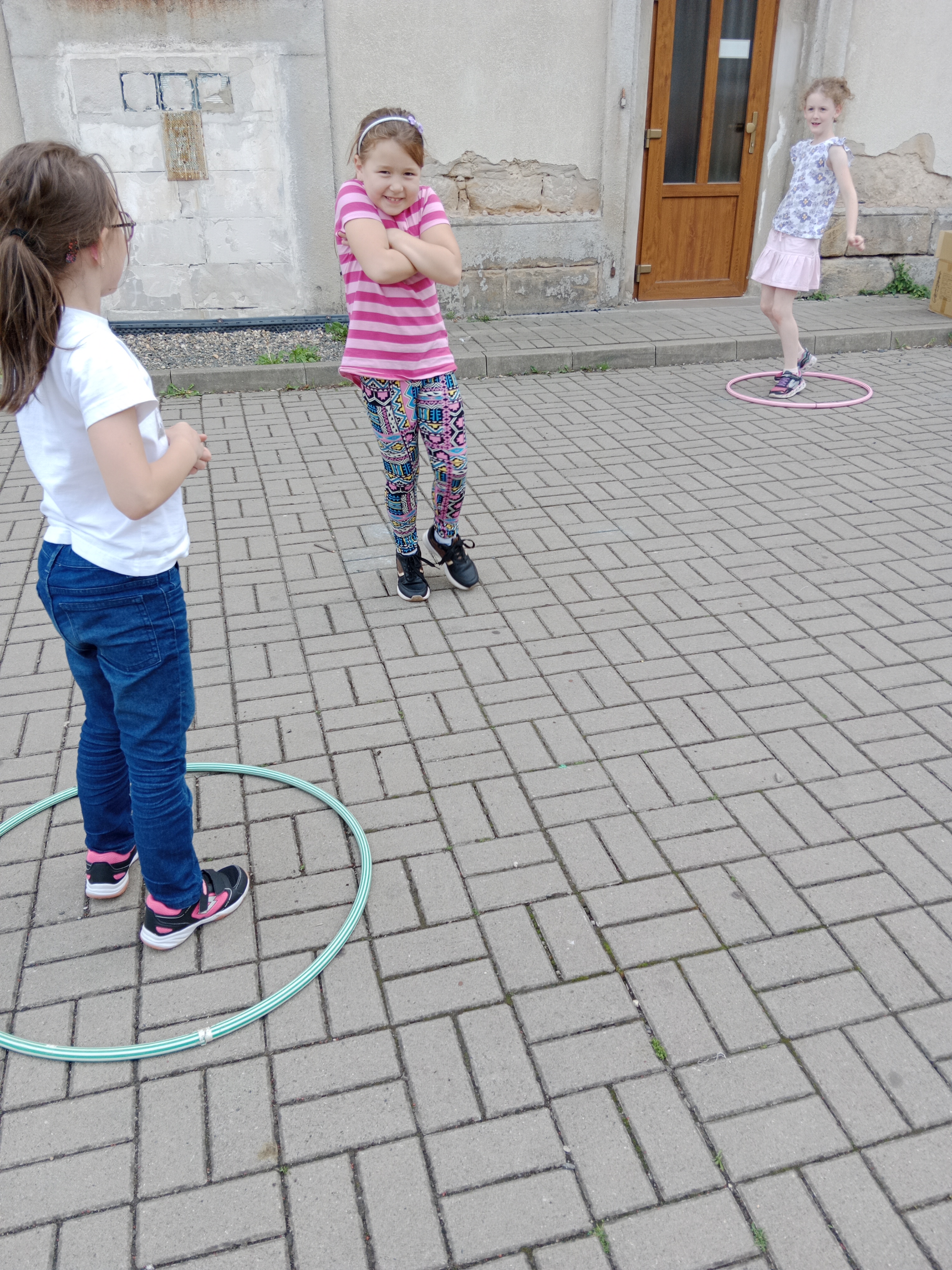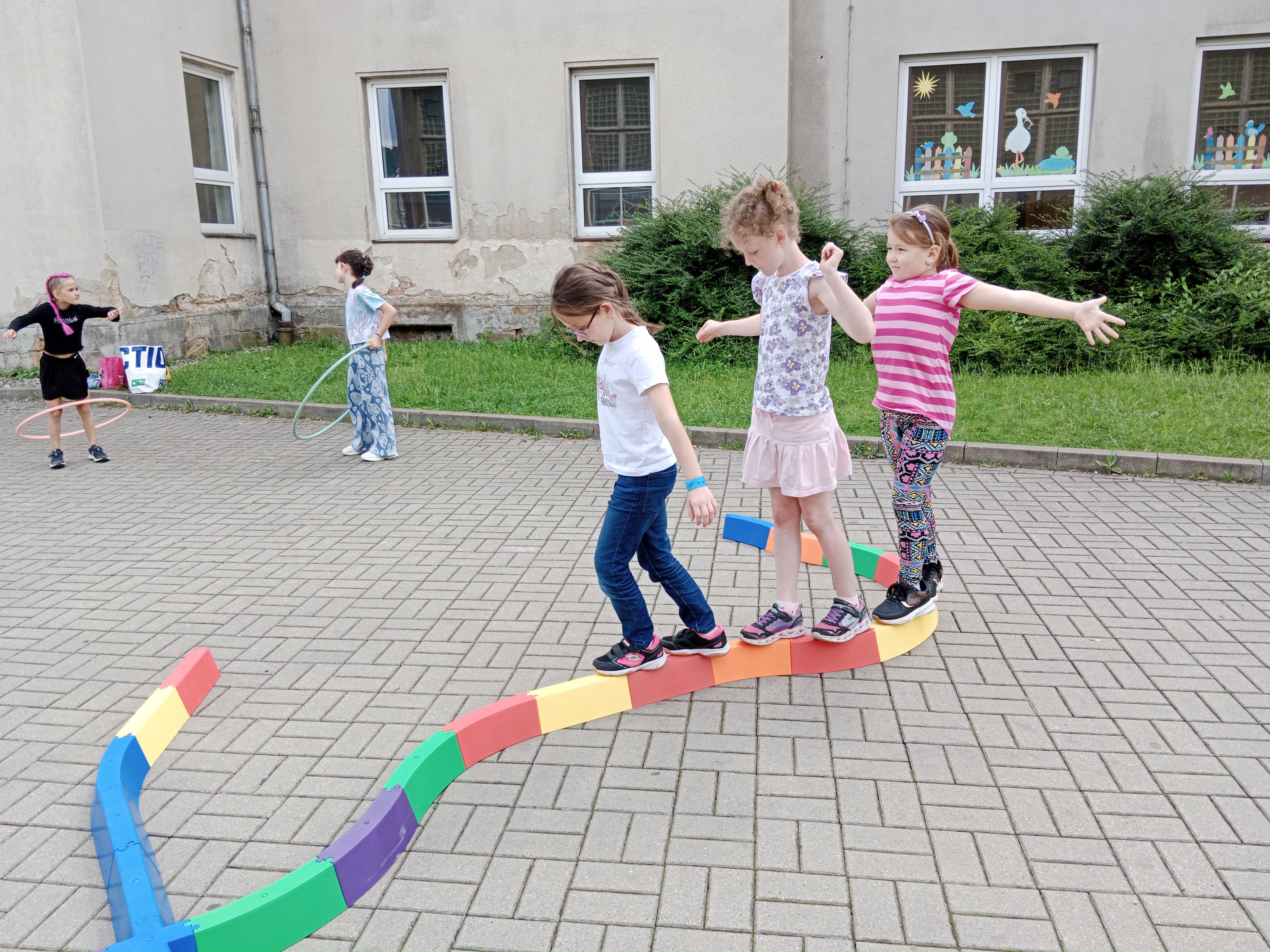 Děti si užívaly oslavy také venku, kde měly na výběr plno možností vyžití, například kopaná, chůze po kladině, na chůdách, hra Golf, kuželky, naše další sportovní vybavení, také tanec a zpěv při hudbě.