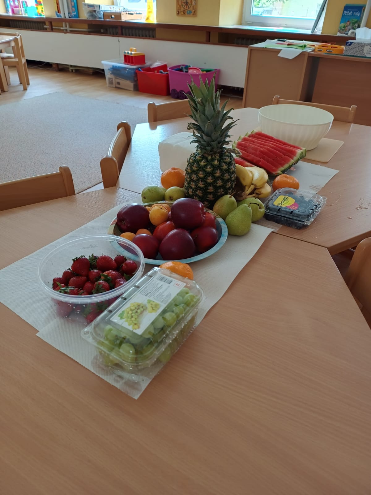 Pro děti jsme nakoupili deset druhů domácího i exotického ovoce, aby mohly ochutnat a porovnat různé barvy, tvary a chutě.