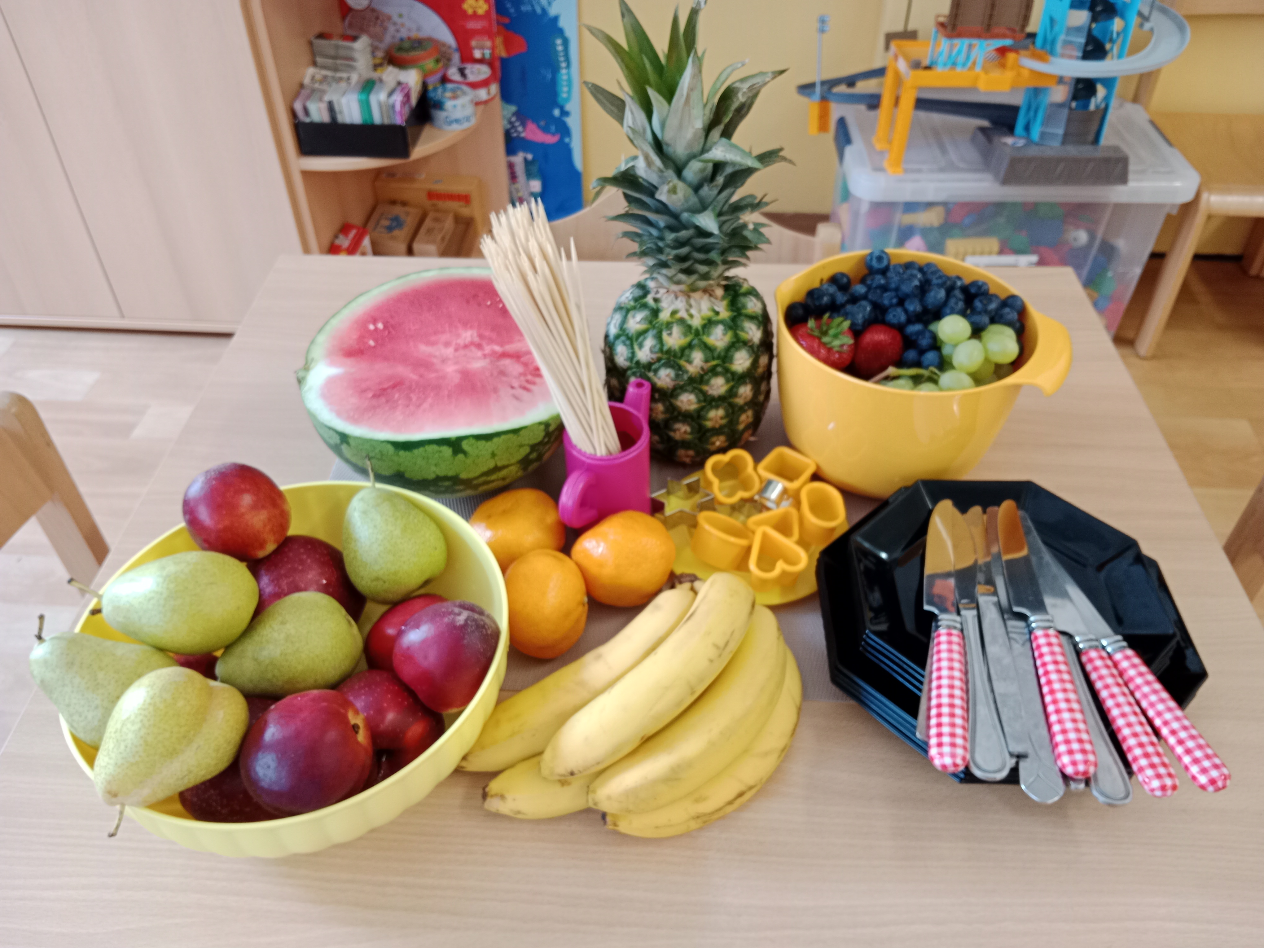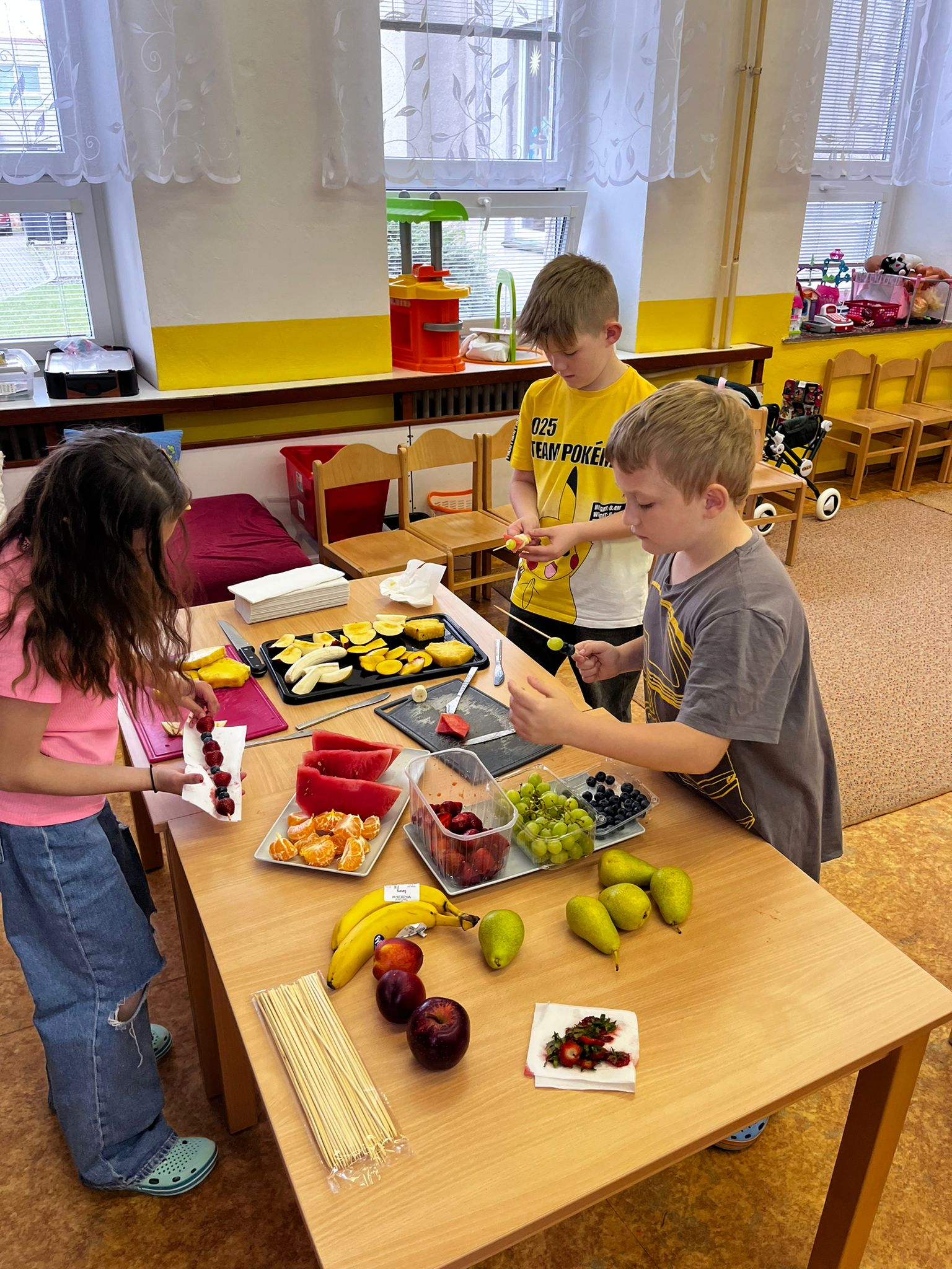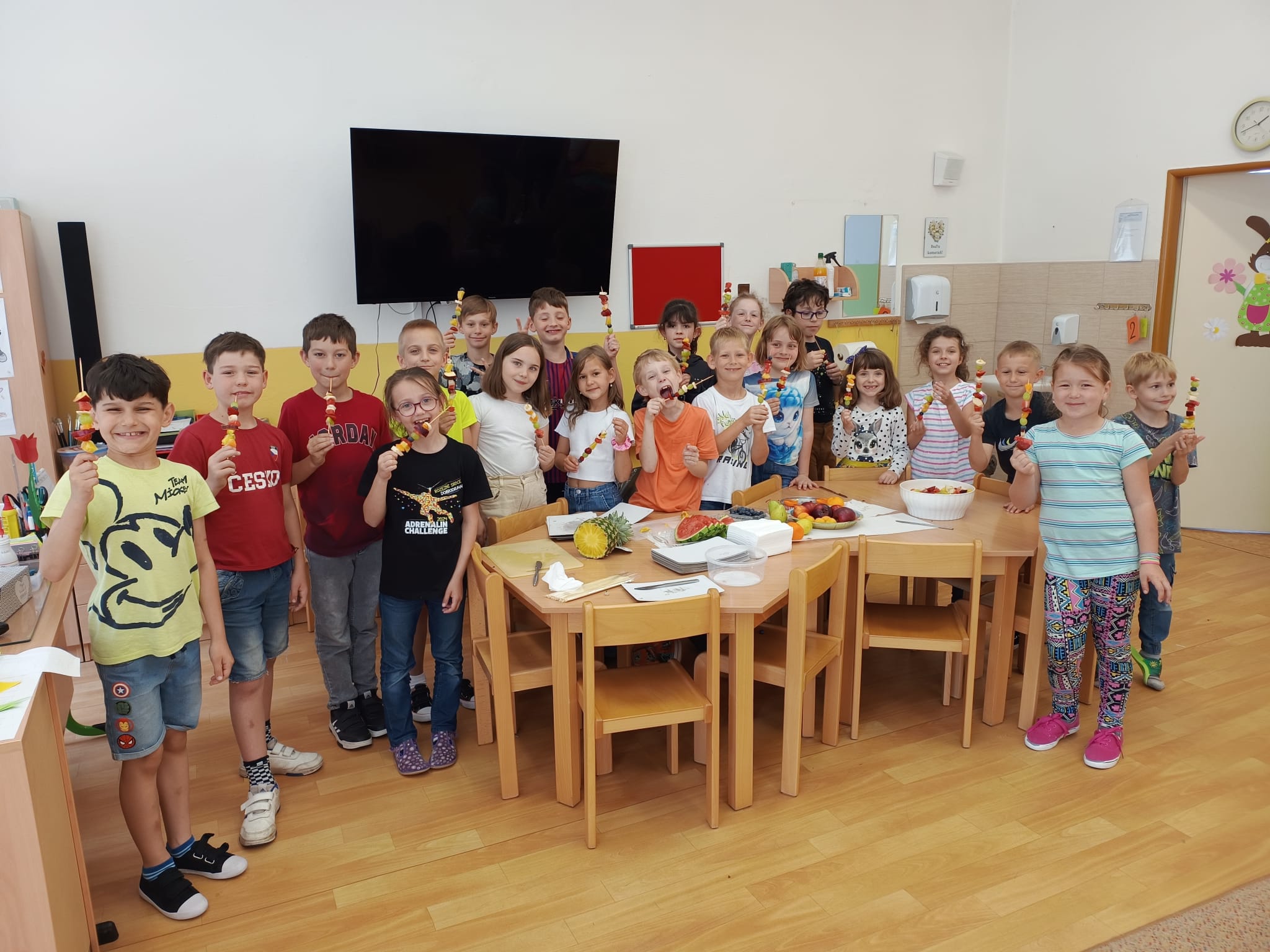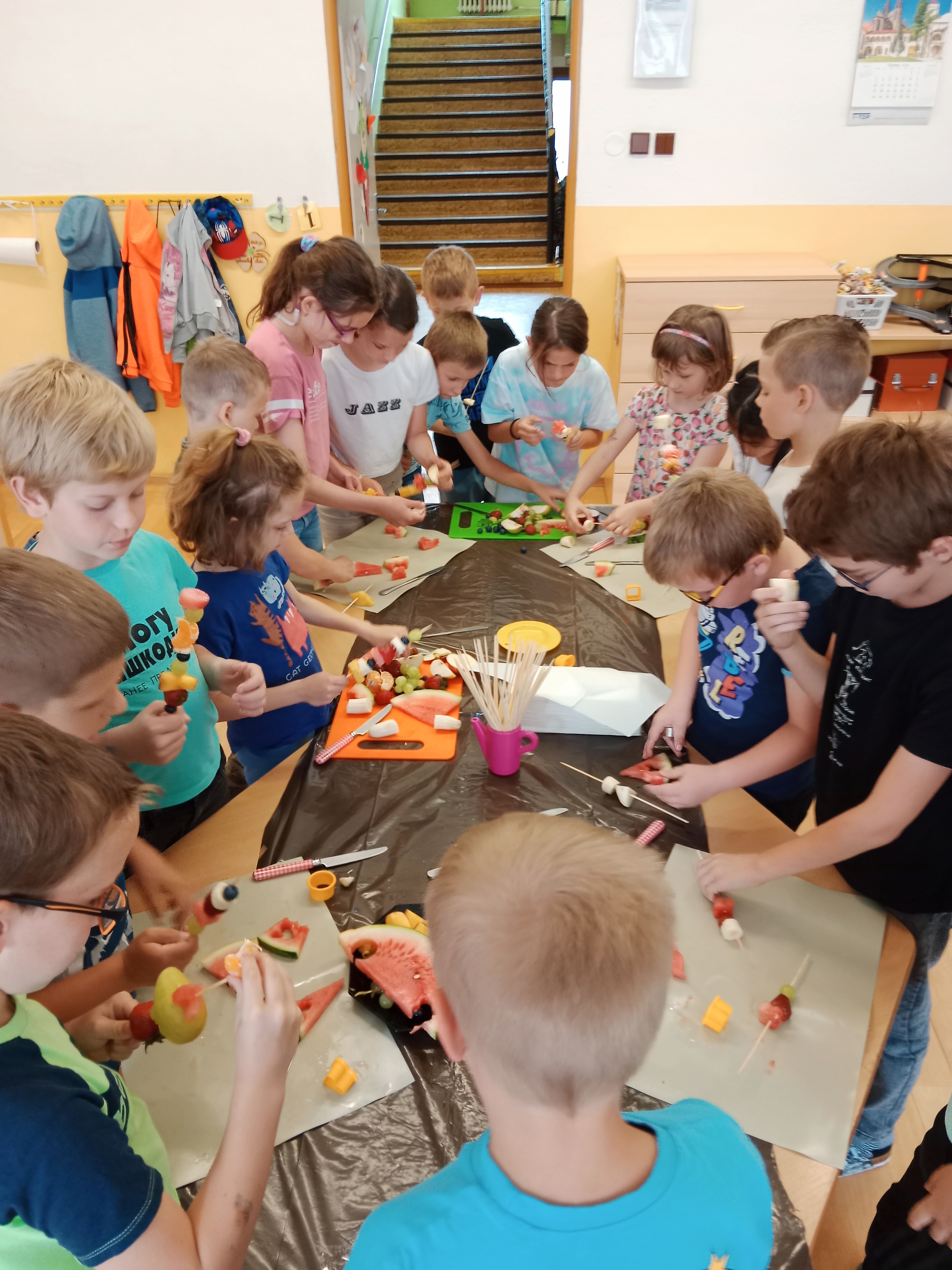 Zahráli jsme si Živé ovocné pexeso, luštili křížovky a zjišťovali odkud některé ovoce pochází. Poté jsme společně očistili a nakrájeli všechno ovoce a pustili se do výroby ovocných špízů, smoothie nebo dortíků, které si vytvářeli i za pomoci vykrajovátek jako nápady na dětskou či rodinnou párty.