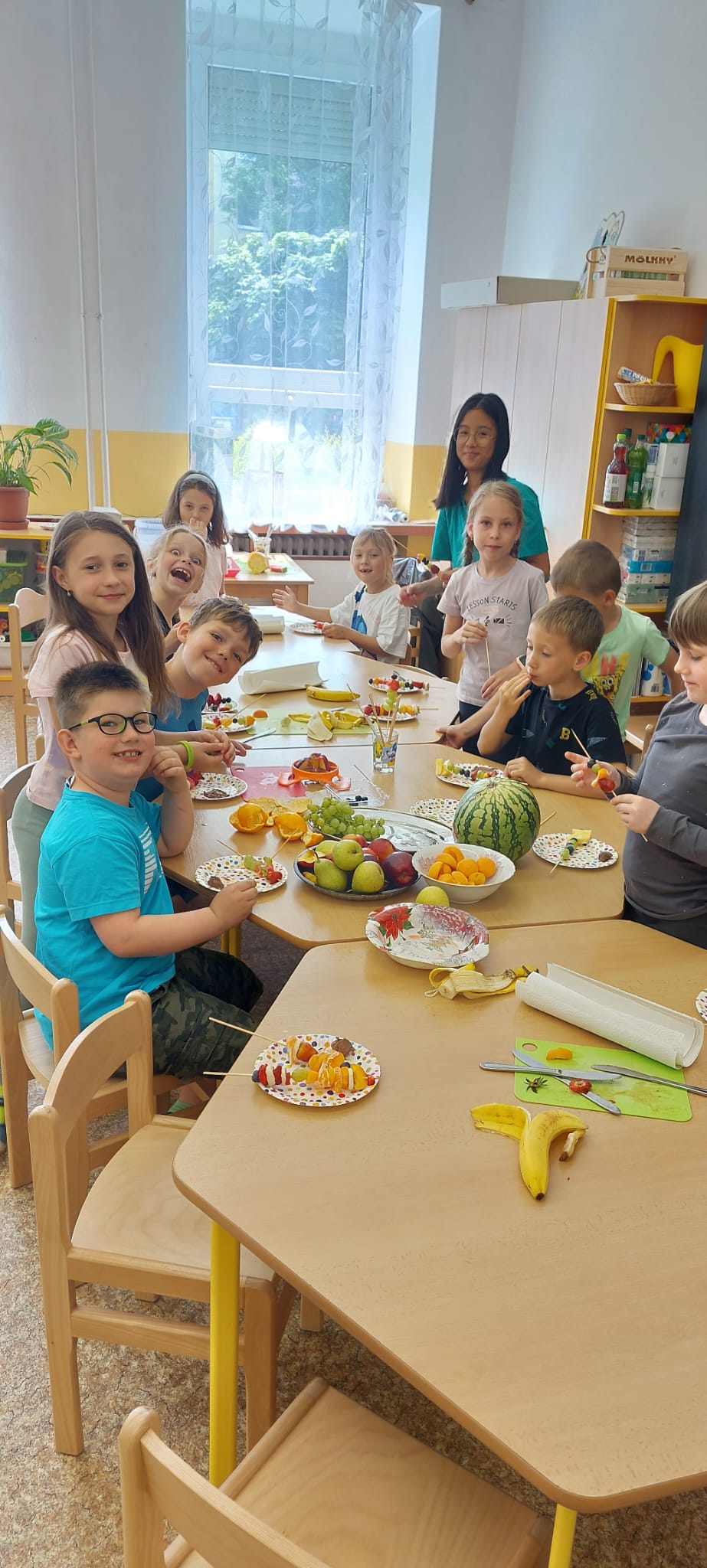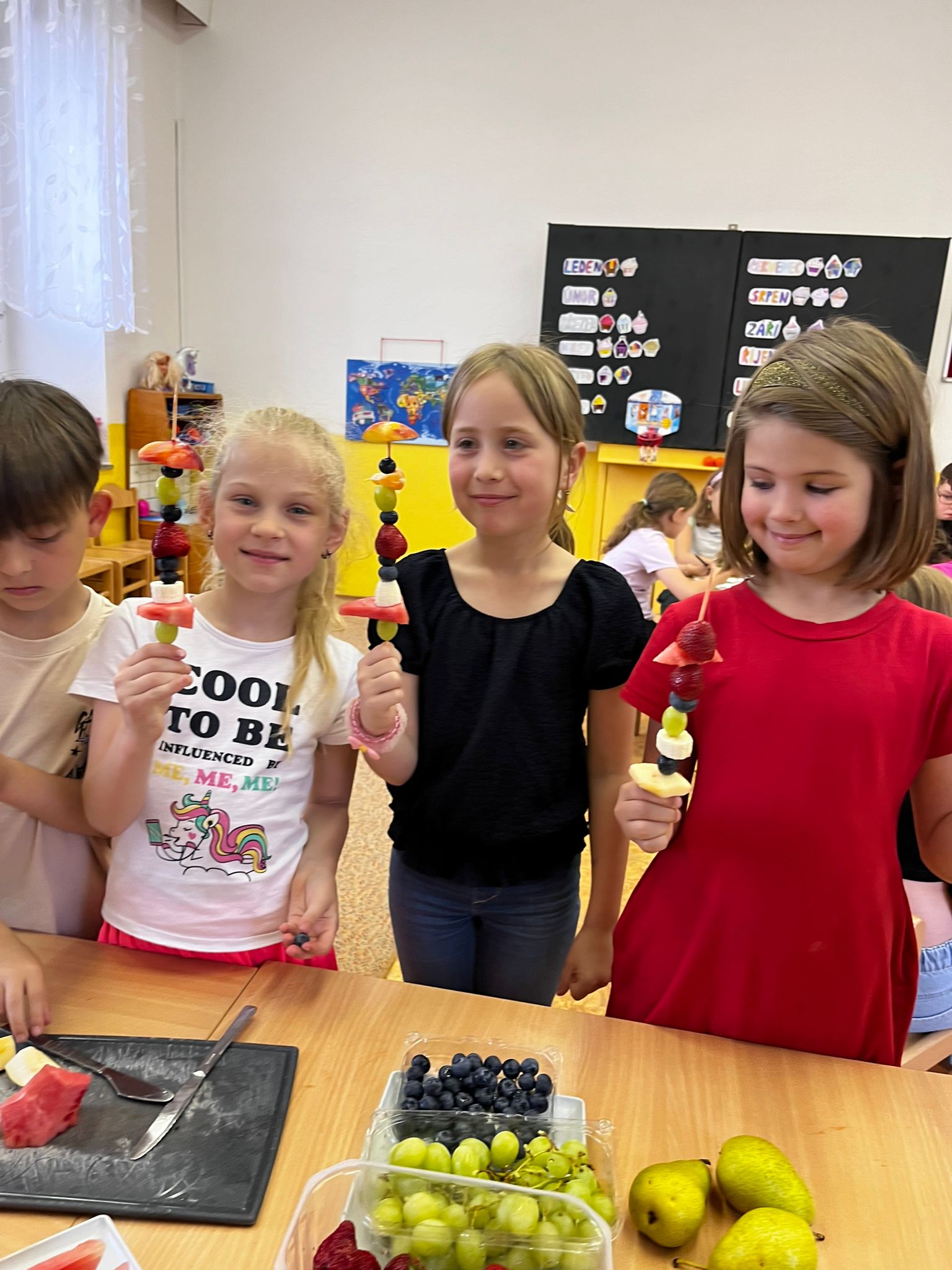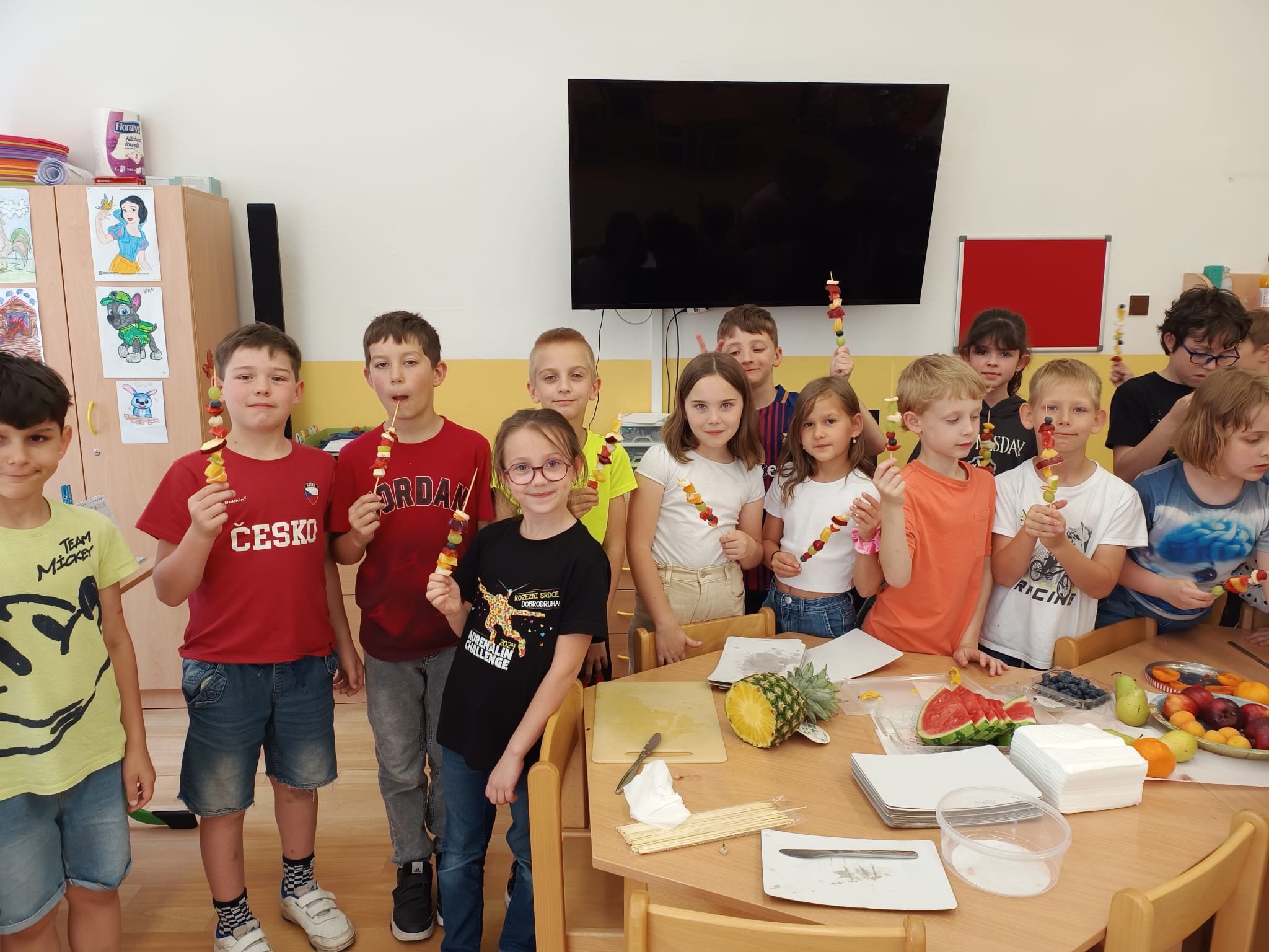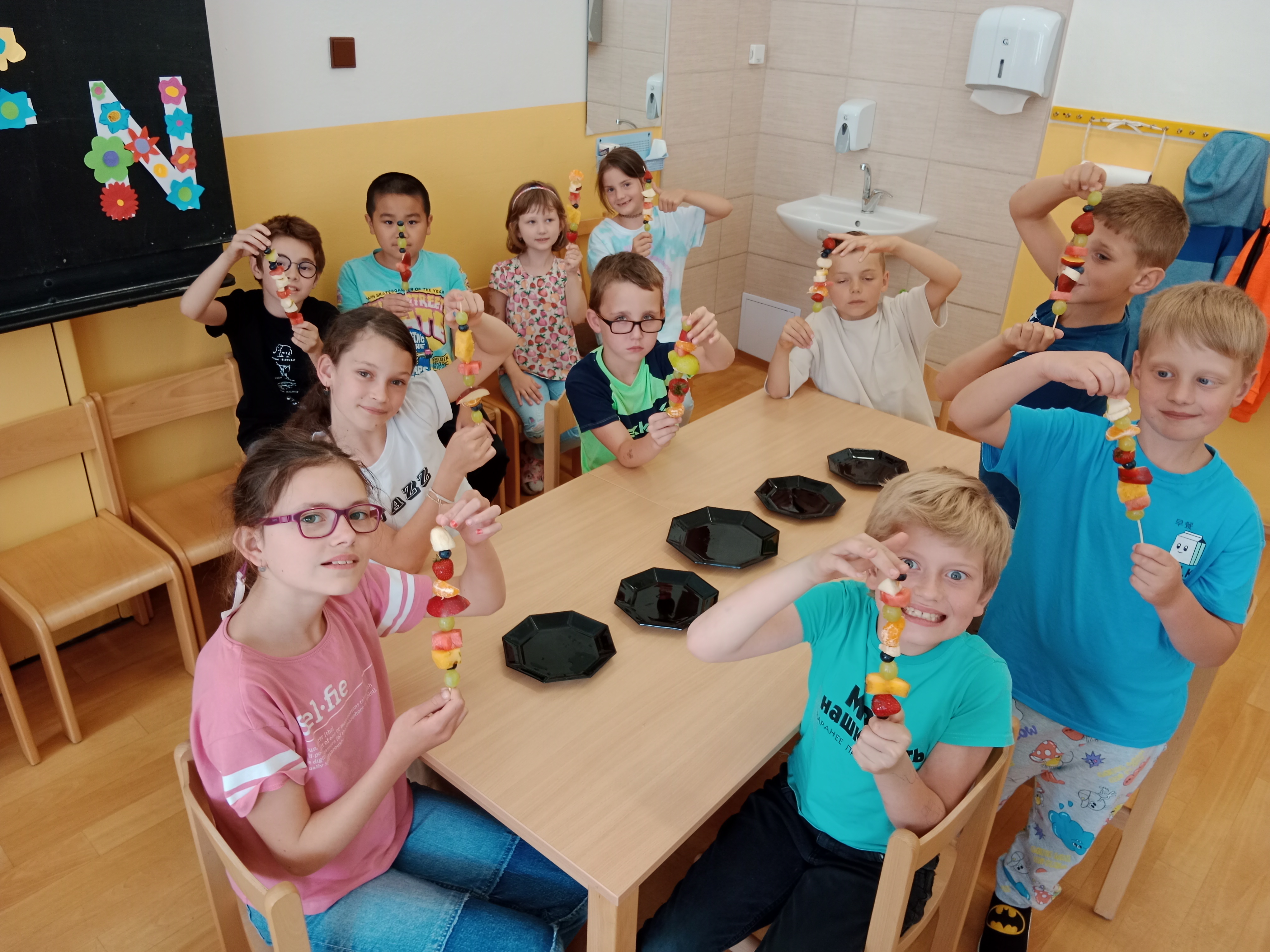 Zahráli jsme si Živé ovocné pexeso, luštili křížovky a zjišťovali odkud některé ovoce pochází. Poté jsme společně očistili a nakrájeli všechno ovoce a pustili se do výroby ovocných špízů, smoothie nebo dortíků, které si vytvářeli i za pomoci vykrajovátek jako nápady na dětskou či rodinnou párty.