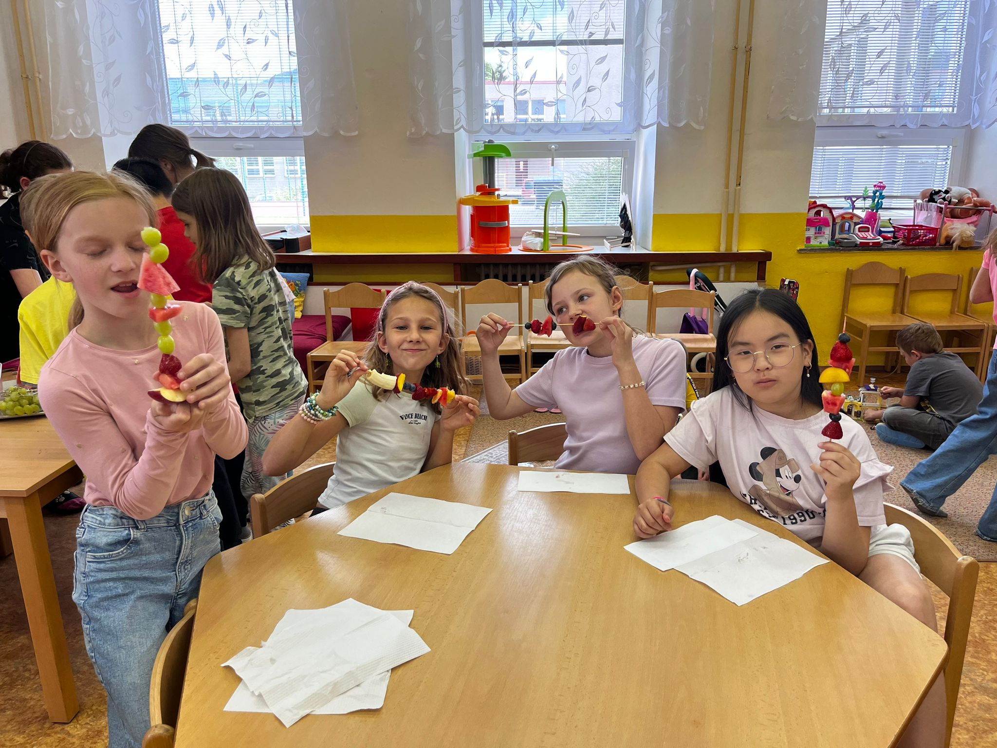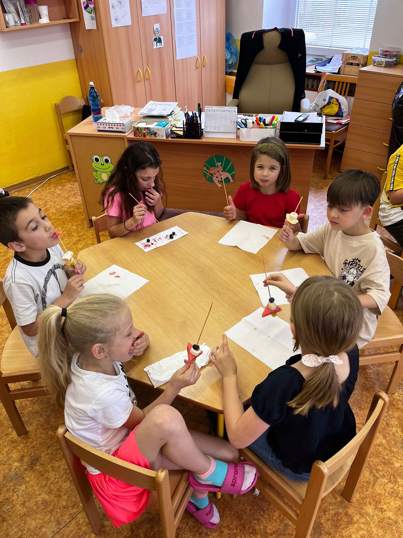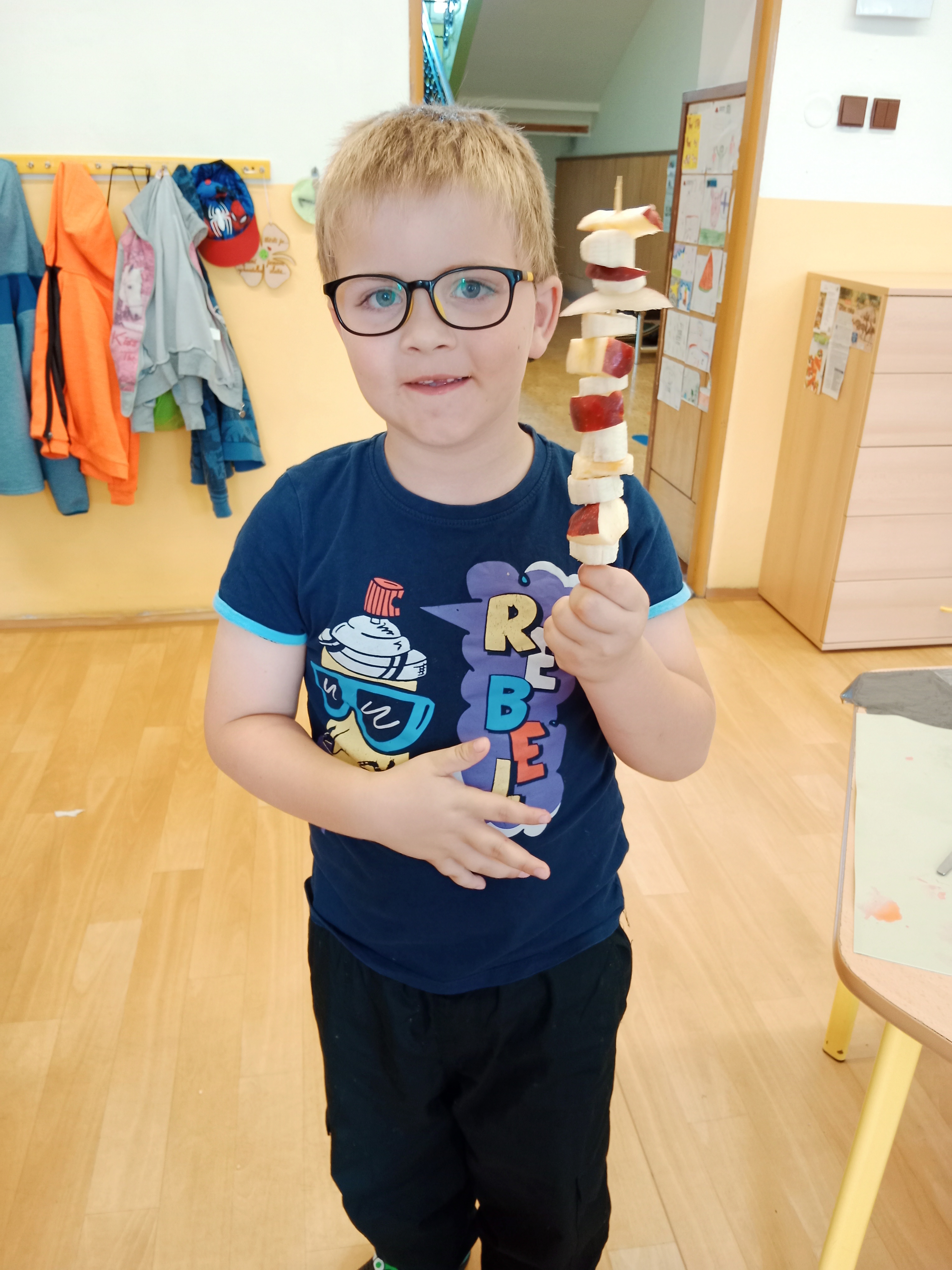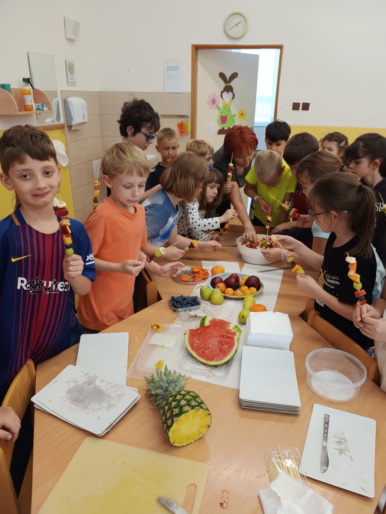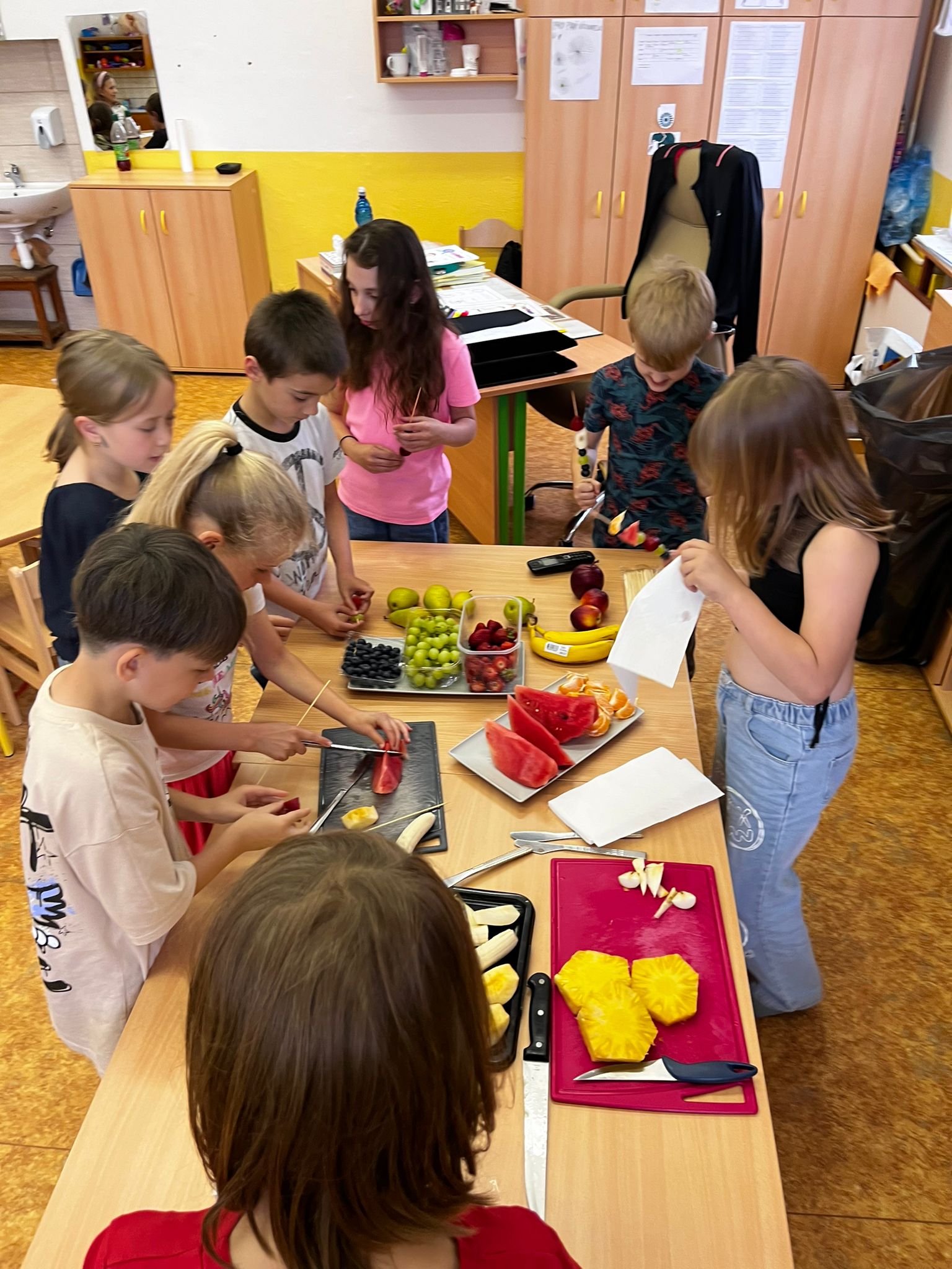 Zahráli jsme si Živé ovocné pexeso, luštili křížovky a zjišťovali odkud některé ovoce pochází. Poté jsme společně očistili a nakrájeli všechno ovoce a pustili se do výroby ovocných špízů, smoothie nebo dortíků, které si vytvářeli i za pomoci vykrajovátek jako nápady na dětskou či rodinnou párty.