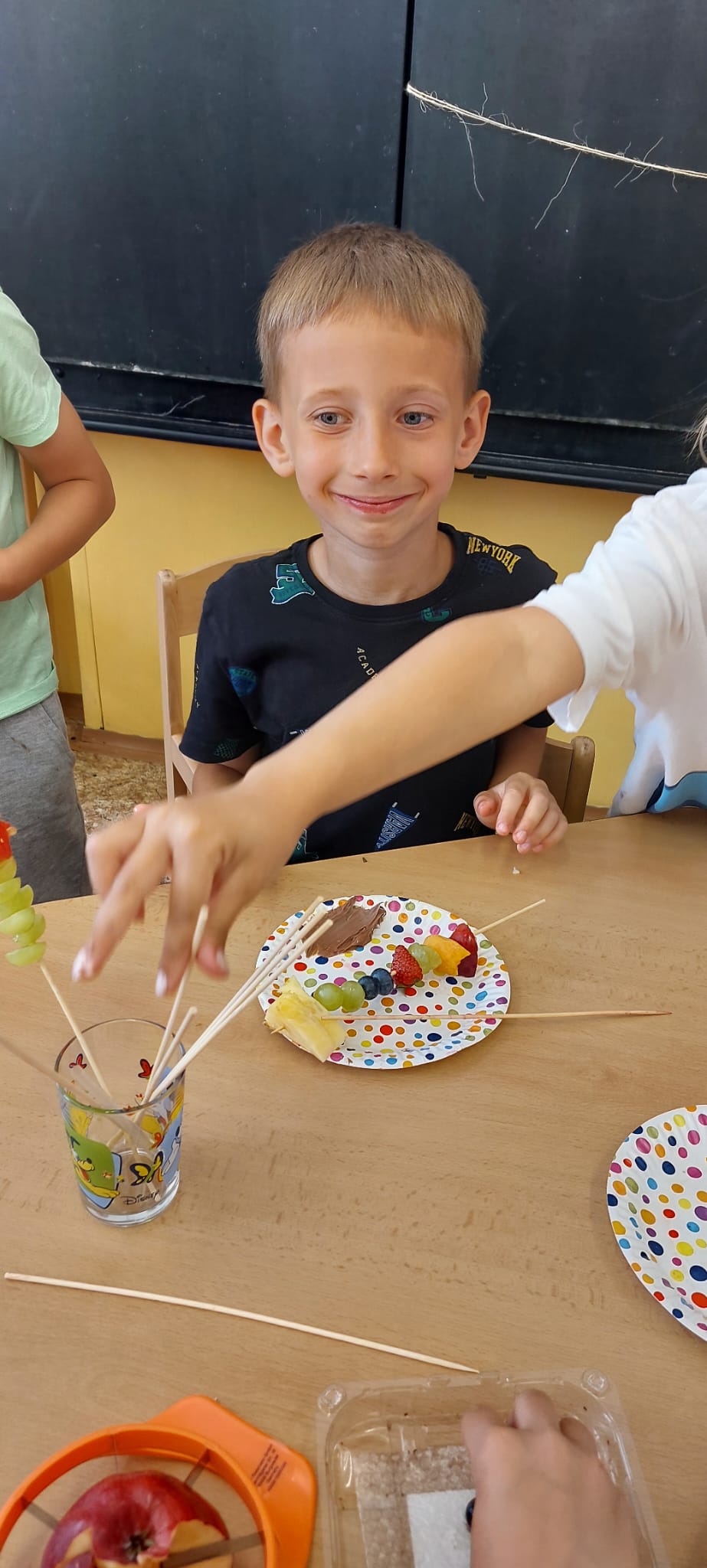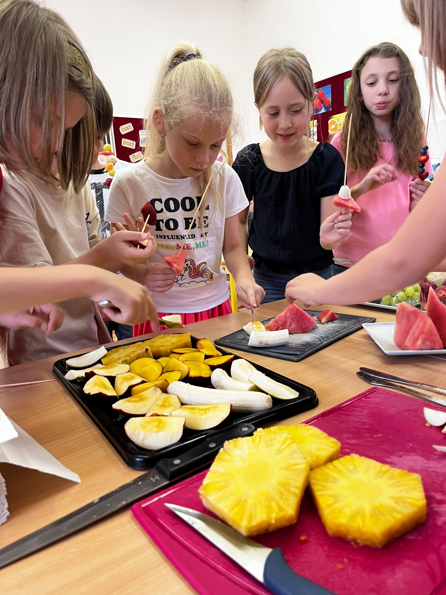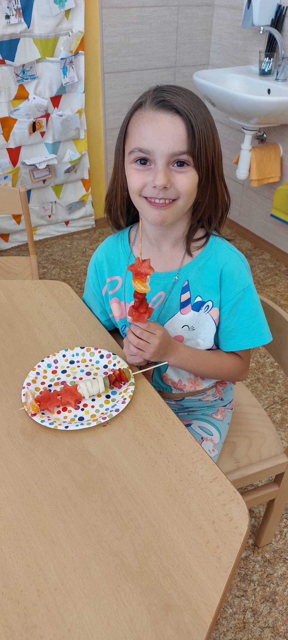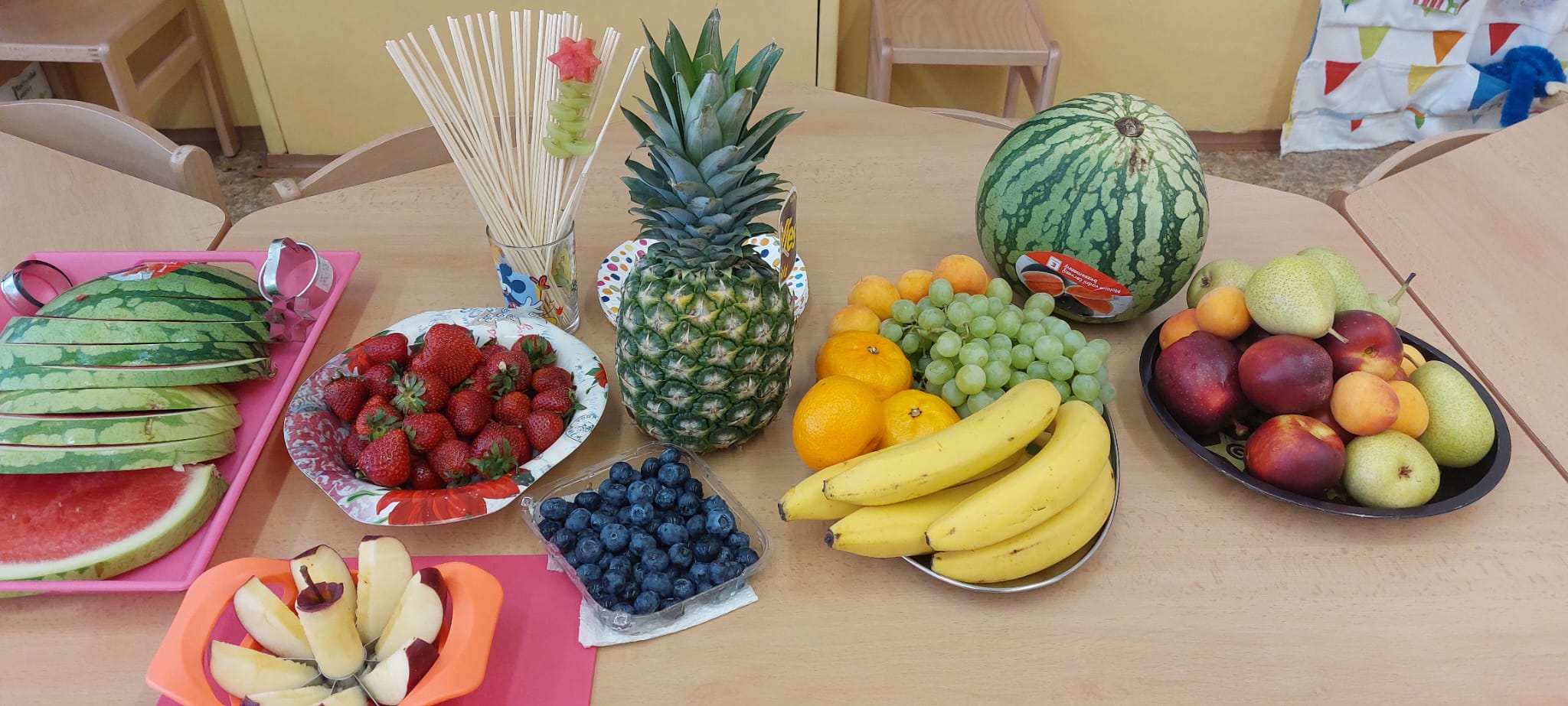 Zahráli jsme si Živé ovocné pexeso, luštili křížovky a zjišťovali odkud některé ovoce pochází. Poté jsme společně očistili a nakrájeli všechno ovoce a pustili se do výroby ovocných špízů, smoothie nebo dortíků, které si vytvářeli i za pomoci vykrajovátek jako nápady na dětskou či rodinnou párty.