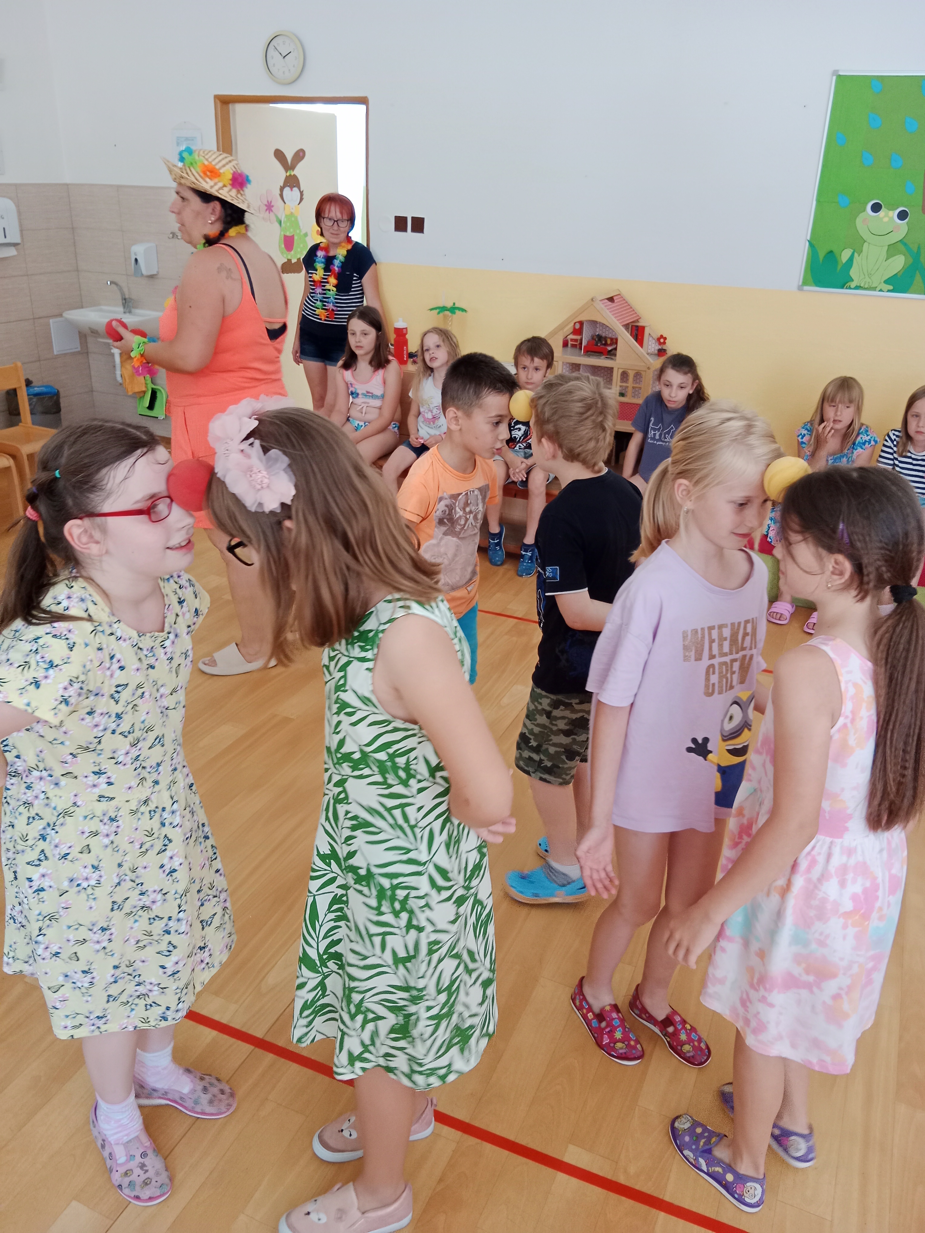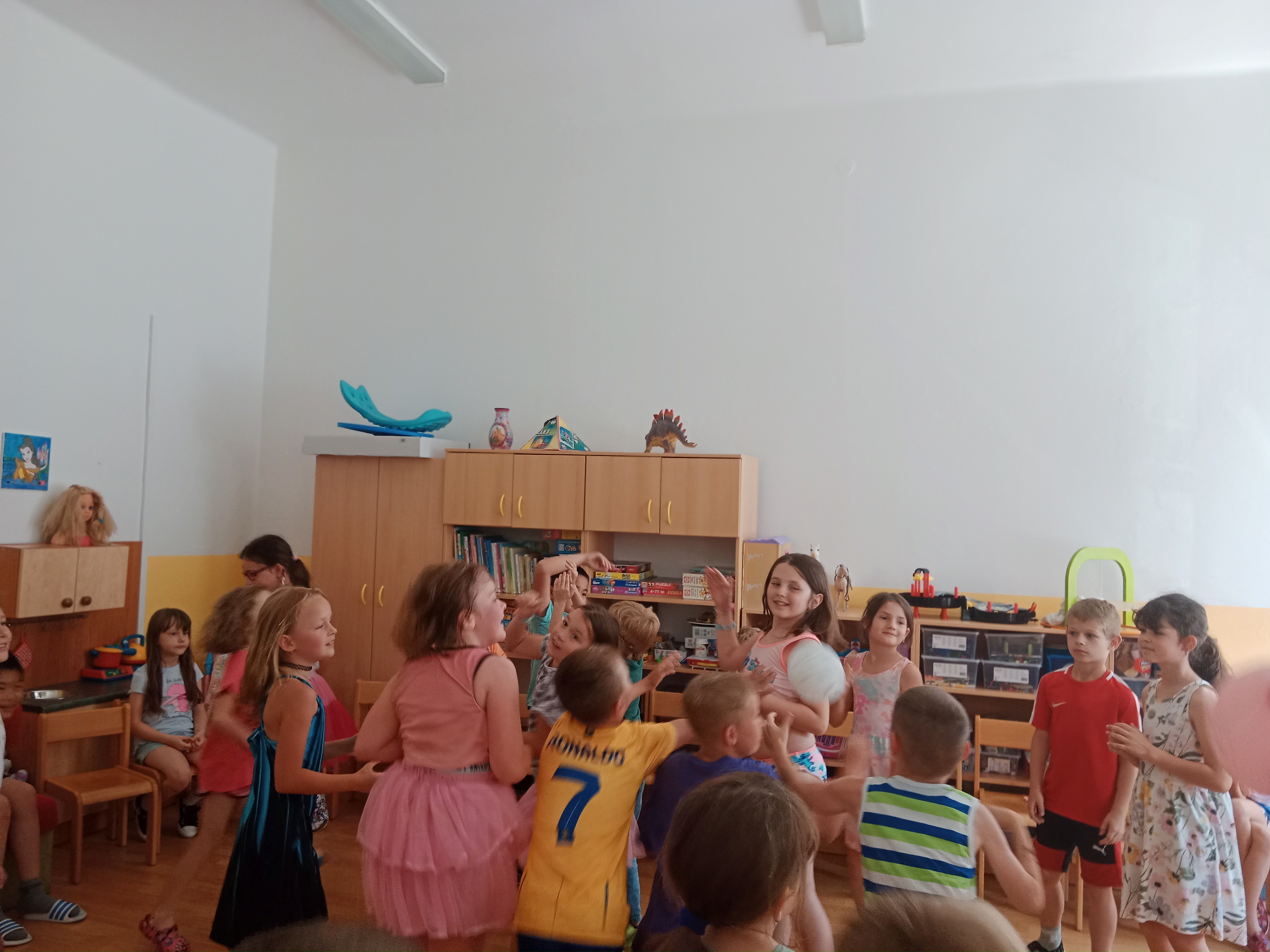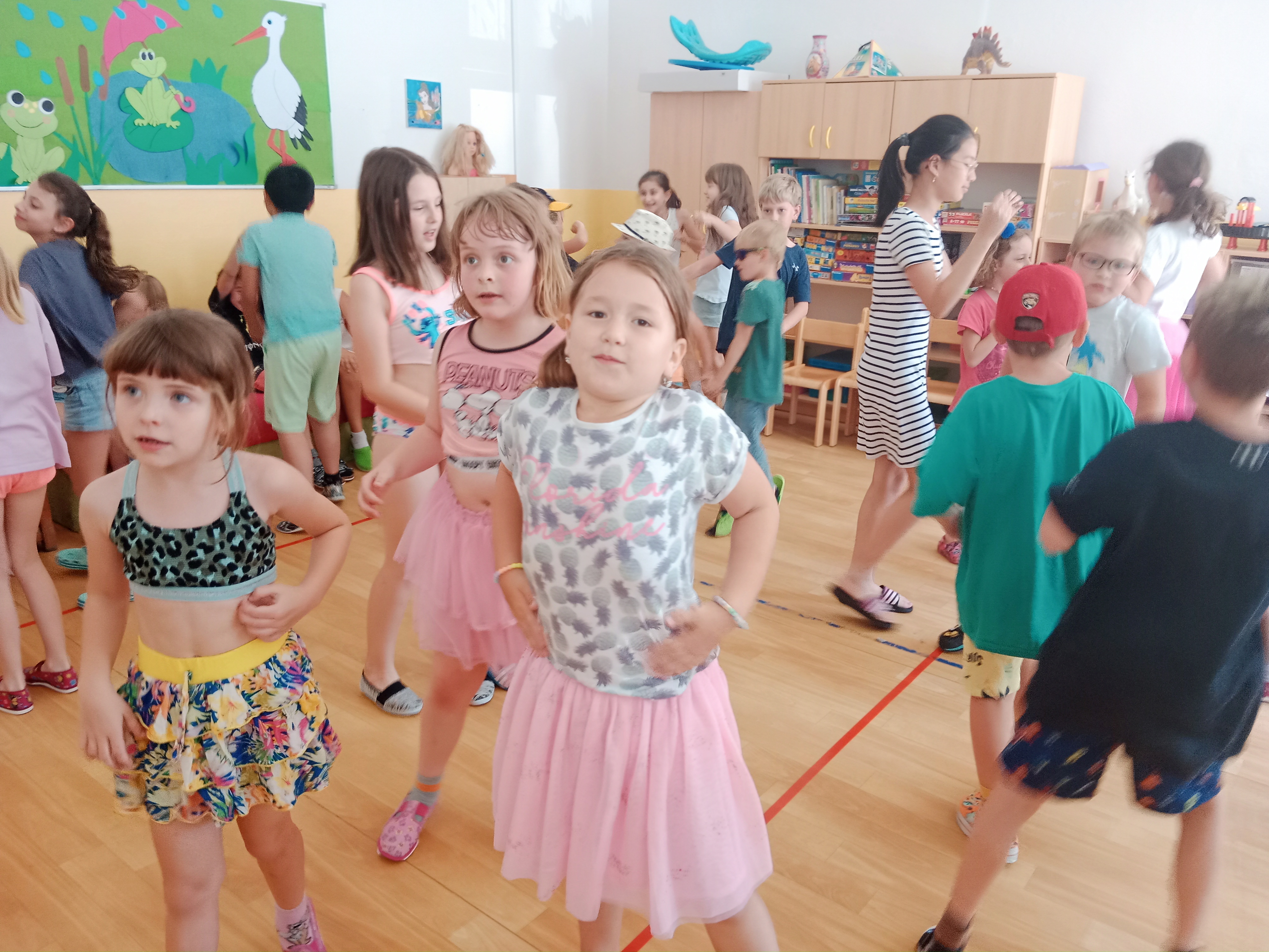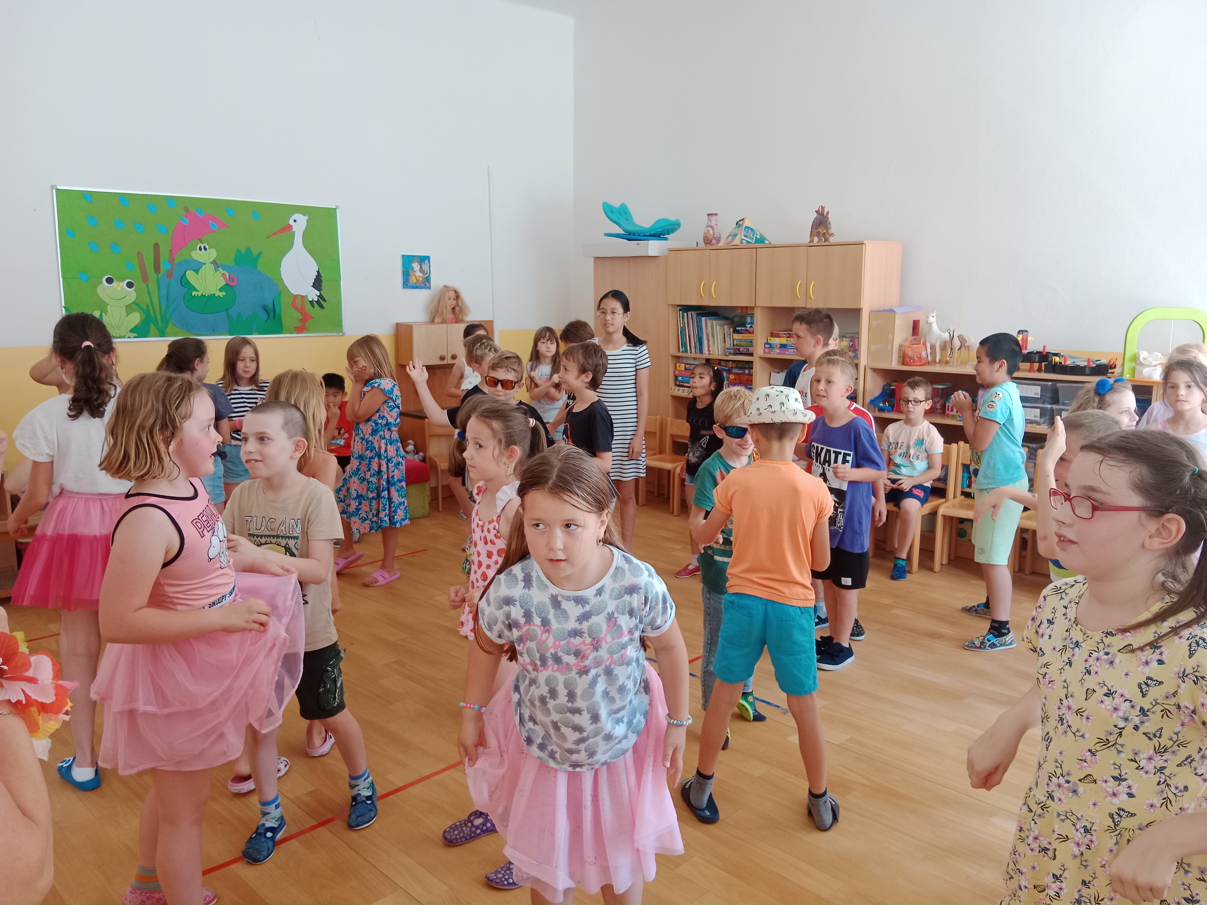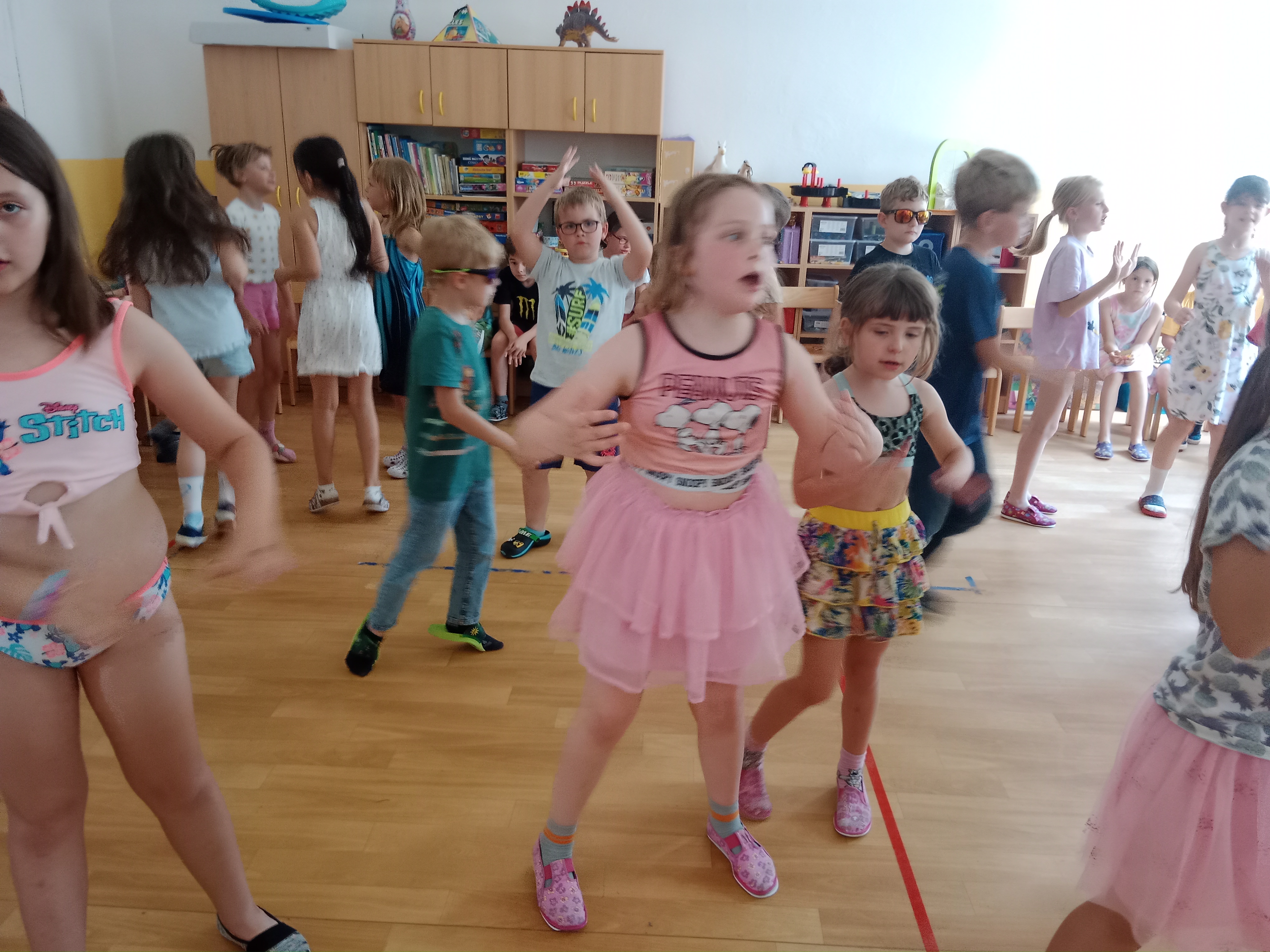 Děti se předvedly ve svých letních, prázdninových ,,outfitech." Tančili jsme a zpívali na známé hity a dětské písničky. Odpoledne jsme si zpestřili soutěží v tanci dvojic s míčkem a hrou Na sochy.