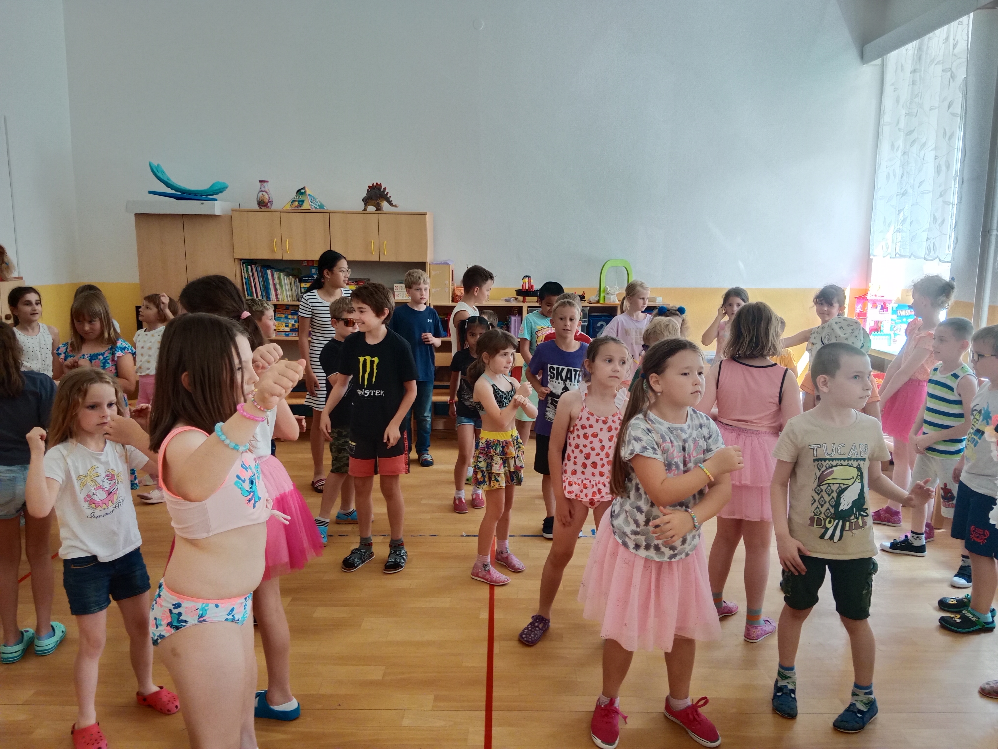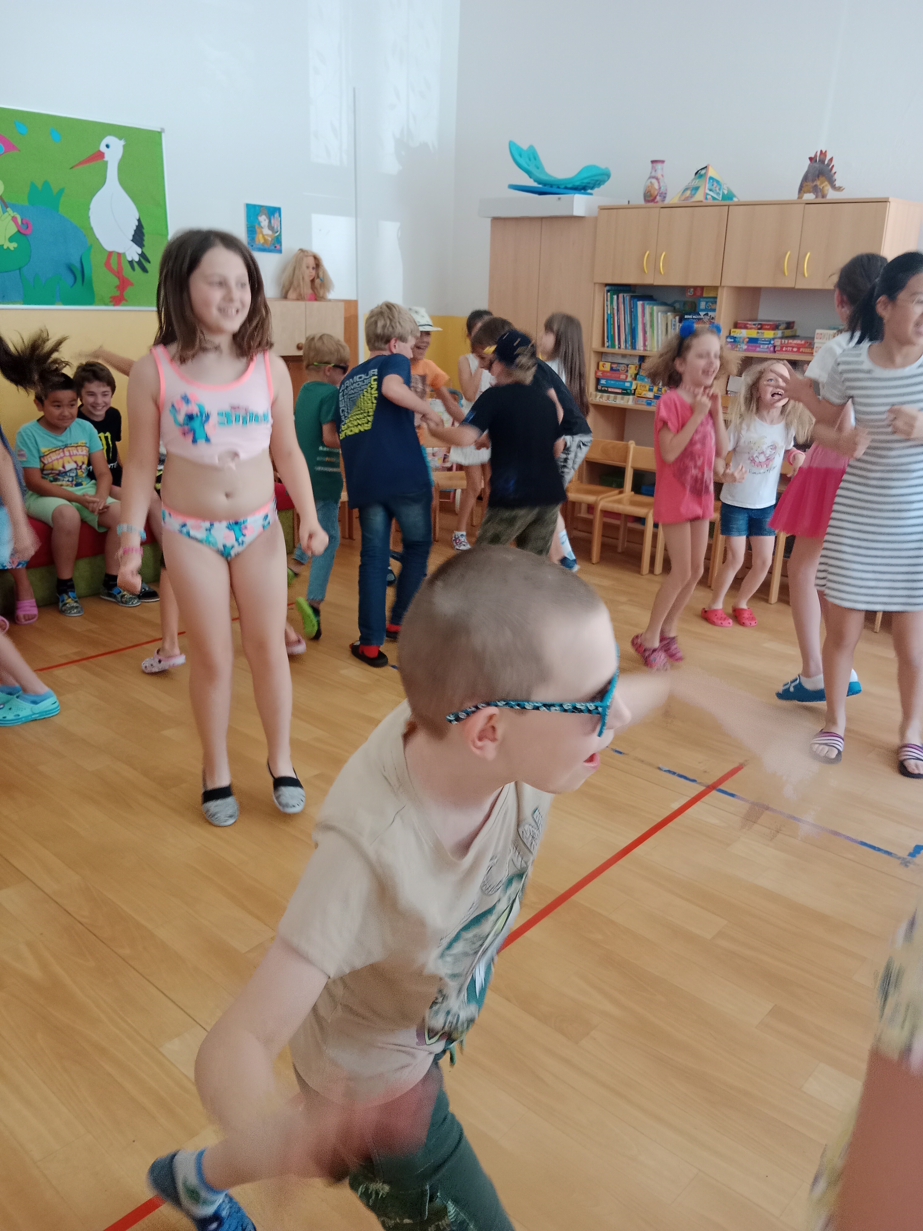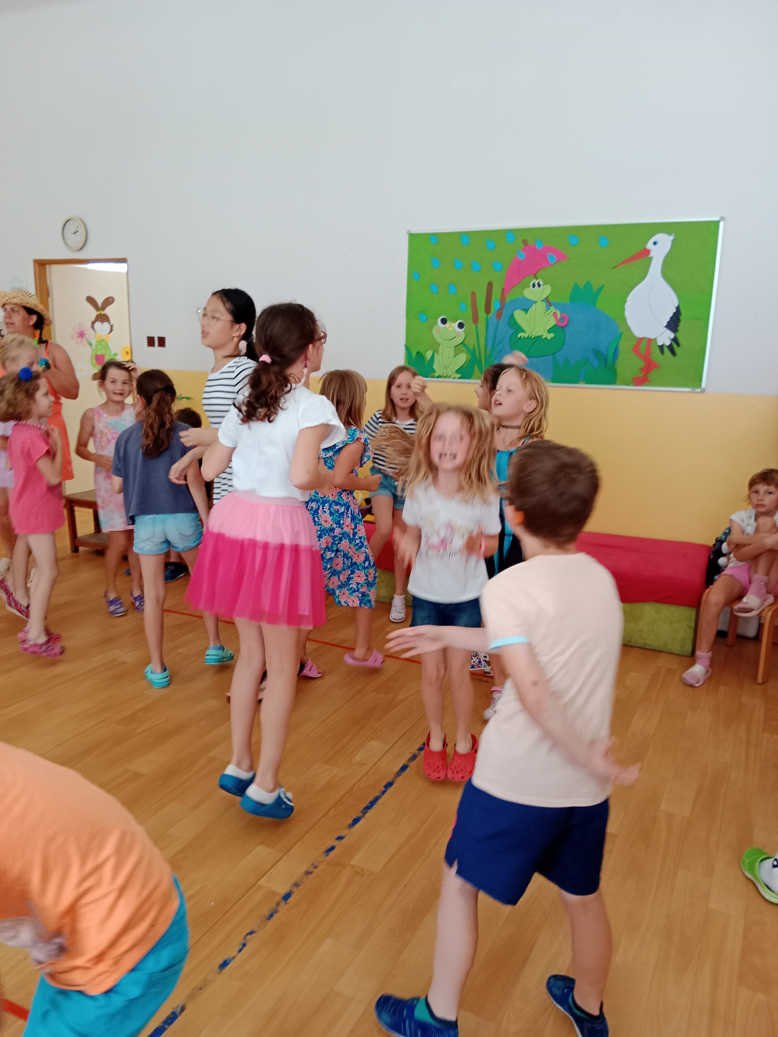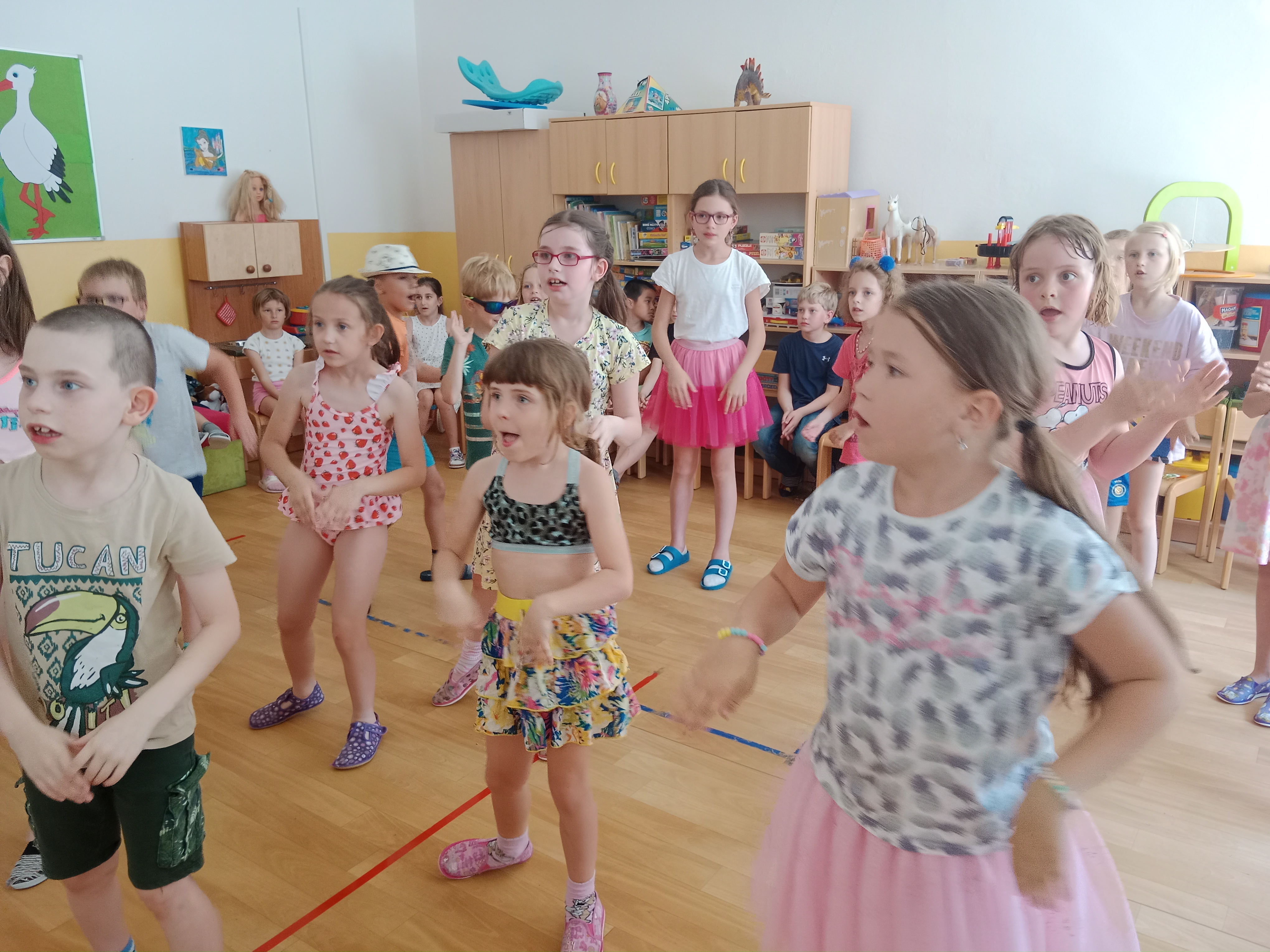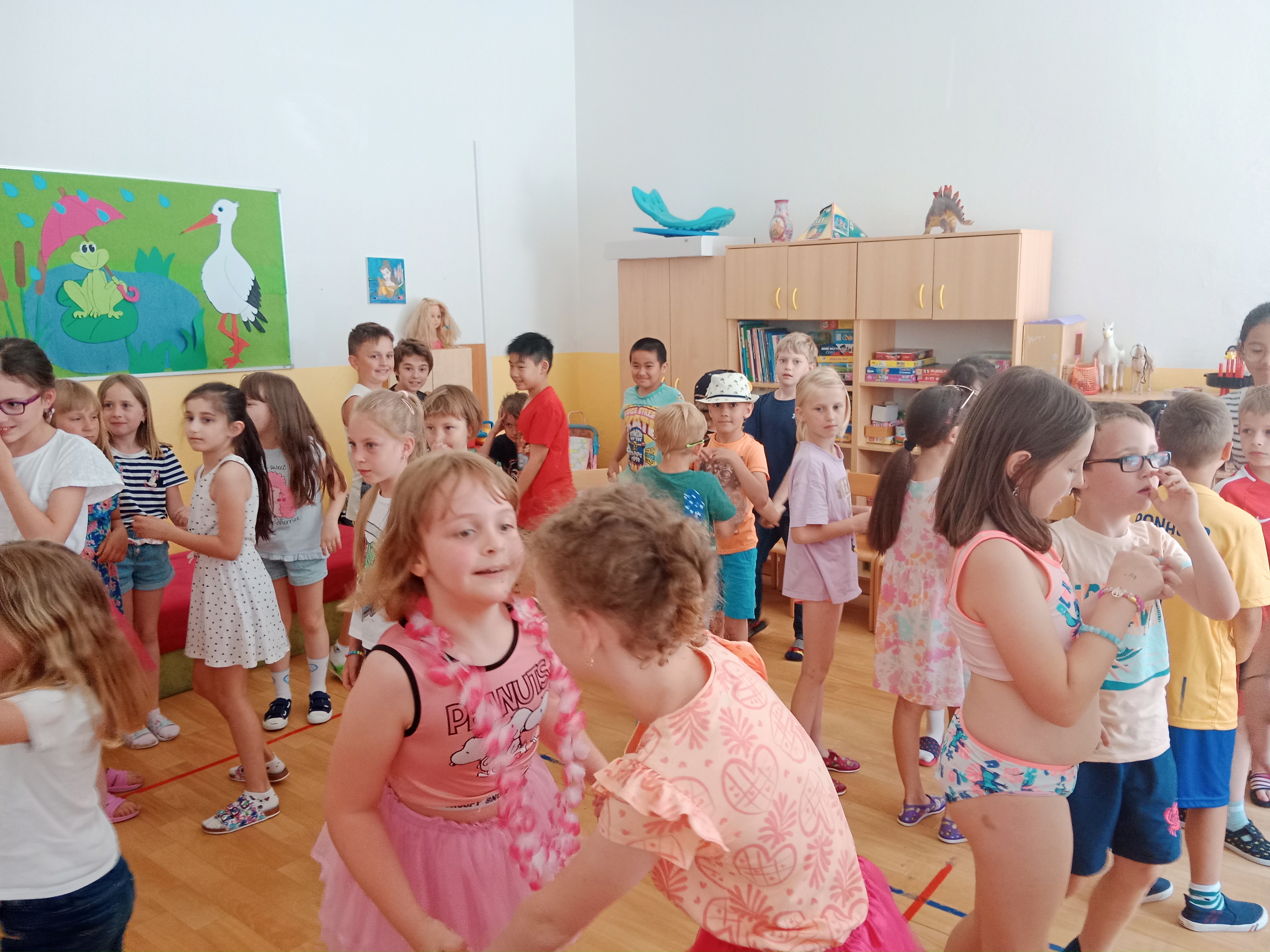 Děti se předvedly ve svých letních, prázdninových ,,outfitech." Tančili jsme a zpívali na známé hity a dětské písničky. Odpoledne jsme si zpestřili soutěží v tanci dvojic s míčkem a hrou Na sochy.