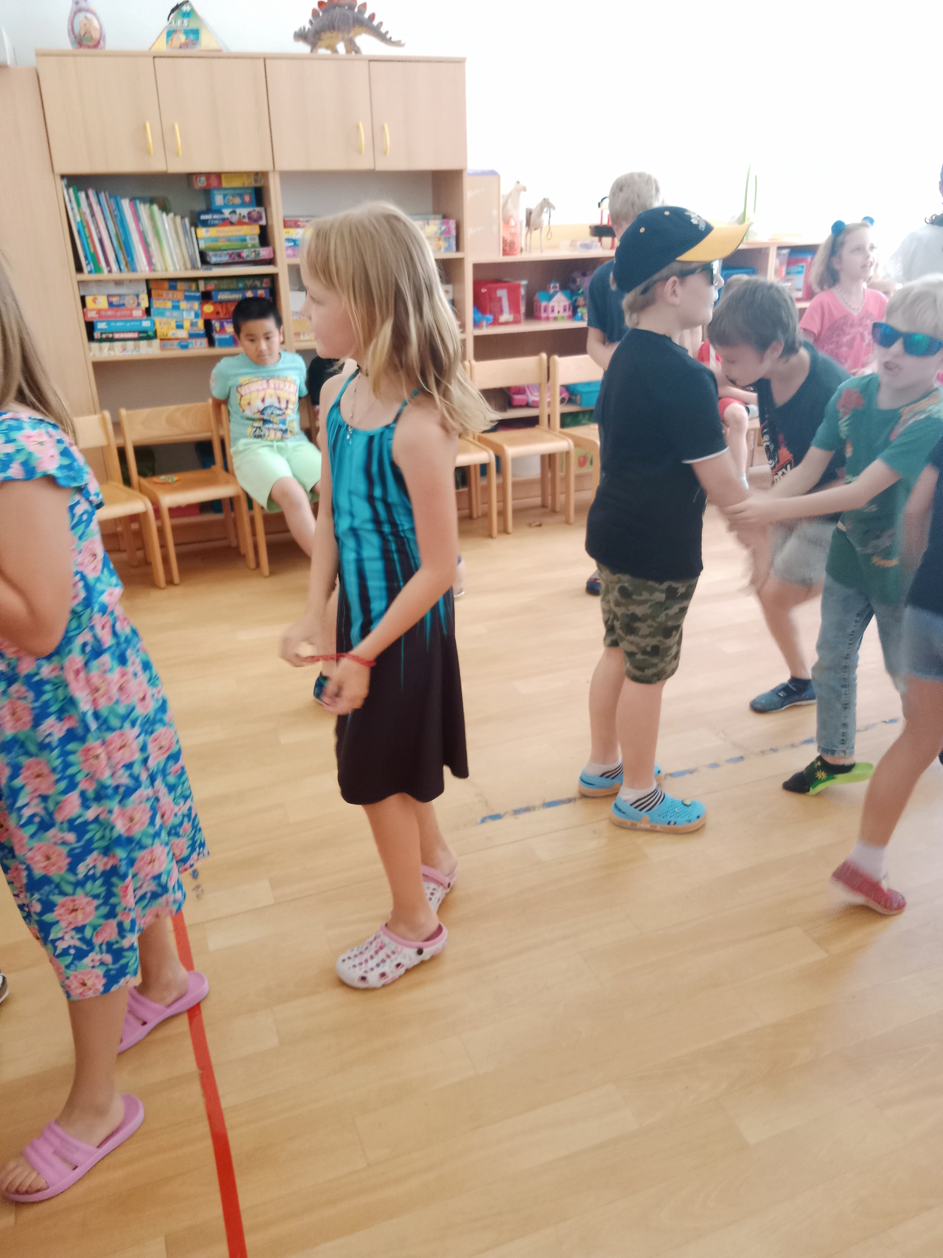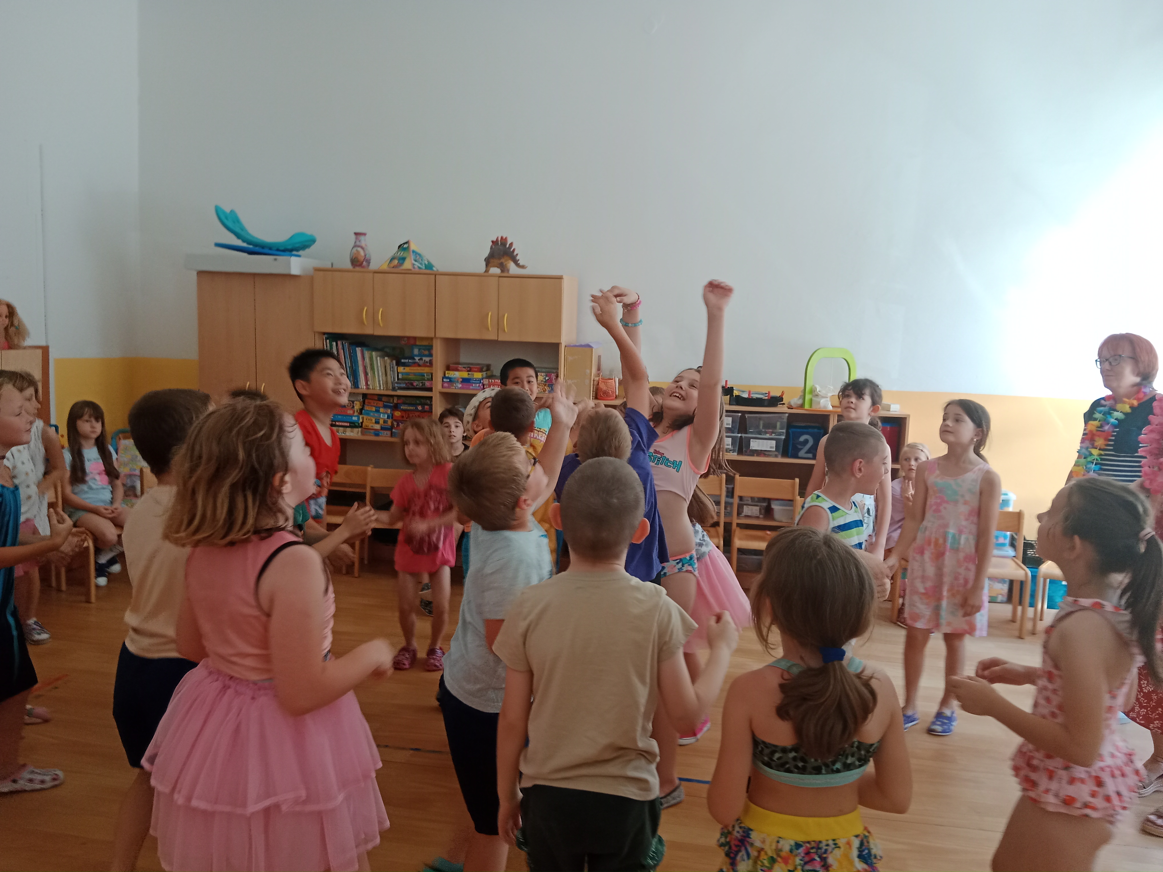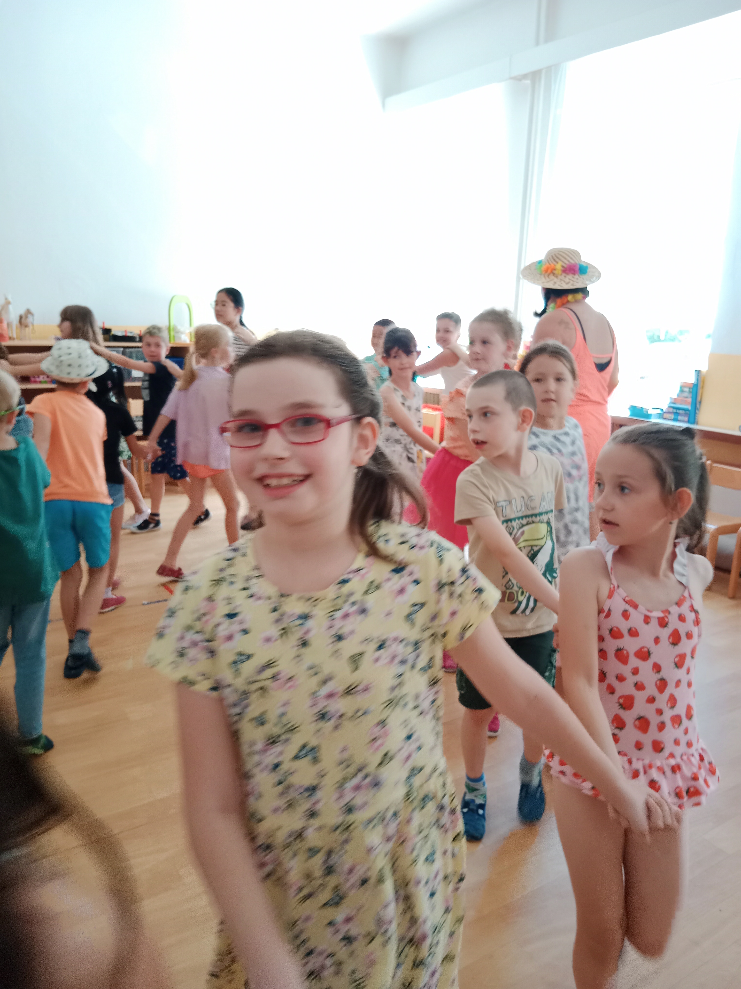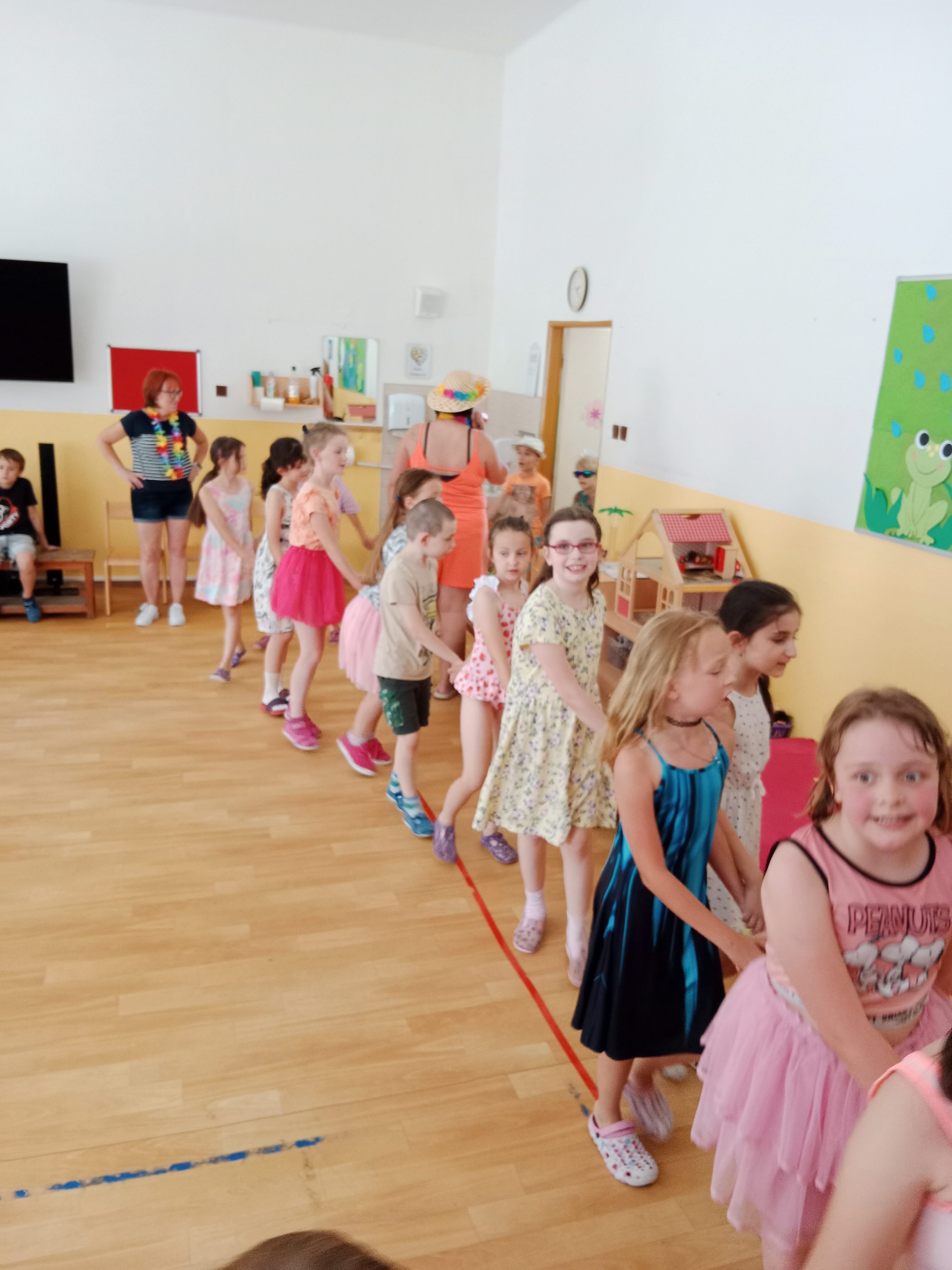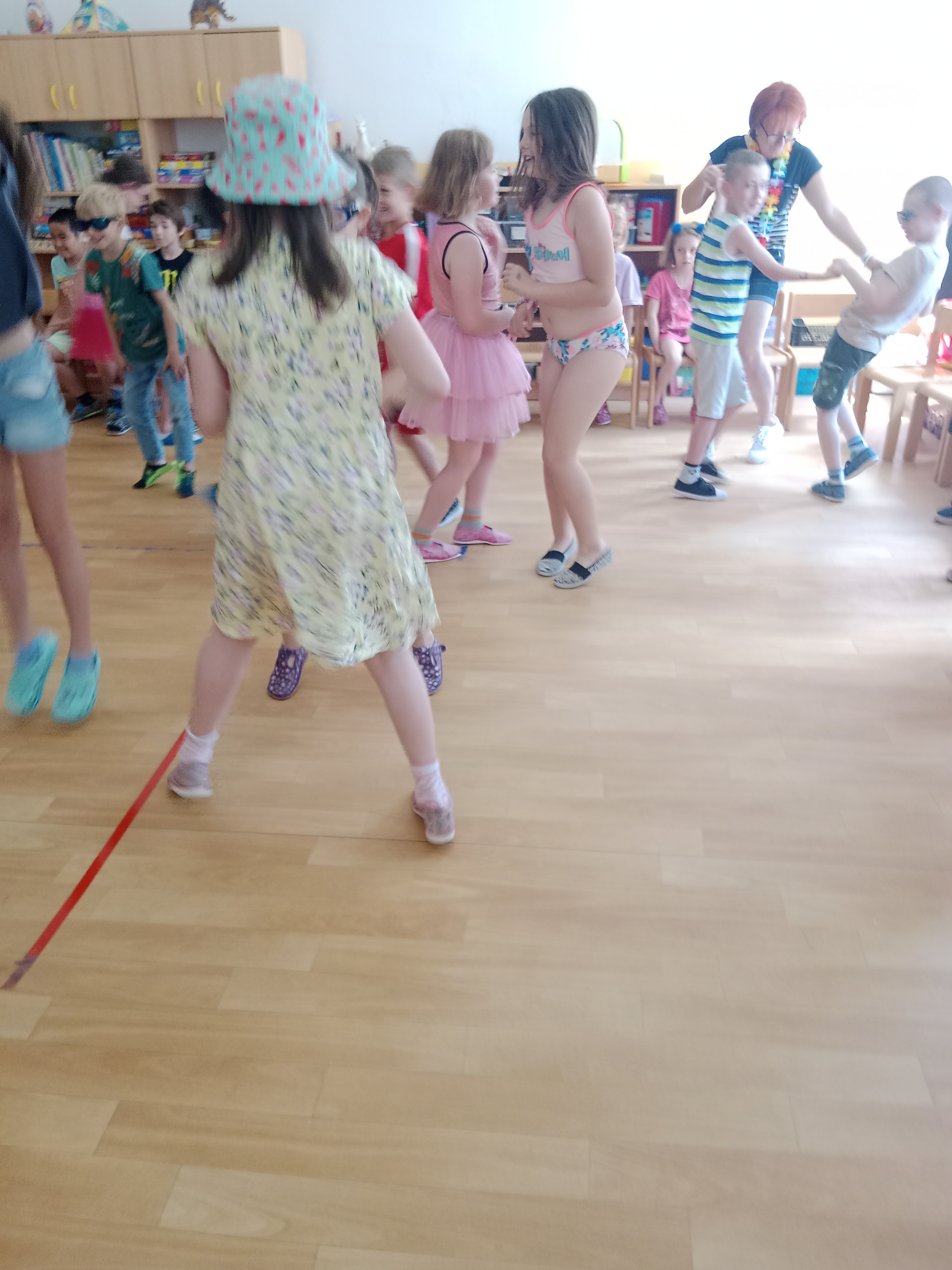 Děti se předvedly ve svých letních, prázdninových ,,outfitech." Tančili jsme a zpívali na známé hity a dětské písničky. Odpoledne jsme si zpestřili soutěží v tanci dvojic s míčkem a hrou Na sochy.