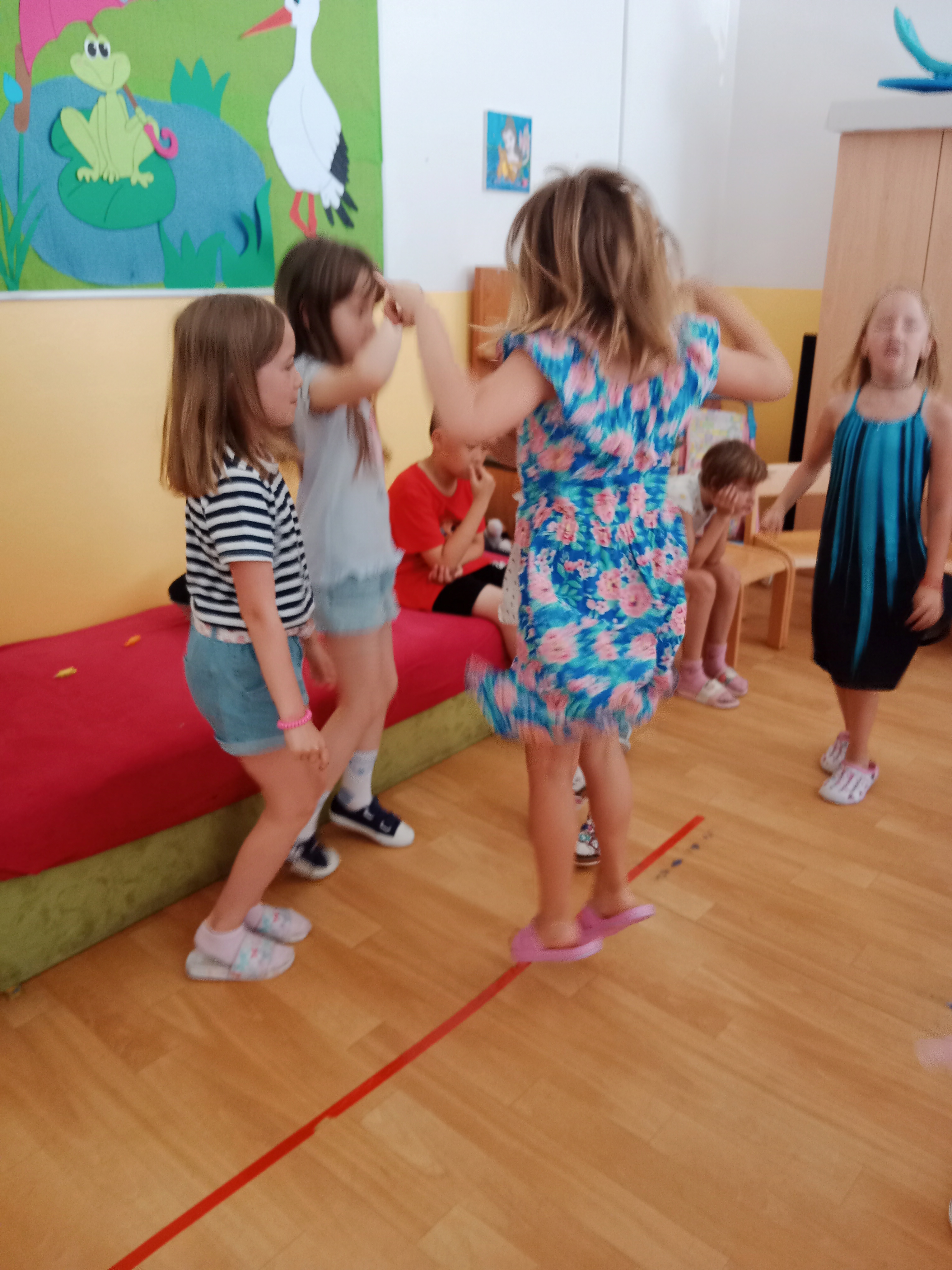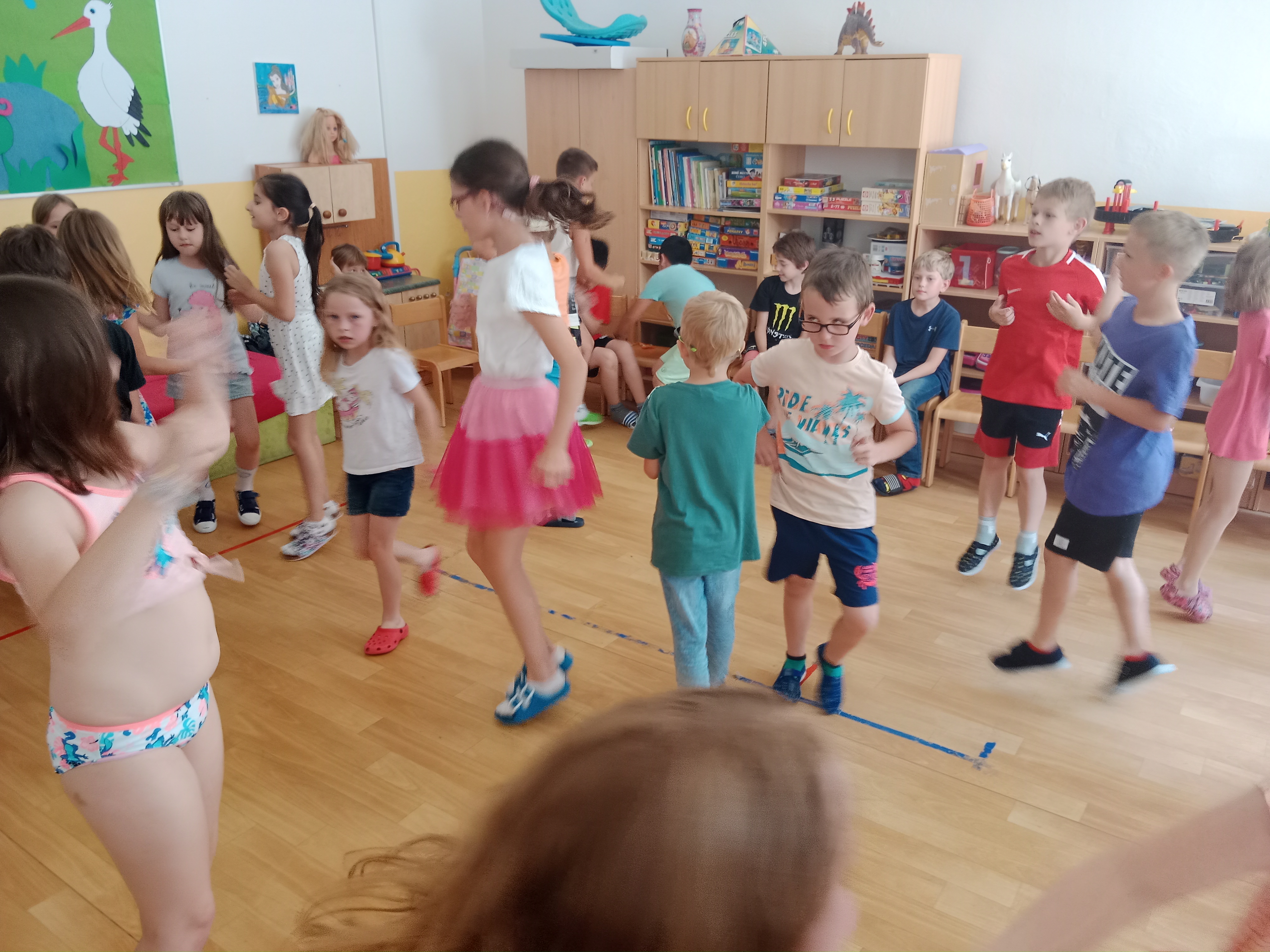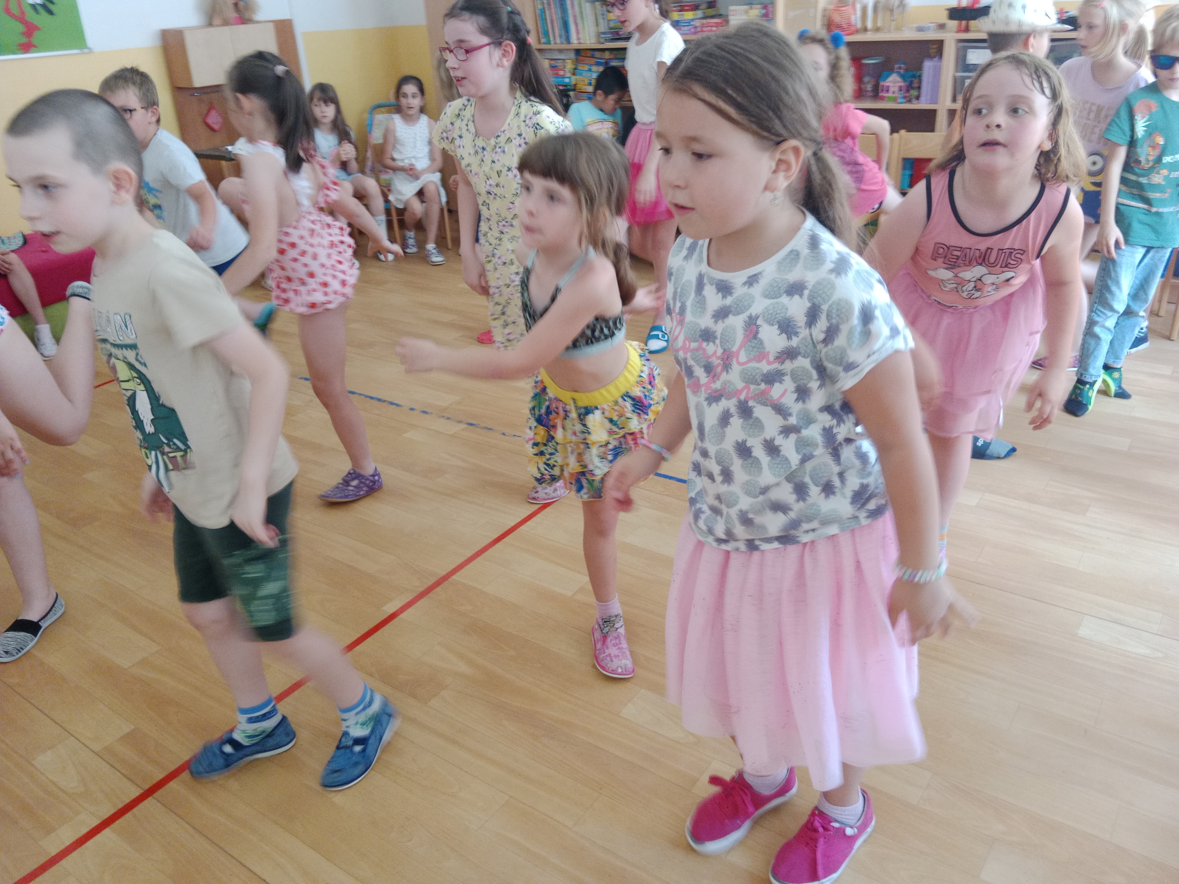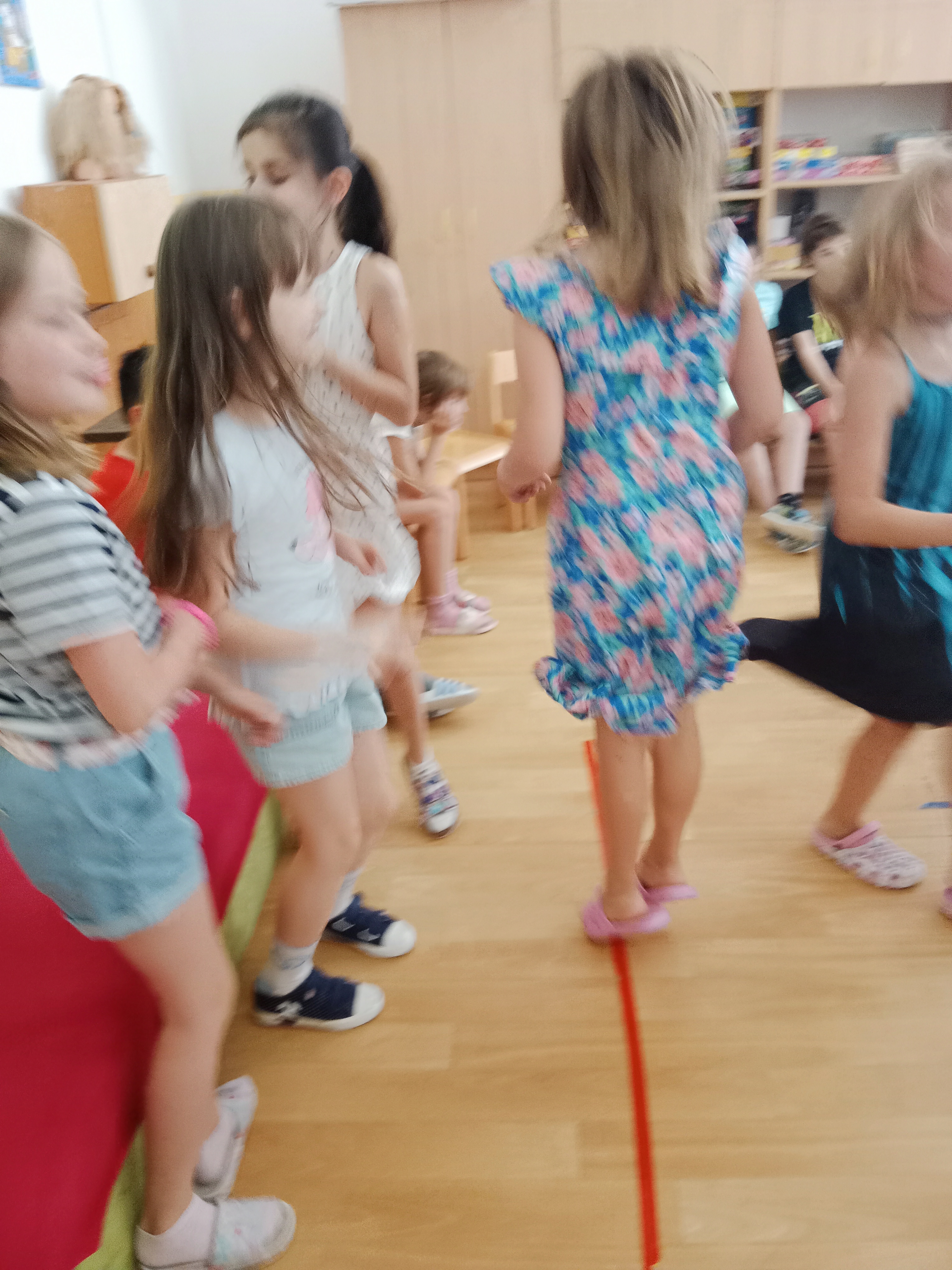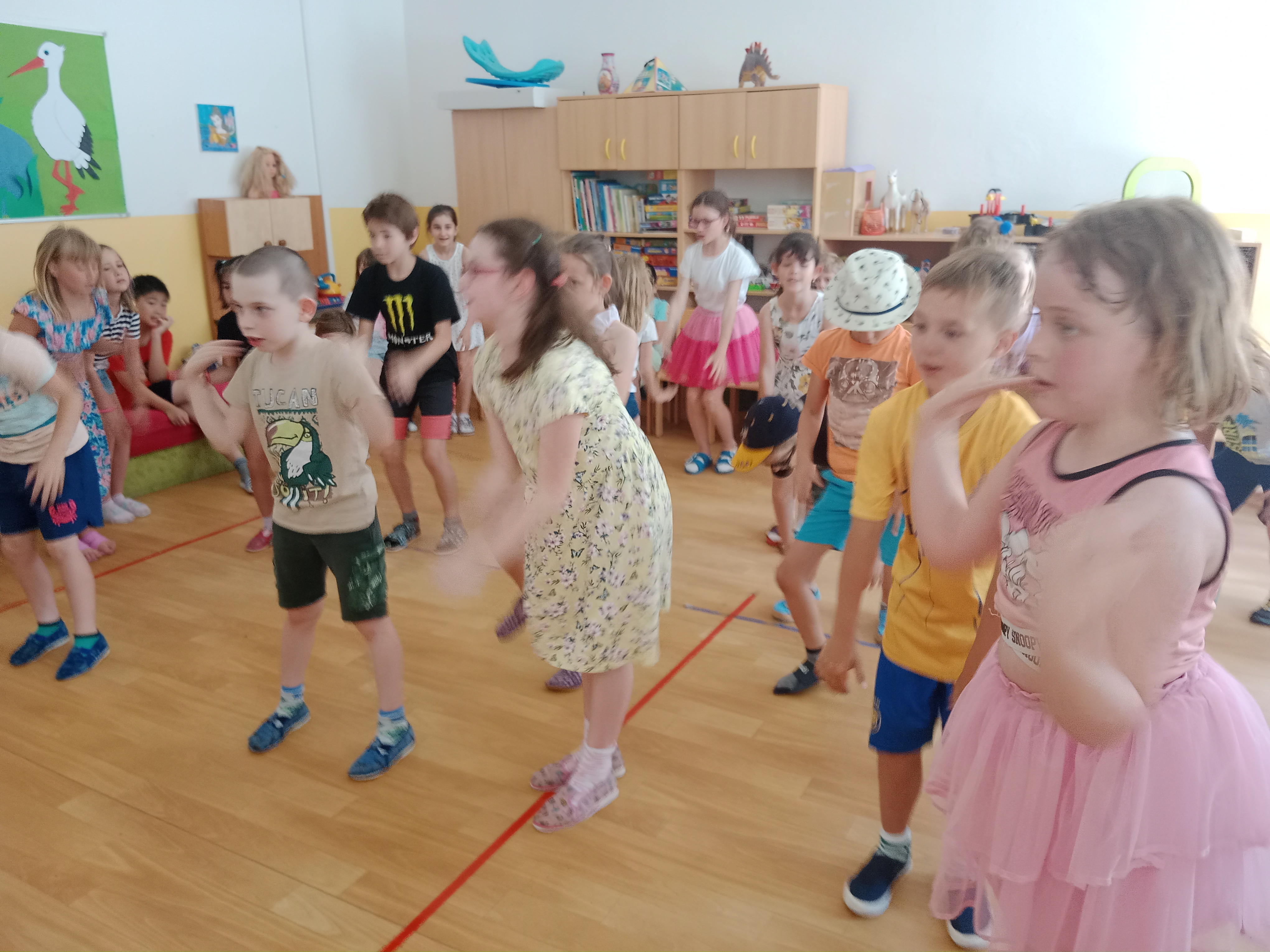 Děti se předvedly ve svých letních, prázdninových ,,outfitech." Tančili jsme a zpívali na známé hity a dětské písničky. Odpoledne jsme si zpestřili soutěží v tanci dvojic s míčkem a hrou Na sochy.