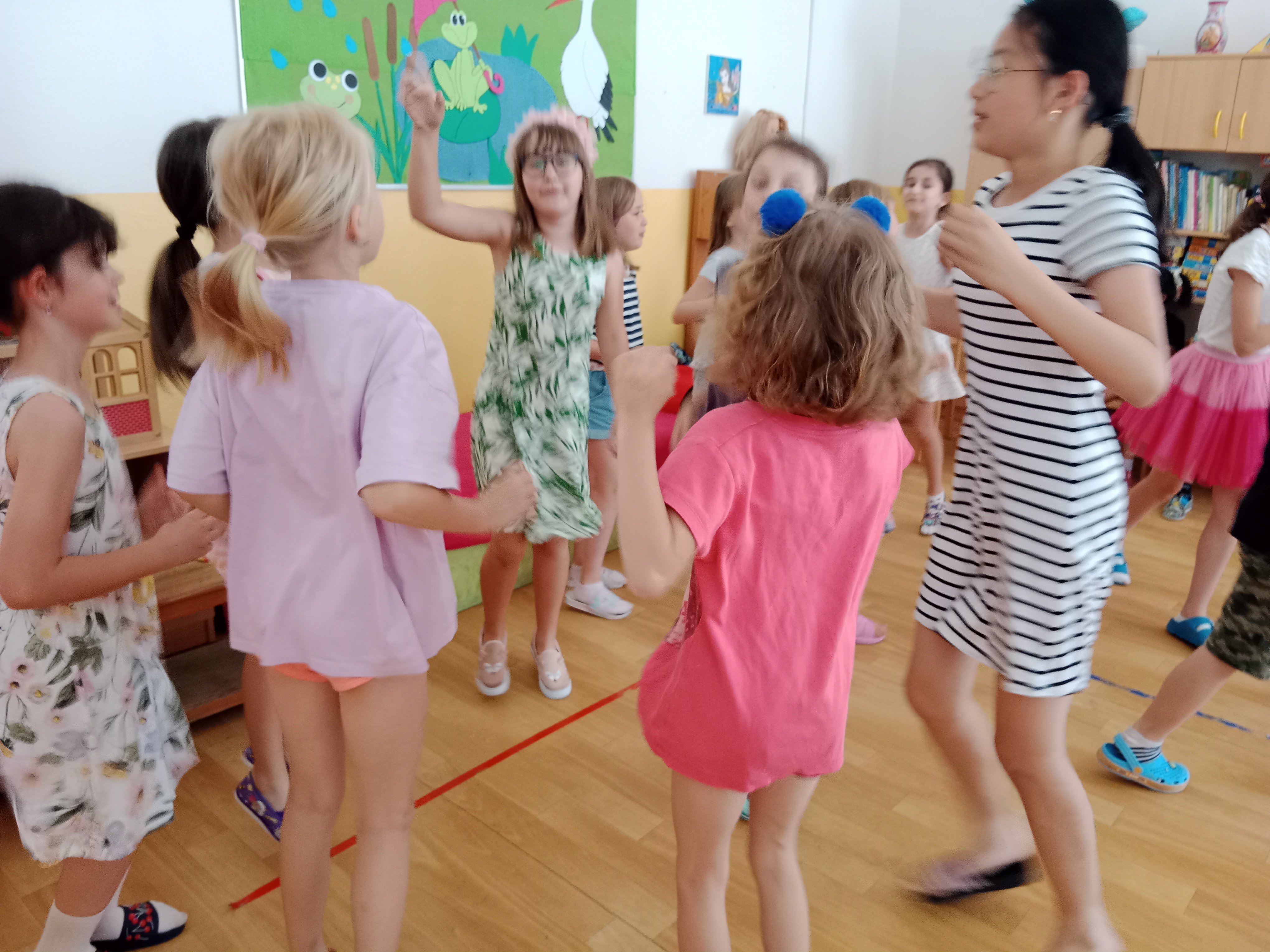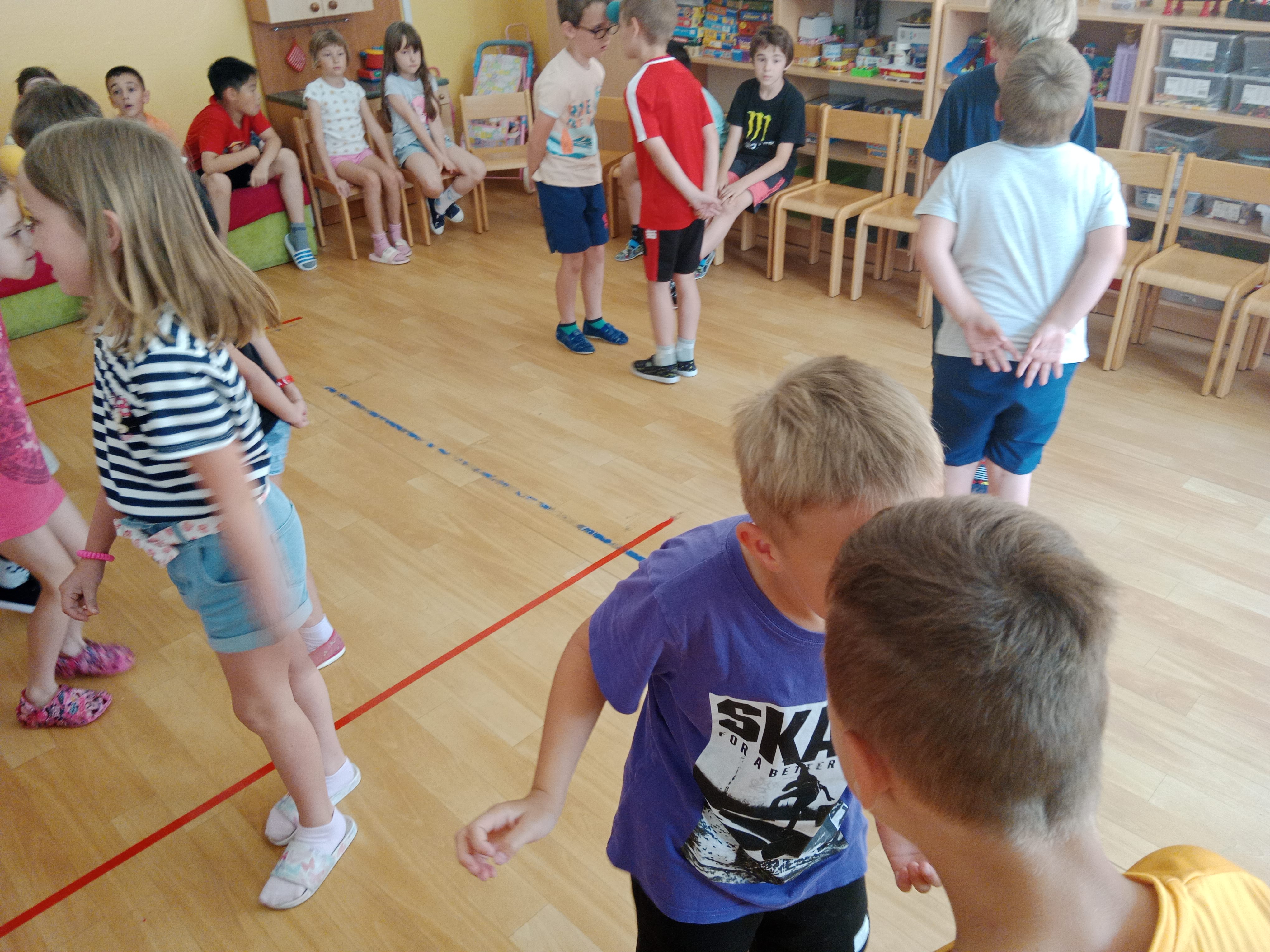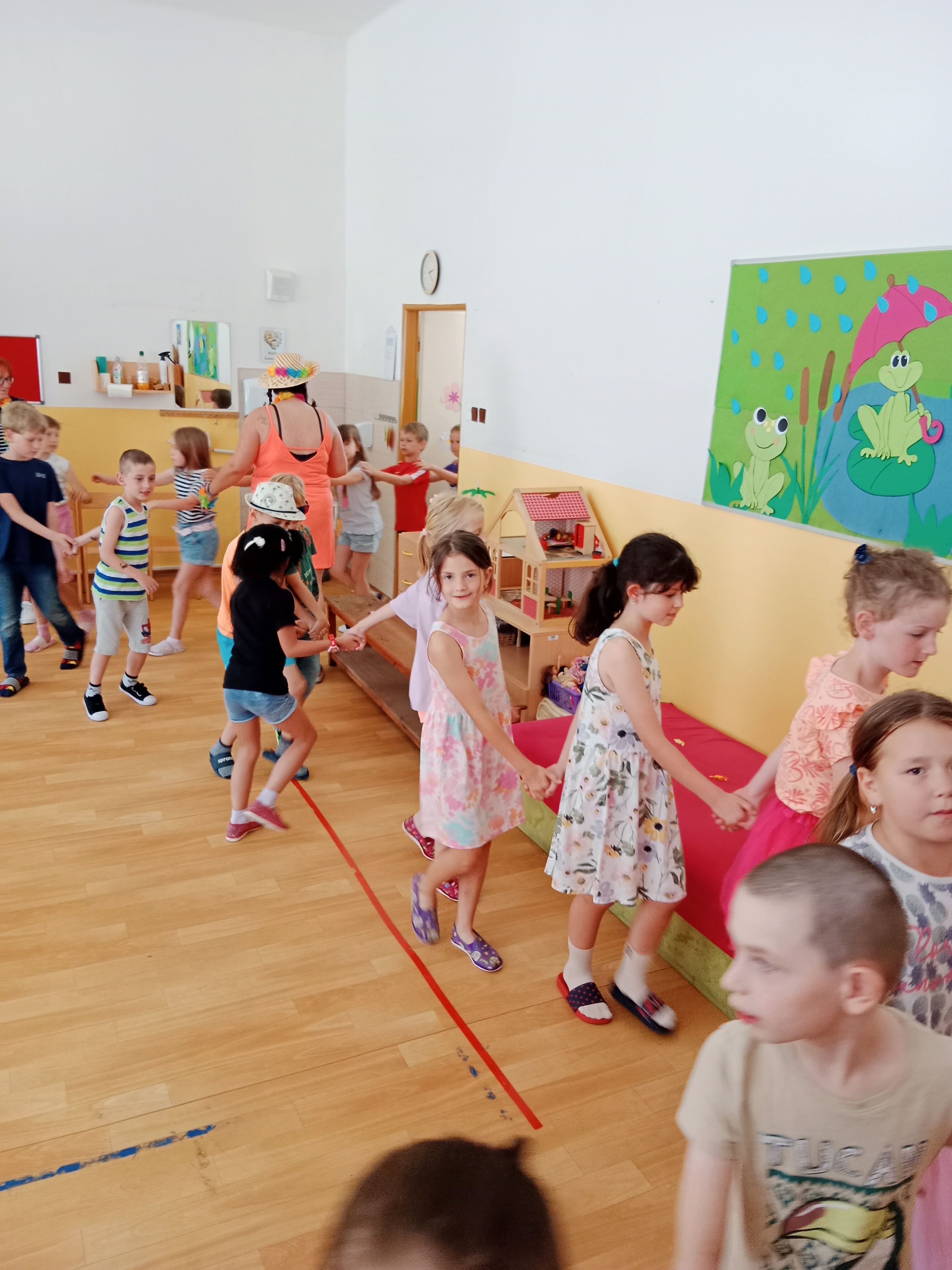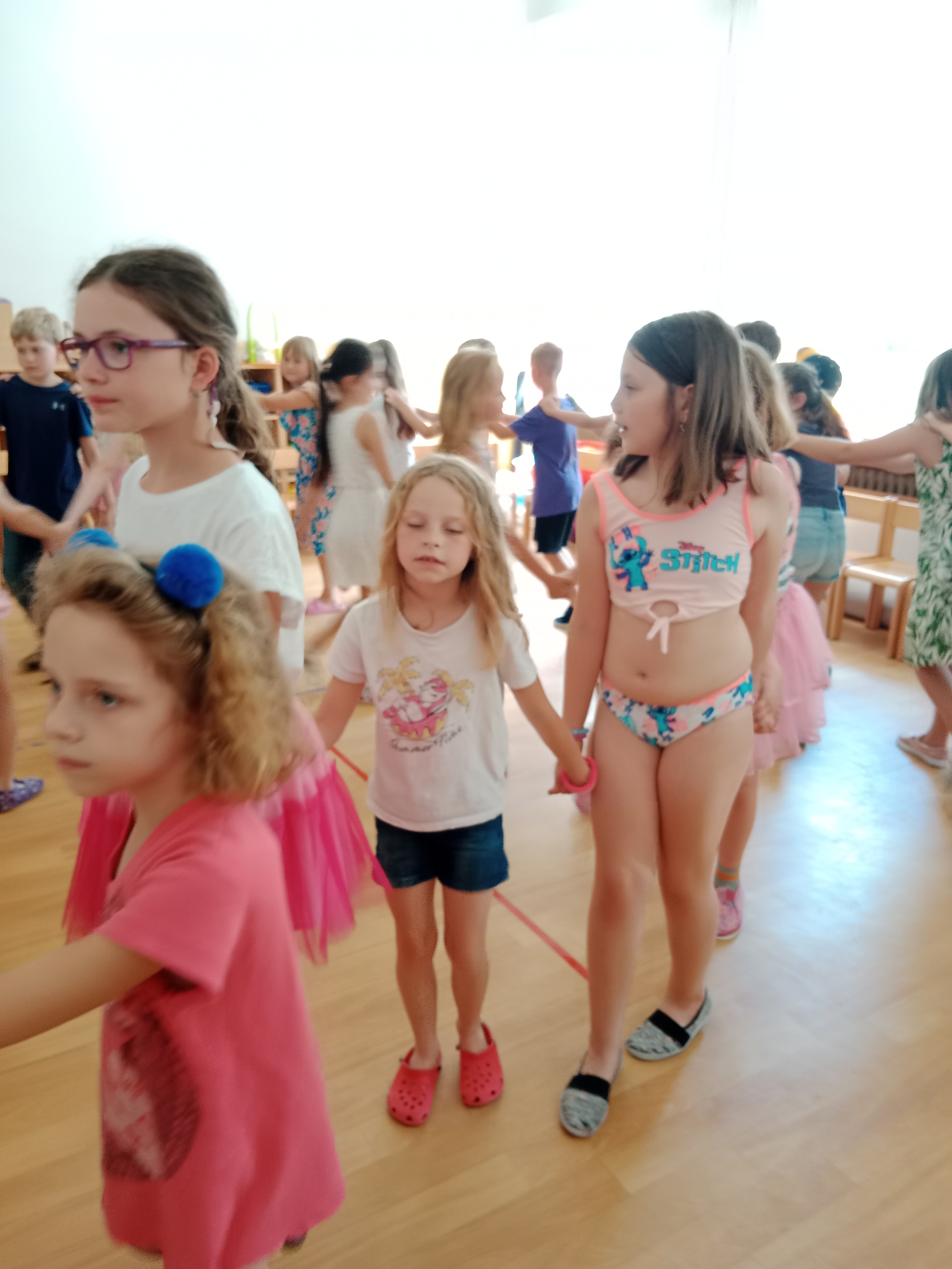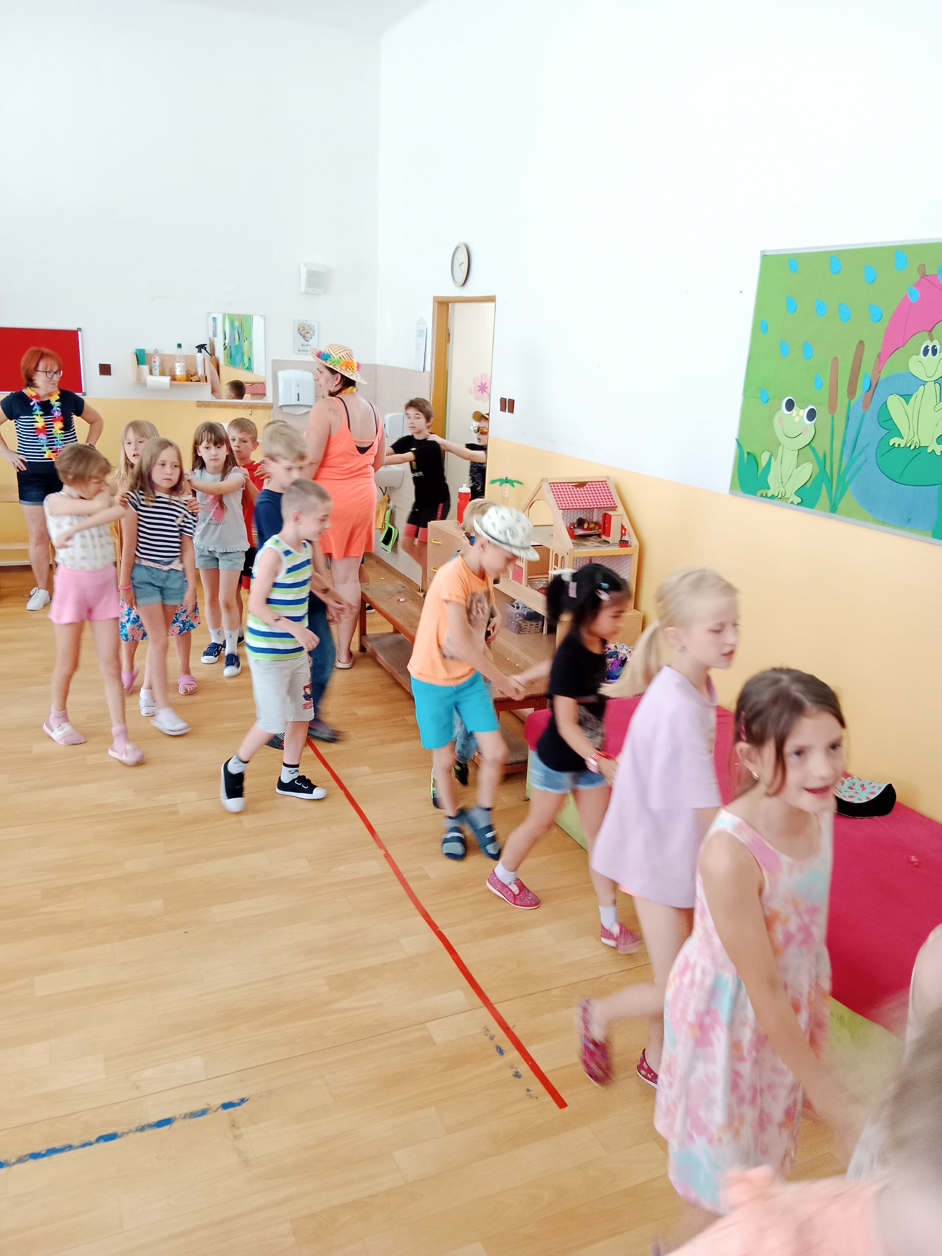 Děti se předvedly ve svých letních, prázdninových ,,outfitech." Tančili jsme a zpívali na známé hity a dětské písničky. Odpoledne jsme si zpestřili soutěží v tanci dvojic s míčkem a hrou Na sochy.