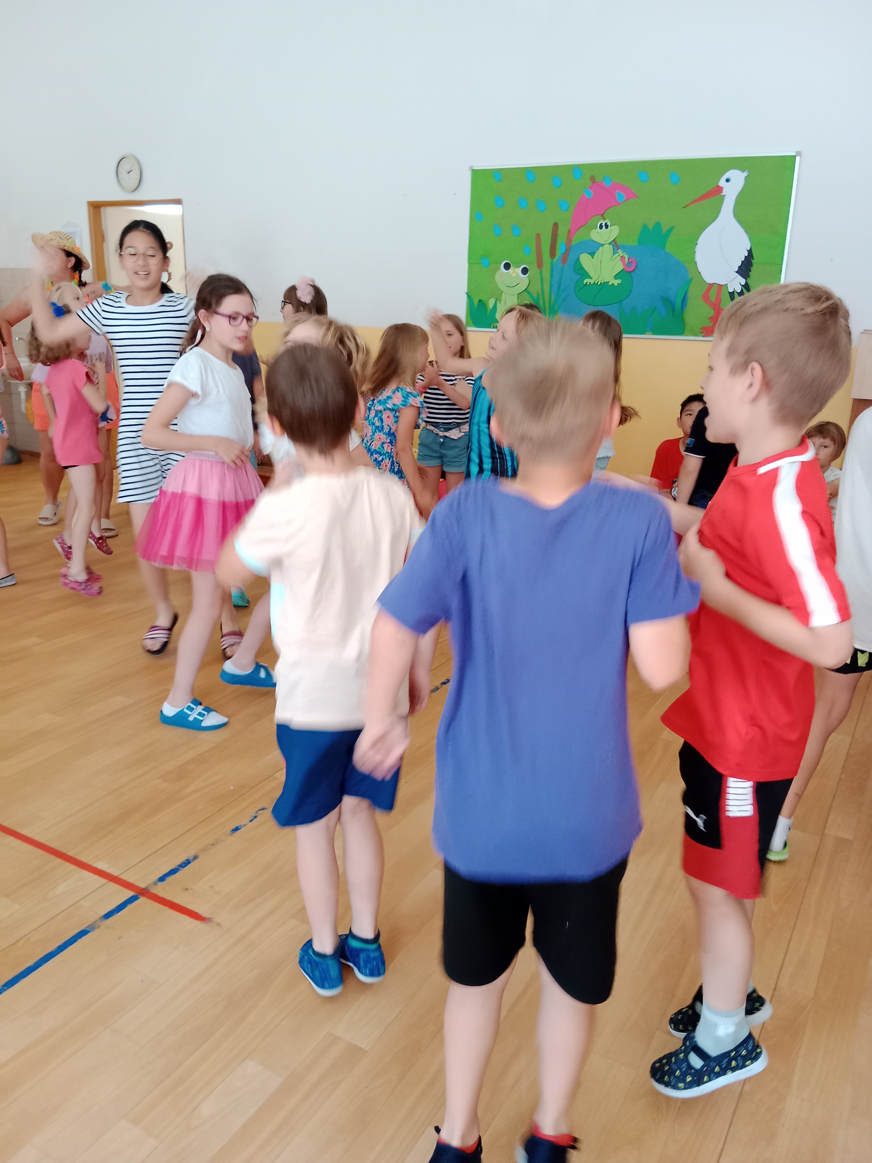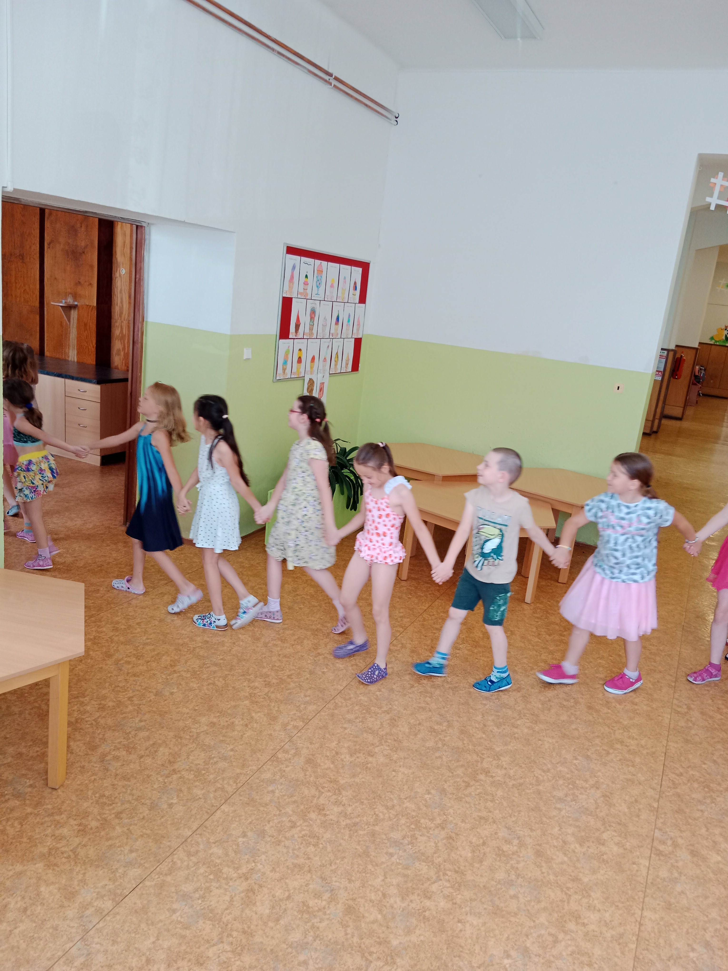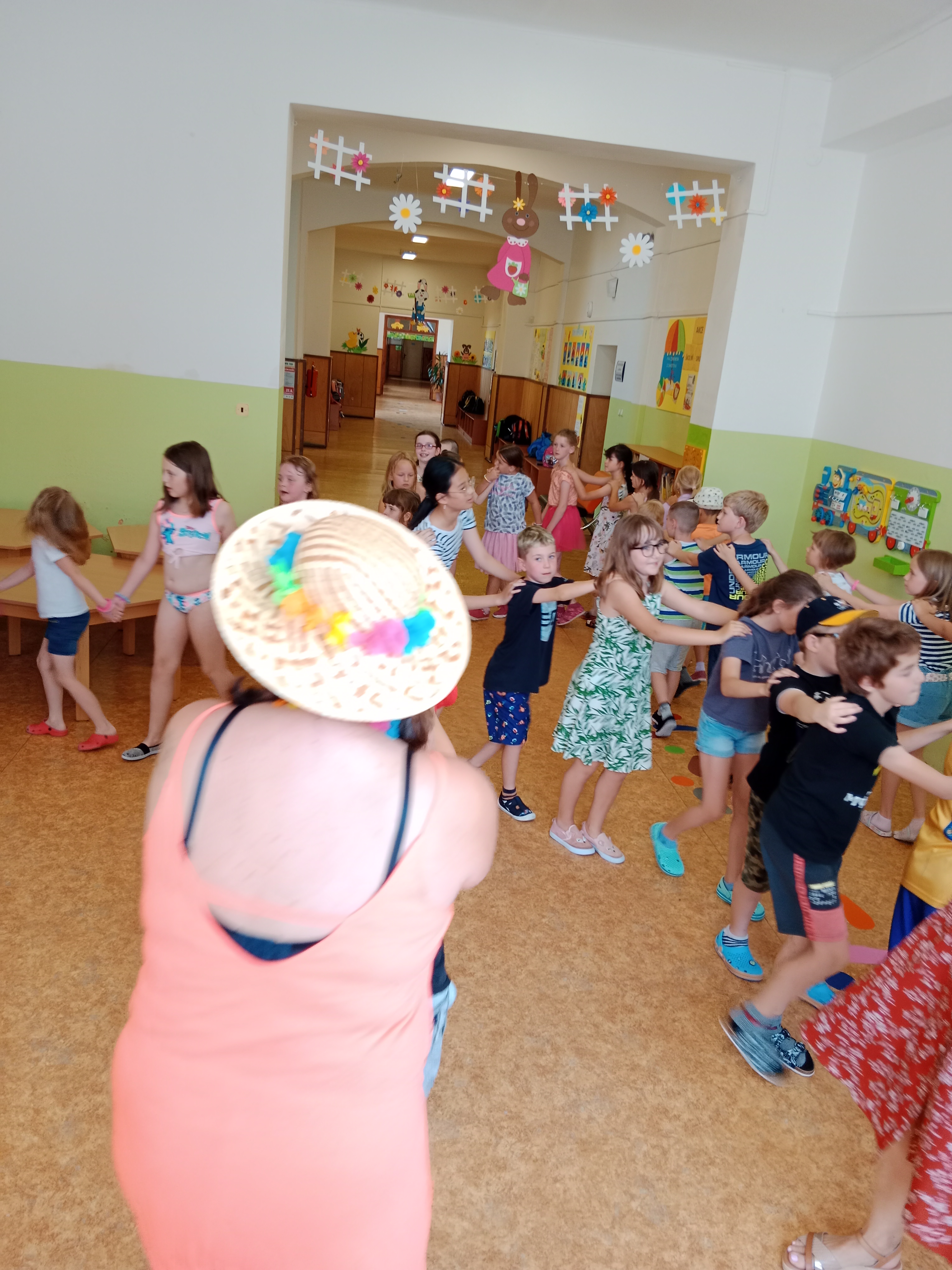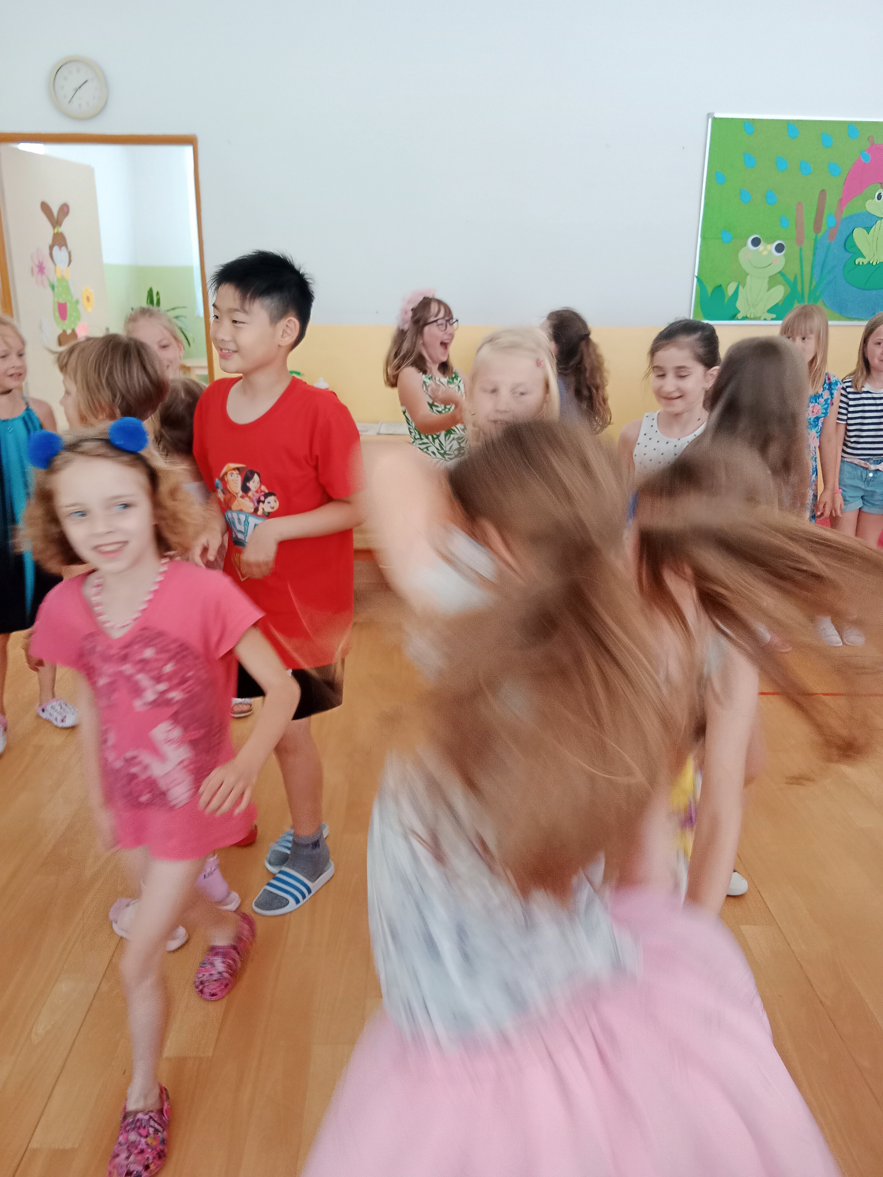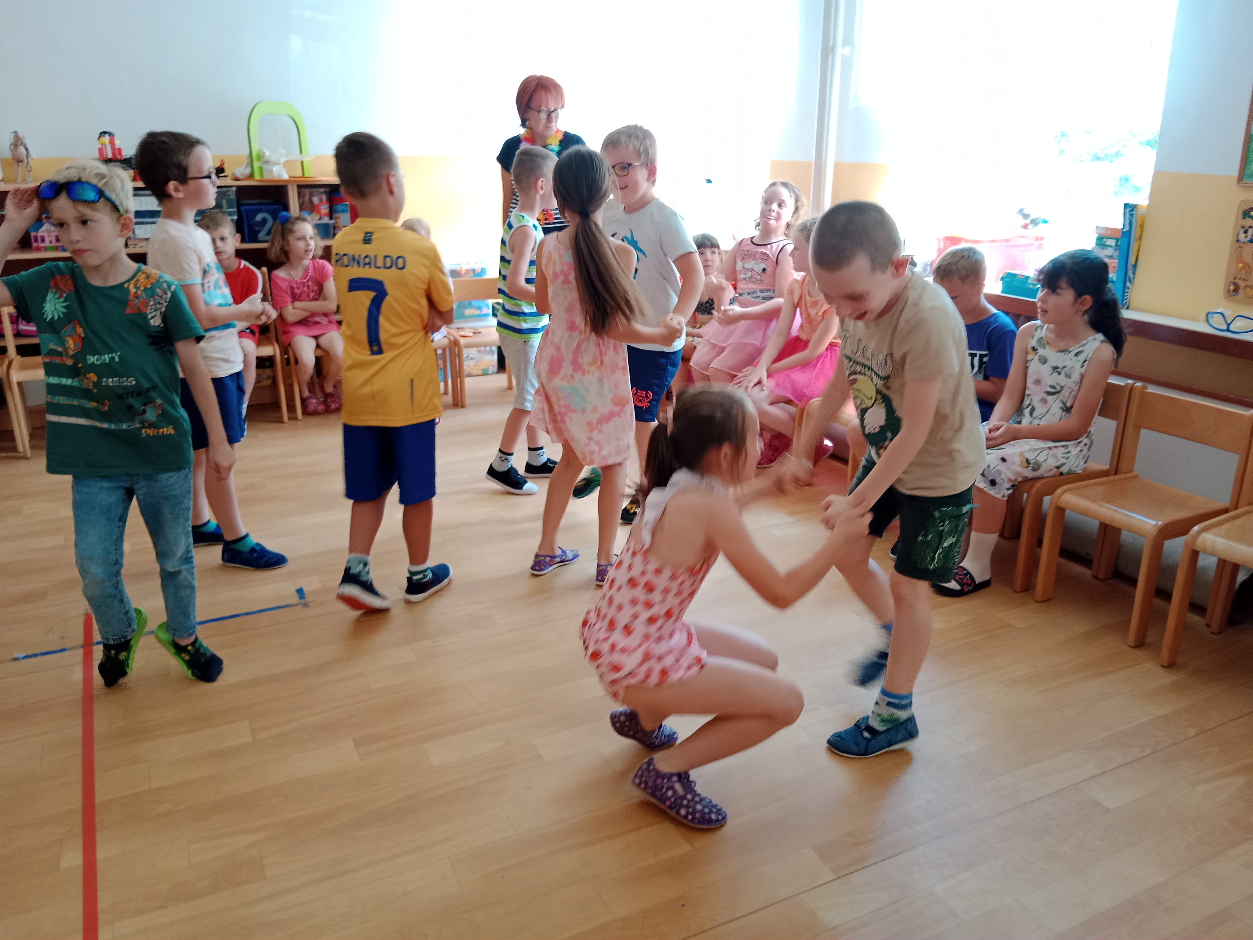 Děti se předvedly ve svých letních, prázdninových ,,outfitech." Tančili jsme a zpívali na známé hity a dětské písničky. Odpoledne jsme si zpestřili soutěží v tanci dvojic s míčkem a hrou Na sochy.