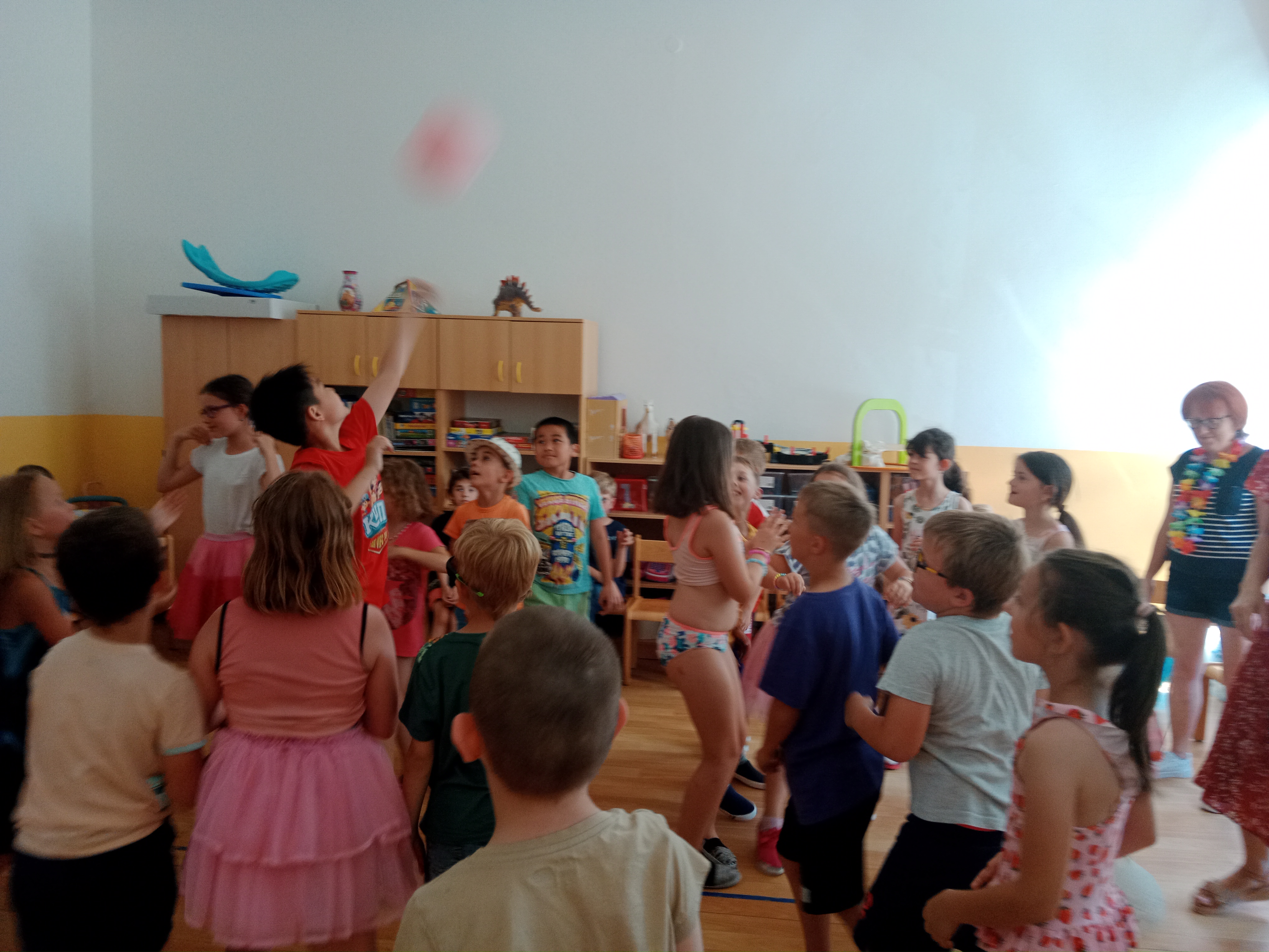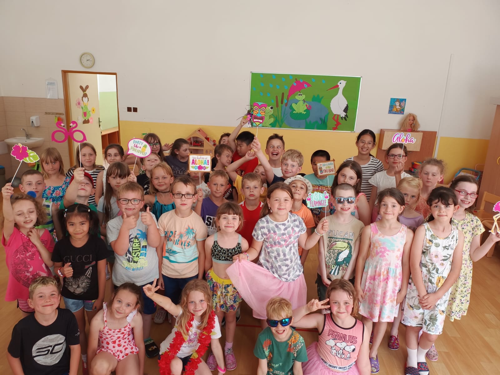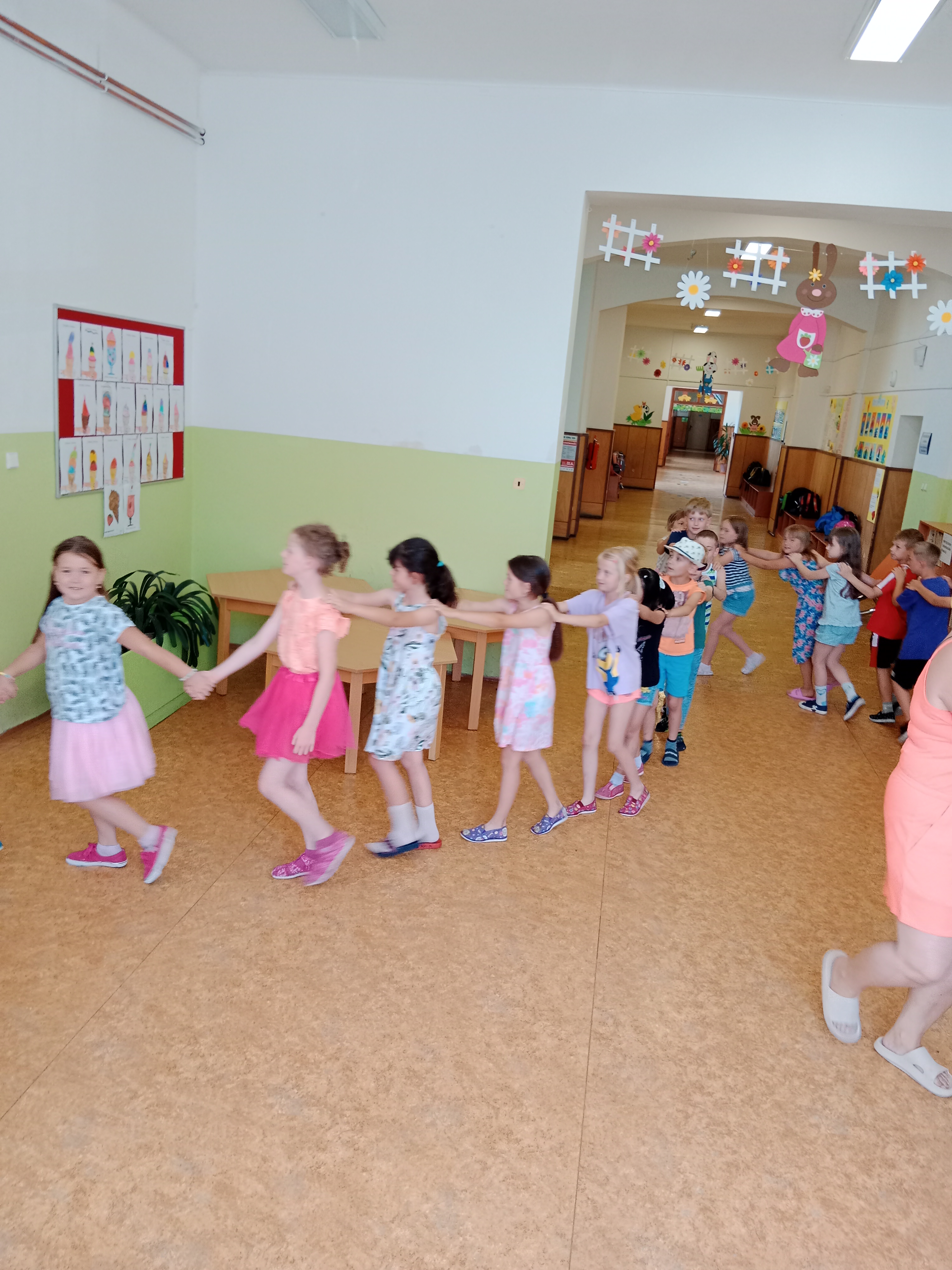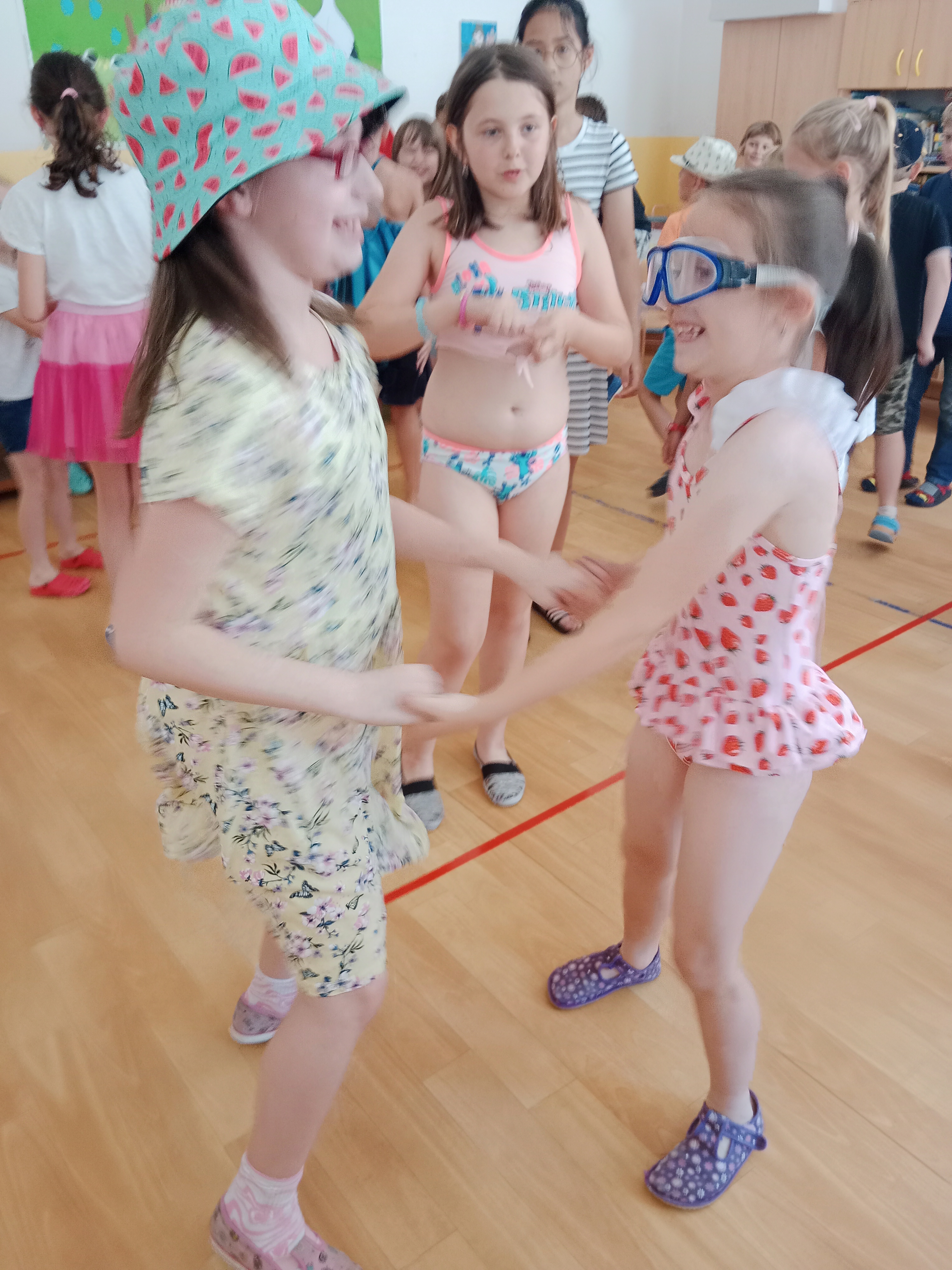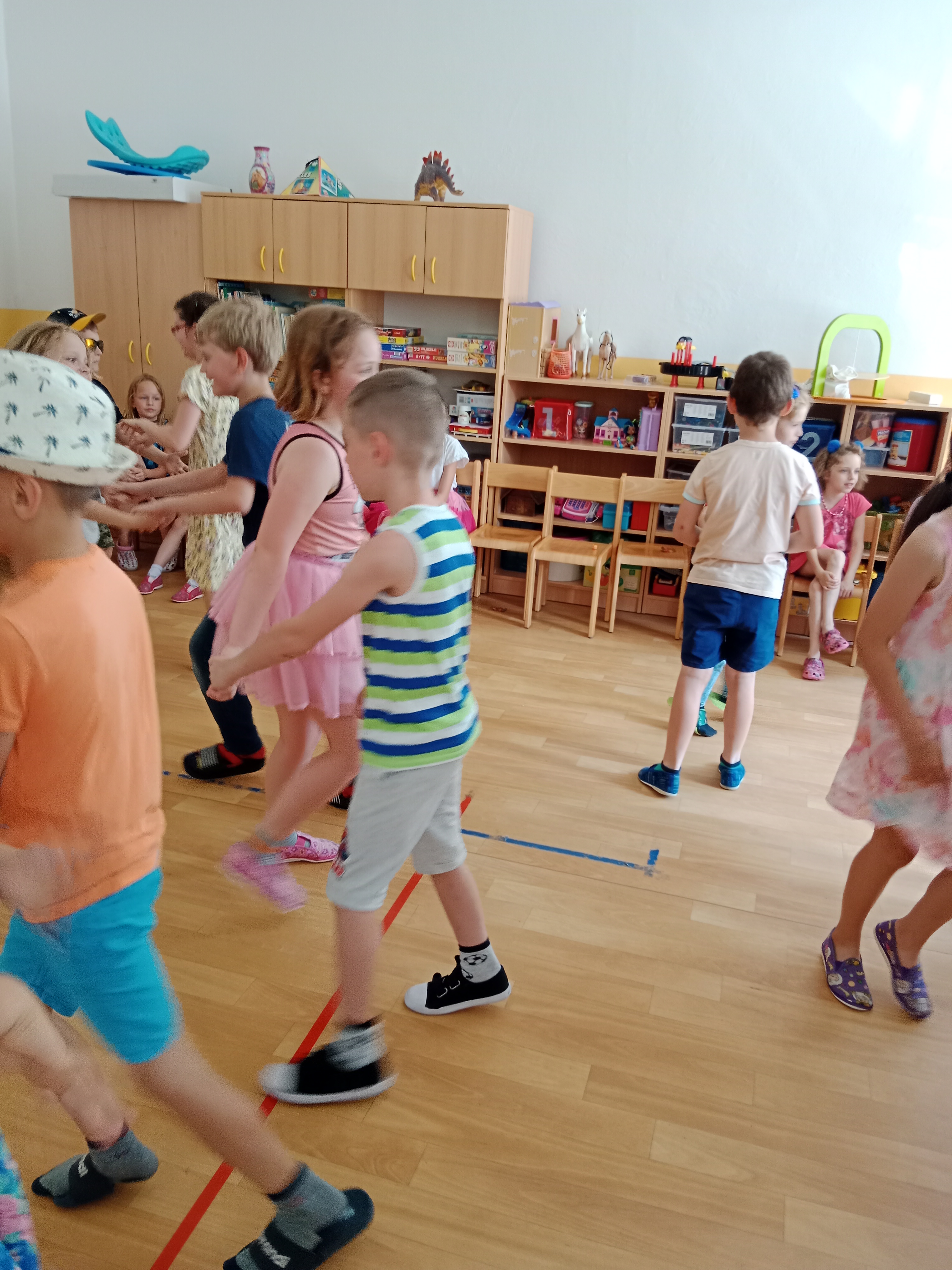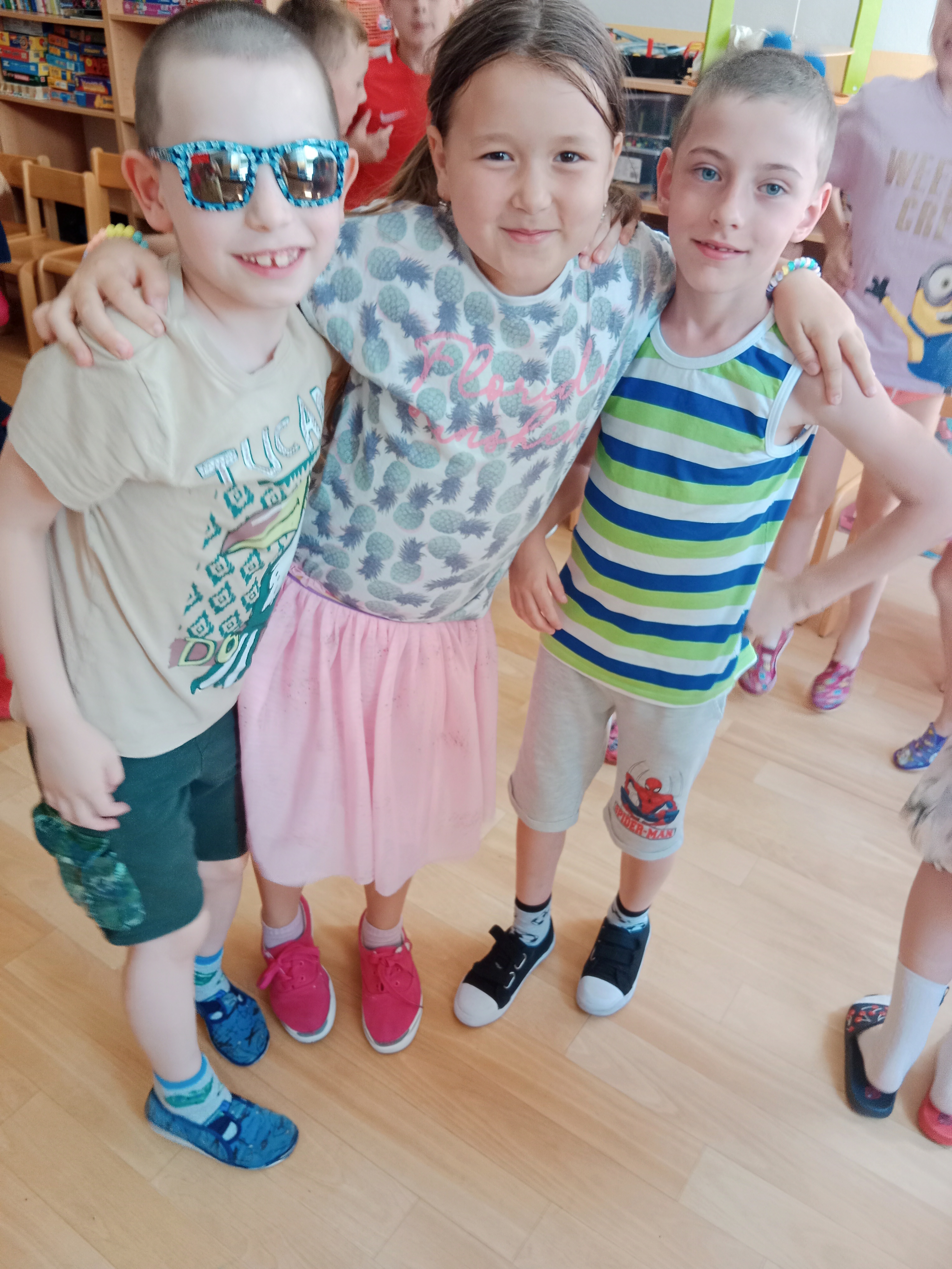 Děti se předvedly ve svých letních, prázdninových ,,outfitech." Tančili jsme a zpívali na známé hity a dětské písničky. Odpoledne jsme si zpestřili soutěží v tanci dvojic s míčkem a hrou Na sochy.