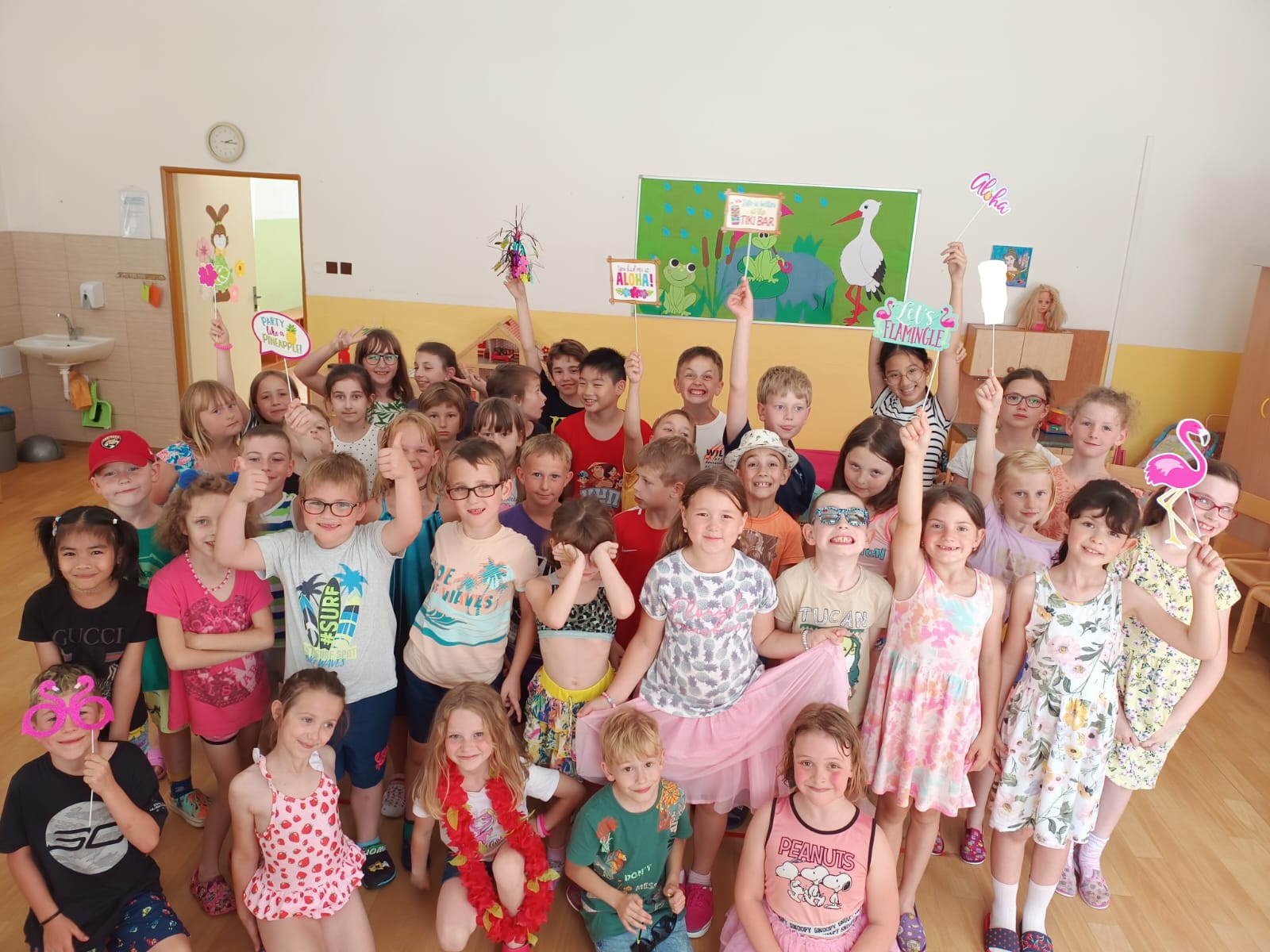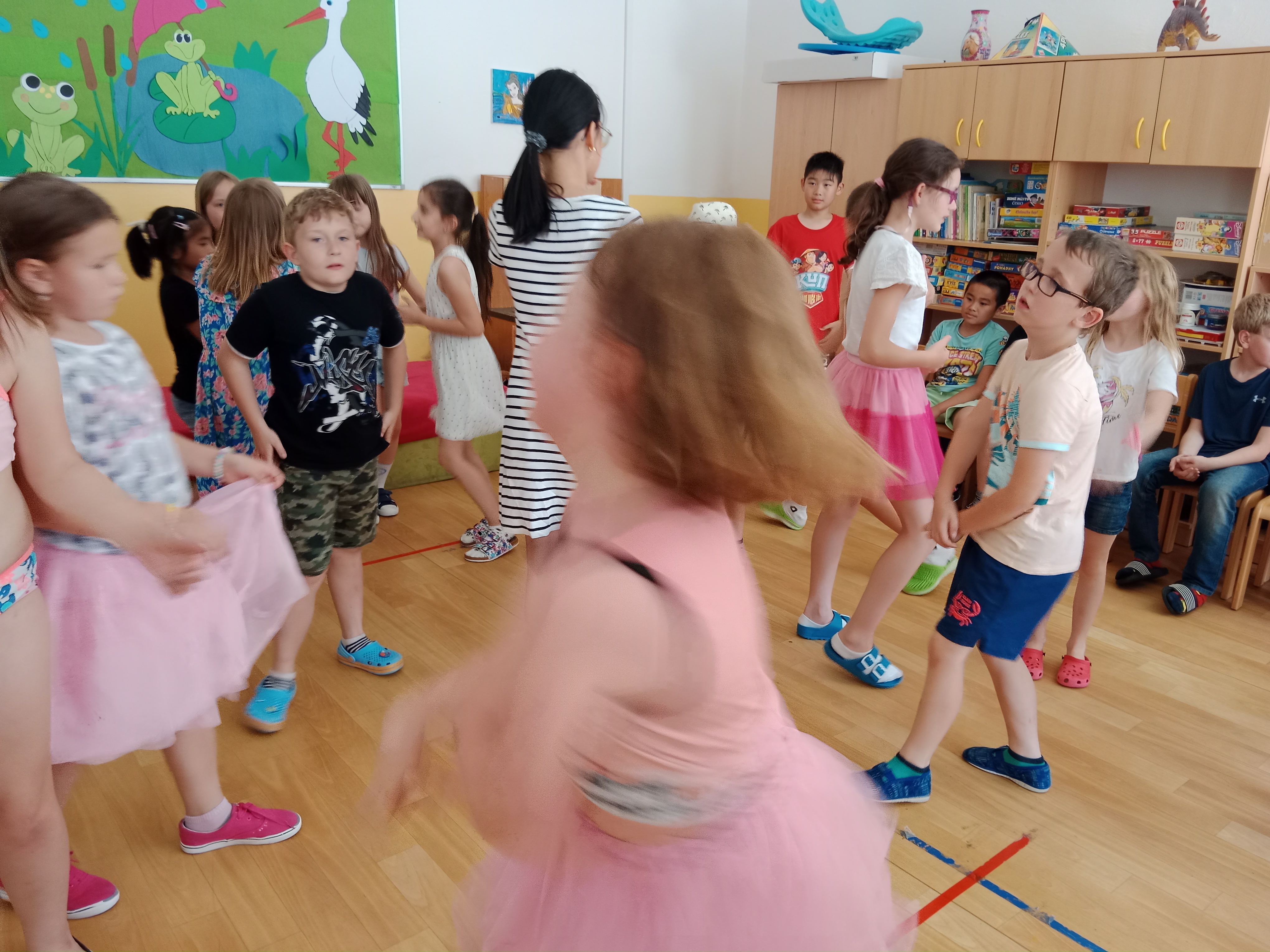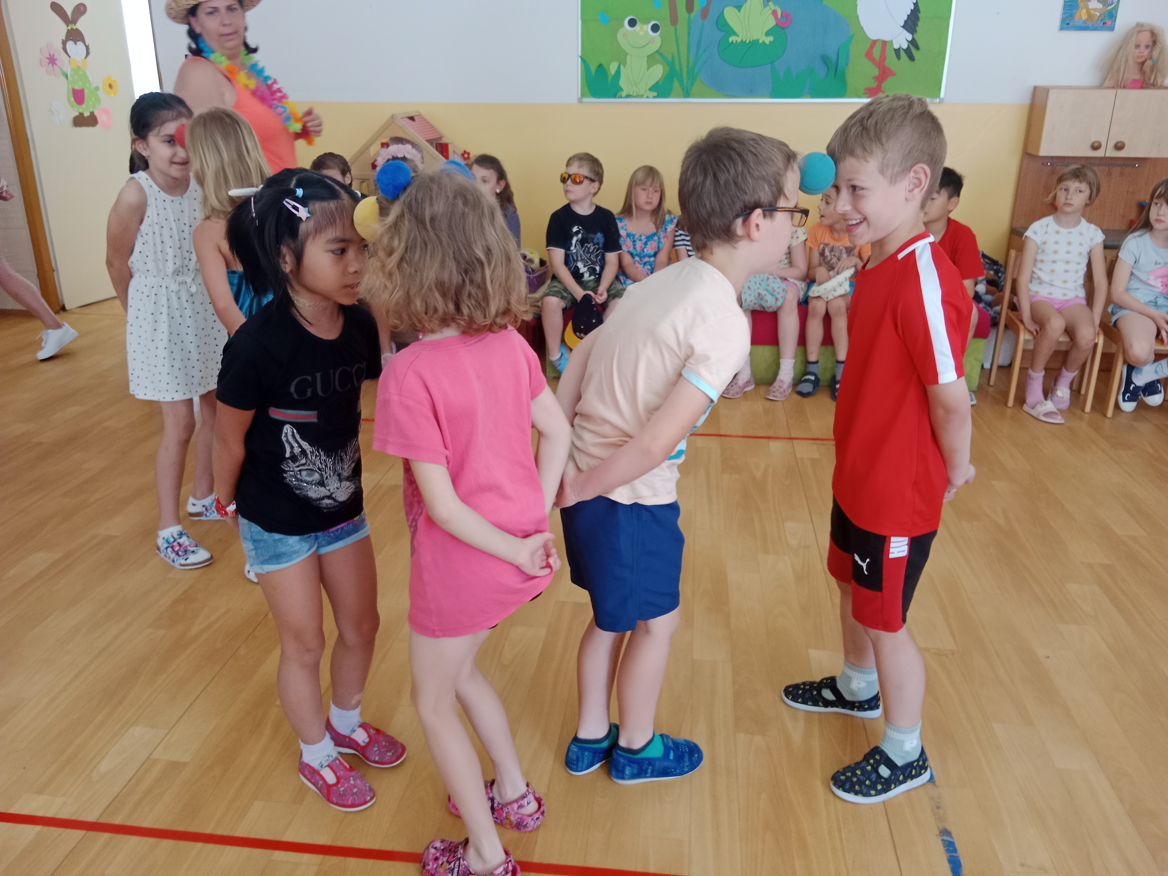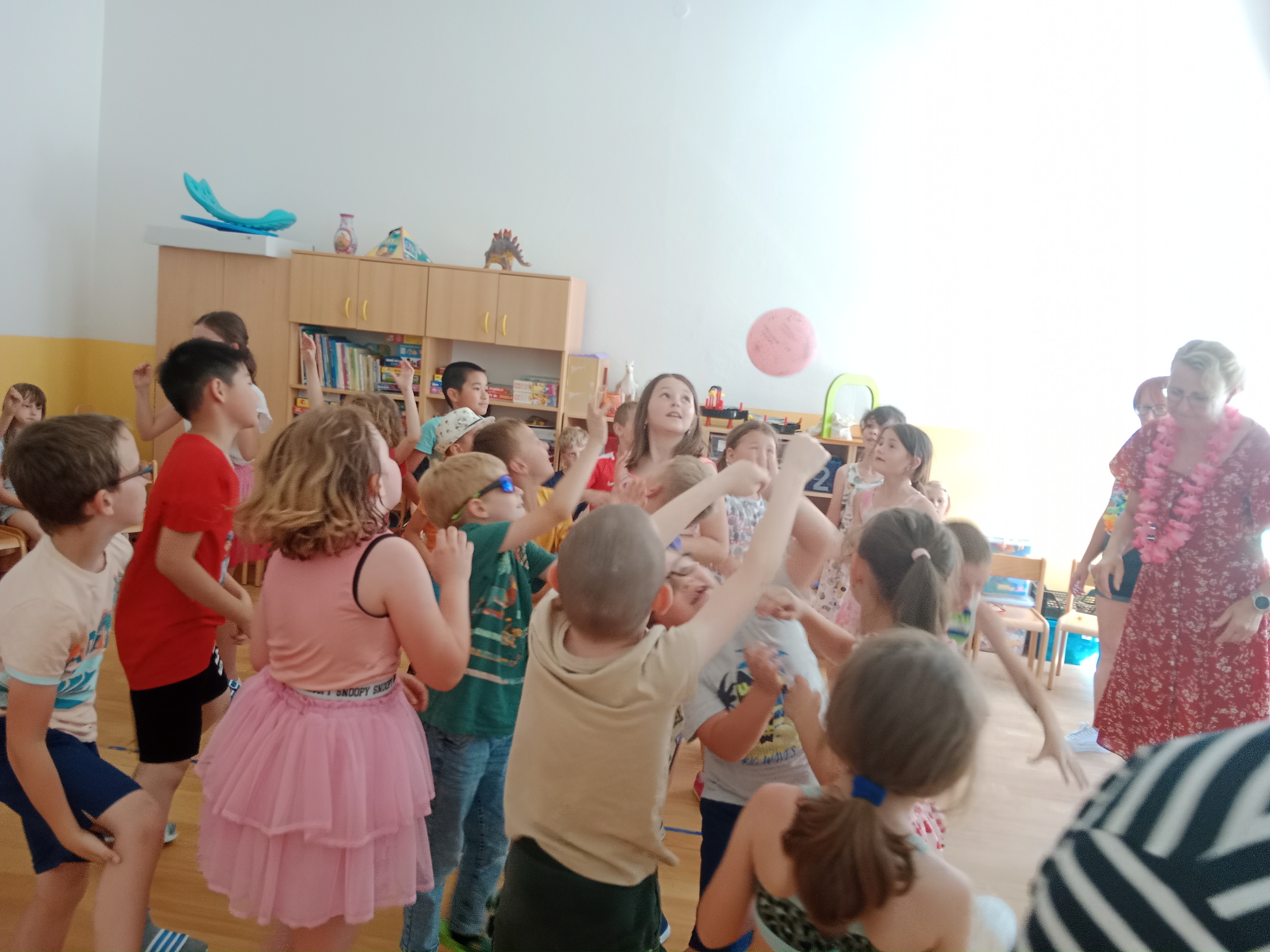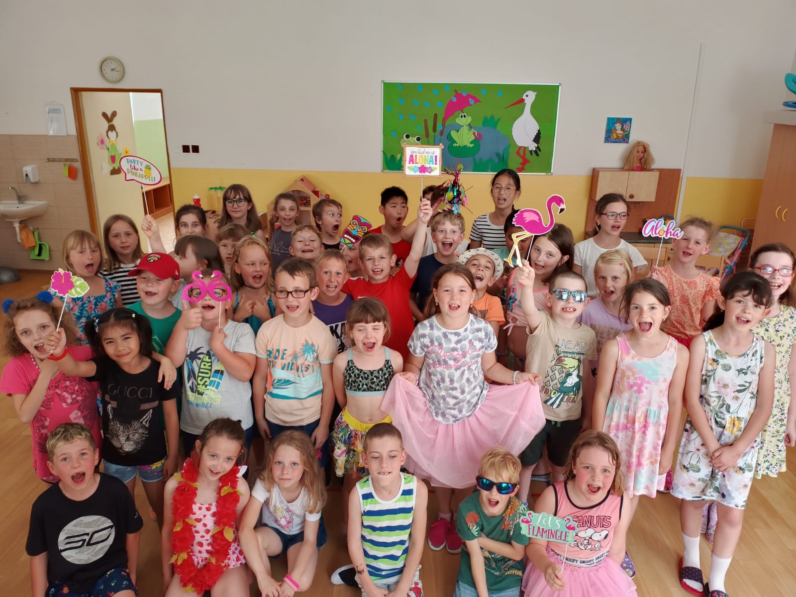 Děti se předvedly ve svých letních, prázdninových ,,outfitech." Tančili jsme a zpívali na známé hity a dětské písničky. Odpoledne jsme si zpestřili soutěží v tanci dvojic s míčkem a hrou Na sochy.