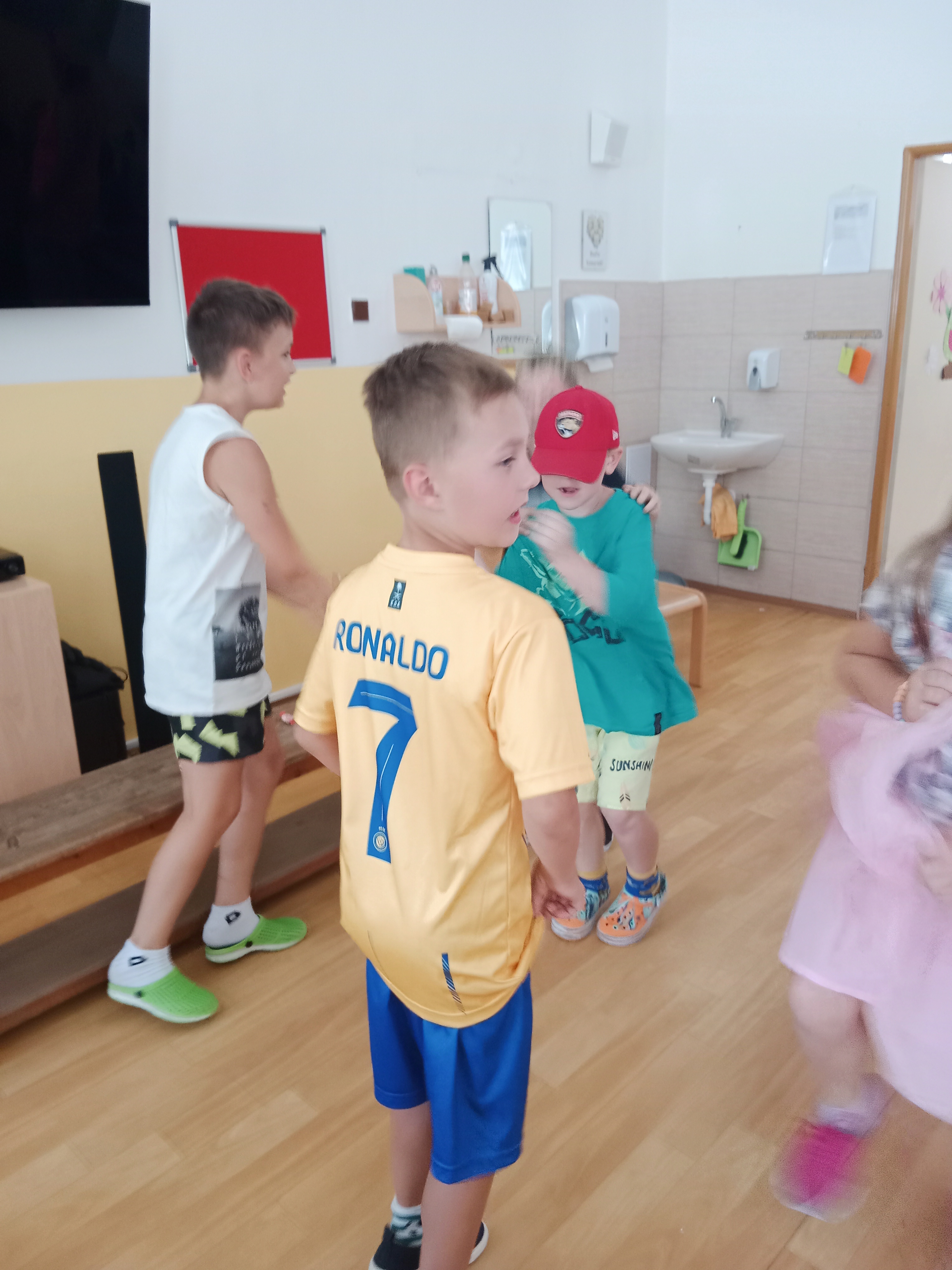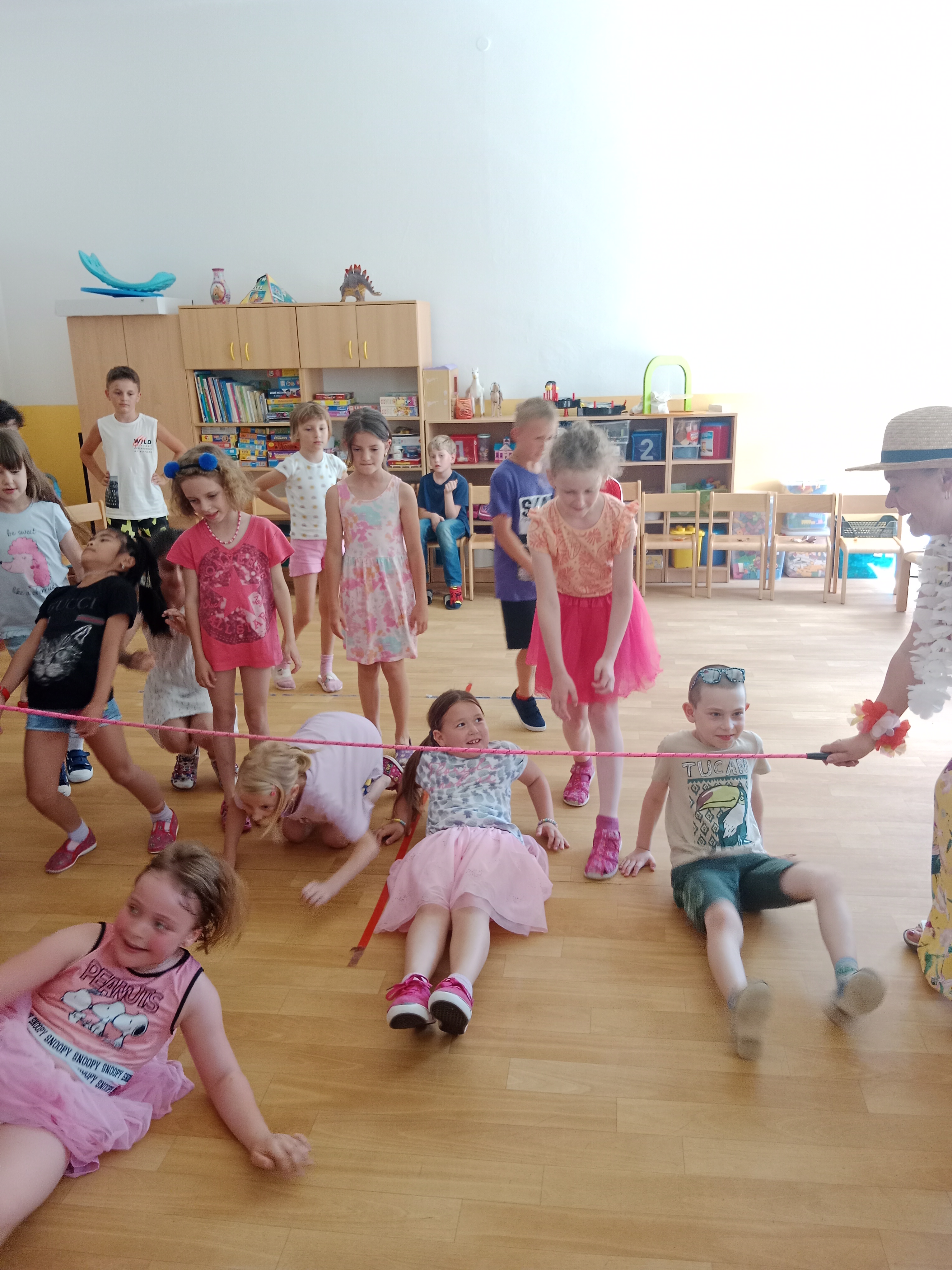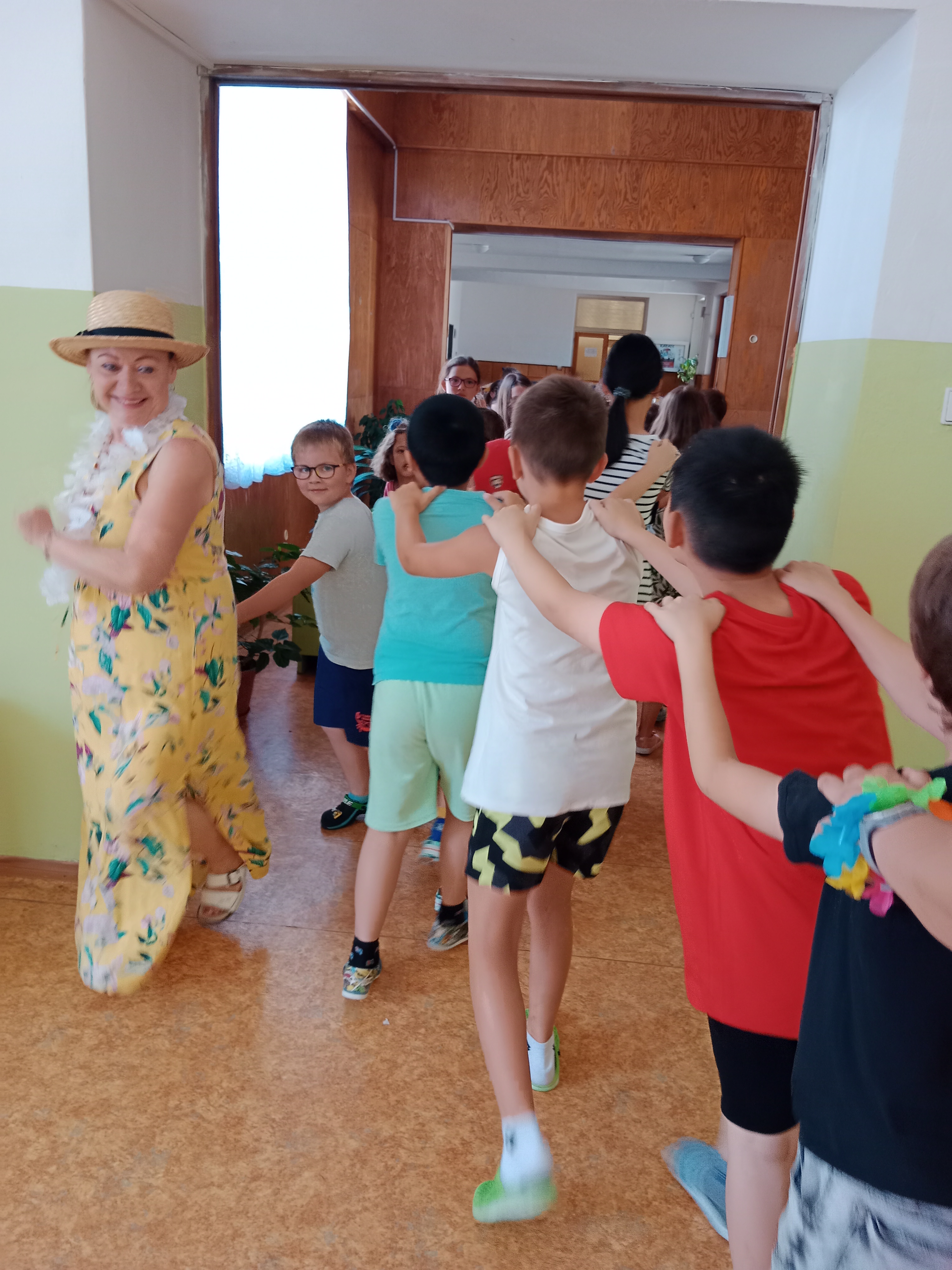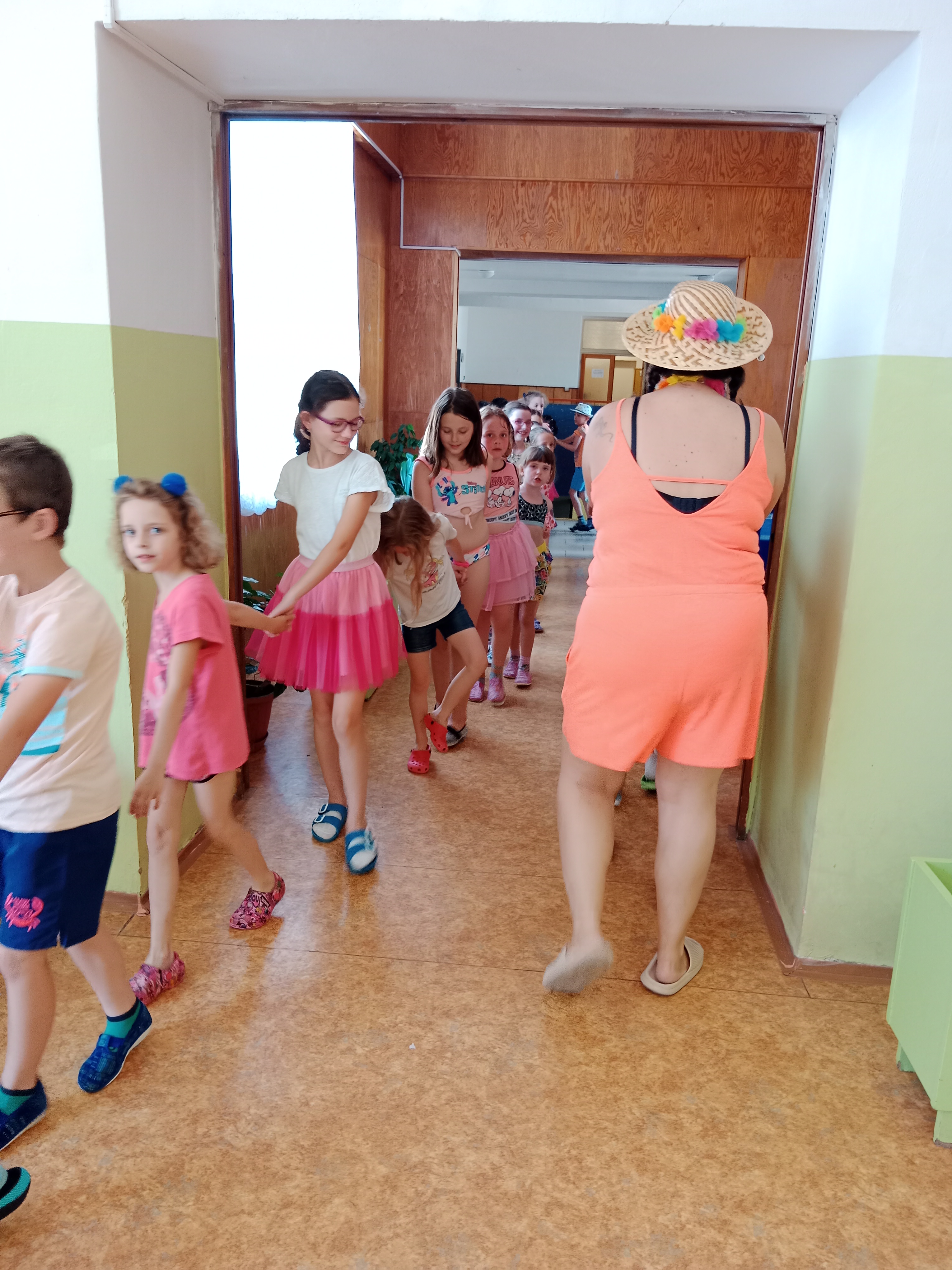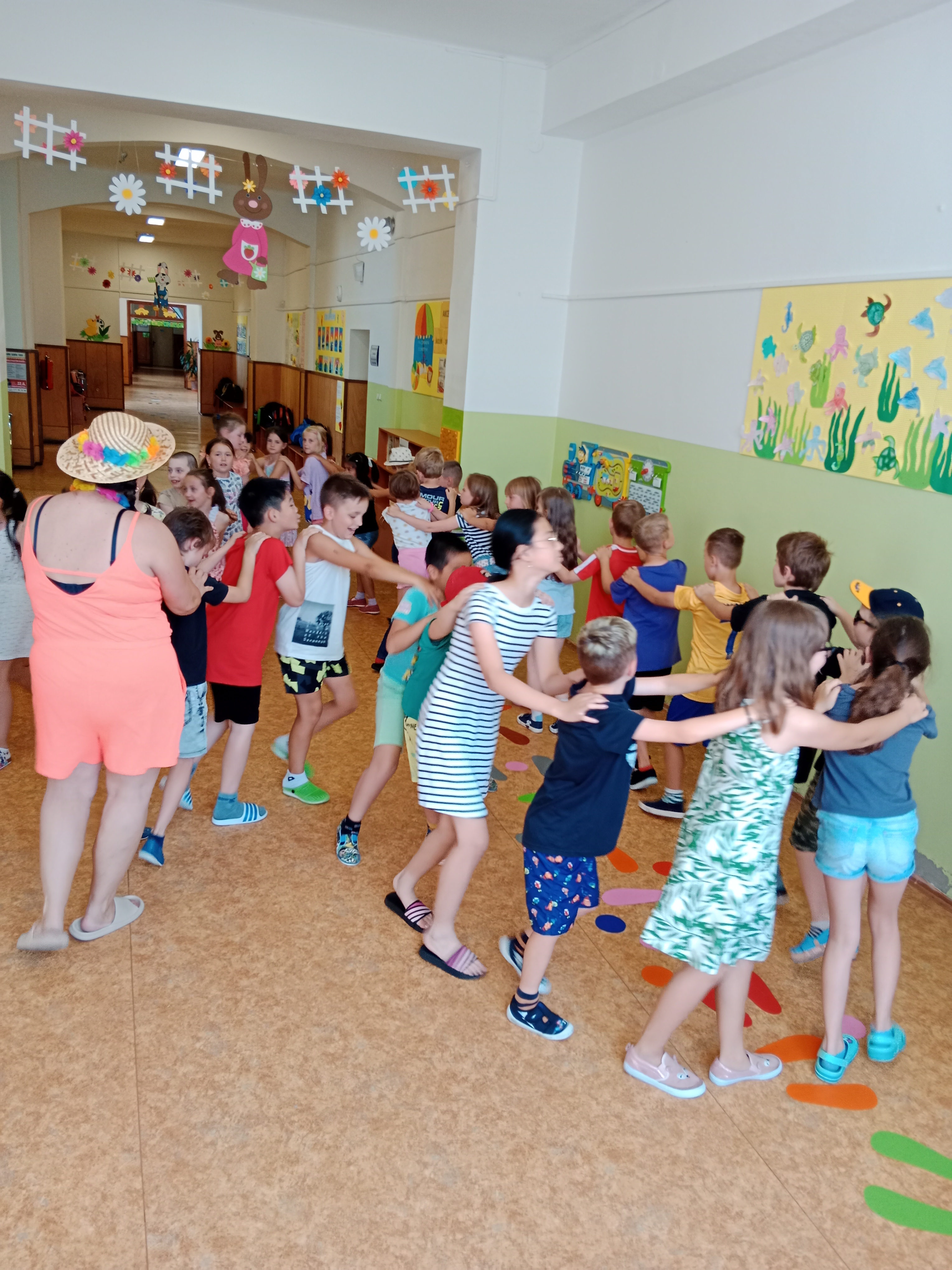 Děti se předvedly ve svých letních, prázdninových ,,outfitech." Tančili jsme a zpívali na známé hity a dětské písničky. Odpoledne jsme si zpestřili soutěží v tanci dvojic s míčkem a hrou Na sochy.