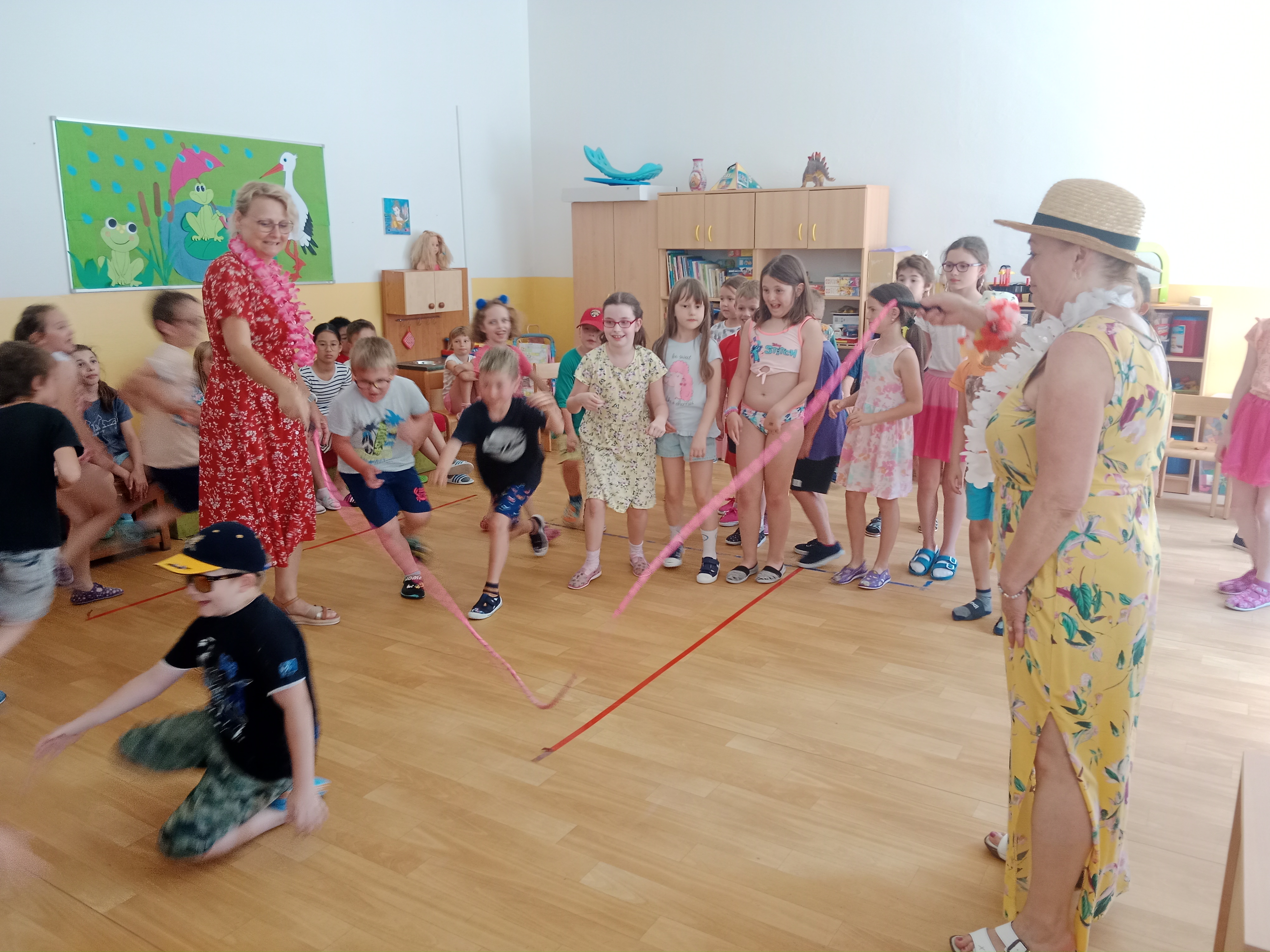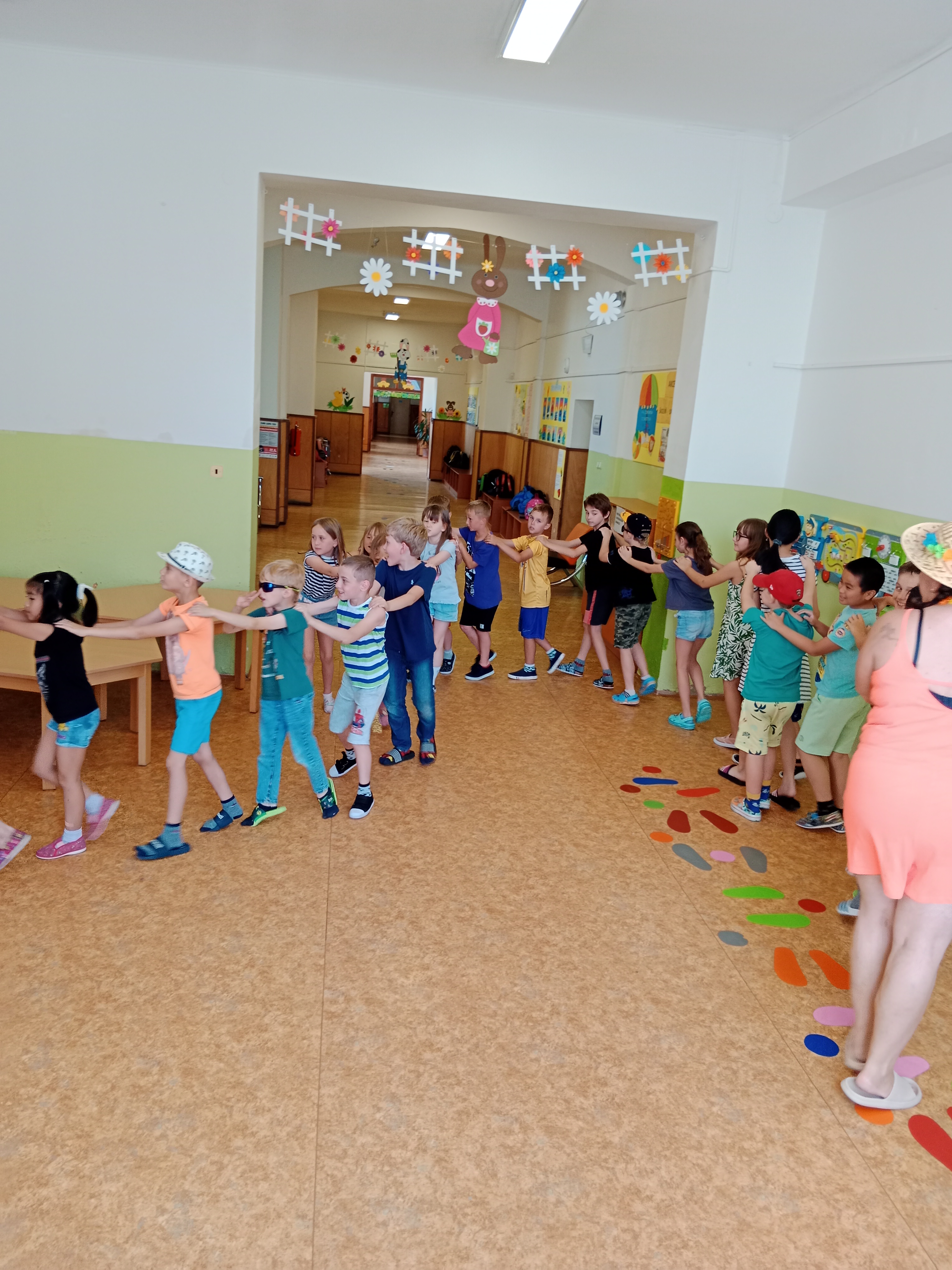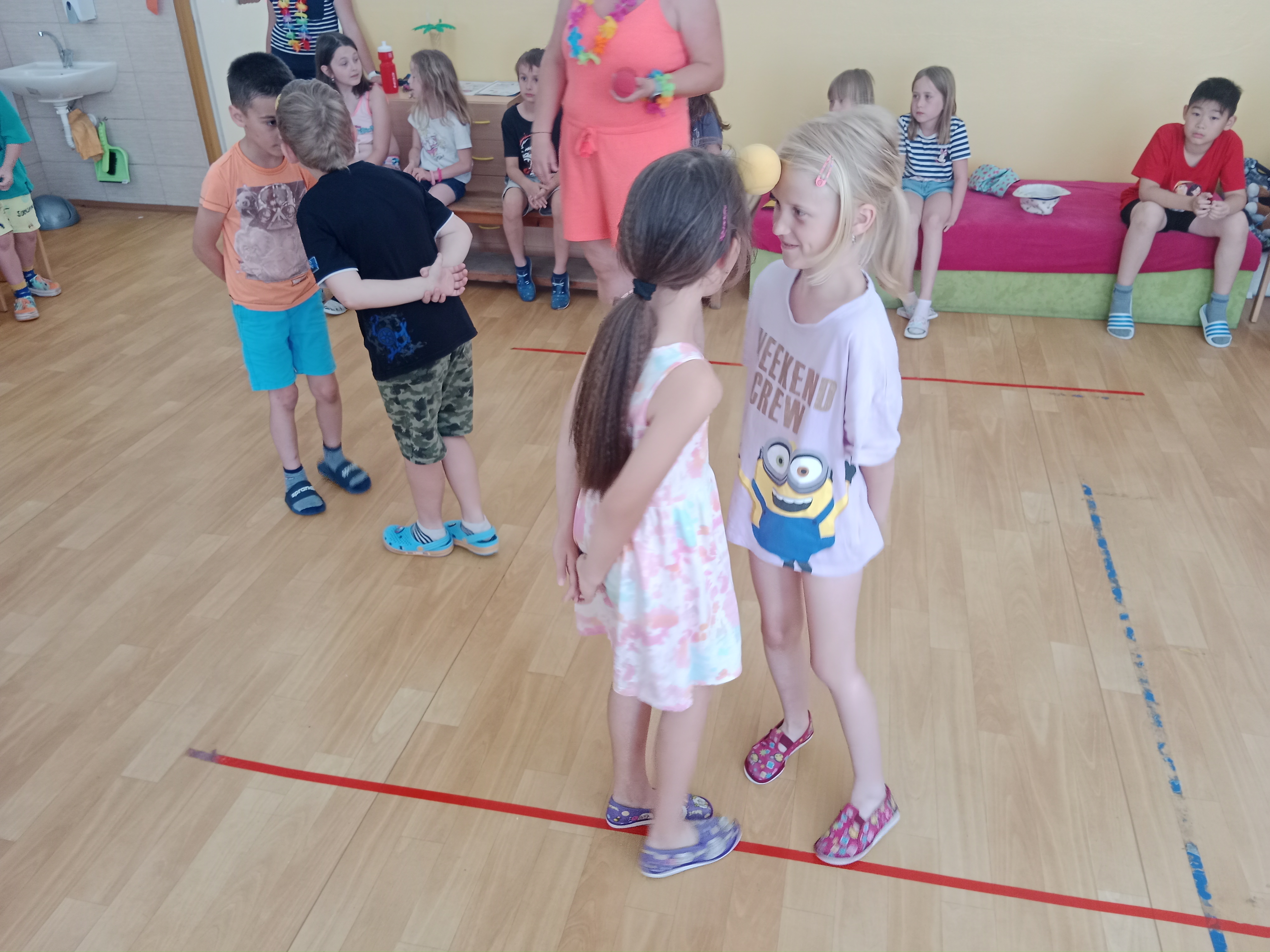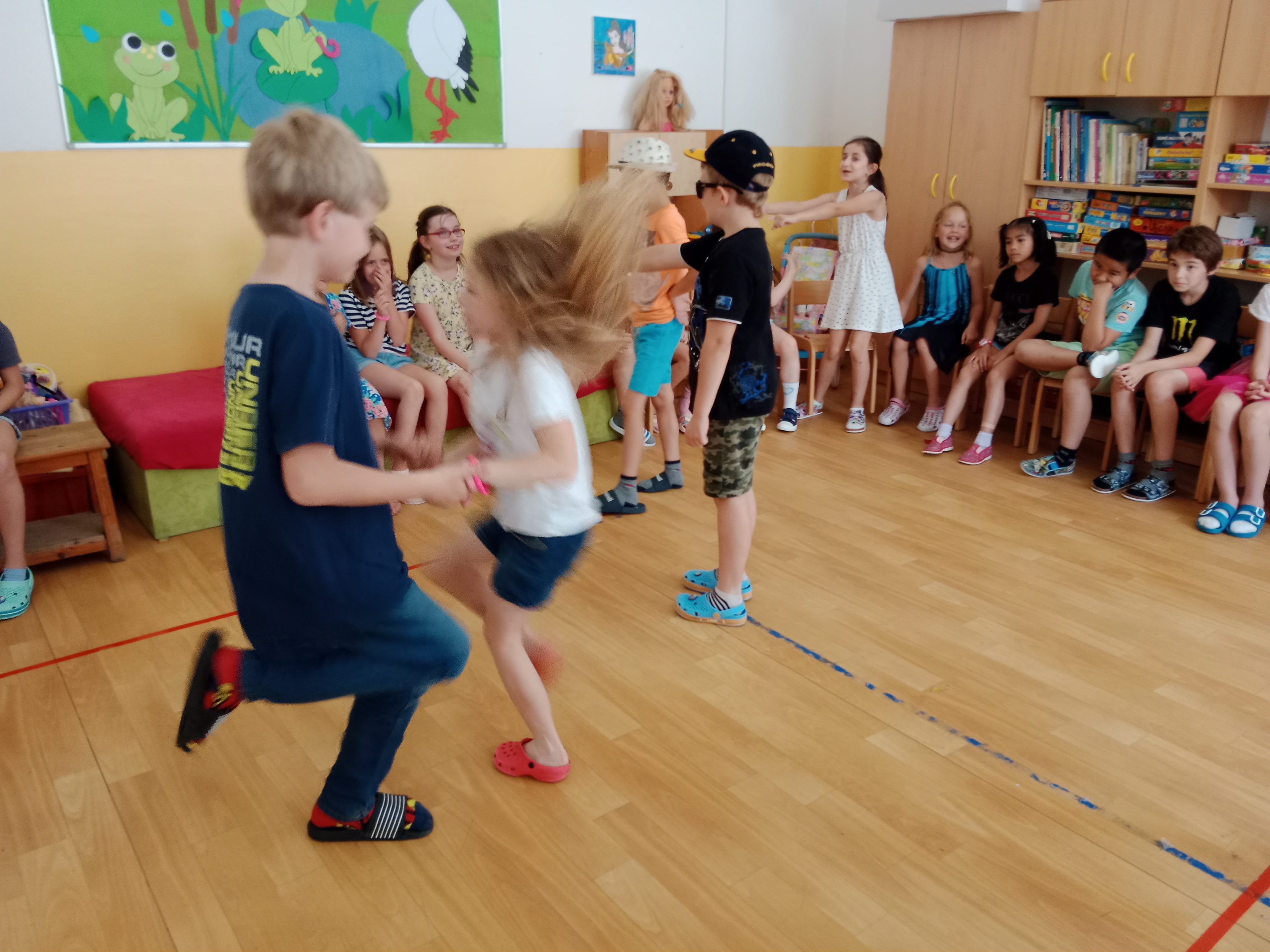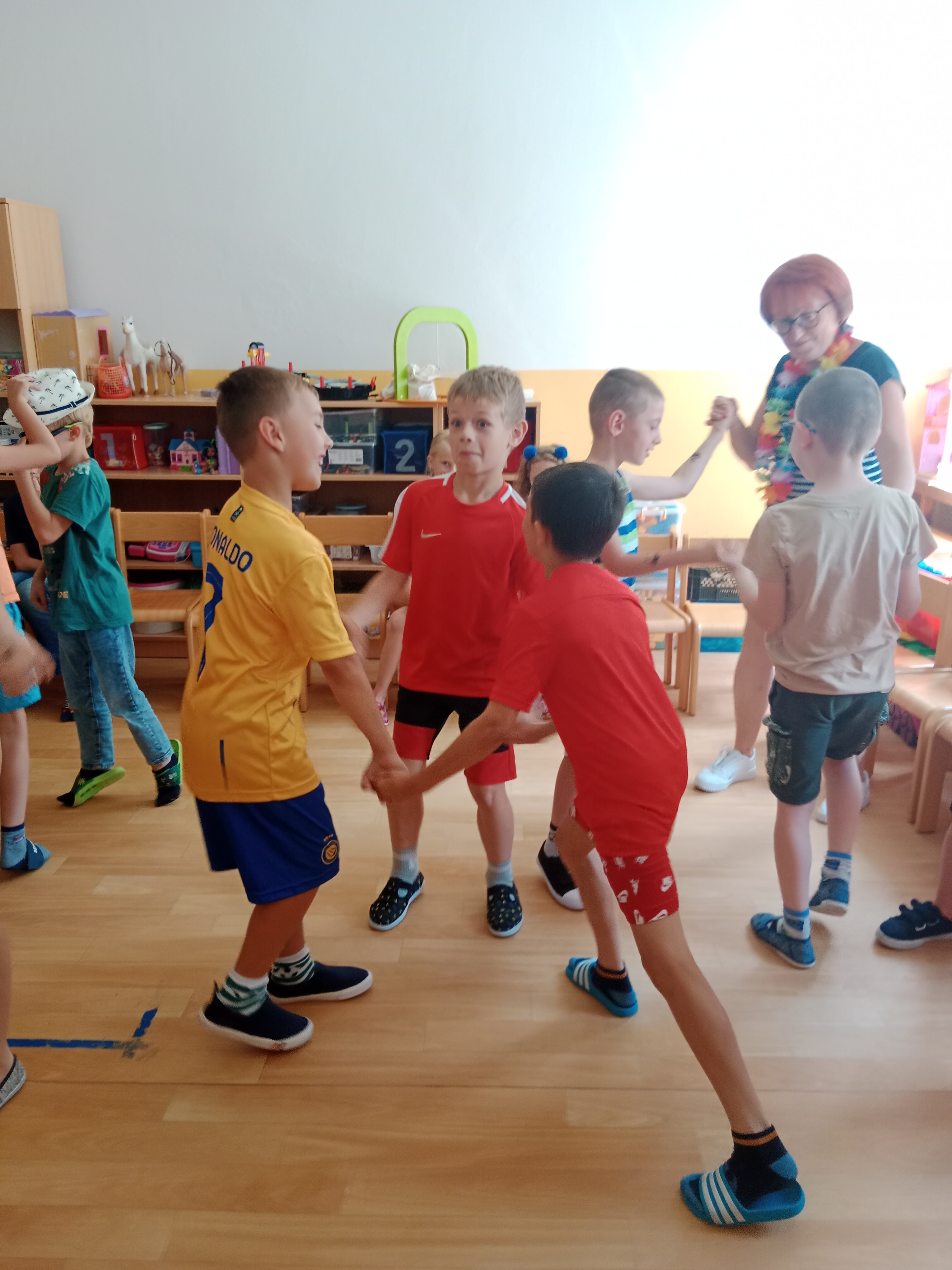Děti se předvedly ve svých letních, prázdninových ,,outfitech." Tančili jsme a zpívali na známé hity a dětské písničky. Odpoledne jsme si zpestřili soutěží v tanci dvojic s míčkem a hrou Na sochy.