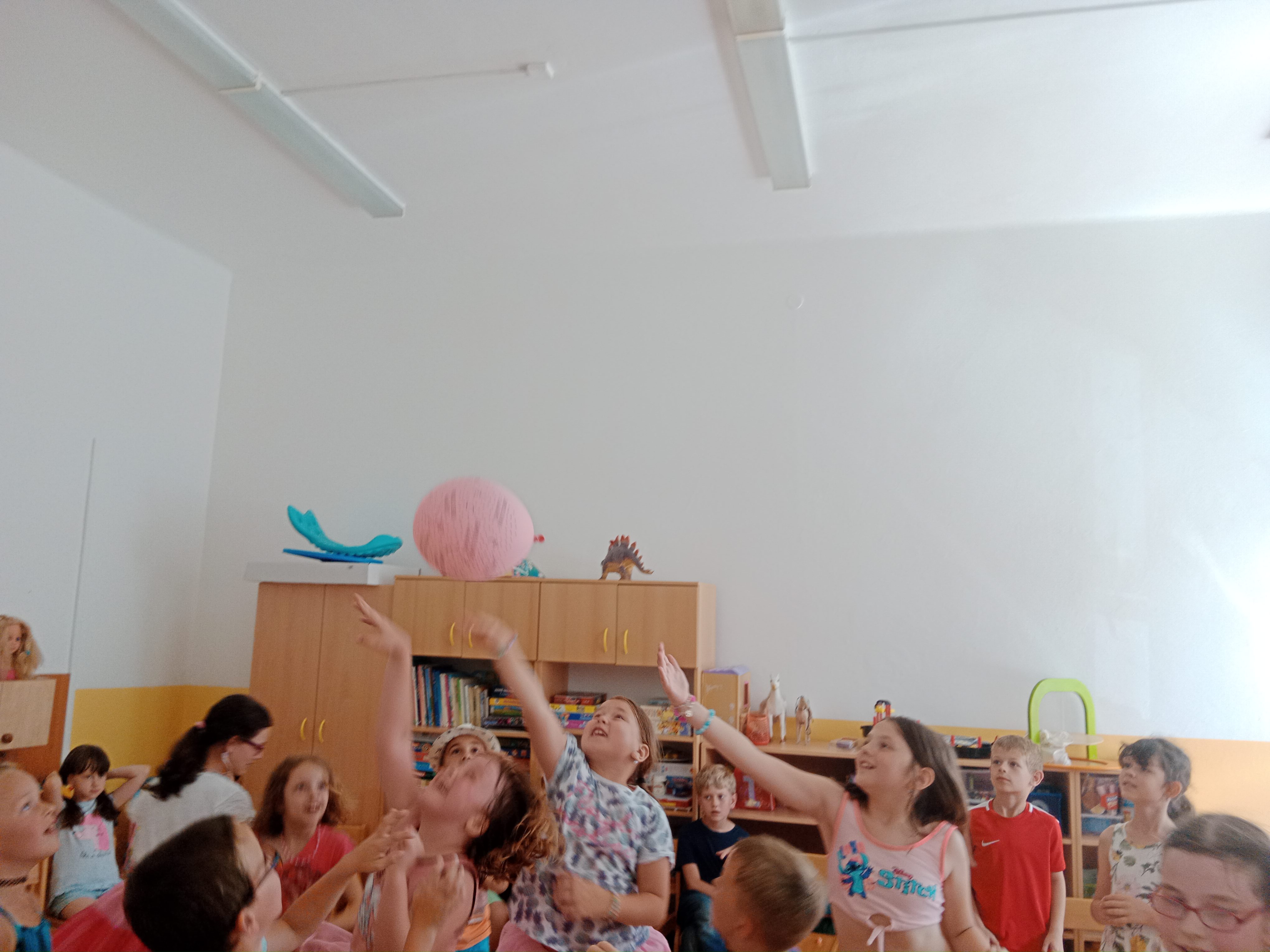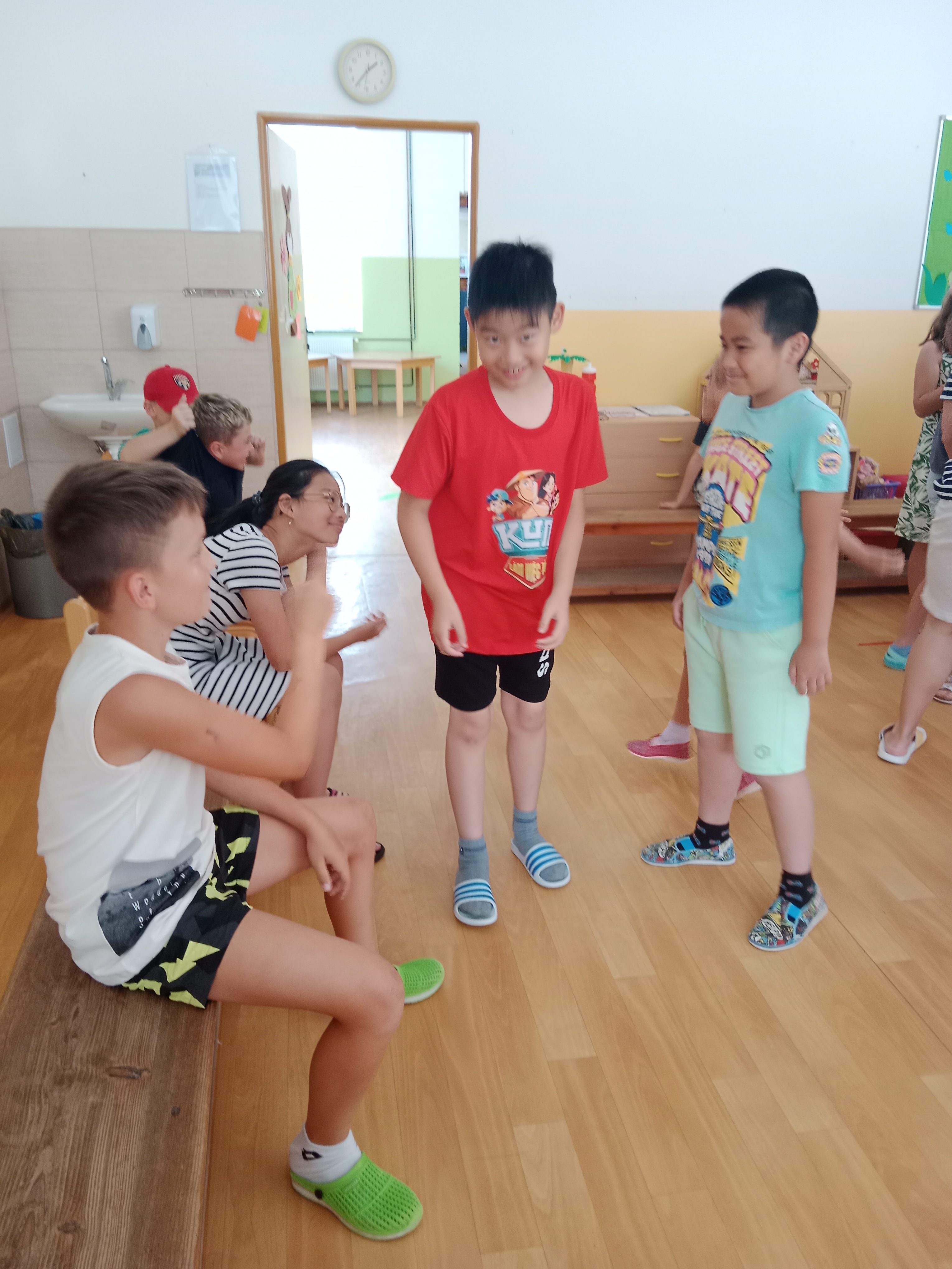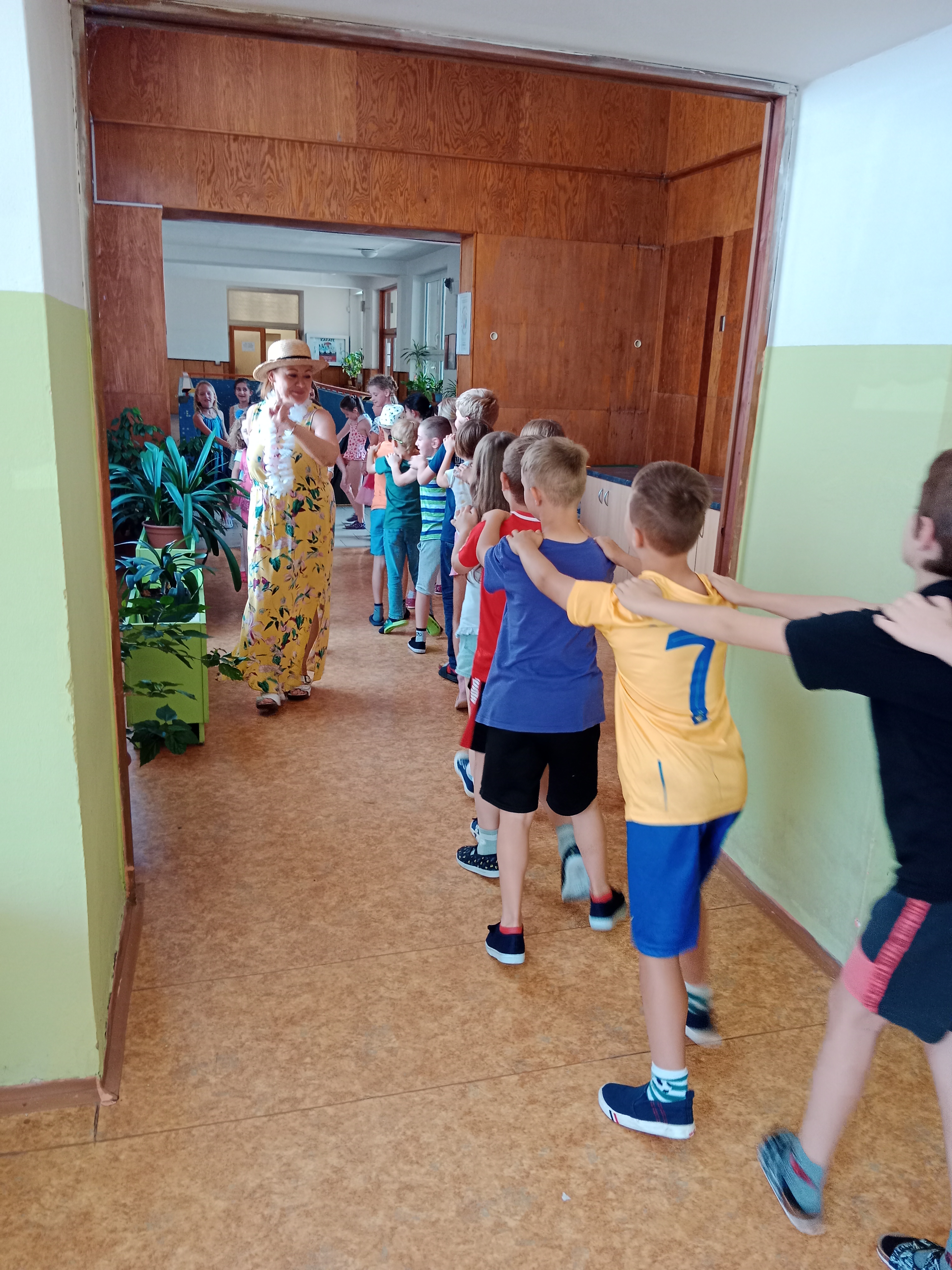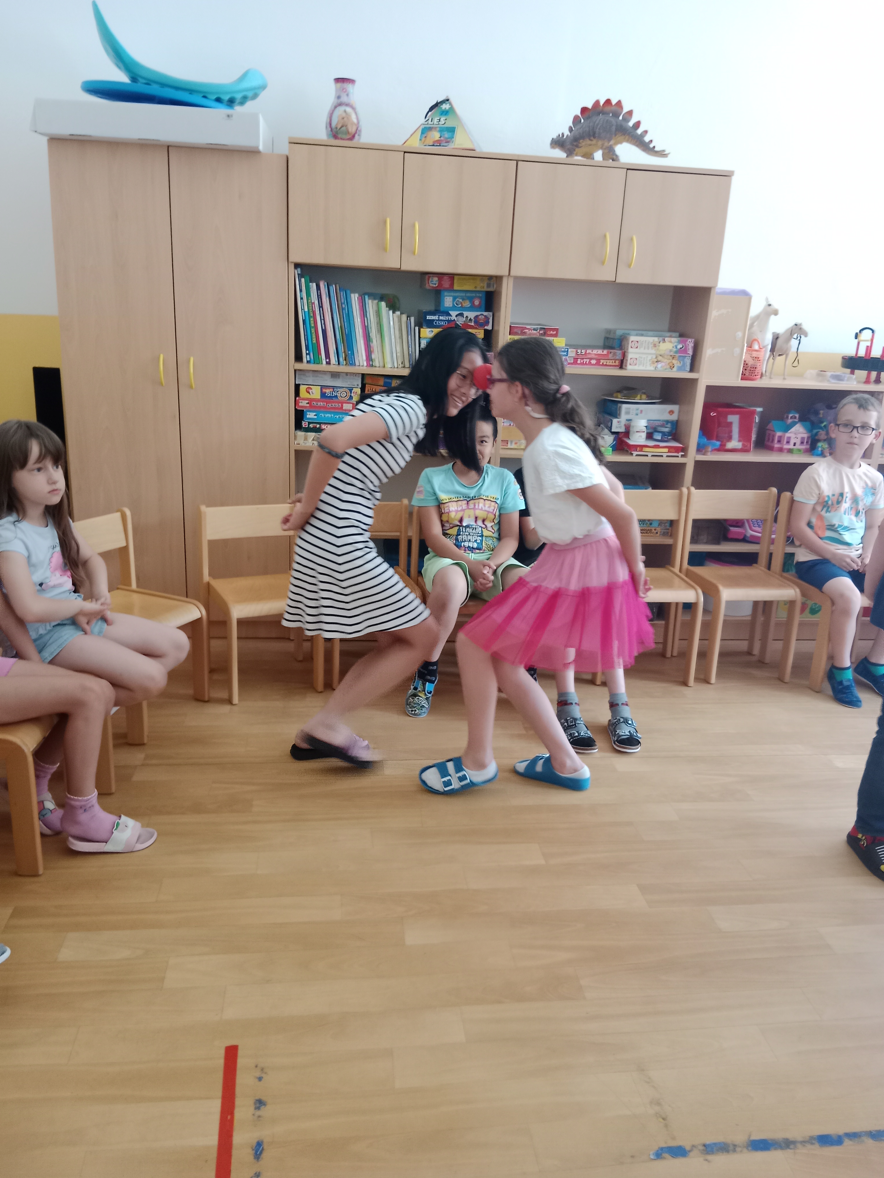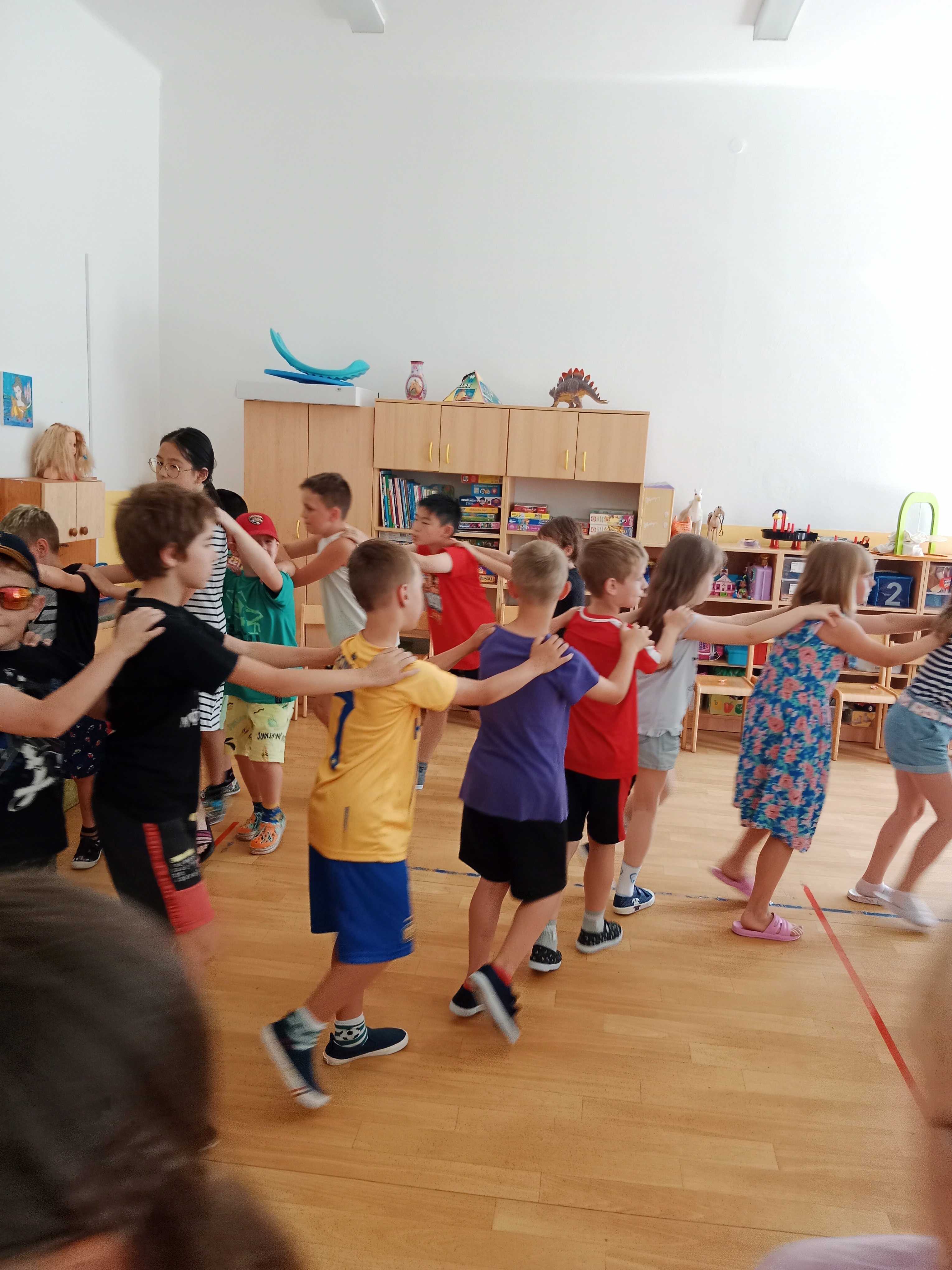 Děti se předvedly ve svých letních, prázdninových ,,outfitech." Tančili jsme a zpívali na známé hity a dětské písničky. Odpoledne jsme si zpestřili soutěží v tanci dvojic s míčkem a hrou Na sochy.
