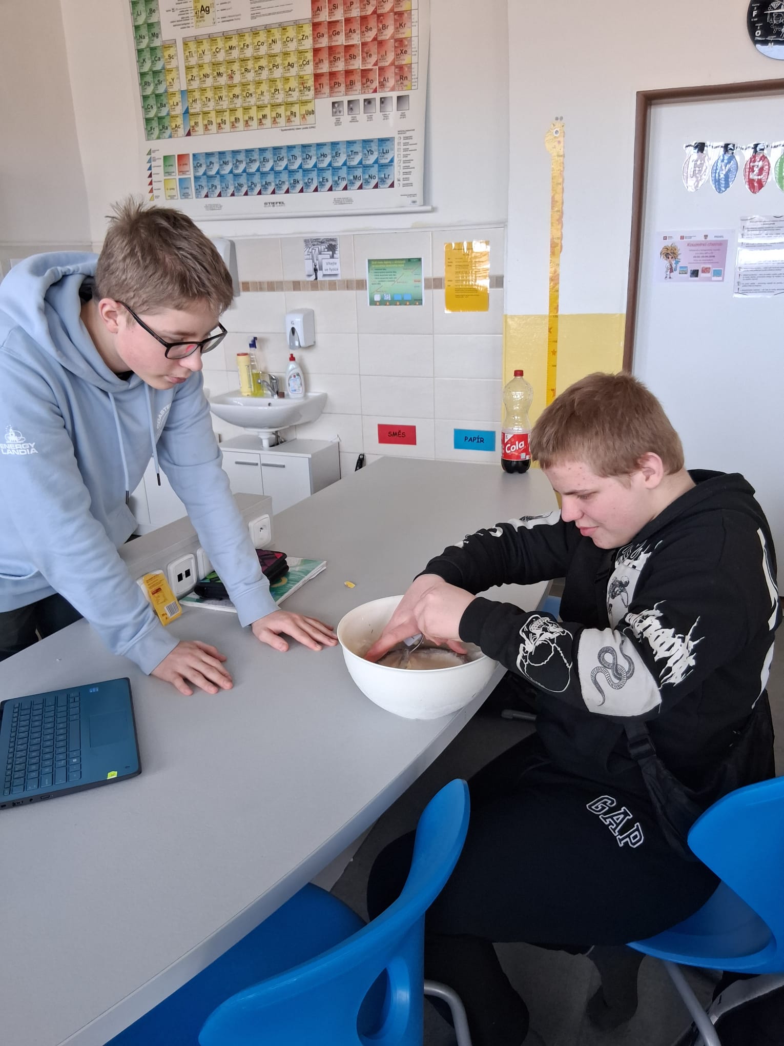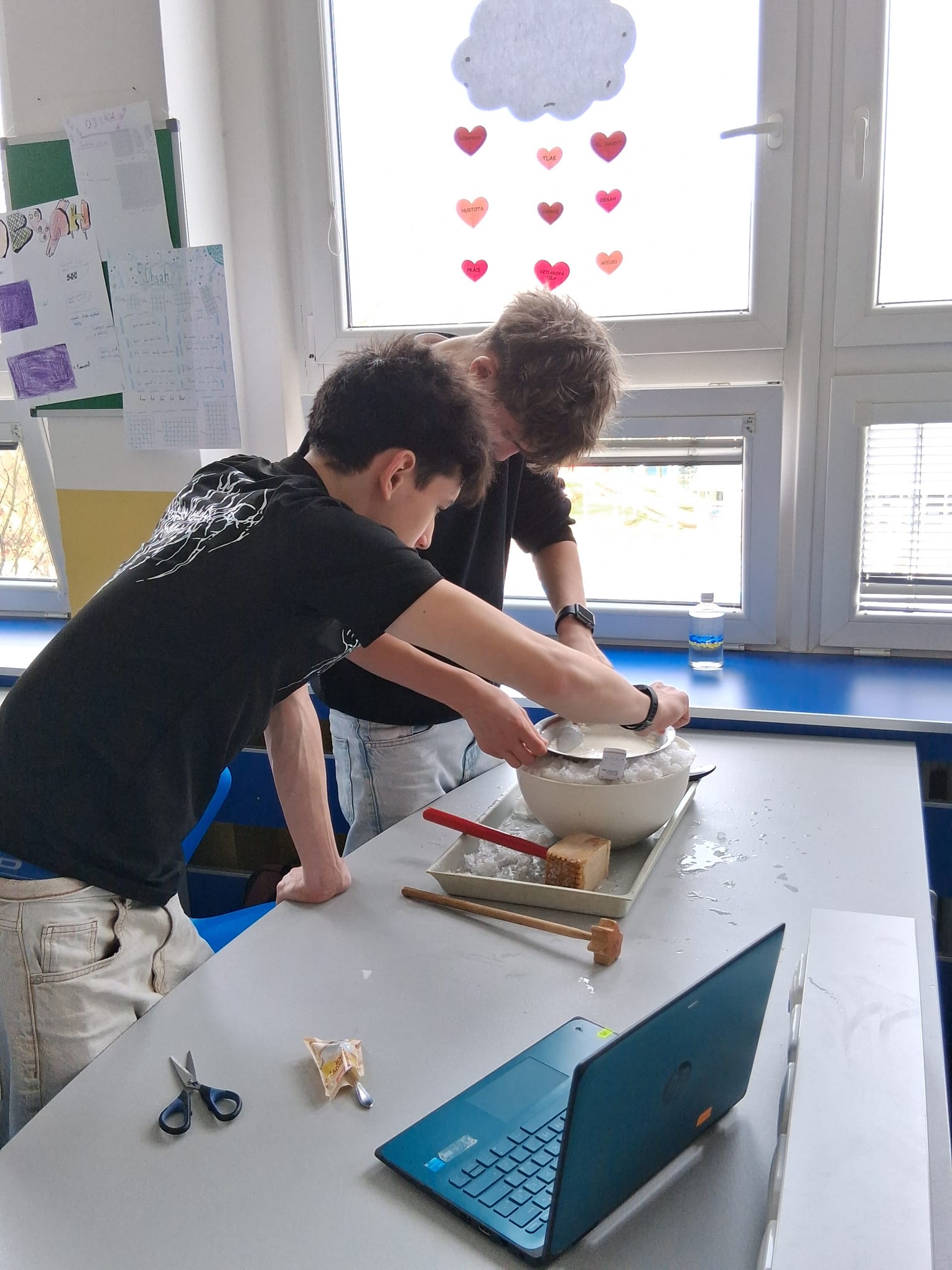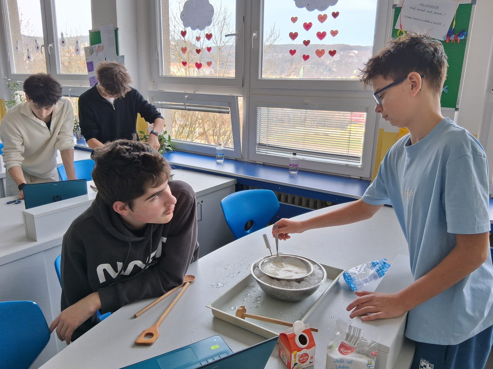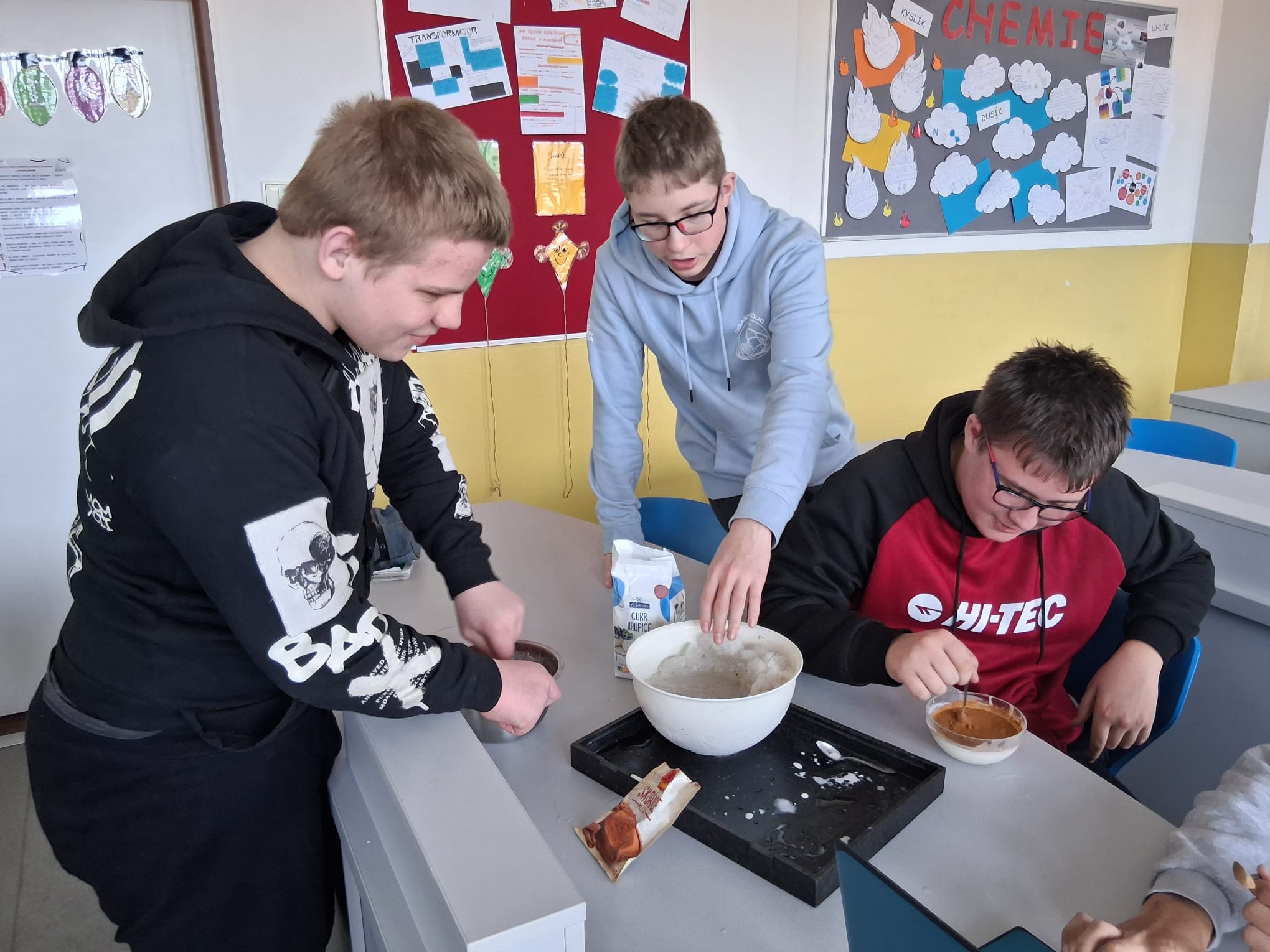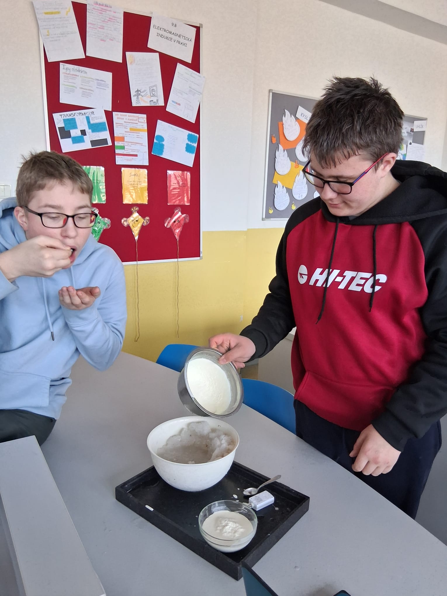 Těsně před jarními prázdninami jsme nasbírali poslední zbytky sněhu. Ukázali si princip toho, proč se v zimě solí silnice. A jako třešničku na dortu si žáci na sněhu ochlazeném na téměř -20 °C vyrobili vlastní smetanovou zmrzlinu. A někteří dokonce i skořicovou 🙂 Zmrzlinová hodina měla velký úspěch 🙂