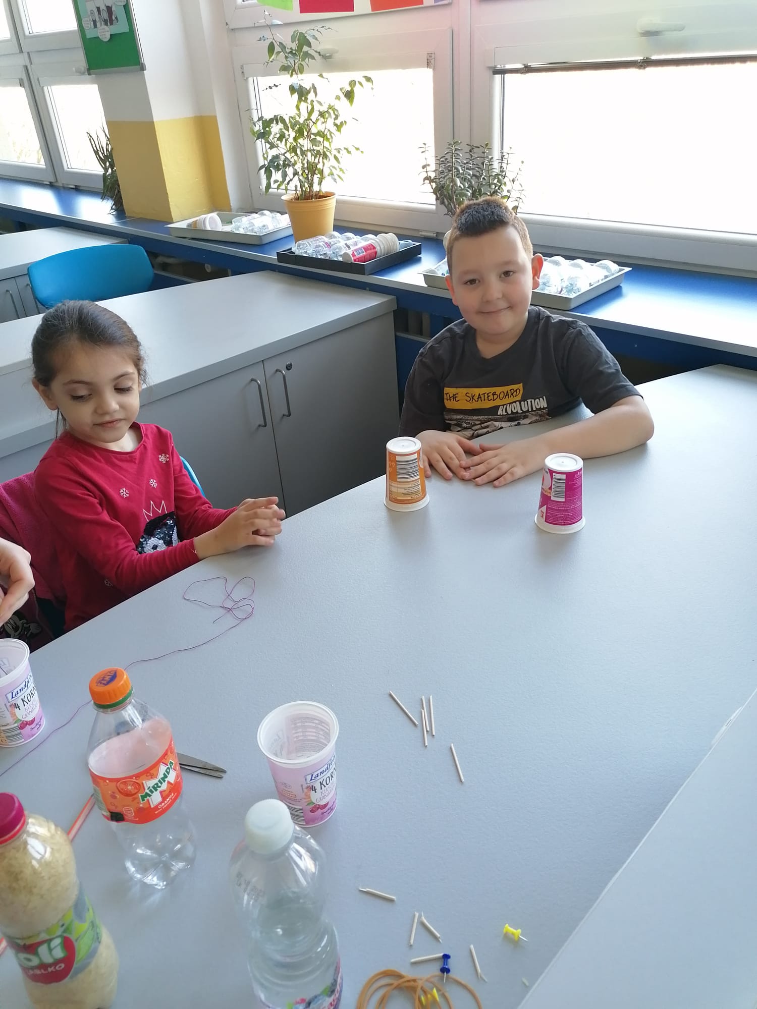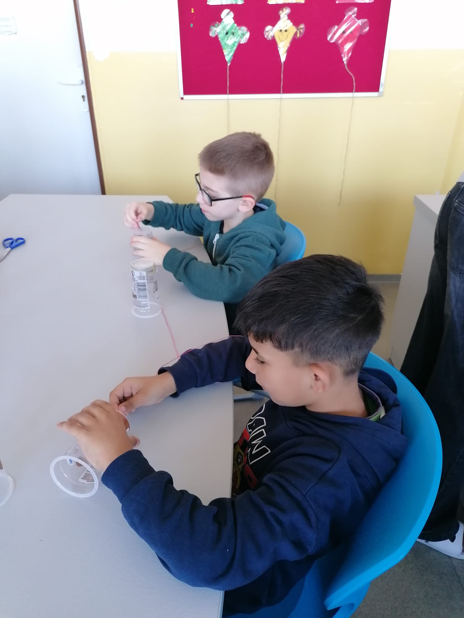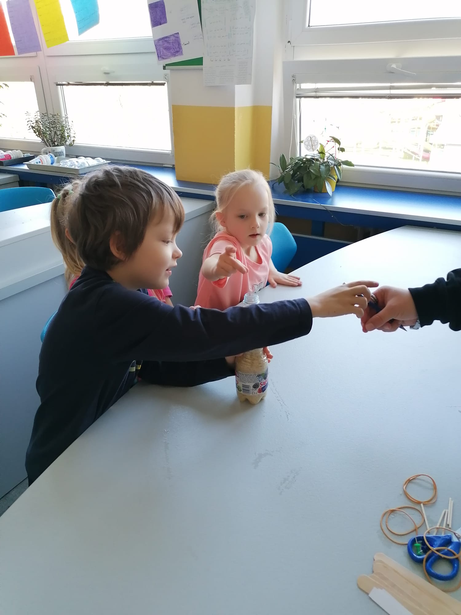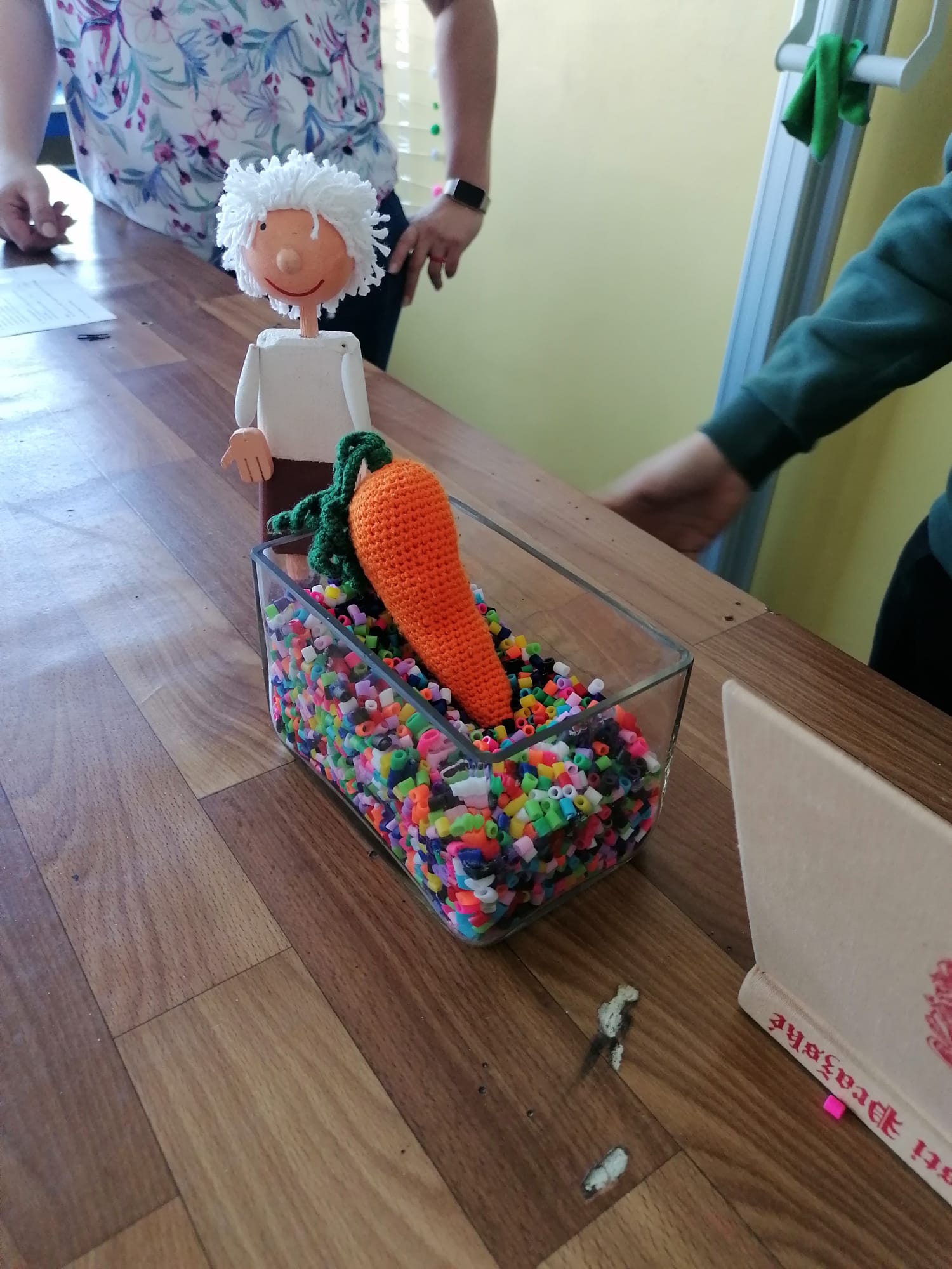 Děti si také vyrobily a odnesly domů kelímkový telefon a píšťalku, pomocí těchto výrobku mohli žáci přivolat dědečkovi na pomoc babičku, pejska, kočička a myšku a společně tak vytáhnout velkou mrkev :-)