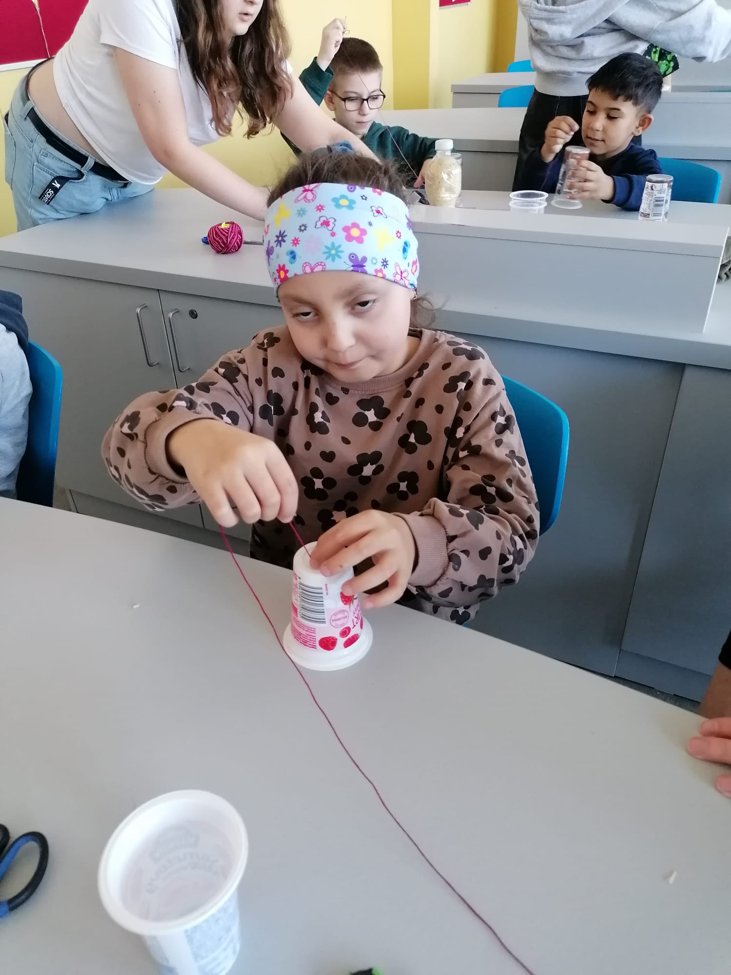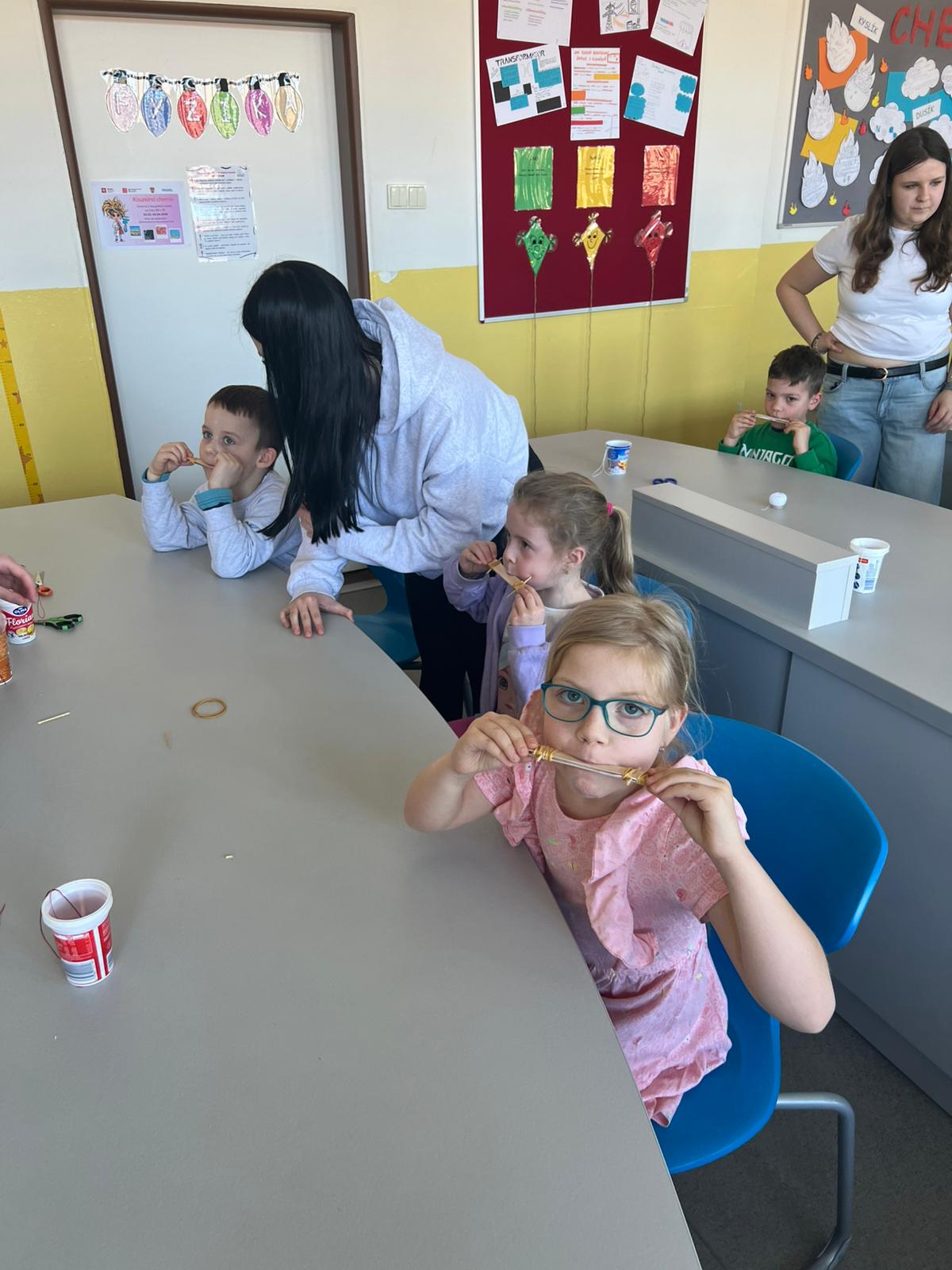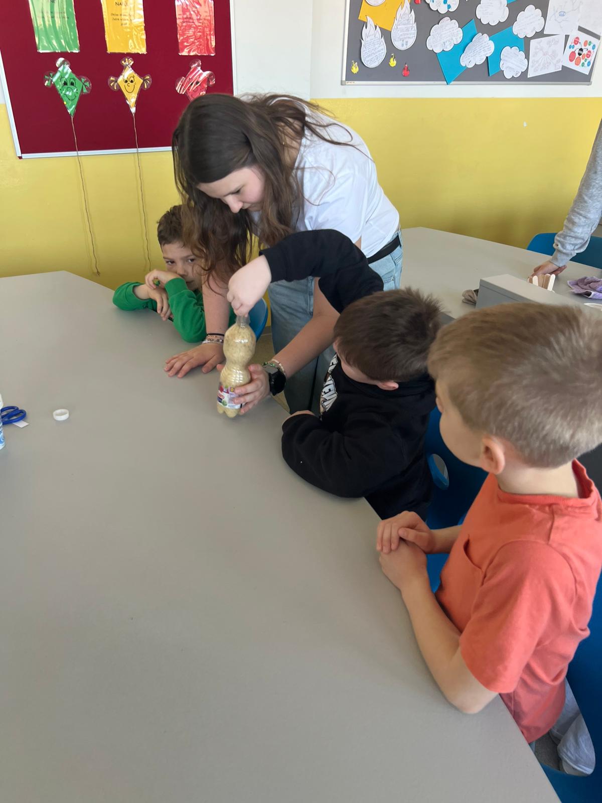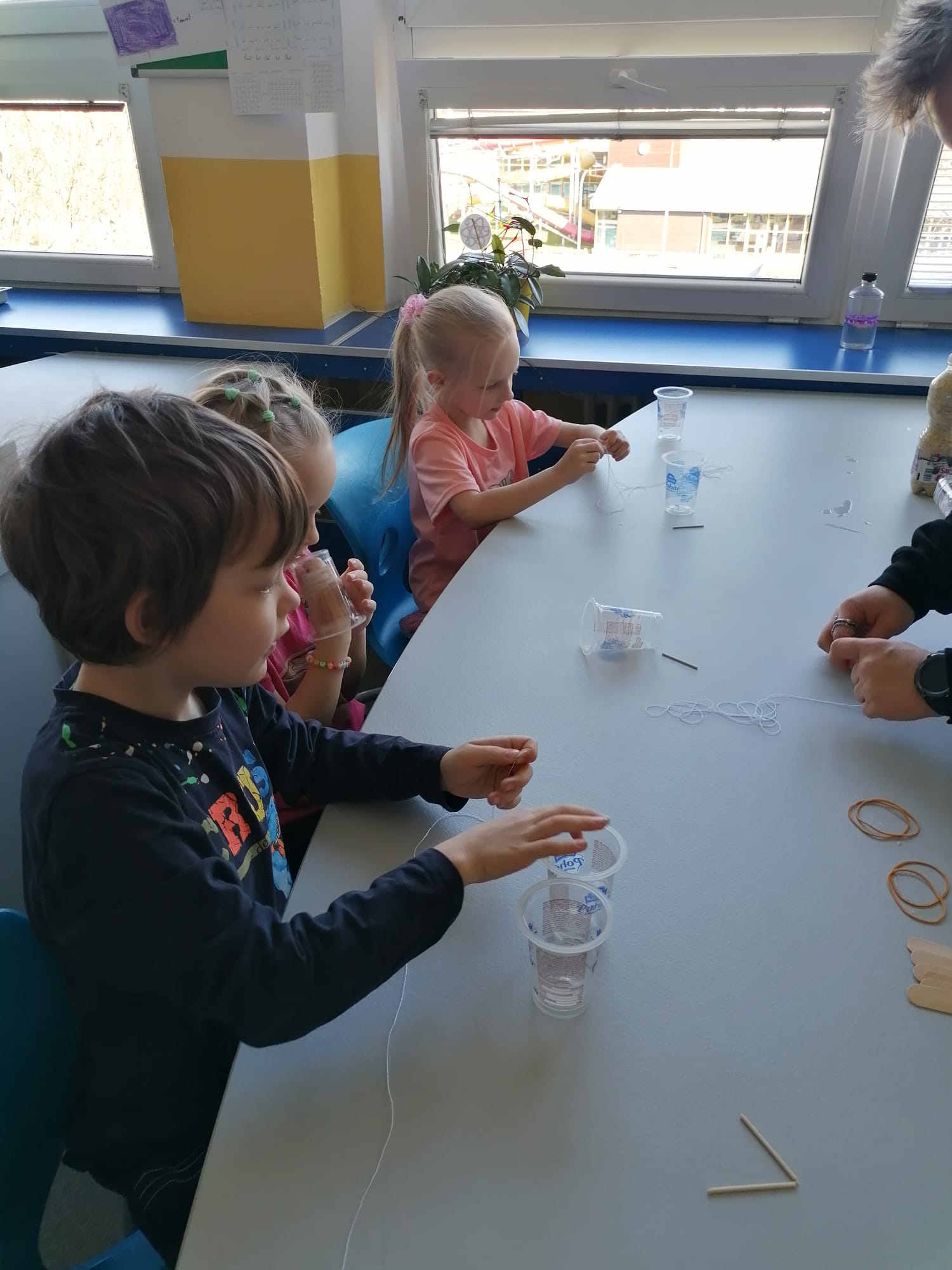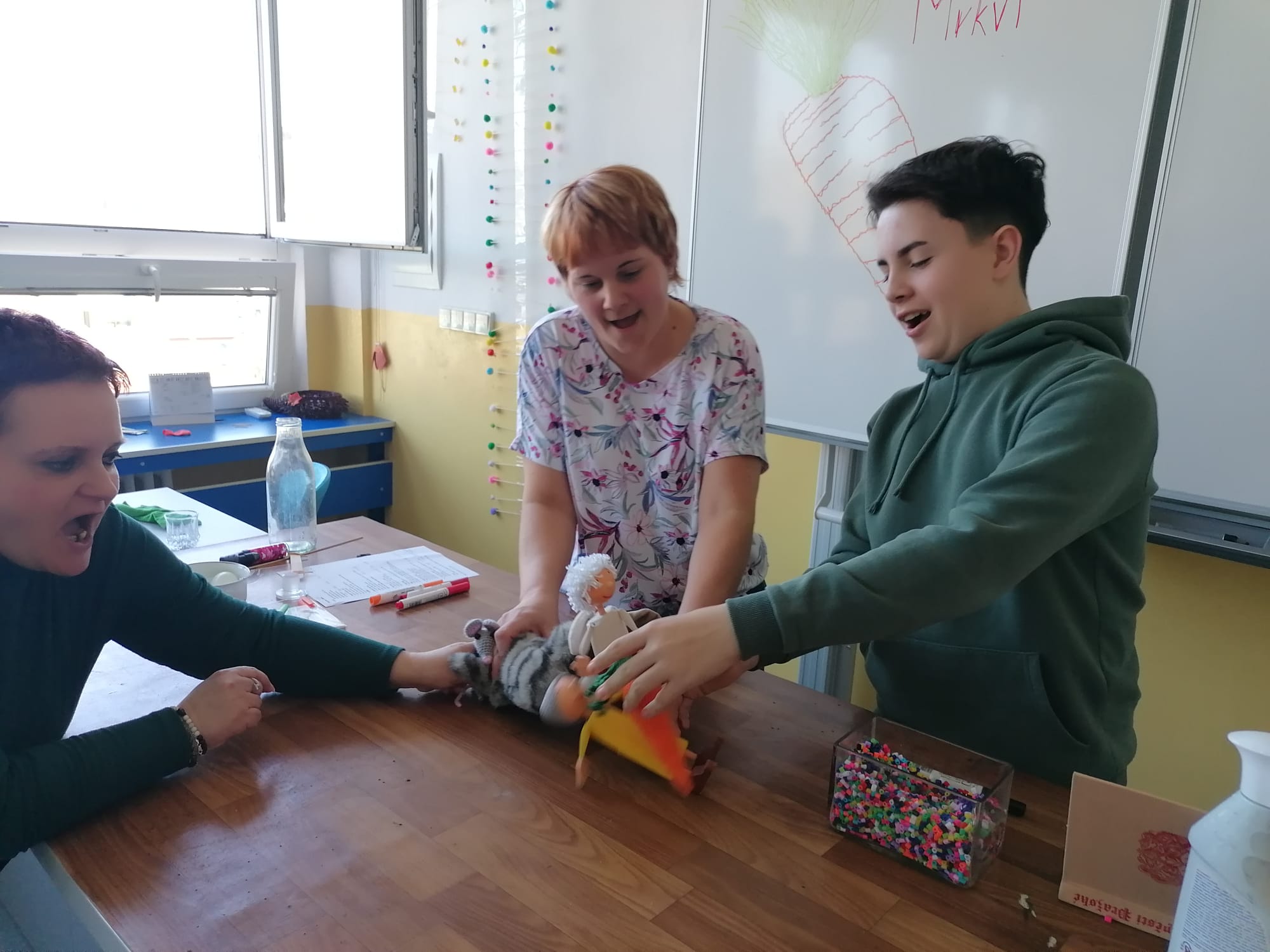 Děti si také vyrobily a odnesly domů kelímkový telefon a píšťalku, pomocí těchto výrobku mohli žáci přivolat dědečkovi na pomoc babičku, pejska, kočička a myšku a společně tak vytáhnout velkou mrkev :-)
