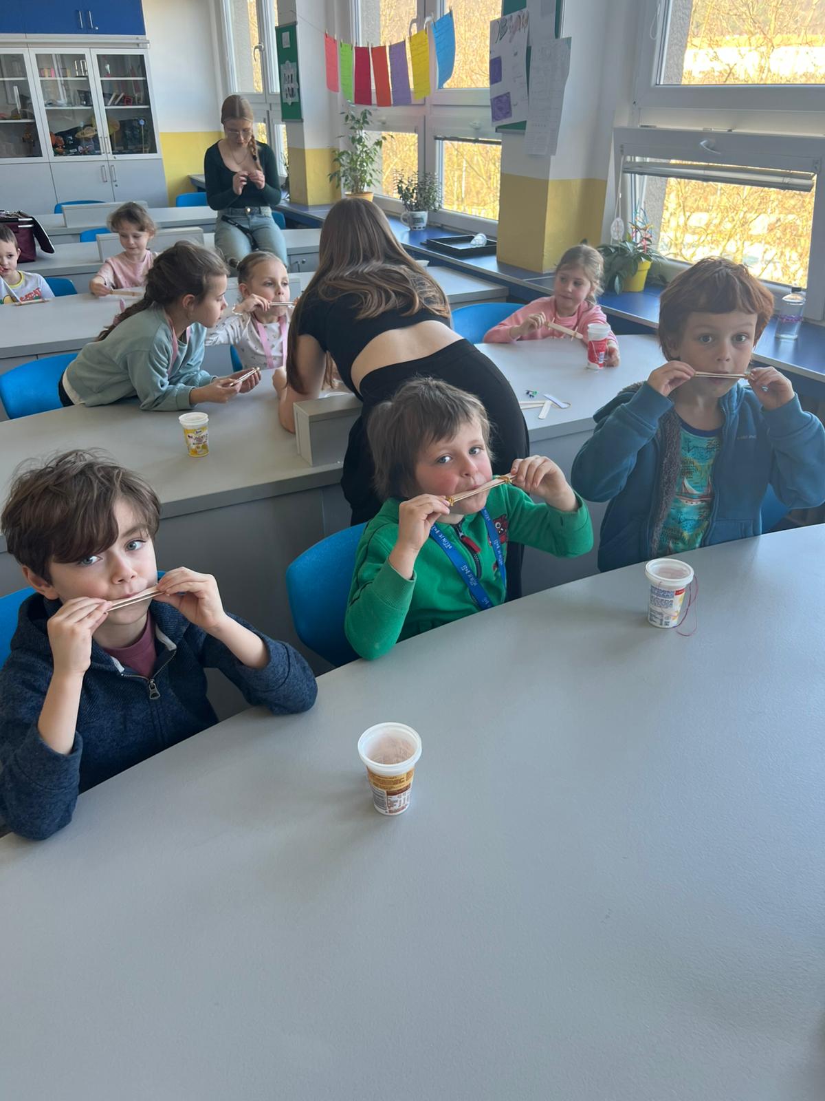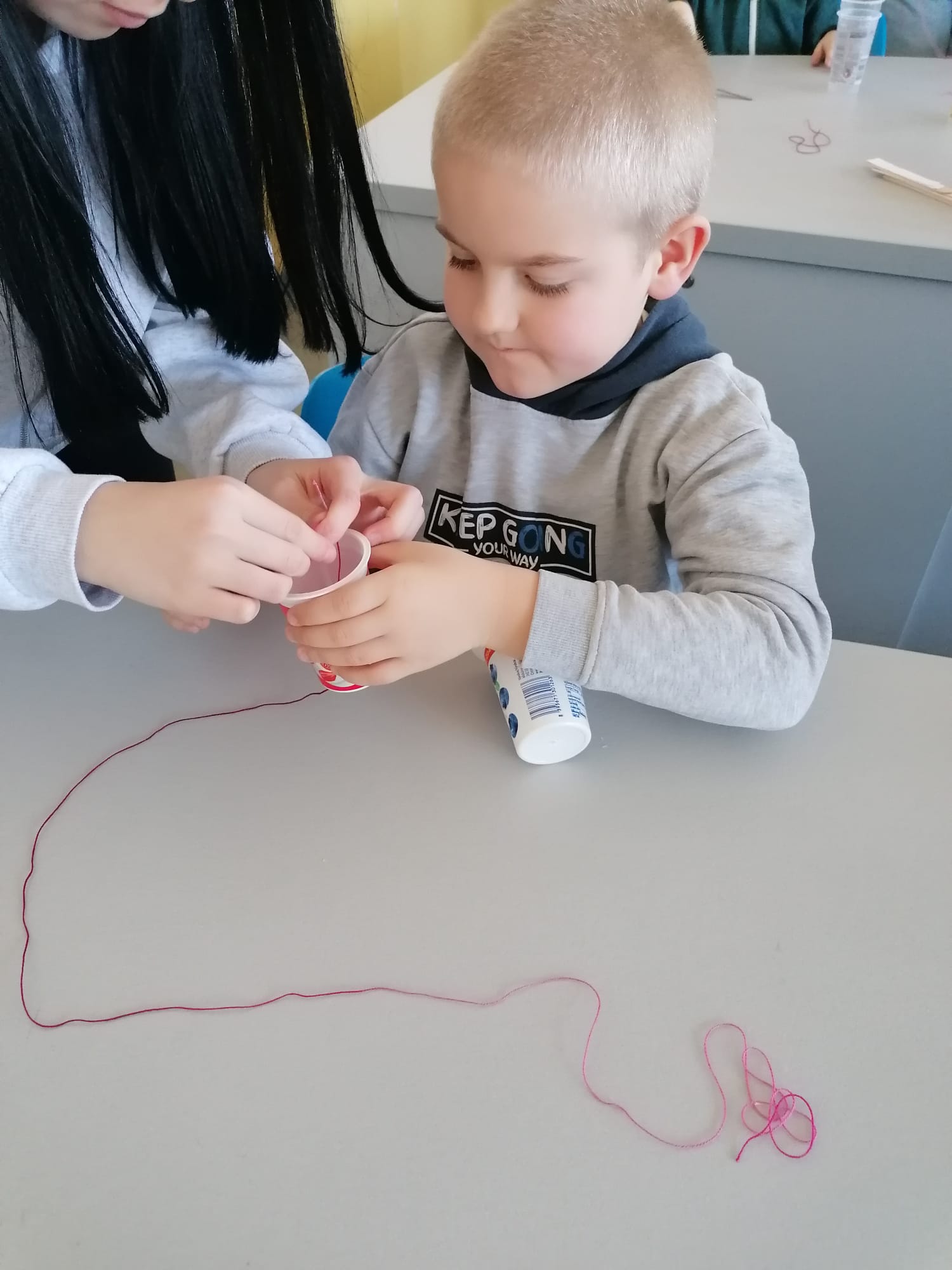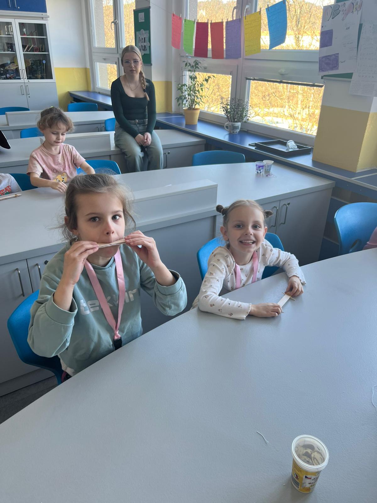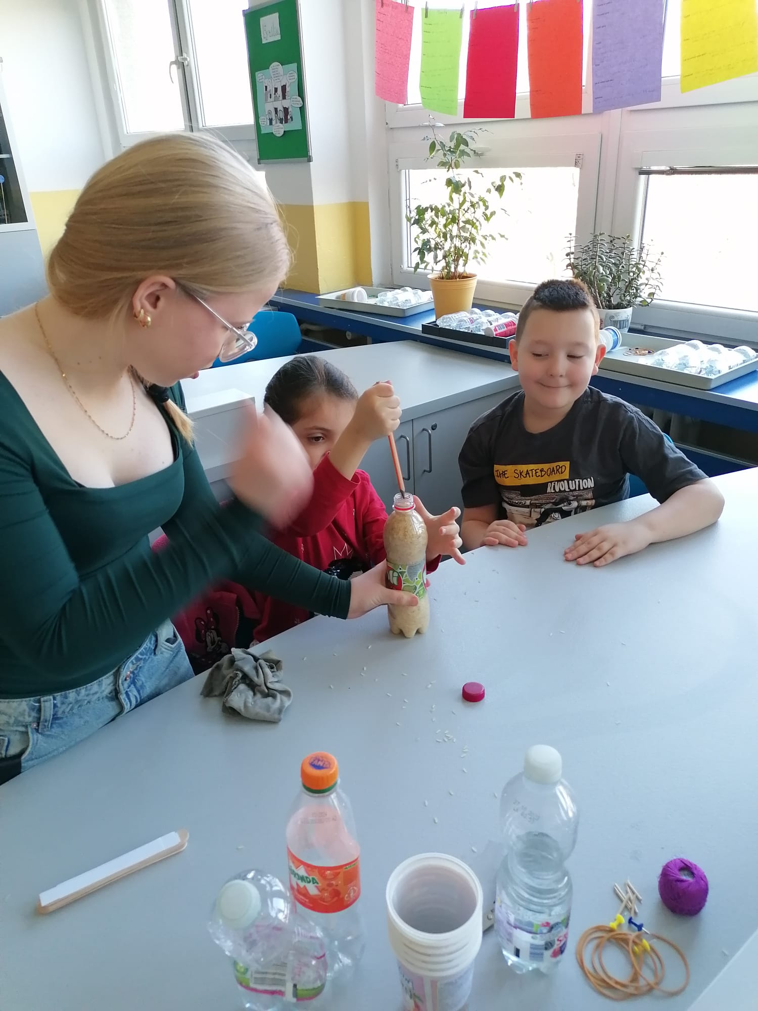 Děti si také vyrobily a odnesly domů kelímkový telefon a píšťalku, pomocí těchto výrobku mohli žáci přivolat dědečkovi na pomoc babičku, pejska, kočička a myšku a společně tak vytáhnout velkou mrkev :-)