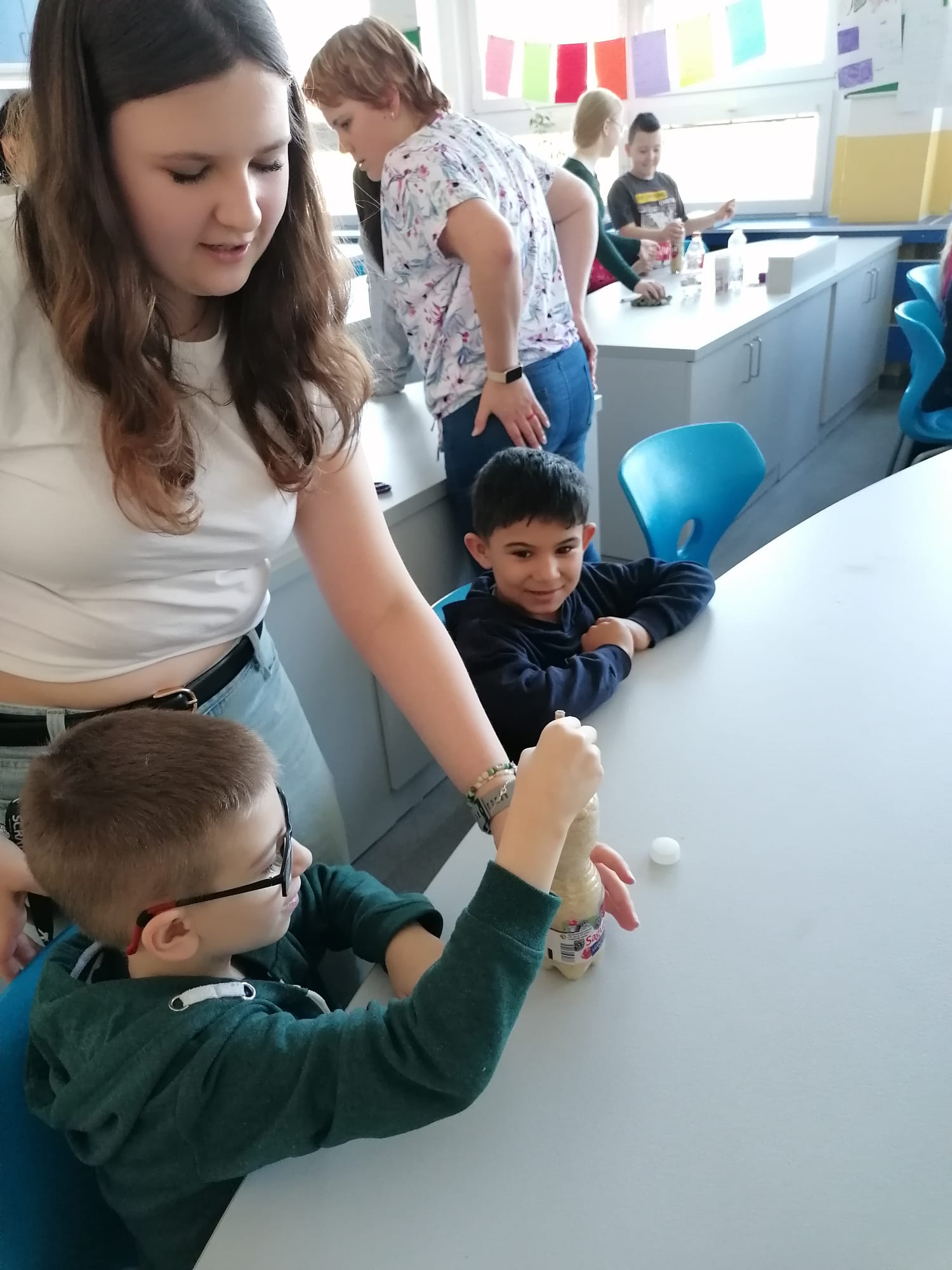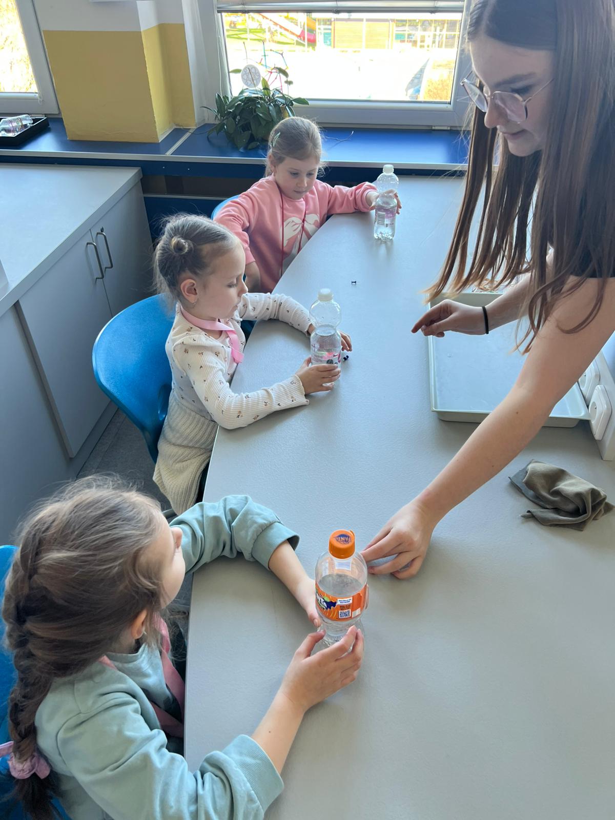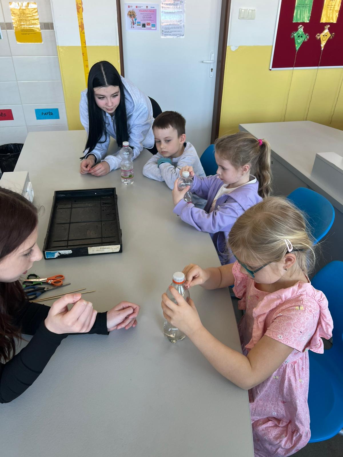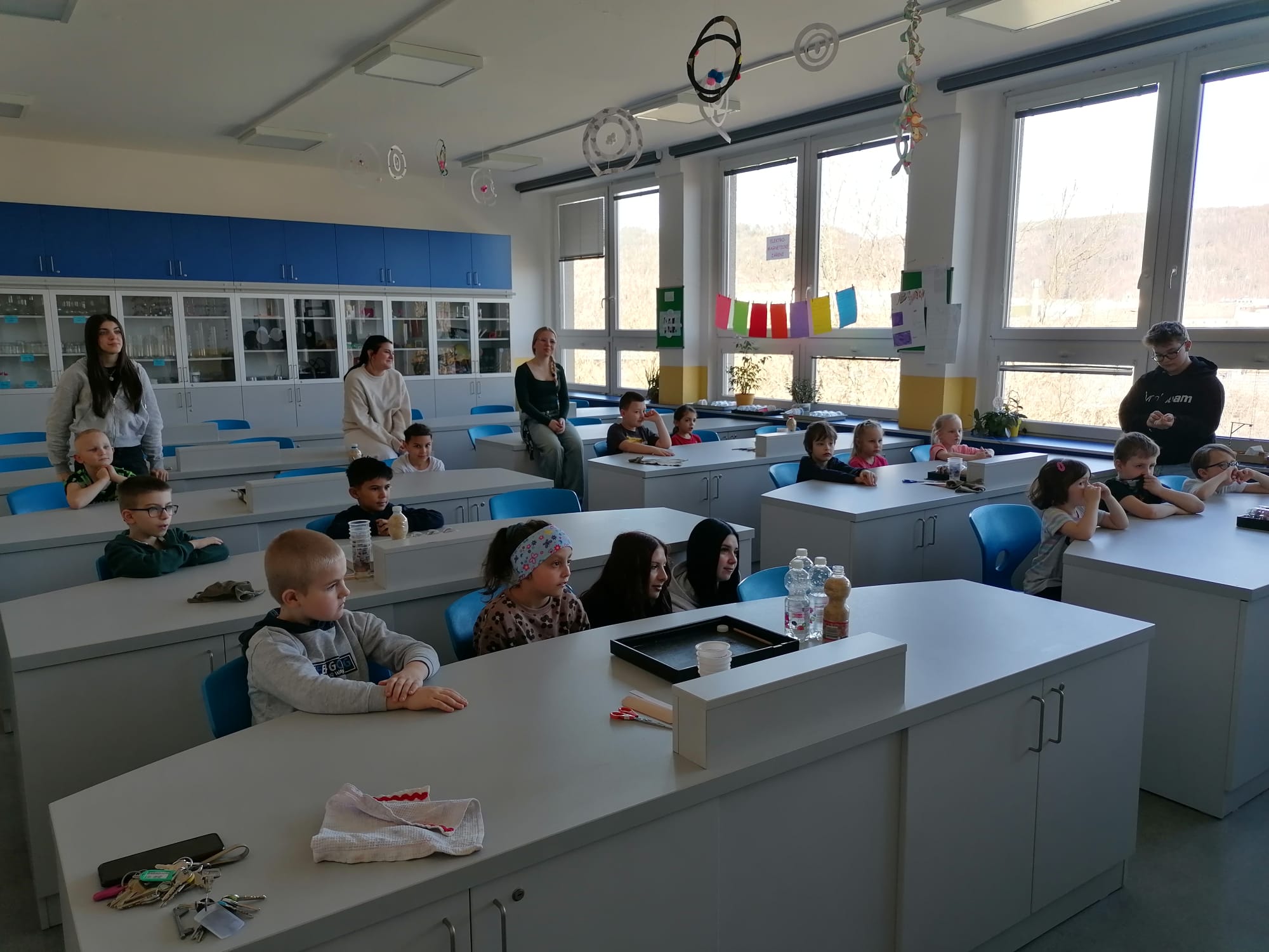 Paní učitelka Štěpánka Řežábková, která na 2. stupni učí chemii a fyziku si pro naše malé prvňáčky připravila pásmo pokusů. Jako pomocníci jí sloužili někteří naši deváťáci.