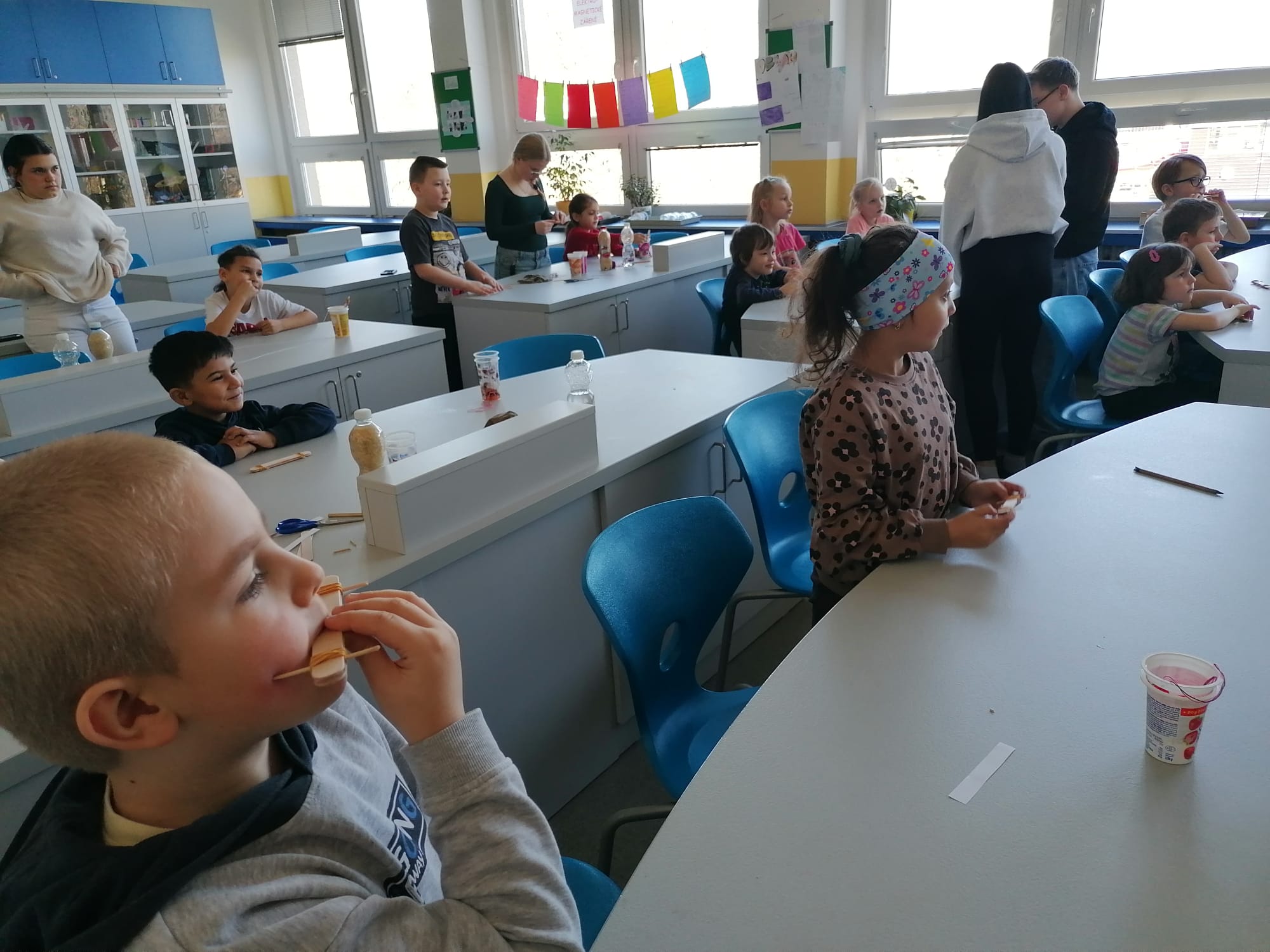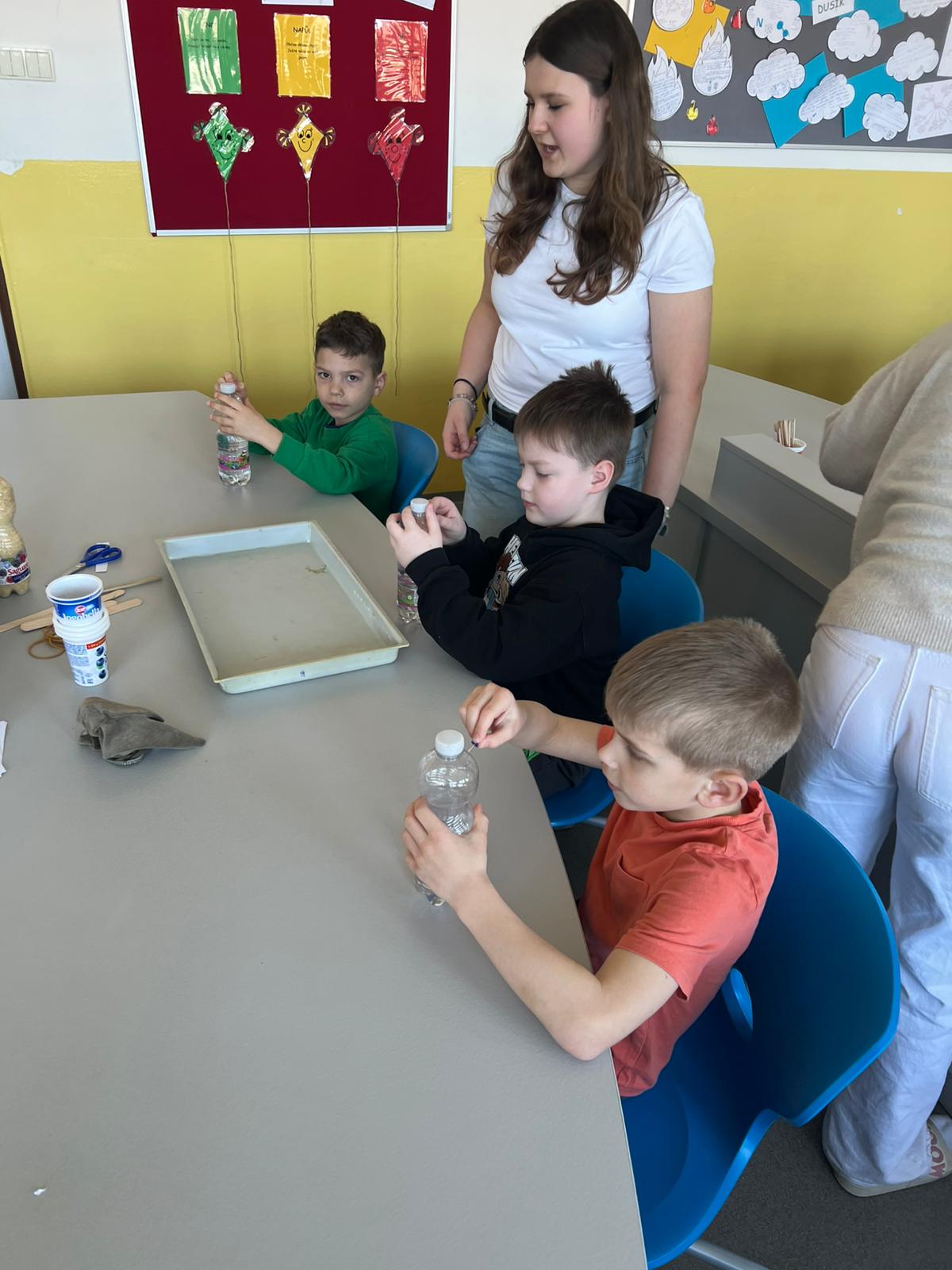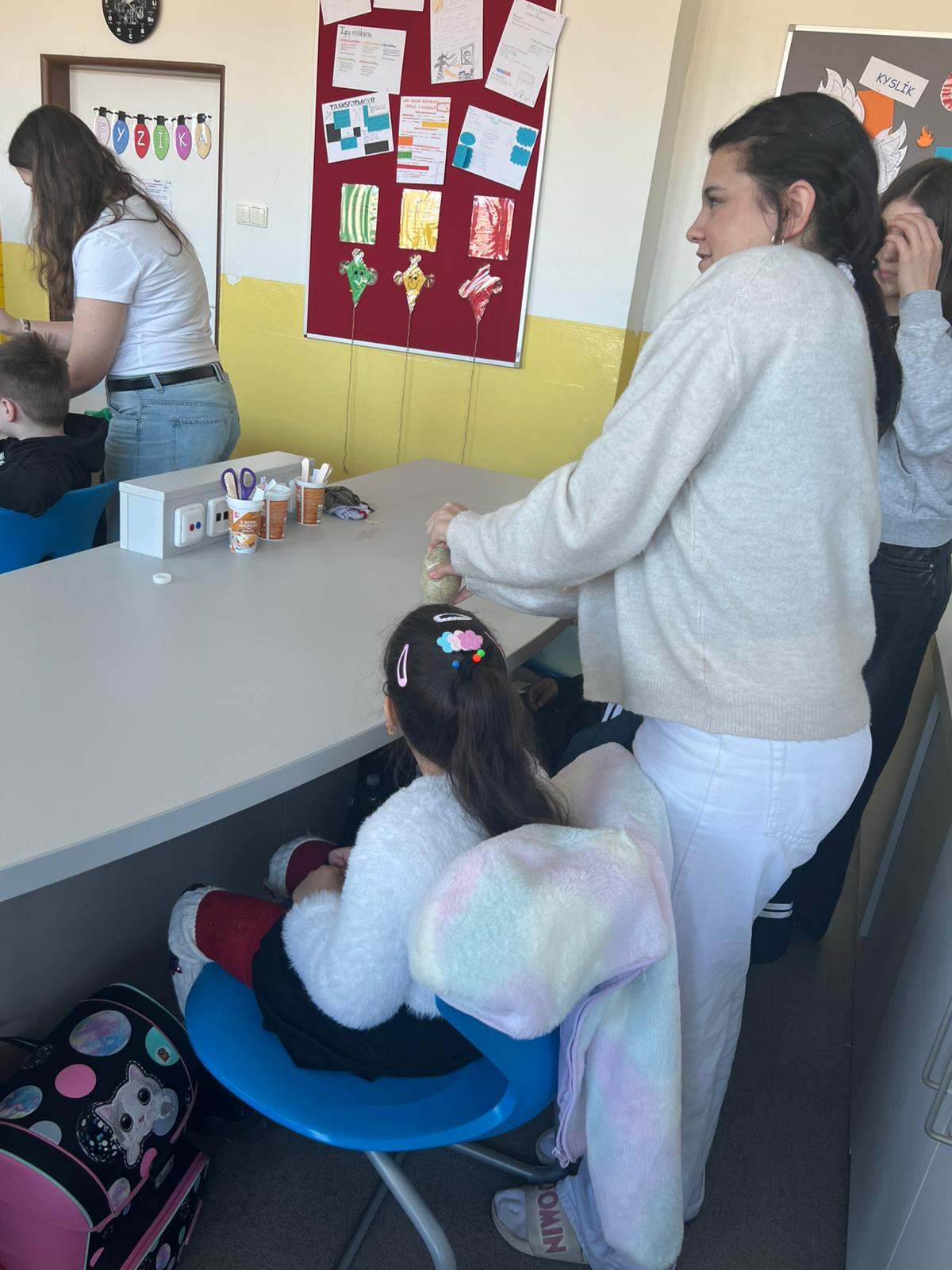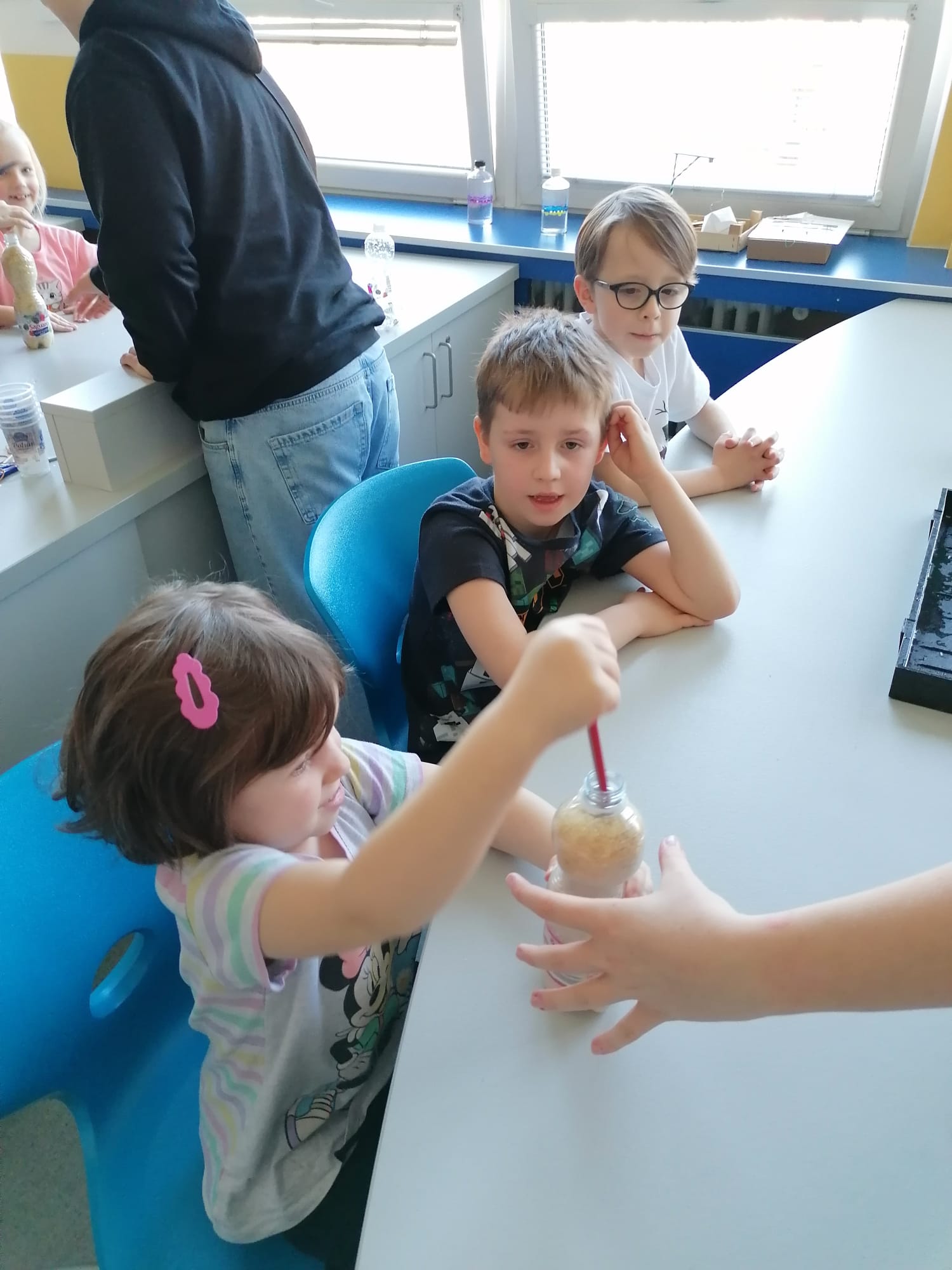 Paní učitelka Štěpánka Řežábková, která na 2. stupni učí chemii a fyziku si pro naše malé prvňáčky připravila pásmo pokusů. Jako pomocníci jí sloužili někteří naši deváťáci.
