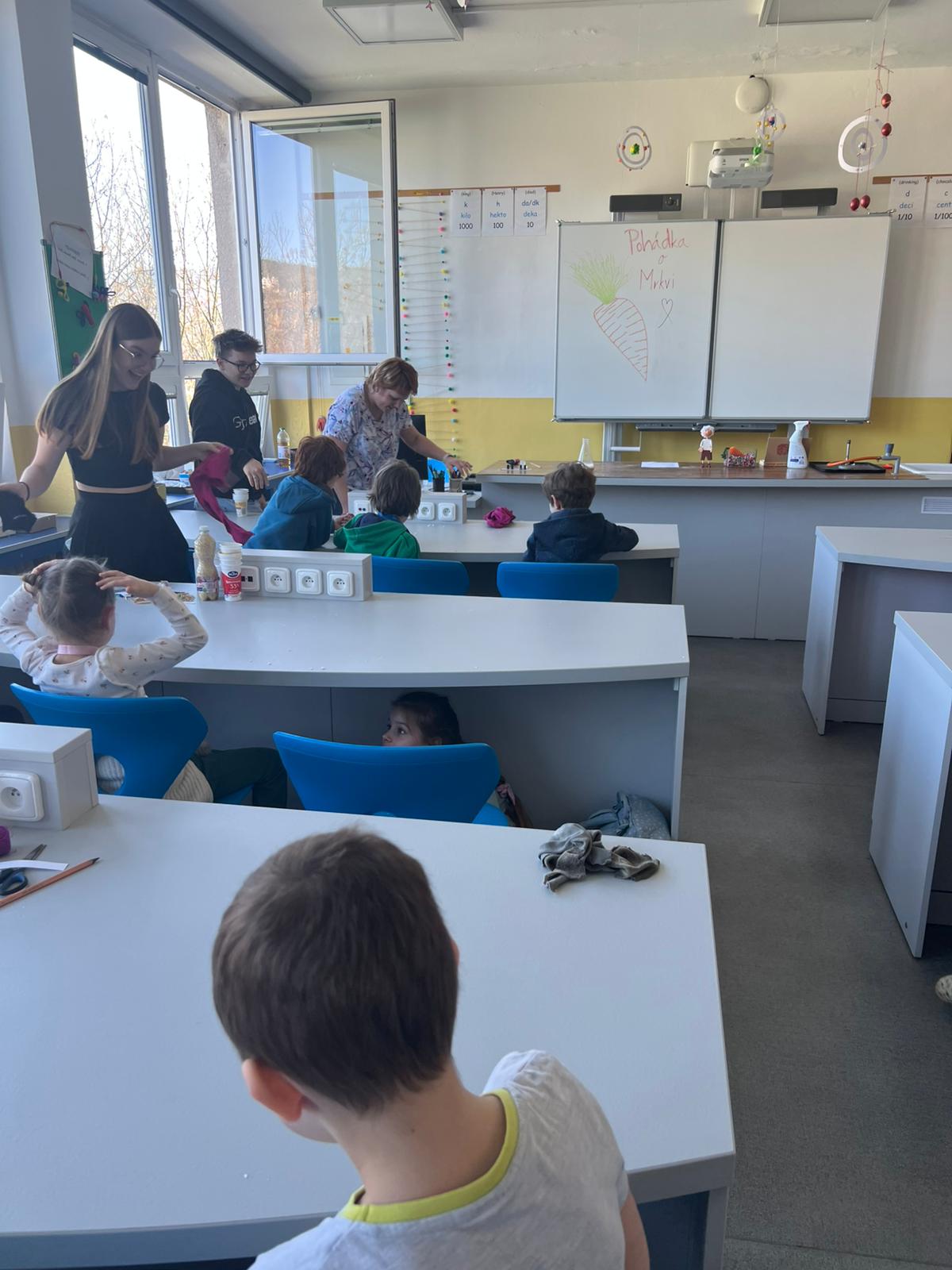 Hodinou provázela pohádka "O veliké mrkvi" v podání Míši Havla. Paní učitelka ukázala žáčkům nějaké pokusy, něco si vyzkoušely děti samy. Co je totiž pro vytažení mrkve to nejdůležitější? Jasně, že síla a tlak - to bylo tématem setkání.