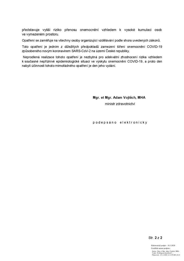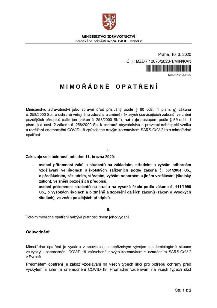 Z nařízení Ministerstva zdravotnictví ze dne 10. 3. 2020 se od 11. 03. 2020 uzavírají všechny ZŠ, SŠ, VOŠ, VŠ a to do odvolání.