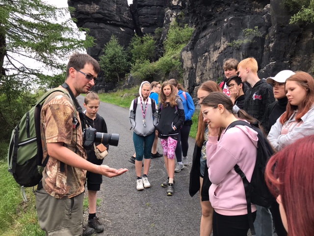V pondělí 13. června se žáci 9.A vydali na geologickou exkurzi po Děčínském Sněžníku. Společně s nimi se exkurze účastnili i další vybraní žáci z ostatních ročníků. Žáci zde byli seznámeni s původem hory a různými geomorfologickými tvary jako např. skalní převisy, skalní mísy, skalní hřib a mnoho dalšího. Po cestě byli pak upozorňováni i na biotu, kterou jsme potkávali. Z rostlin zde viděli např. 3 druhy přesliček – lesní, rolní a bahenní, hadí kořen větší, kohoutek luční atp. Z živočichů pak skokana hnědého, různé chlupaté housenky jako např. housenku přástevníka velkého, blíže neurčeného kozlíčka, larvu mravkolva, chráněného svižníka polního a mnoho dalšího. Na loukách pod Sněžníkem bylo k vidění množství pavouků – žáci viděli např. křižáka skvostného, lovčíka hajního i s kokonem anebo médii démonizovanou, ale prakticky neškodnou zápřednici. Přes větrné a chladnější počasí bylo zvířat k vidění celkem dost.