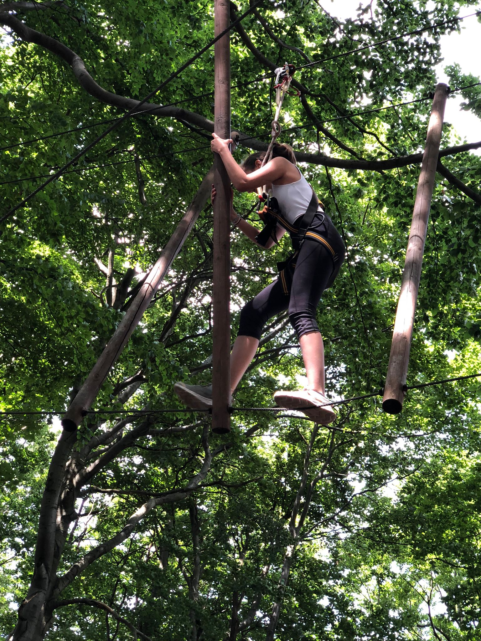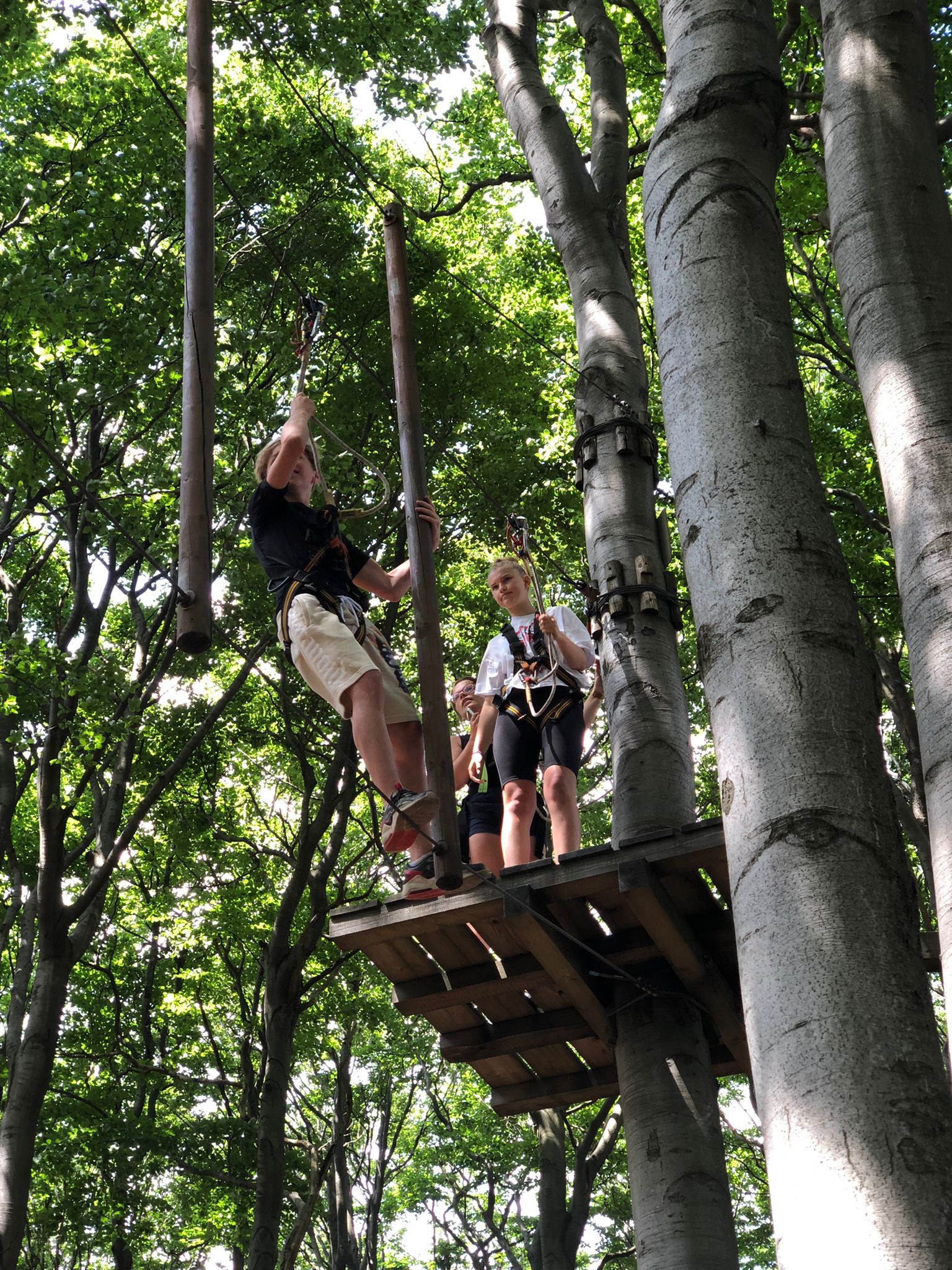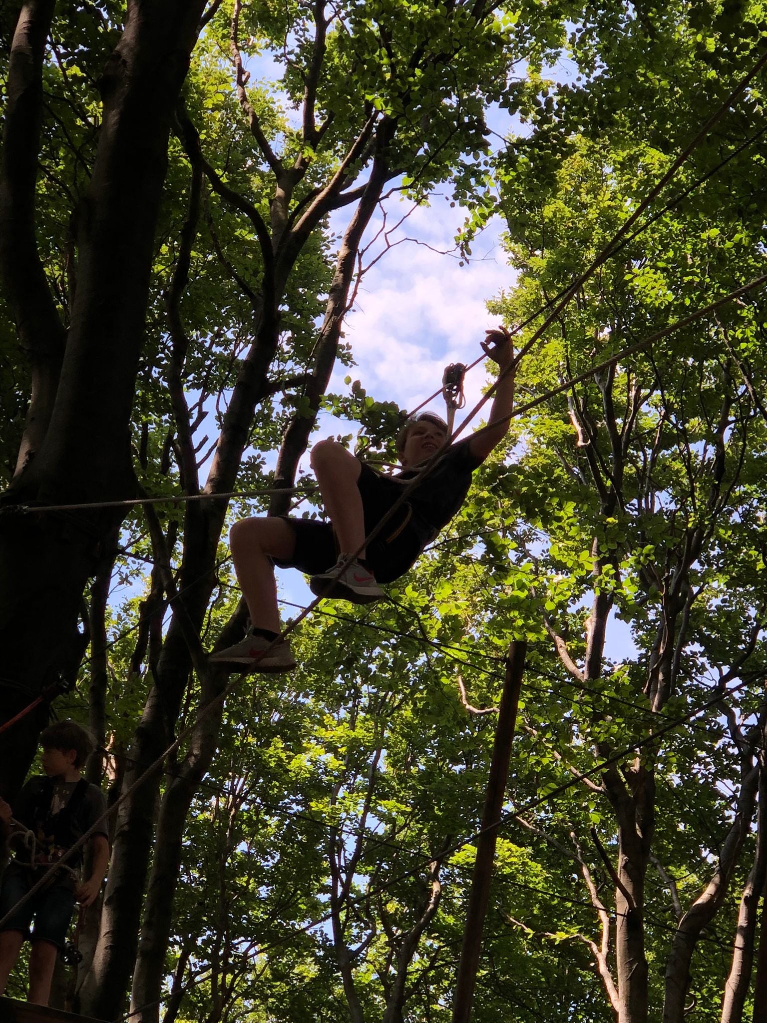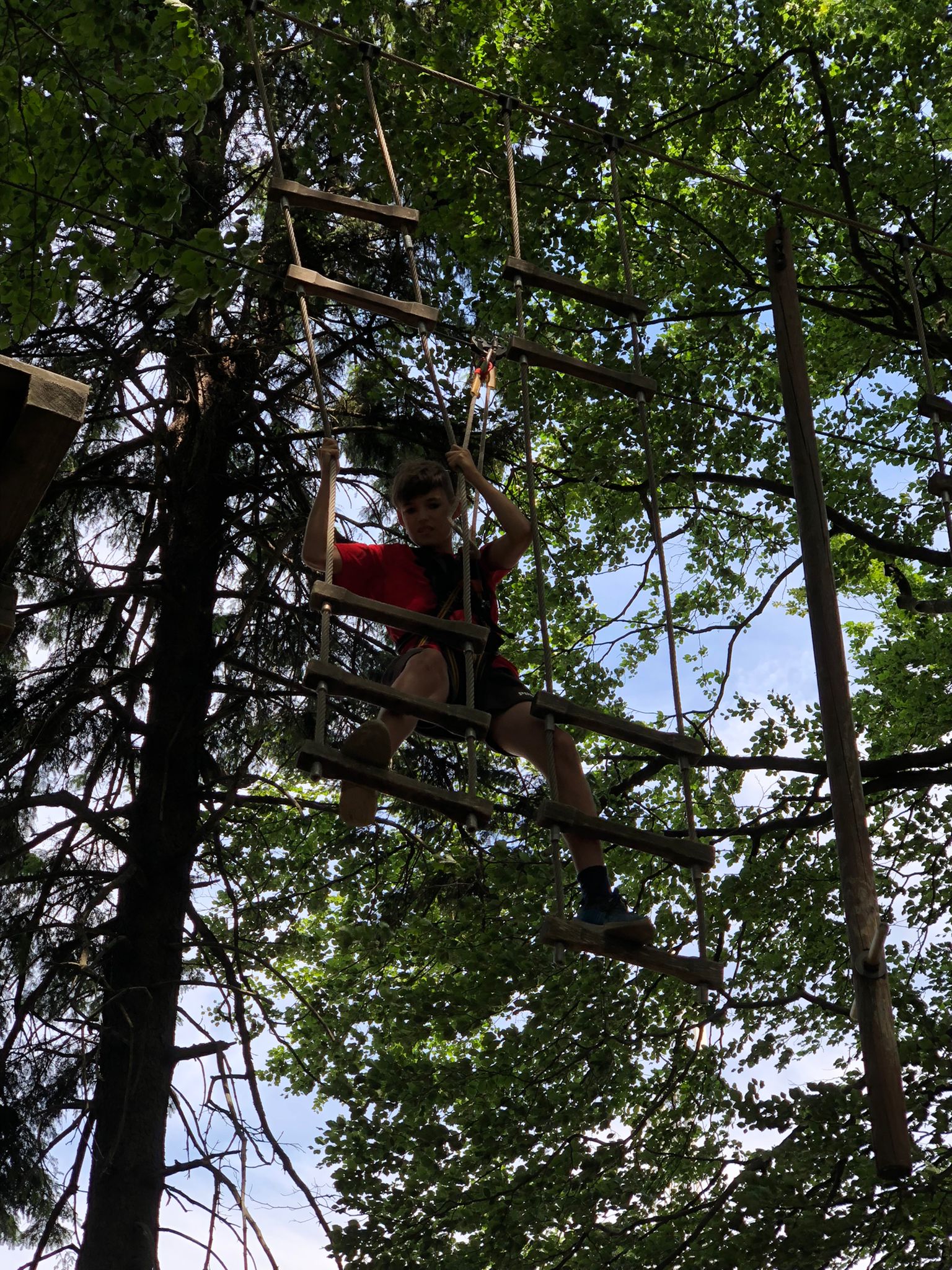 U rozhledny si 15 odvážných a paní učitelka Štěpánková vyzkoušeli lanové centrum. Nutno podotknout, že všichni, kteří se odvážili, zvládli překážky na výbornou, všichni se s tím suverénně poprali. Někteří překonali sami sebe, někteří ani netušili, co vše dokážou – jsou to bombarďáci ???? Dole pod lany měli ale také všichni podporu svých spolužáků, kteří si lanové centrum vyzkoušet nechtěli a také paní učitelky Adéeové a paní asistentky Šejcové – to se to pak leze úplně samo ????