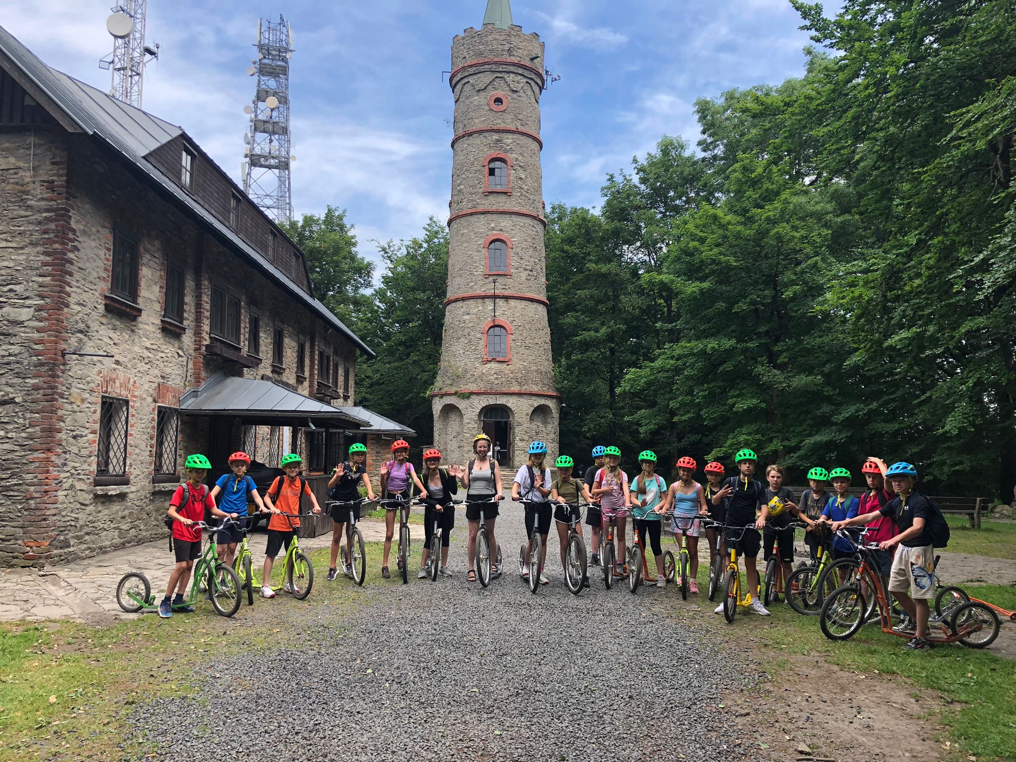 Nikdo v lanech nezůstal viset, a tak se mohla skupinka 19 žáků a 4 dospělých v čele s instruktorem sportovního areálu Jedlová vydat zpátky k vlaku. Tentokrát však ne pěšky, ale na koloběžkách. Respekt k dopravnímu prostředku a terénu byl veliký, věděli jsme, že si před prázdninami rozhodně nechceme nijak ublížit a začít léto zasádrovaní. Jeli jsme opravdu opatrně, jeden pád se nám bohužel nevyhnul, ale ve třídě máme samé tvrdé borce, takže i když odřený, zvládli jsme na nádraží dojet všichni.
