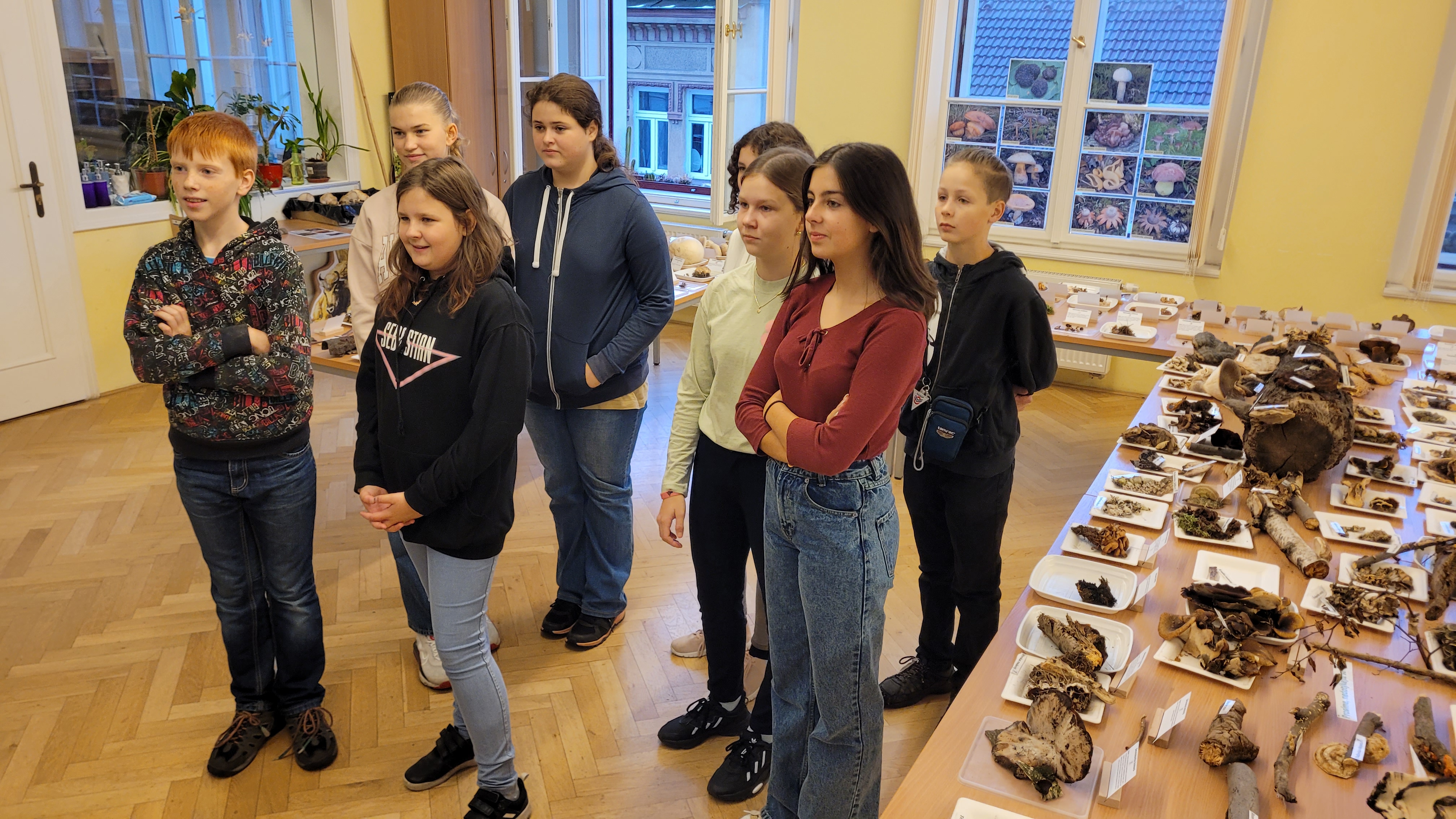V úvodu si žáci nejprve prošli výstavou samostatně, následně pak proběhla komentovaná část od zaměstnankyně muzea. Výčet druhů byl obsáhlý, žáci měli možnost vidět vedle sebe jak běžné učebnicové druhy, tak i druhy, o kterých by ani neřekli, že patří mezi houby.