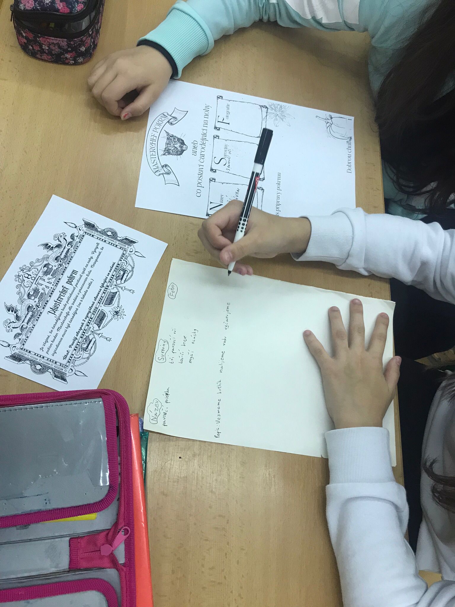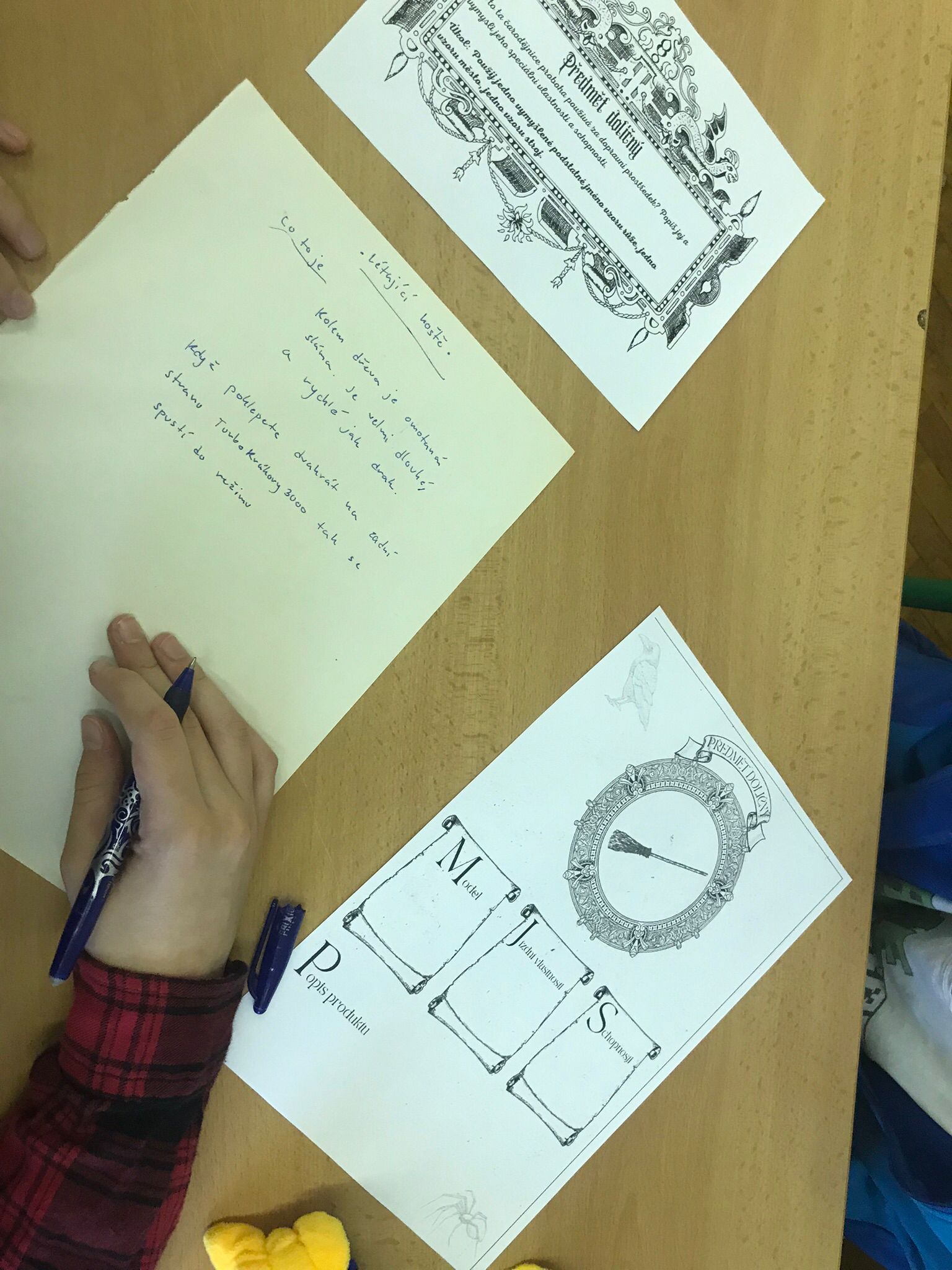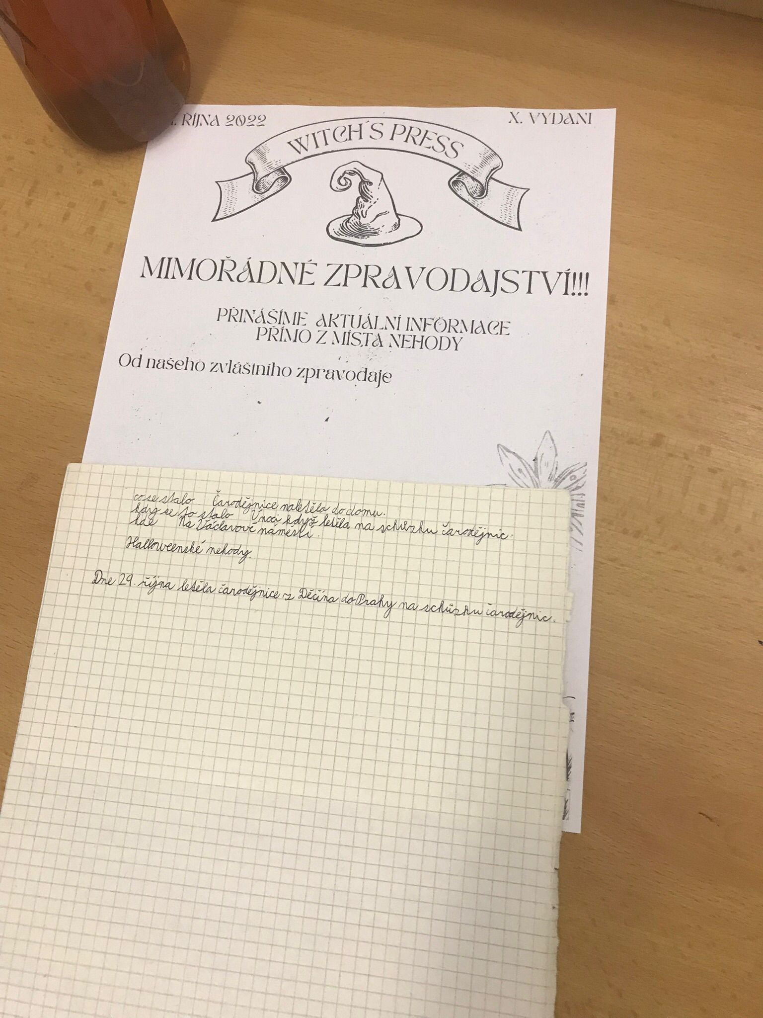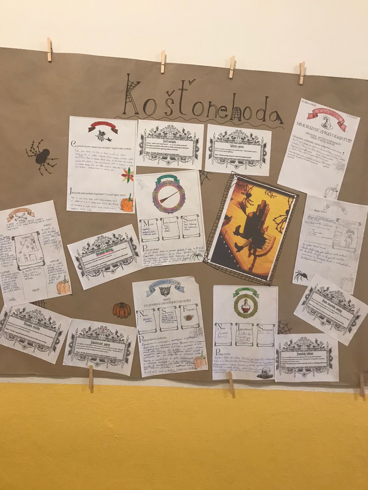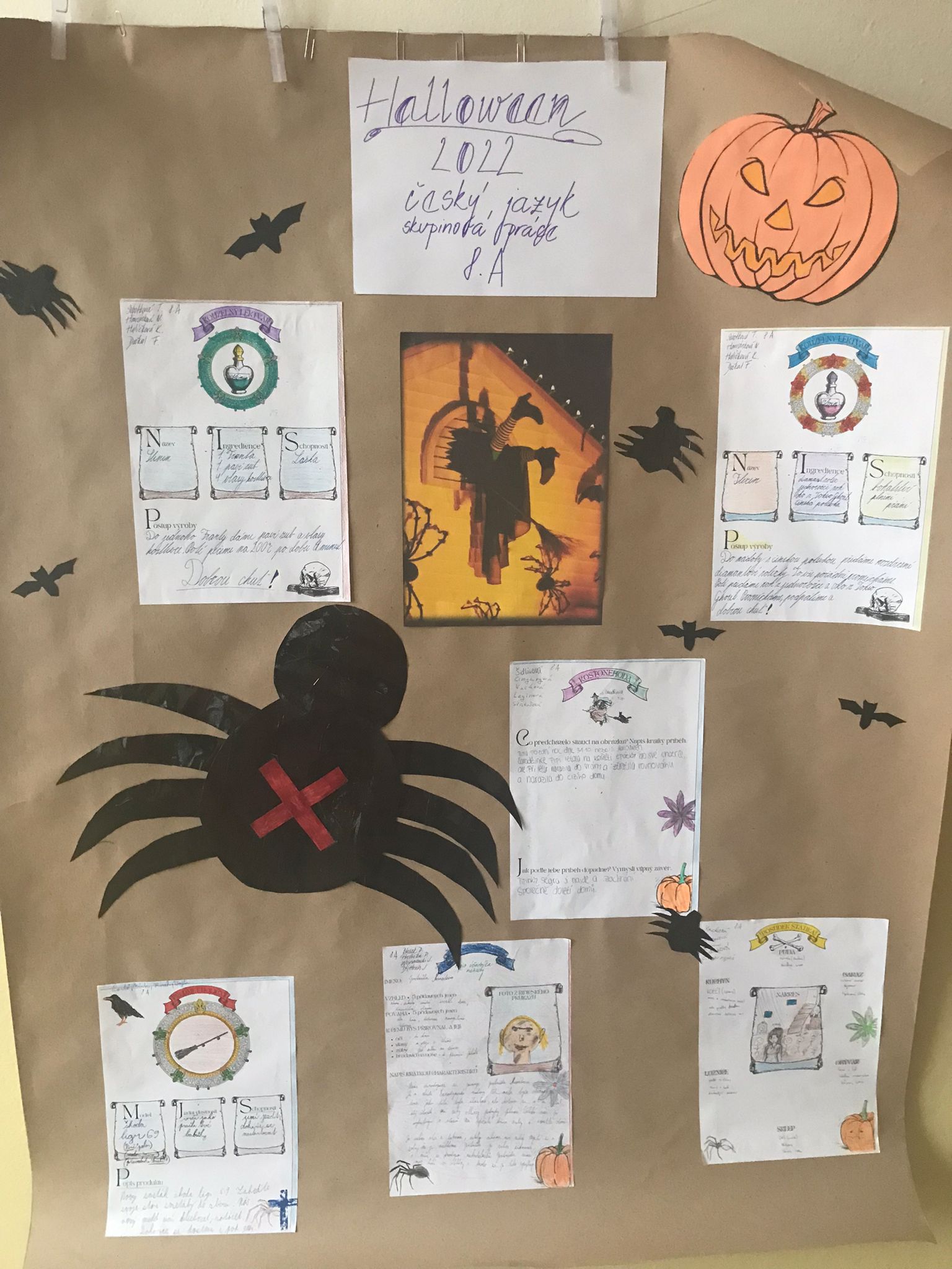 Co se asi tak mohlo přihodit čarodějnici, která o halloweenské noci nabourala na svém koštěti do zdi? Touto otázkou se zabývali žáci šestých, sedmých a osmého ročníku. Ve skupinách tvořili celistvý projekt, ve kterém měli událost zachycenou na fotografii blíže specifikovat. Jedni měli vymyslet příběh, který se mohl stát a jeho možný konec. Jiní měli čarodějnici charakterizovat, další popsat lektvar, který mohla před svou cestou požít, někteří zase pokrm, který by ji mohl postavit na nohy. Slohové úlohy měly také svůj specifický úkol mluvnický – použít vyjmenovaná slova, vhodná přídavná jména apod. Věříme, že netradiční aktivity žáky oslovily a že se podobným projektům budeme moci v budoucnosti věnovat častěji. Práce jsou k vidění na chodbách školy.