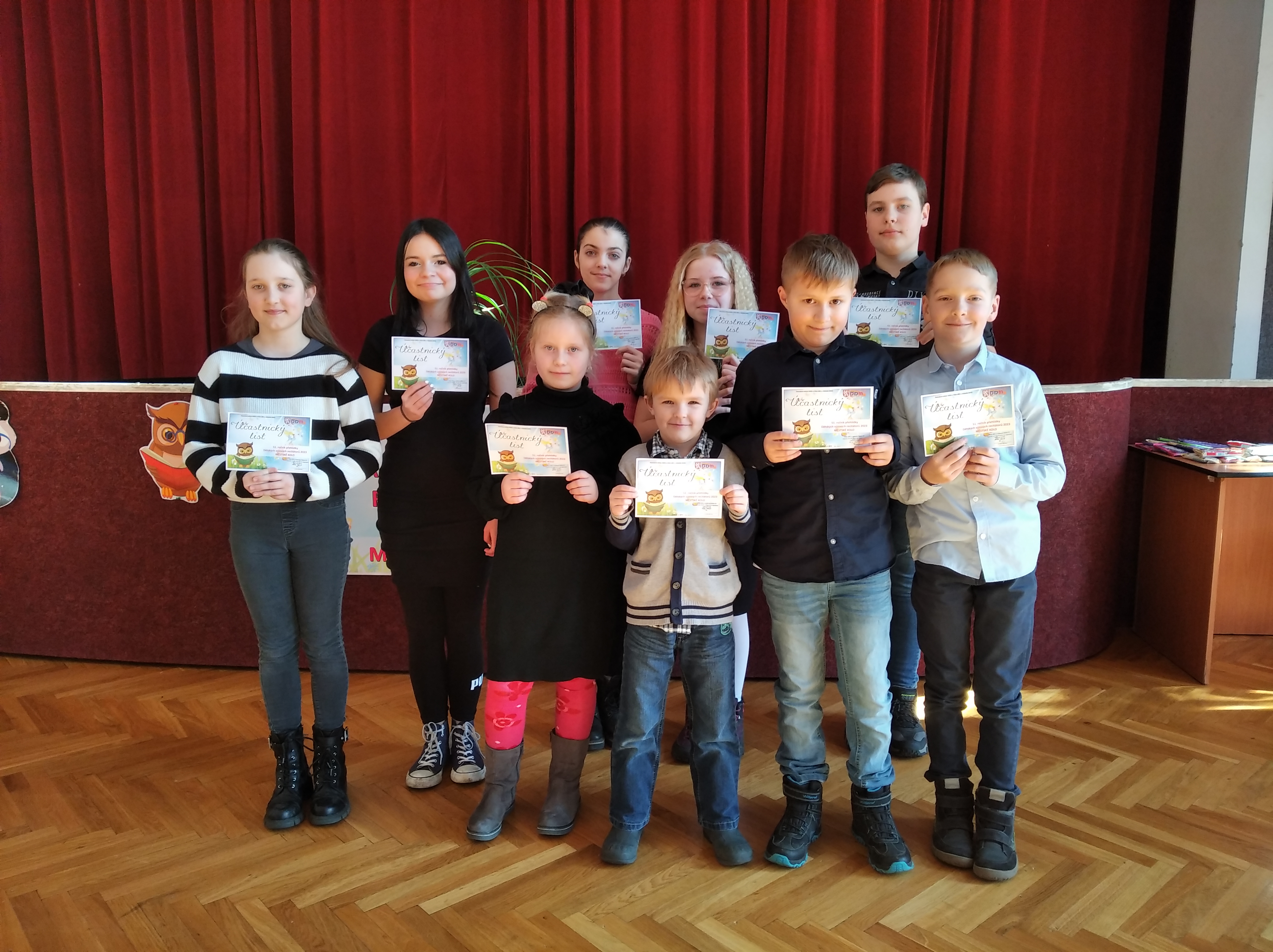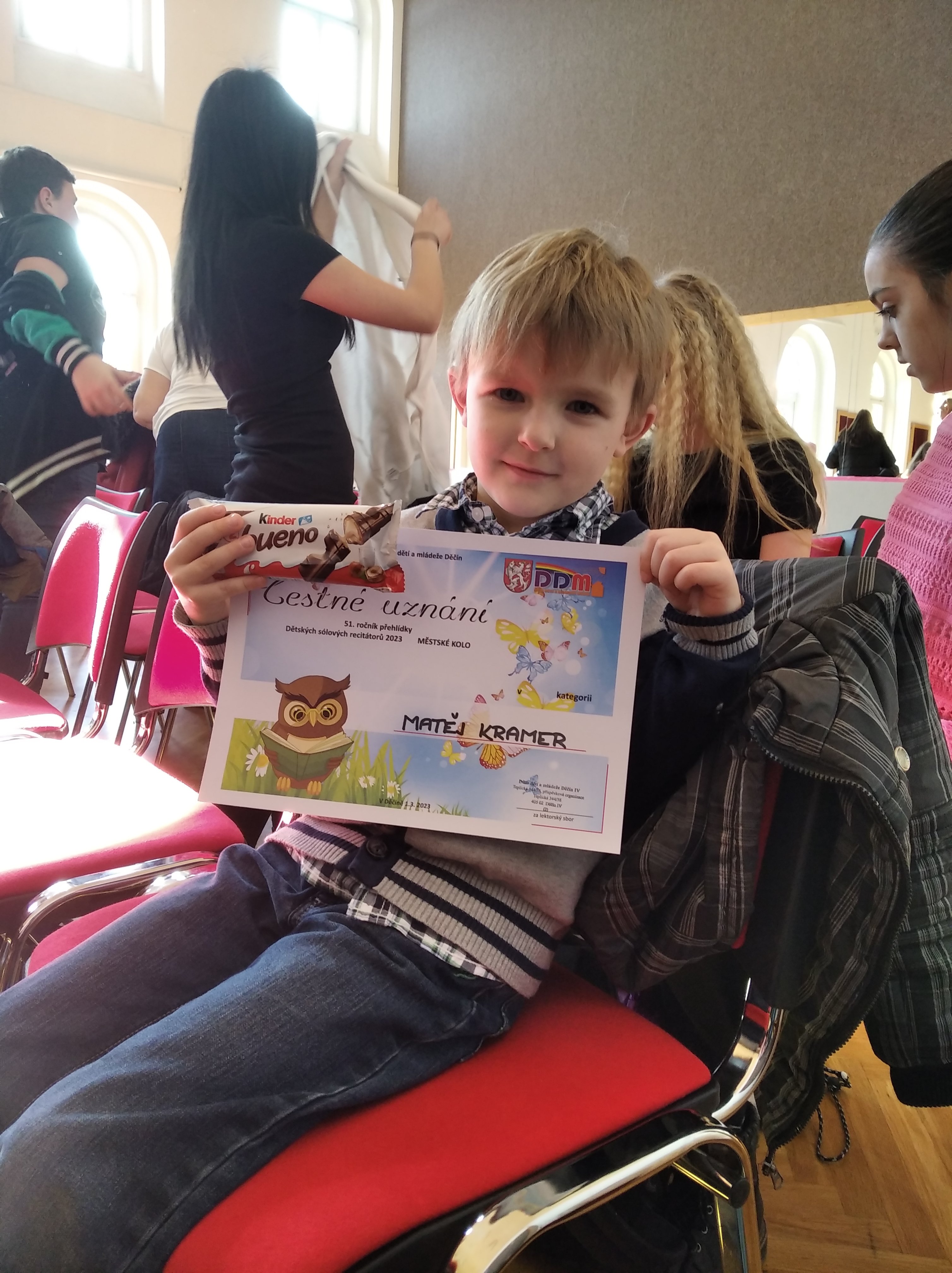 Dne 1. března se v prostorách velkého sálu v DDM na Teplické ulici v Děčíně konalo Městské kolo Recitační soutěže. Do tohoto kola postoupilo celkem 9 našich žáků, kteří se úspěšně probojovali sítem školního kola. Každý z postupujících musel mít na Městské kolo připravené 2 básničky. S výběrem básniček pomáhali žákům vyučující českého jazyka.