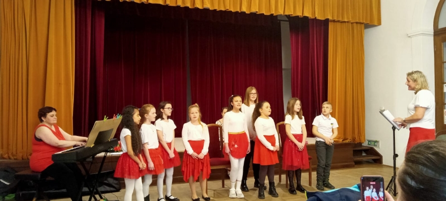 Na Zámku v Jílovém děti zazpívaly celkem 6 písniček. Nutno podotknout, že to bylo jejich první velké veřejné vystoupení mimo budovu naší školy. I přes nemalé oslabení (zpěvaček a zpěváků bylo nakonec z důvodu vysoké