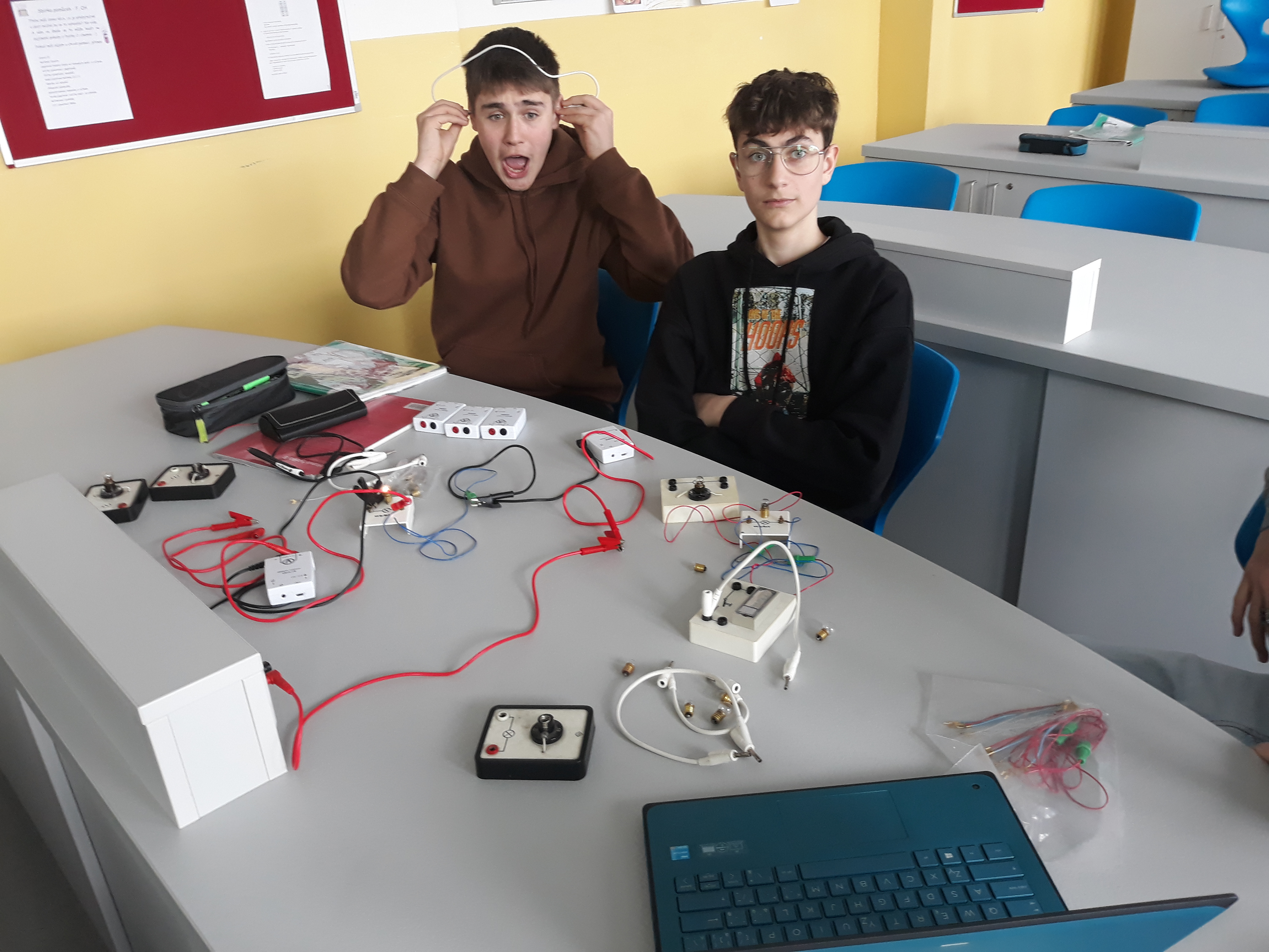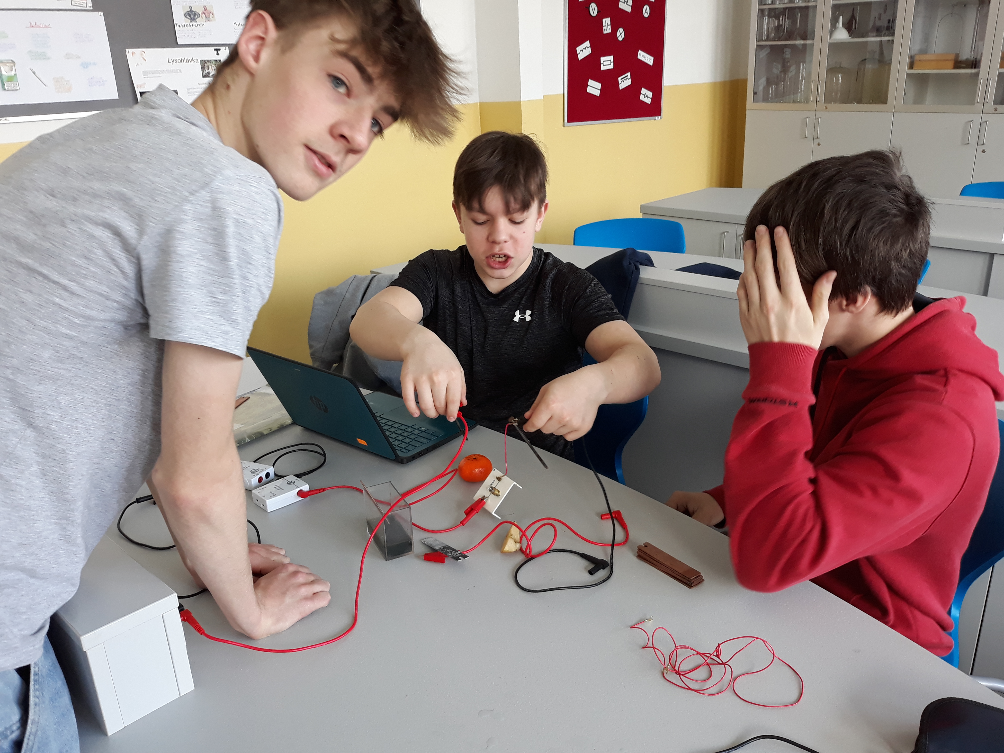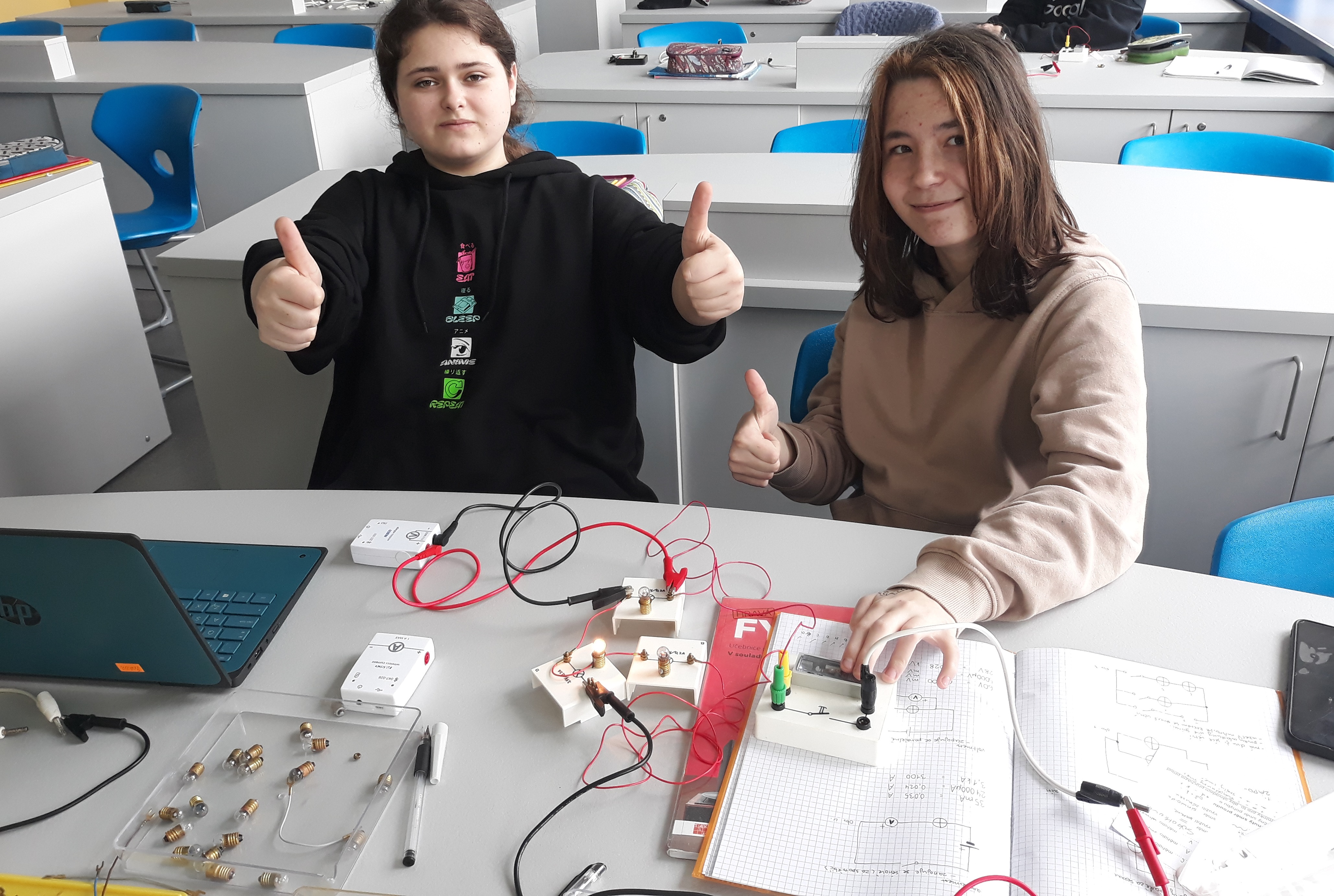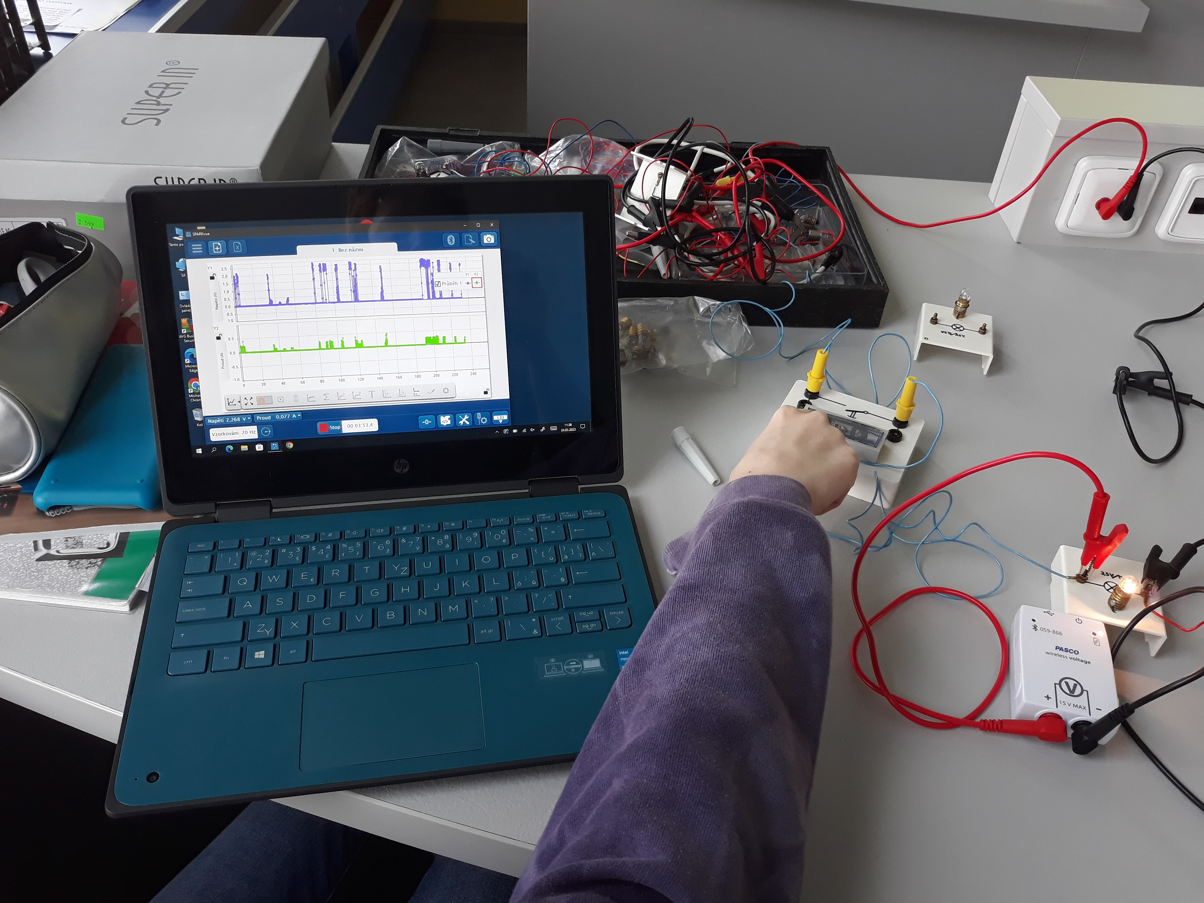 Navíc máme učebnu fyziky parádně vybavenou bezdrátovými čidly na měření elektrického proudu a napětí od firmy Pasco a k tomu notebooky s patřičným softwarem. Takže pracovat s nimi je jedna velká radost. 😊 Můžeme si krásně ukázat různé druhy zapojení a vyzkoušet je jak v počítačových simulacích na internetu, tak i v reálu.