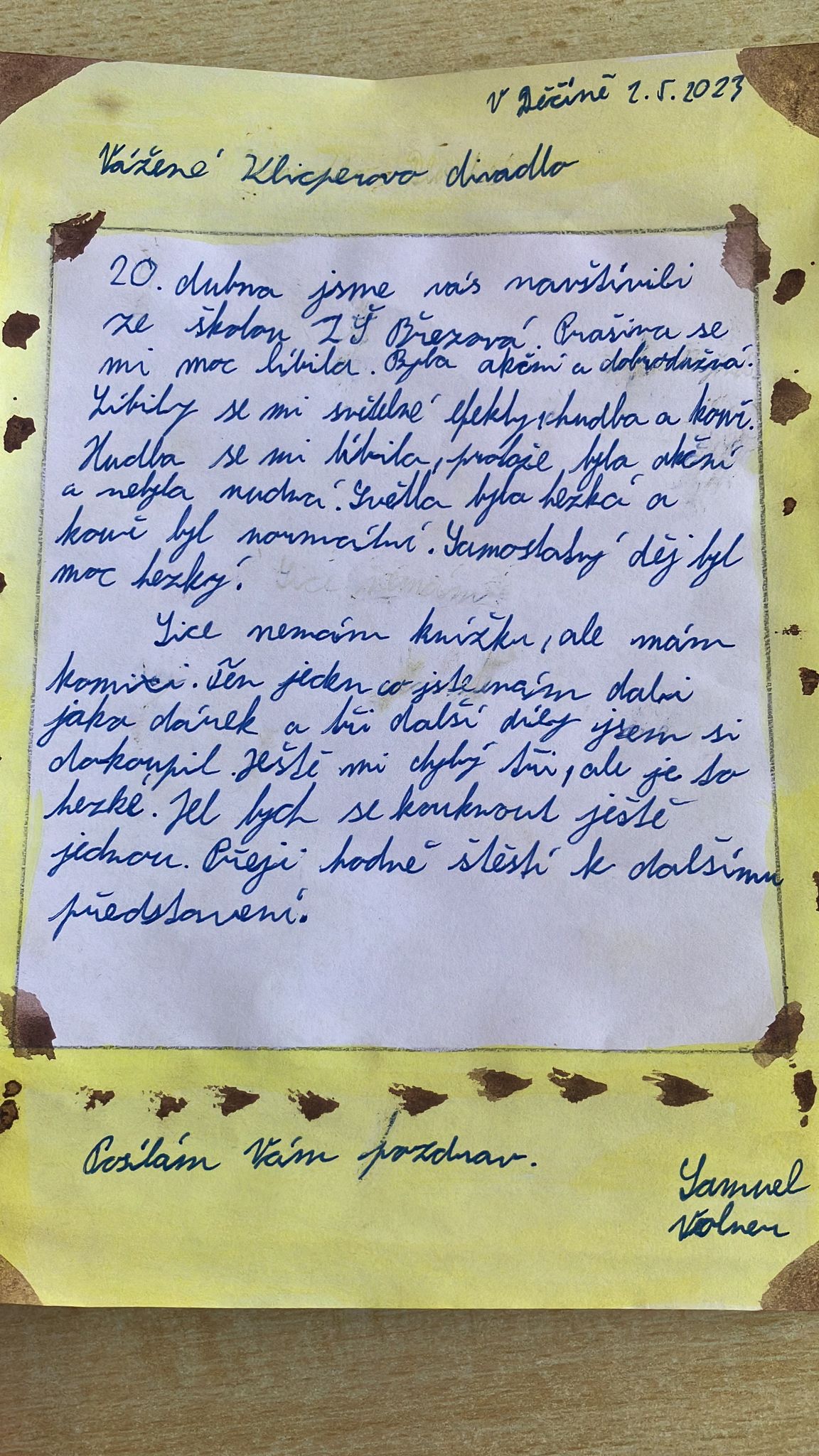 Pomyslnou tečkou na dortu pak byly dopisy žáků 6. tříd, které byly adresovány přímo hercům do divadla v Hradci Králové a které se jim také odeslaly. ![]()