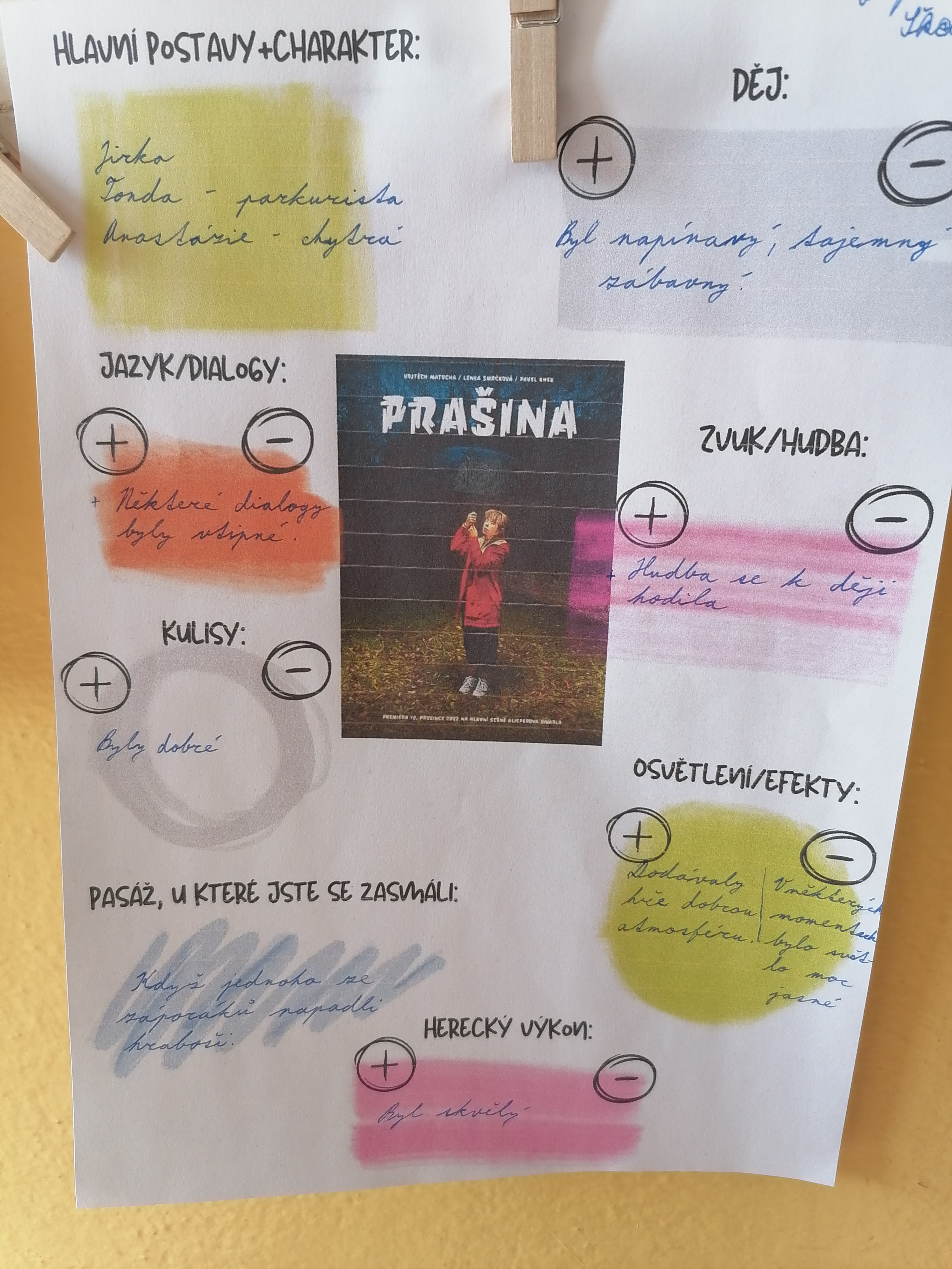Pro žáky jsme připravily pracovní listy, při jejichž vyplňování se měli vžít do role kritiků a vytvořit recenzi k divadelnímu představení. Jak hodnotili žáci herecké výkony? Jak se jim líbila scéna, zvukové a světelné efekty? Odvedl kostymér dobrou práci? Co naopak podle nich představení ublížilo? Musíme říct, že odpovědi dětí měly opravdu „hlavu a patu“ a bylo vidět, že nad svými odpověďmi přemýšlí, že tam nechtějí napsat „jen tak něco“.