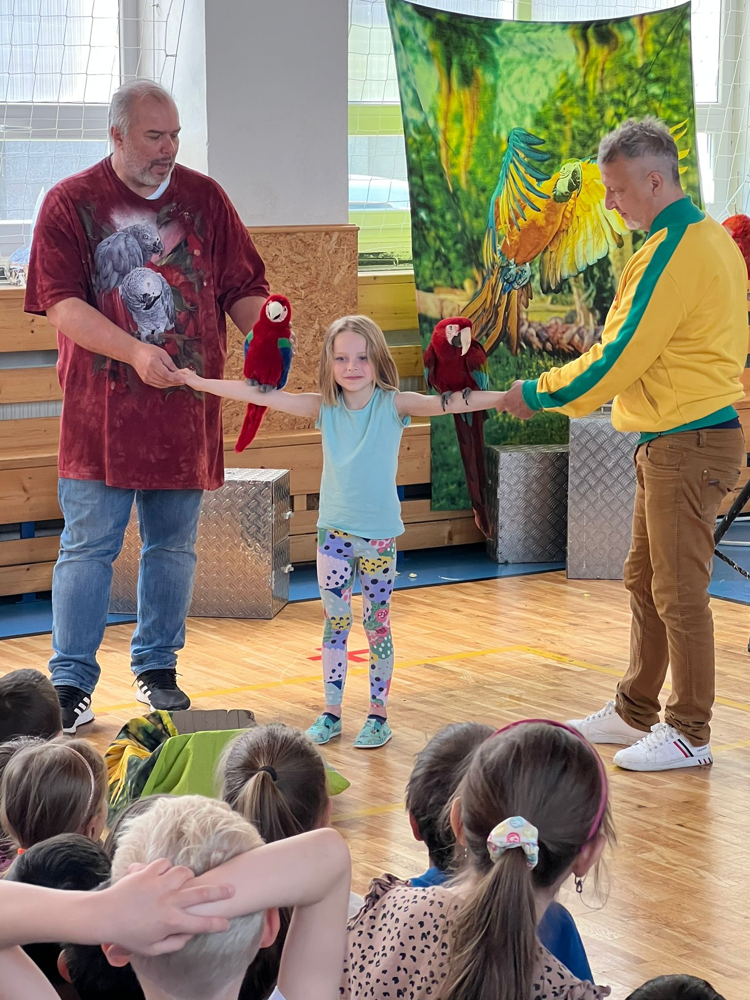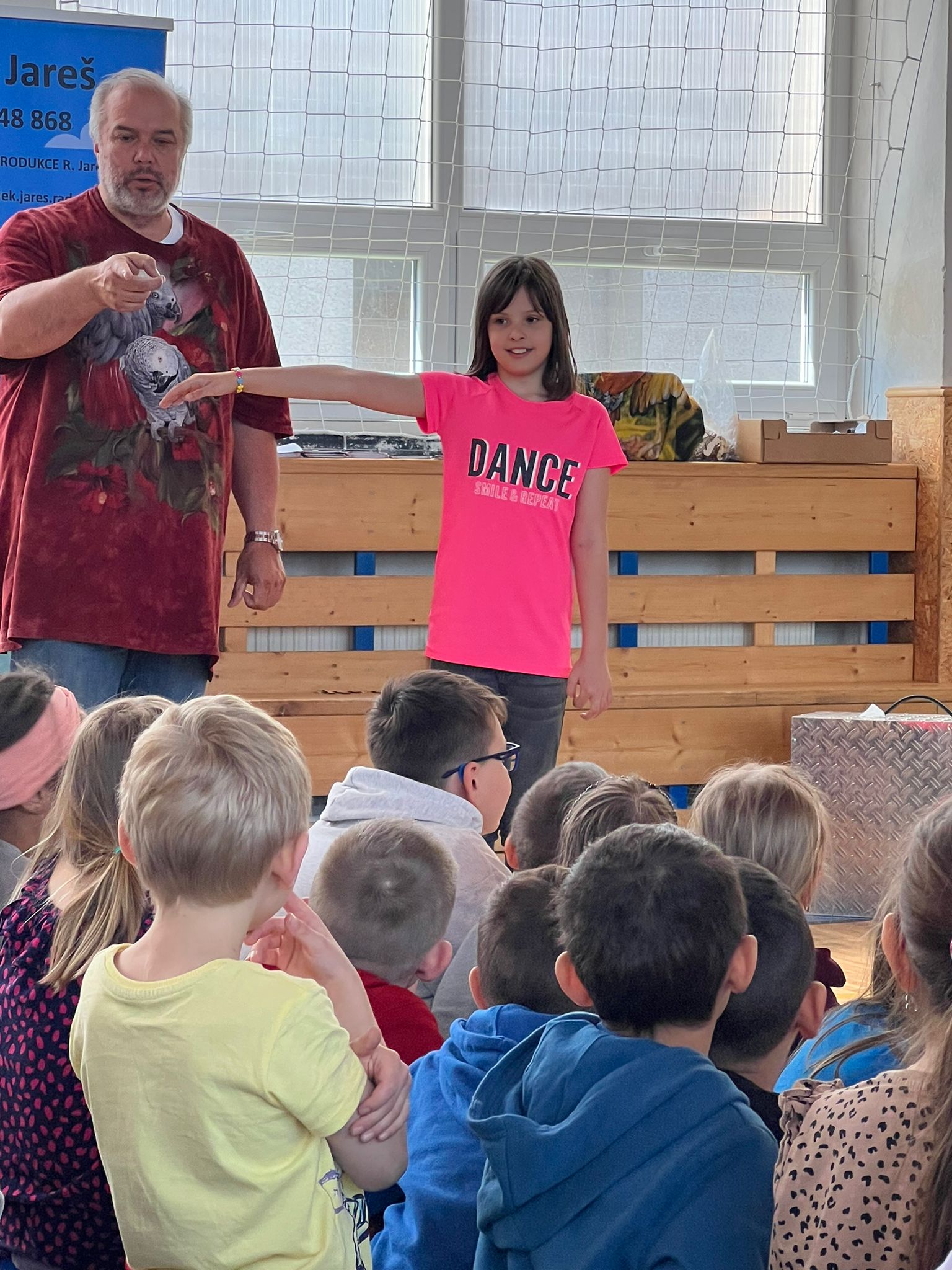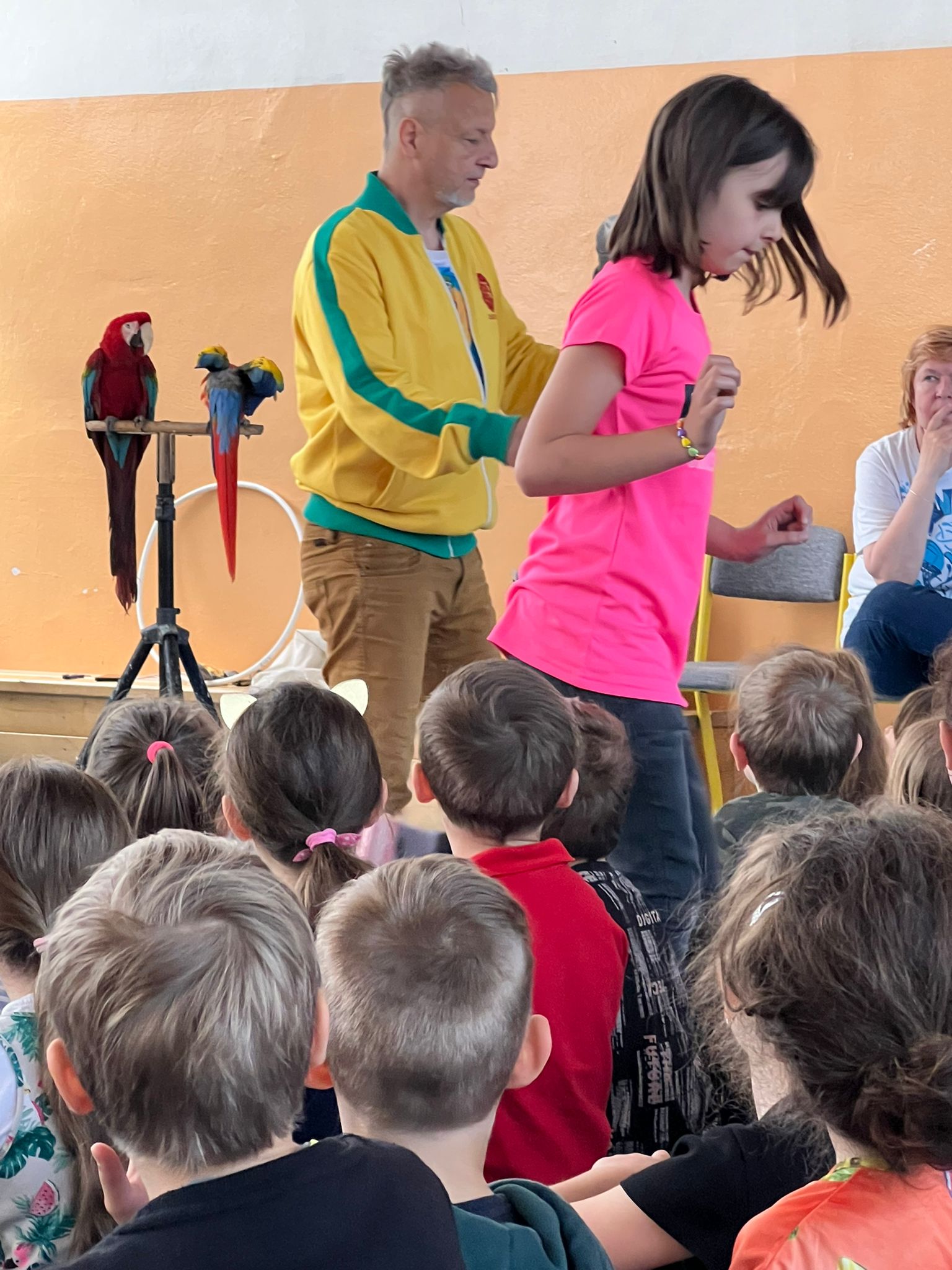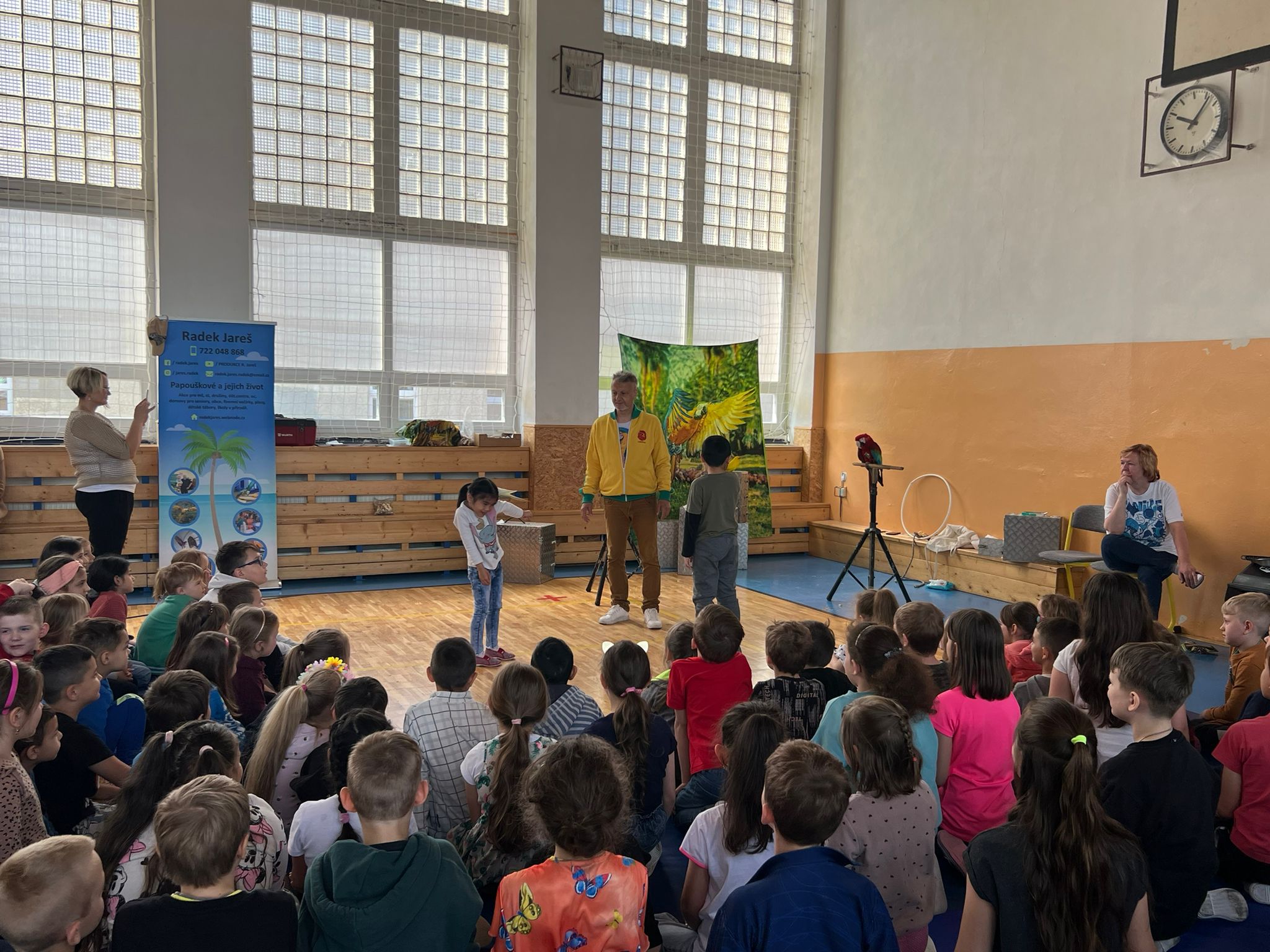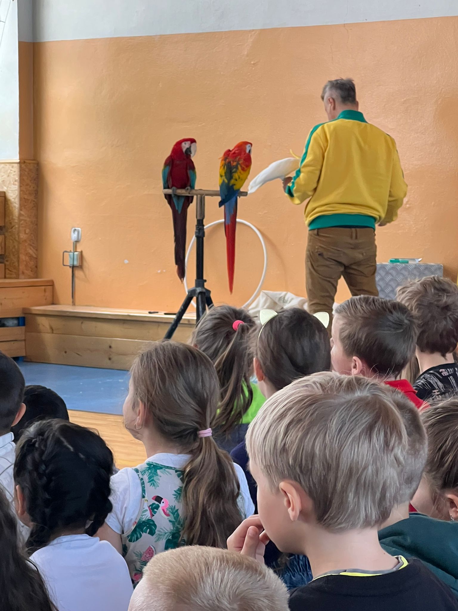 V pátek 19. května 2023 se v naší škole, pro žáky a žakyně 1. stupně, uskutečnilo představení "Papoušci z celého světa". Celým programem děti provázel pan Radek Jareš a se svým kolegou. Dětem přivezli na ukázku celkem 14 papoušků. Papoušci dětem předvedli létání, válení sudů, houpačku, šplh, namlouvání, hádku a spoustu dalších kousků. Těšíme se zase někdy příště 🖐