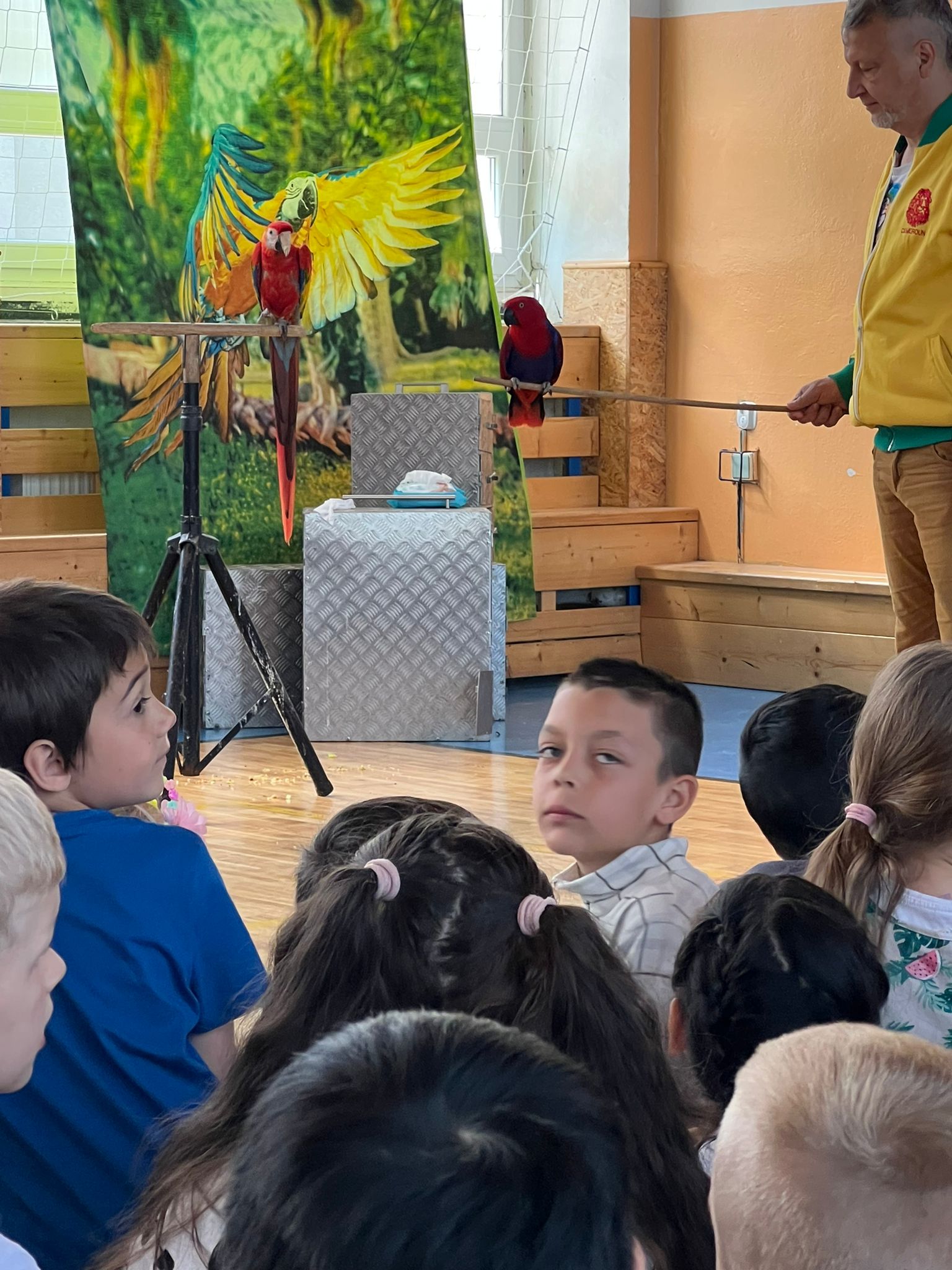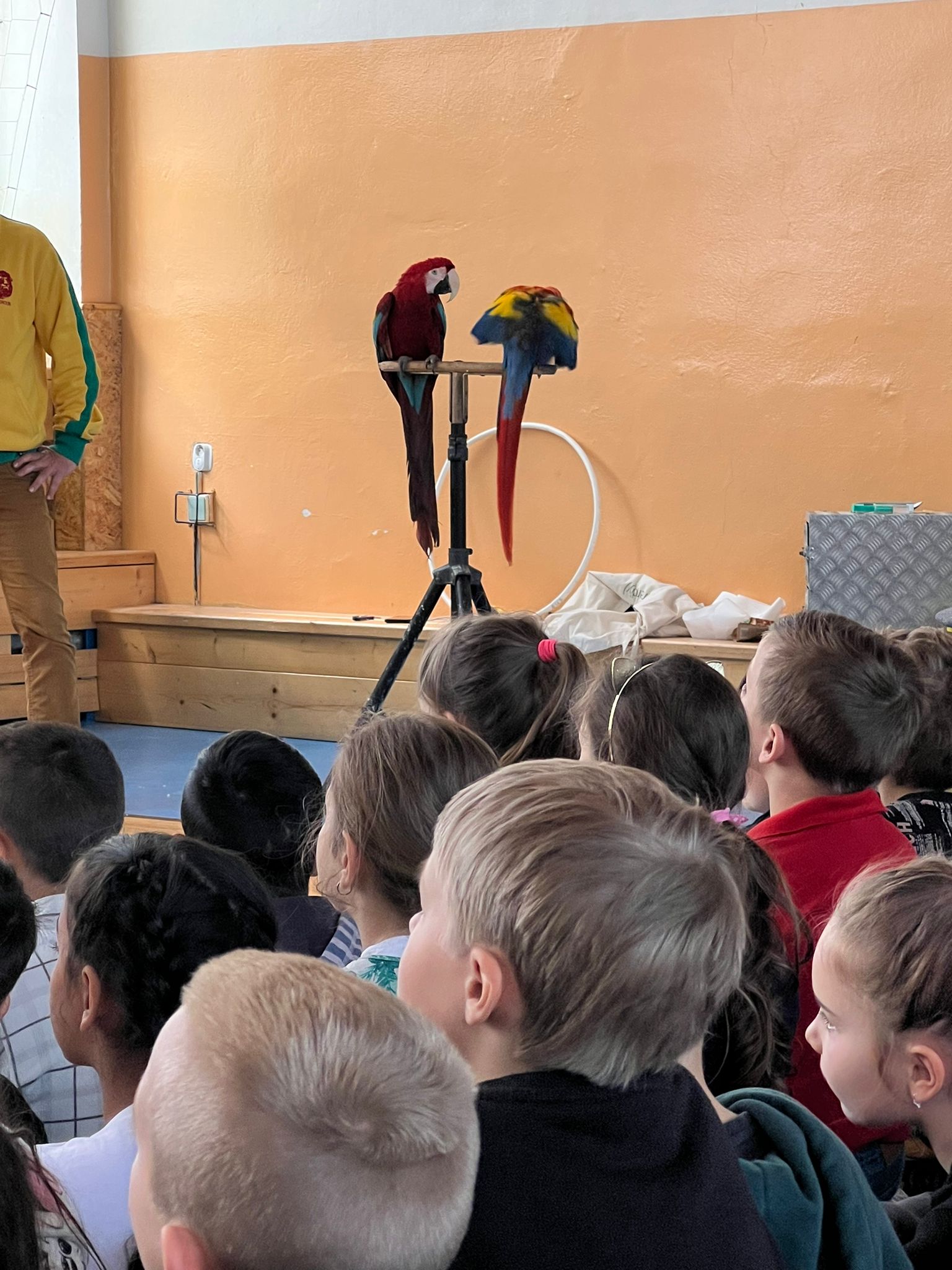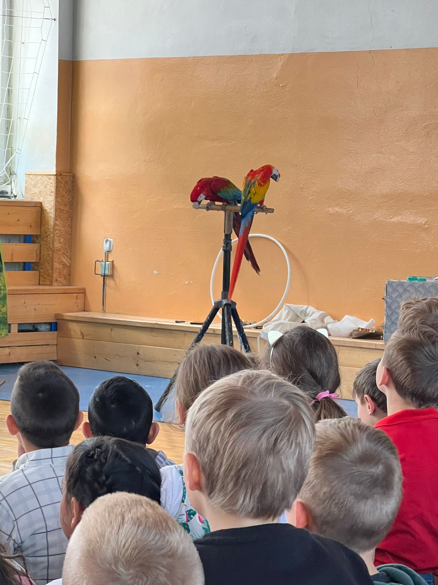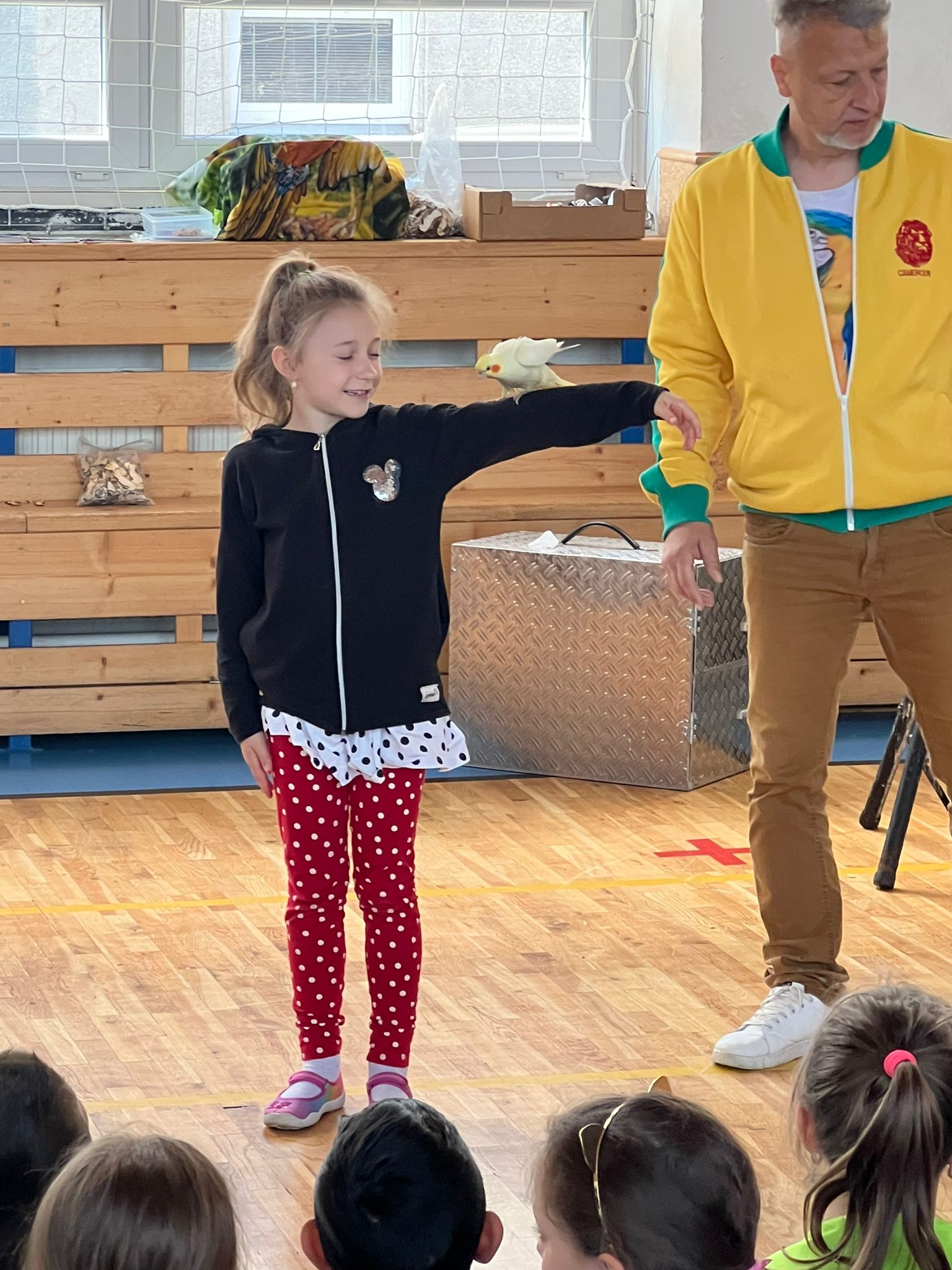 V pátek 19. května 2023 se v naší škole, pro žáky a žakyně 1. stupně, uskutečnilo představení "Papoušci z celého světa". Celým programem děti provázel pan Radek Jareš a se svým kolegou. Dětem přivezli na ukázku celkem 14 papoušků. Papoušci dětem předvedli létání, válení sudů, houpačku, šplh, namlouvání, hádku a spoustu dalších kousků. Těšíme se zase někdy příště 🖐