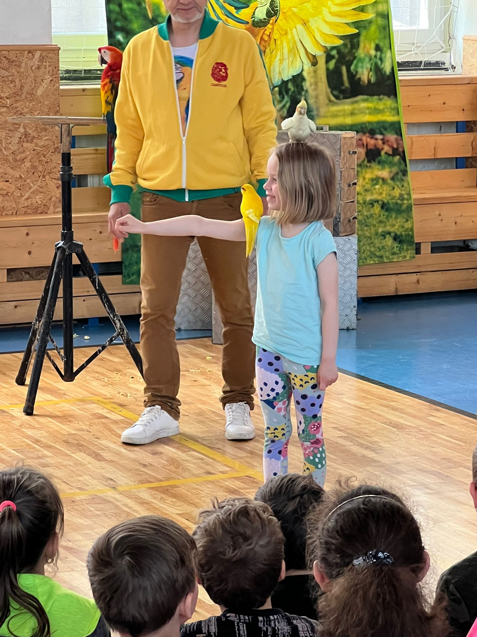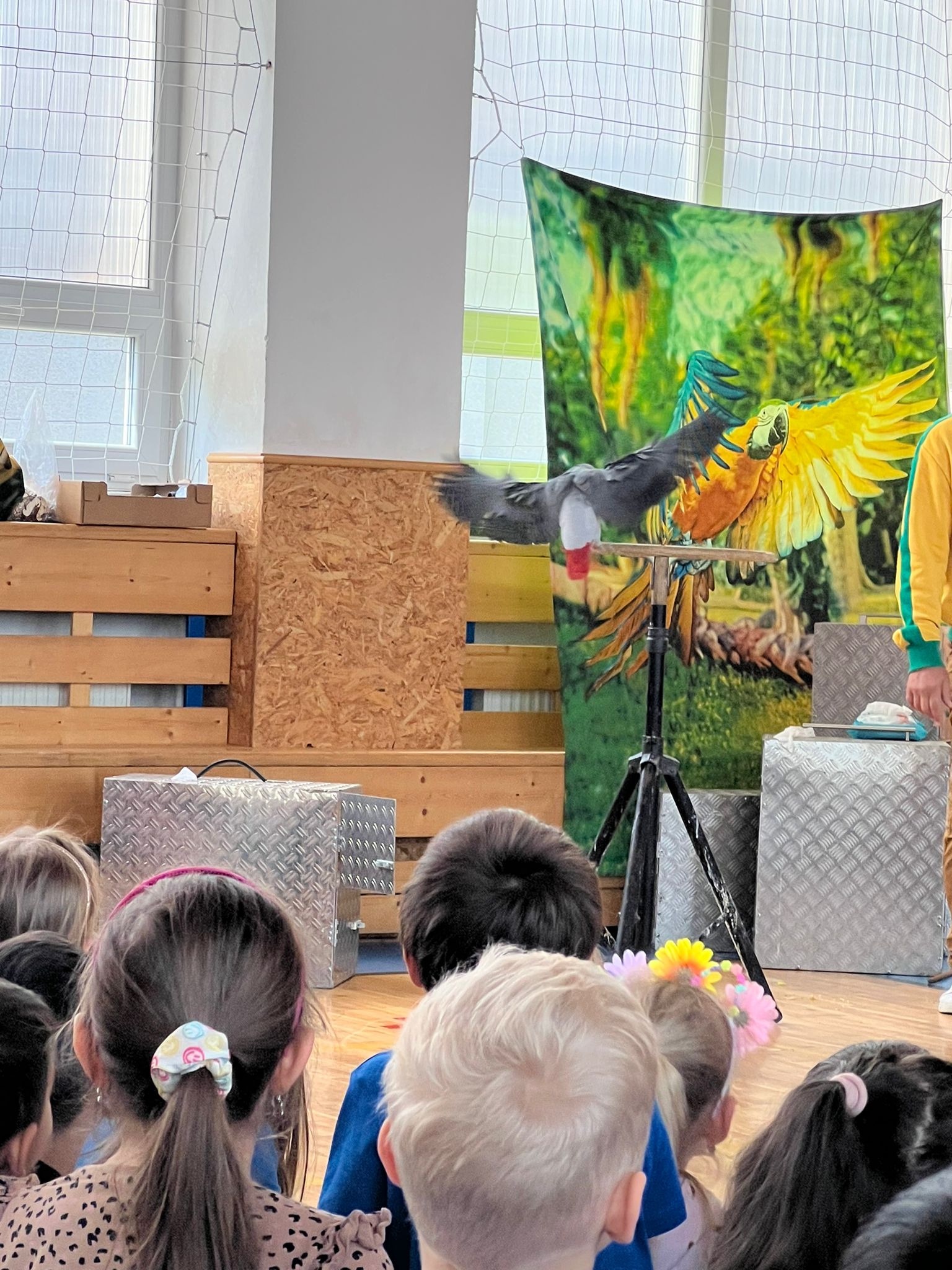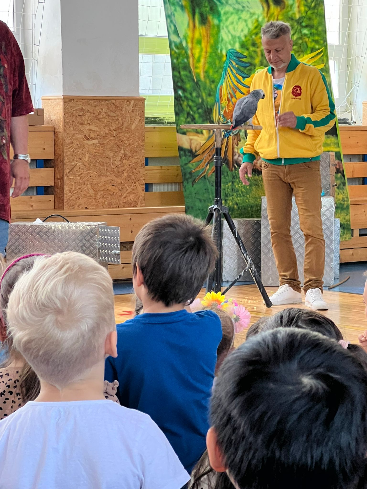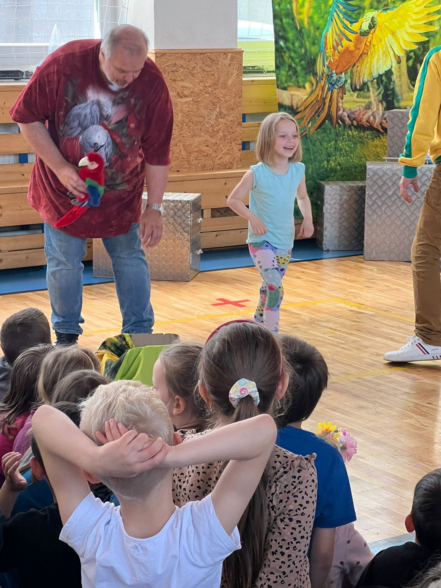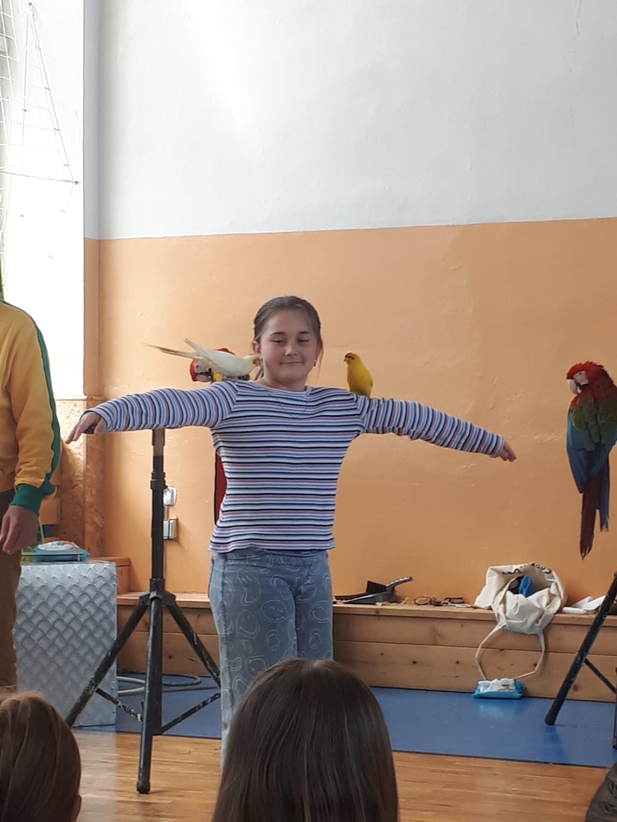 V pátek 19. května 2023 se v naší škole, pro žáky a žakyně 1. stupně, uskutečnilo představení "Papoušci z celého světa". Celým programem děti provázel pan Radek Jareš a se svým kolegou. Dětem přivezli na ukázku celkem 14 papoušků. Papoušci dětem předvedli létání, válení sudů, houpačku, šplh, namlouvání, hádku a spoustu dalších kousků. Těšíme se zase někdy příště 🖐