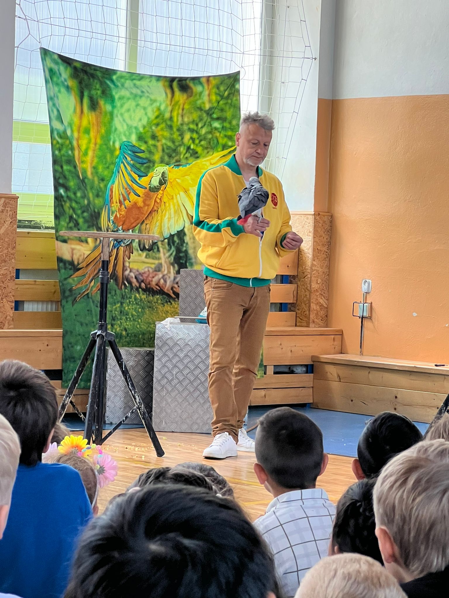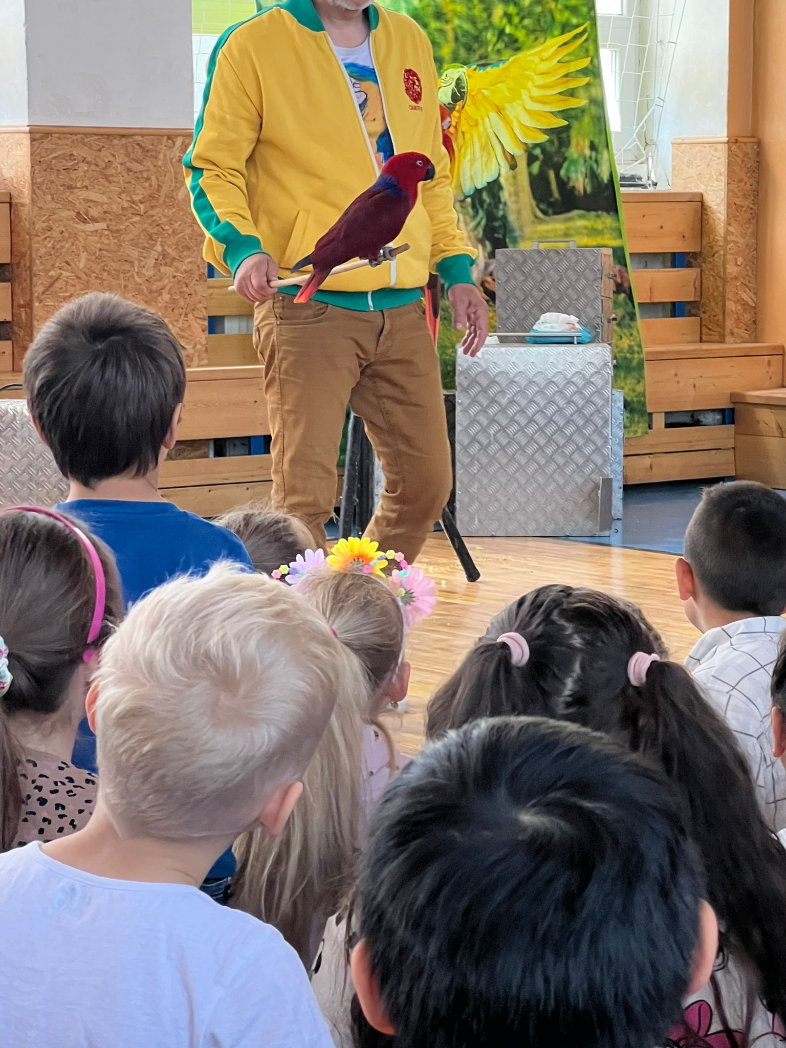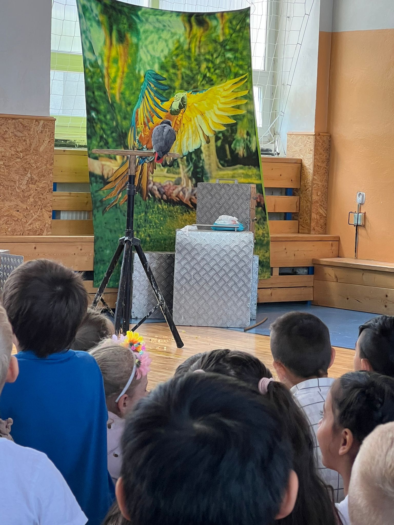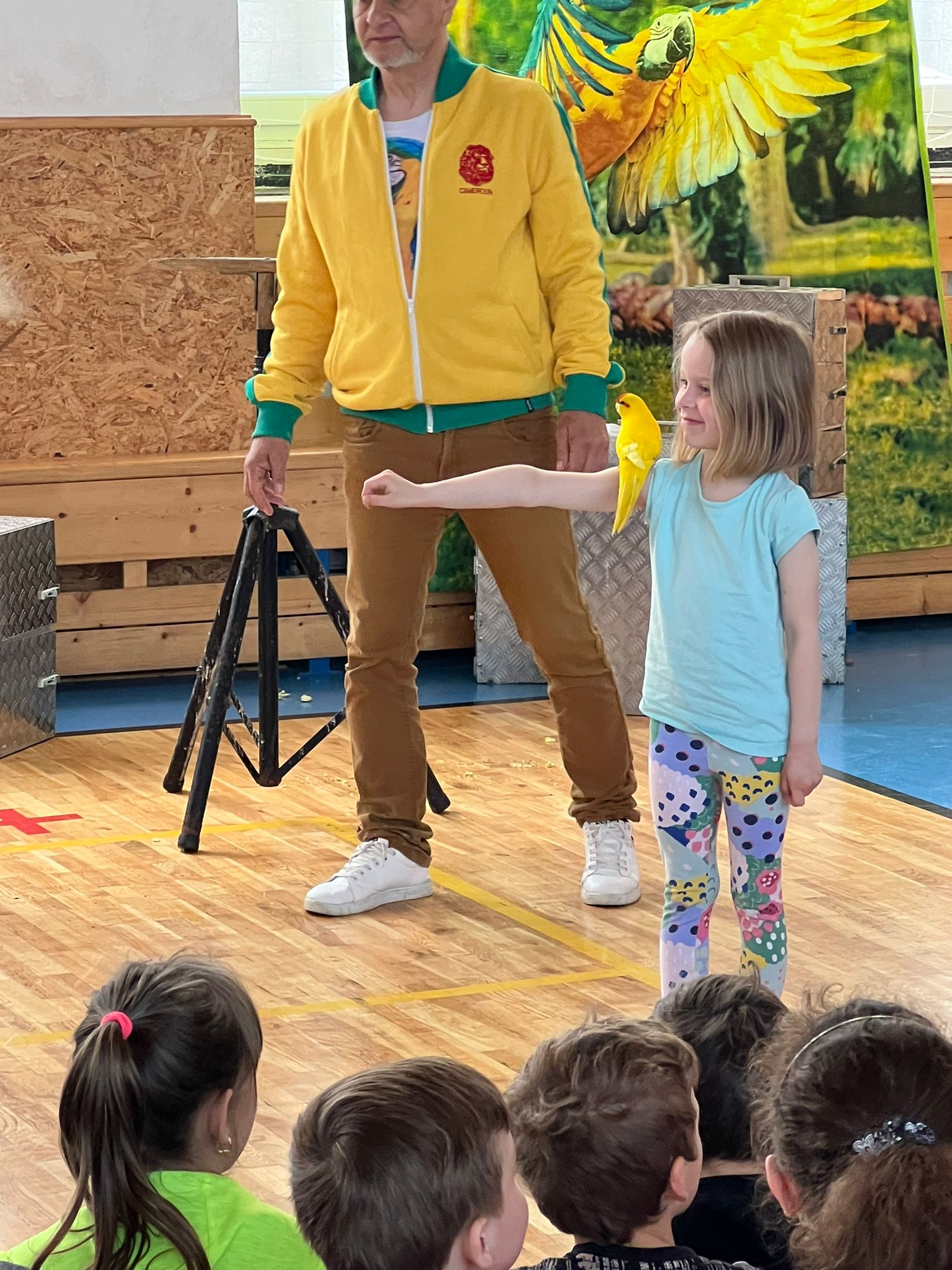V pátek 19. května 2023 se v naší škole, pro žáky a žakyně 1. stupně, uskutečnilo představení "Papoušci z celého světa". Celým programem děti provázel pan Radek Jareš a se svým kolegou. Dětem přivezli na ukázku celkem 14 papoušků. Papoušci dětem předvedli létání, válení sudů, houpačku, šplh, namlouvání, hádku a spoustu dalších kousků. Těšíme se zase někdy příště 🖐