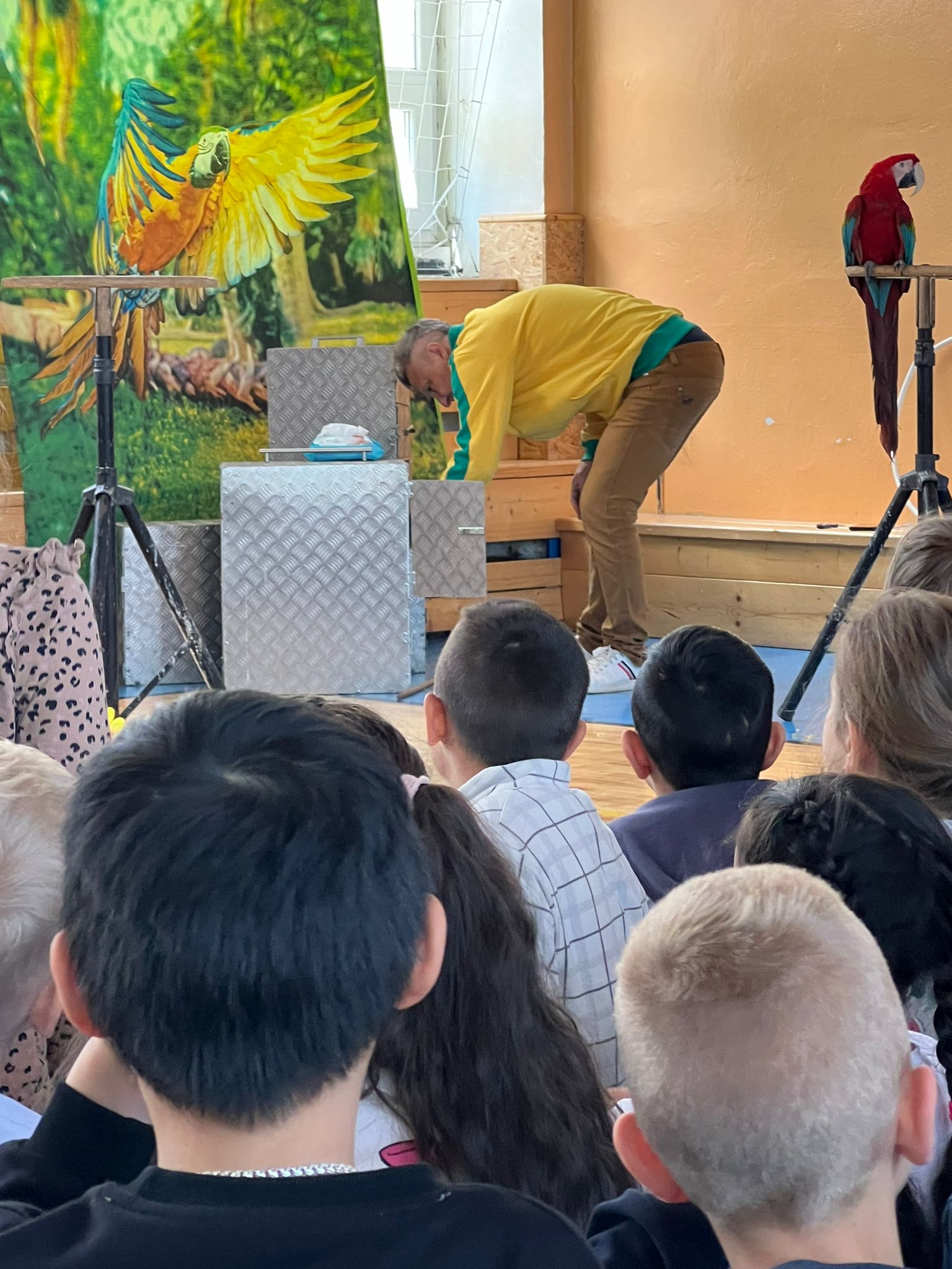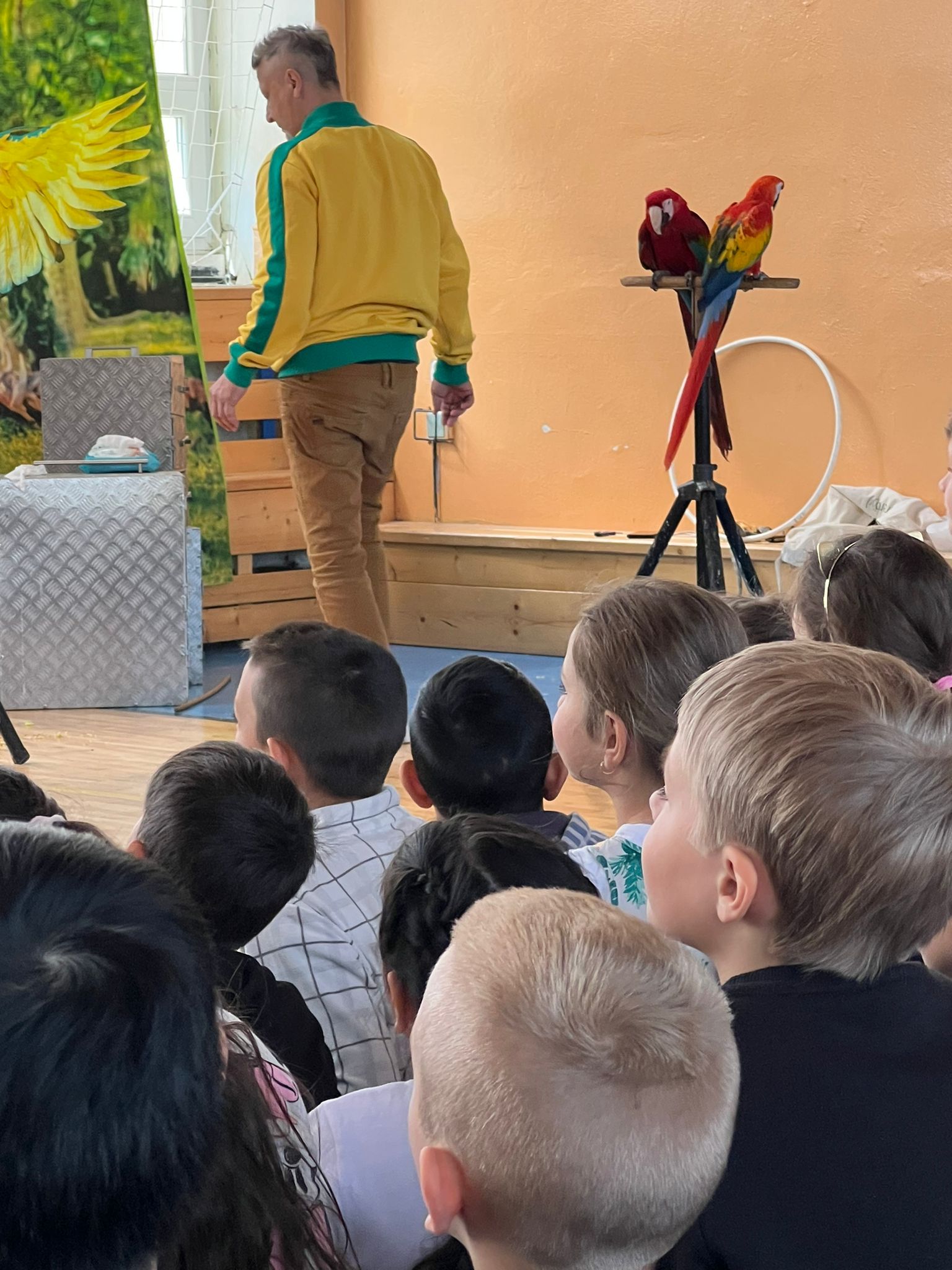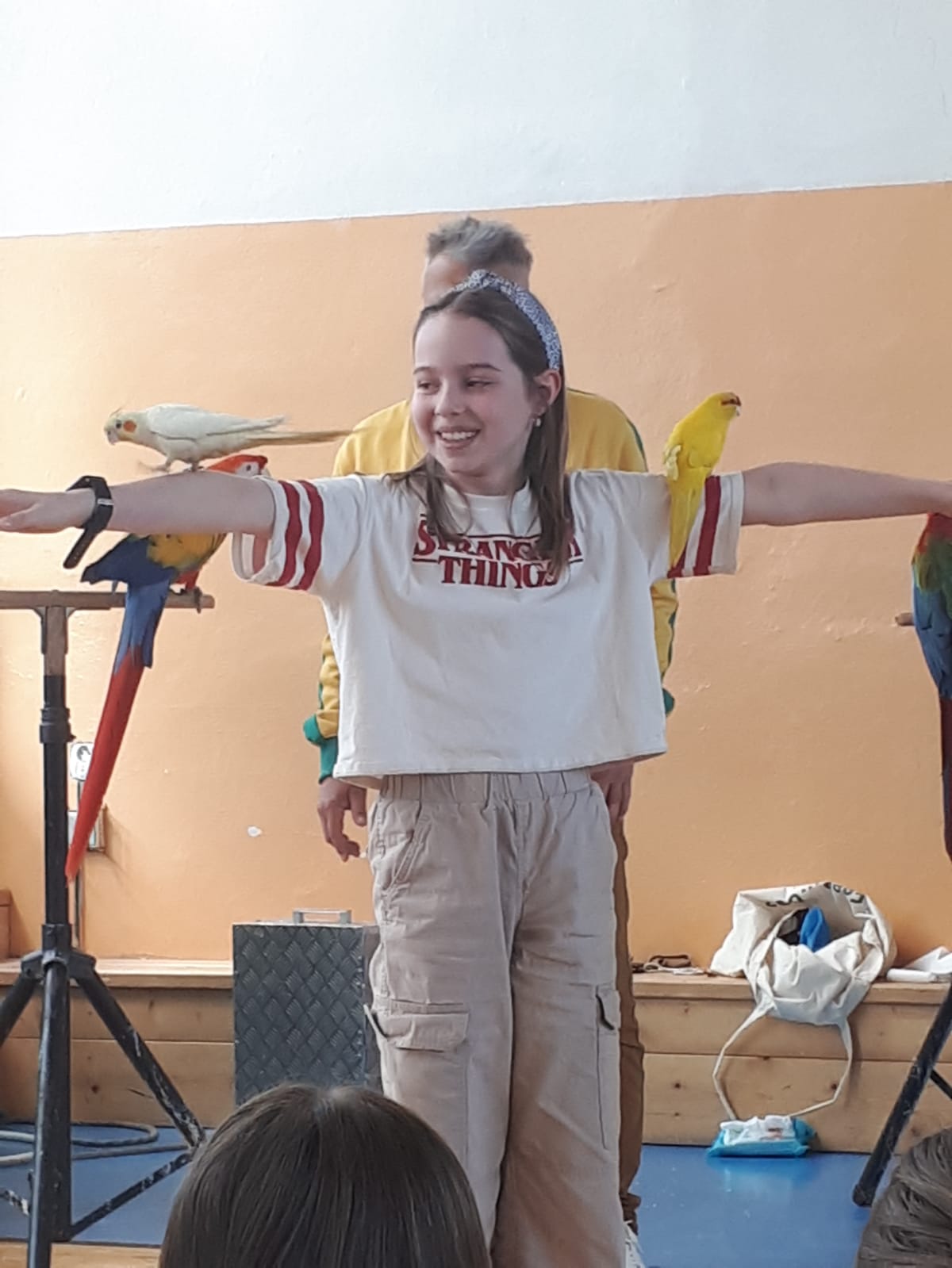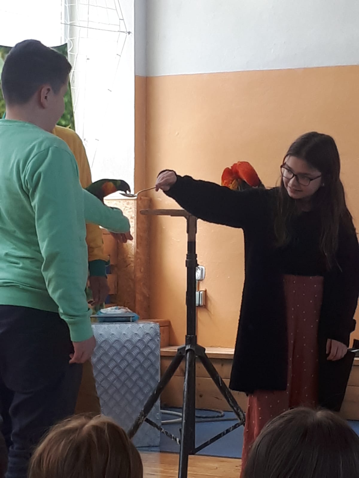 V pátek 19. května 2023 se v naší škole, pro žáky a žakyně 1. stupně, uskutečnilo představení "Papoušci z celého světa". Celým programem děti provázel pan Radek Jareš a se svým kolegou. Dětem přivezli na ukázku celkem 14 papoušků. Papoušci dětem předvedli létání, válení sudů, houpačku, šplh, namlouvání, hádku a spoustu dalších kousků. Těšíme se zase někdy příště 🖐