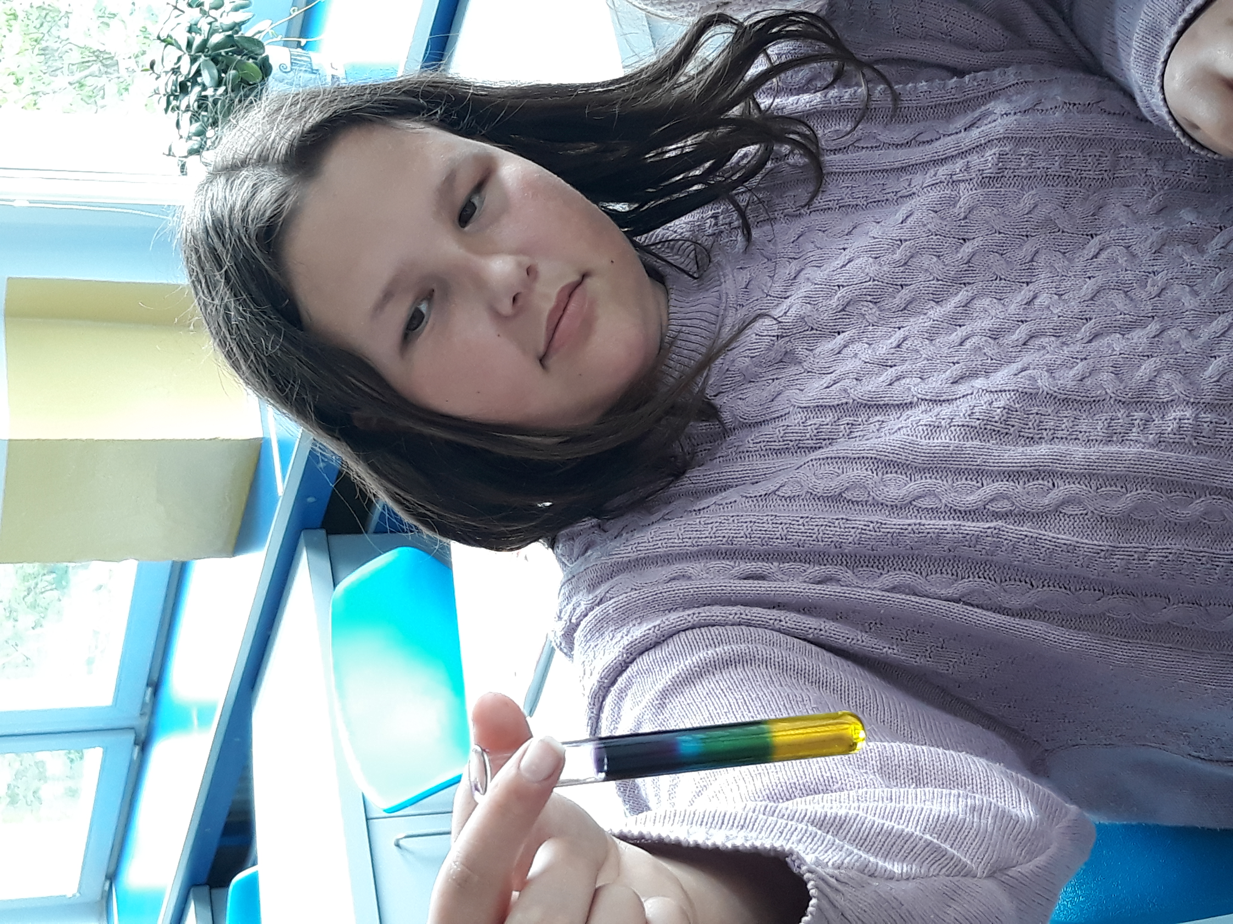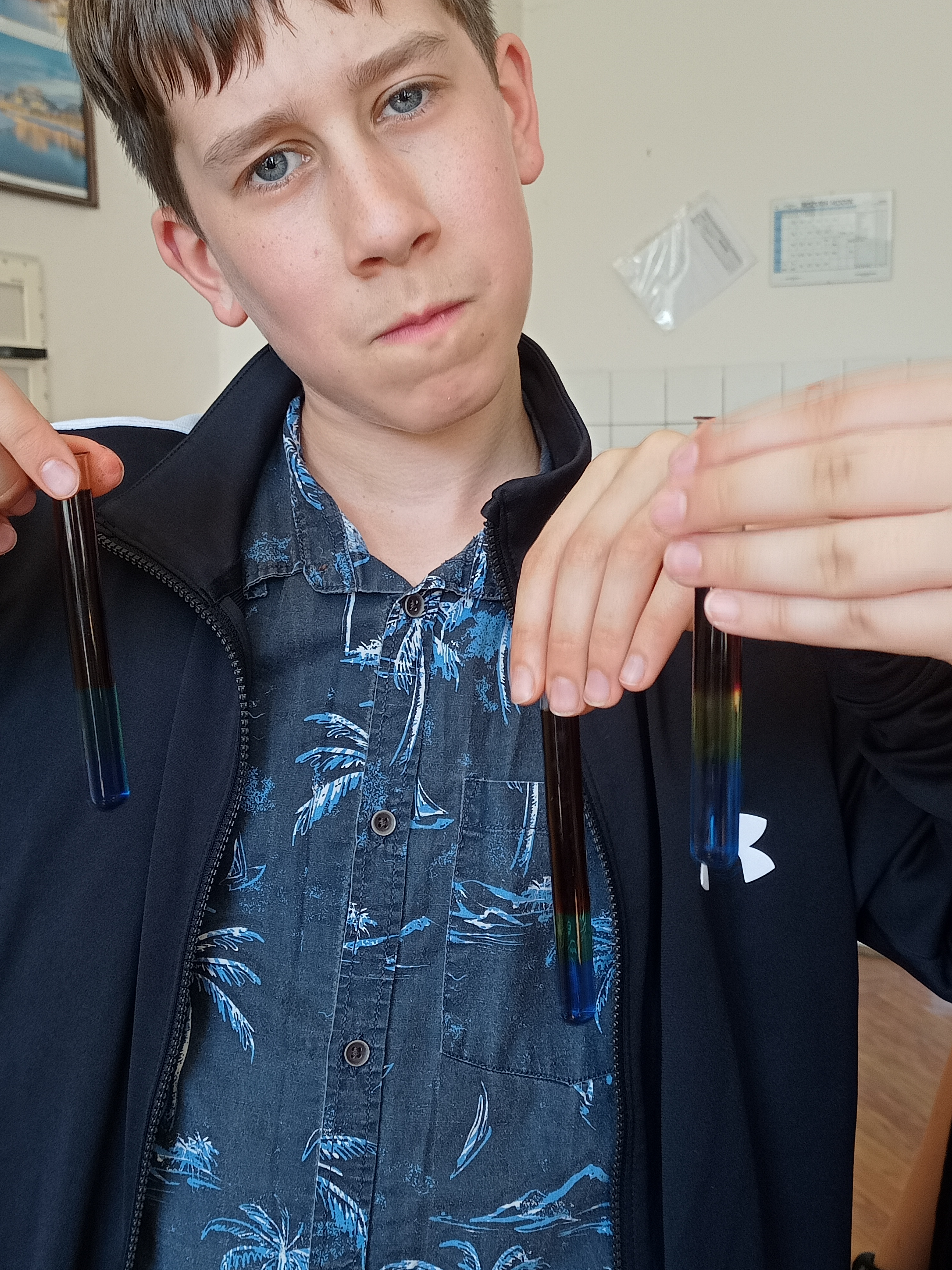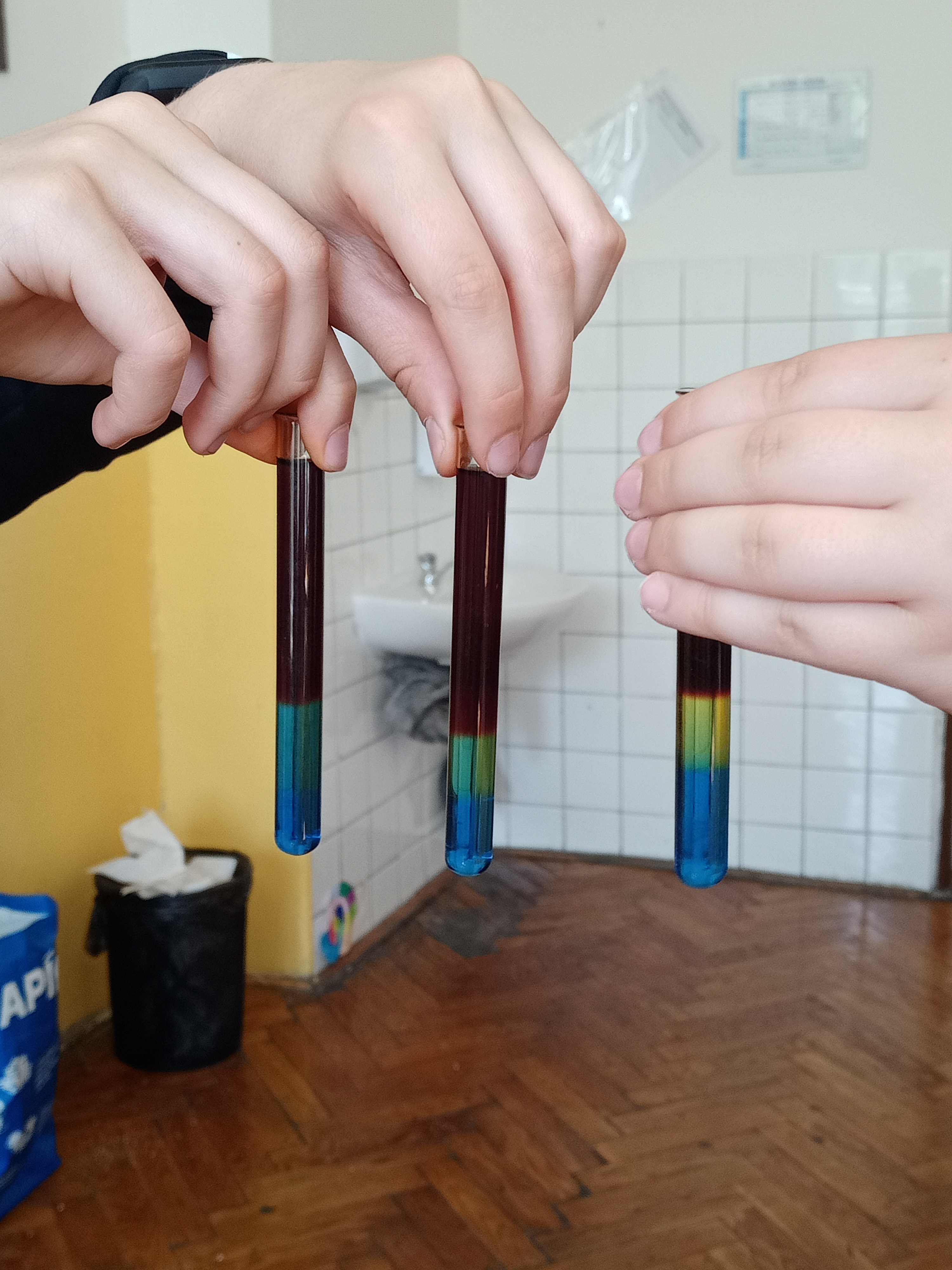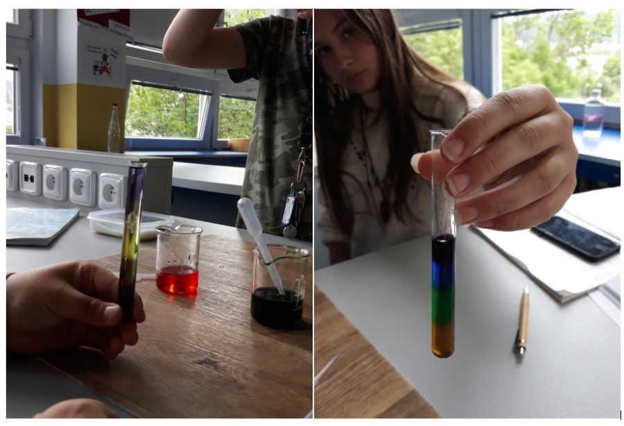 Pak si každý vyzkoušel do zkumavky namíchat svůj vlastní "koktejl". Tedy opatrně nalít jednotlivé barevné vrstvy odspodu od té s největší hustotou až po tu s nejmenší.