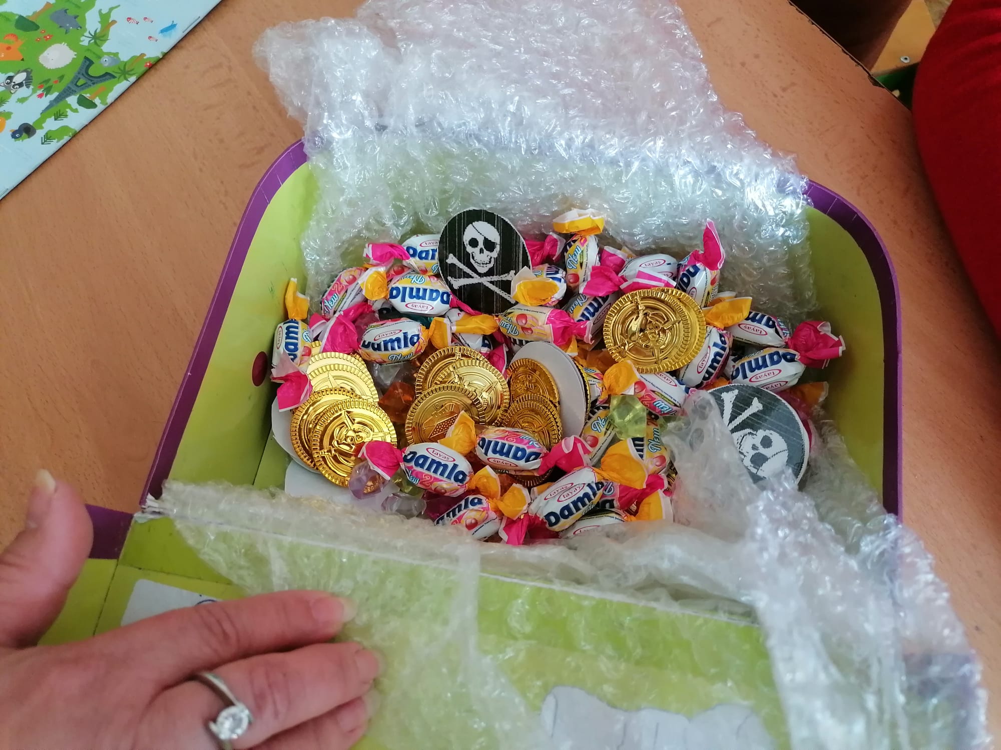 Hodina HV proběhla jako Zpívánky se Sněhurkou a v rámci čtení jsme se společně s pirátem vrhli na Cestu za pokladem. Děti si pomocí různých přesmyček a dalších úkolů z českého jazyka na dvanácti stanovištích vyluštily křížovku a tajenka jim prozradila místo, kde se ukrýval poklad. Na základě instrukcí děti samozřejmě skrytý poklad pod lavičkou našly a spravedlivě si ho mezi sebou rozdělily.